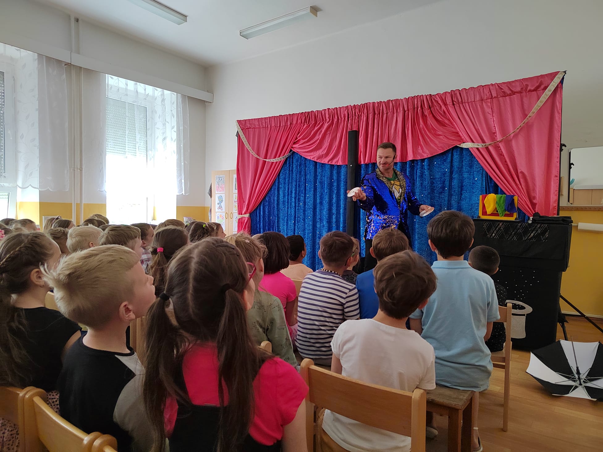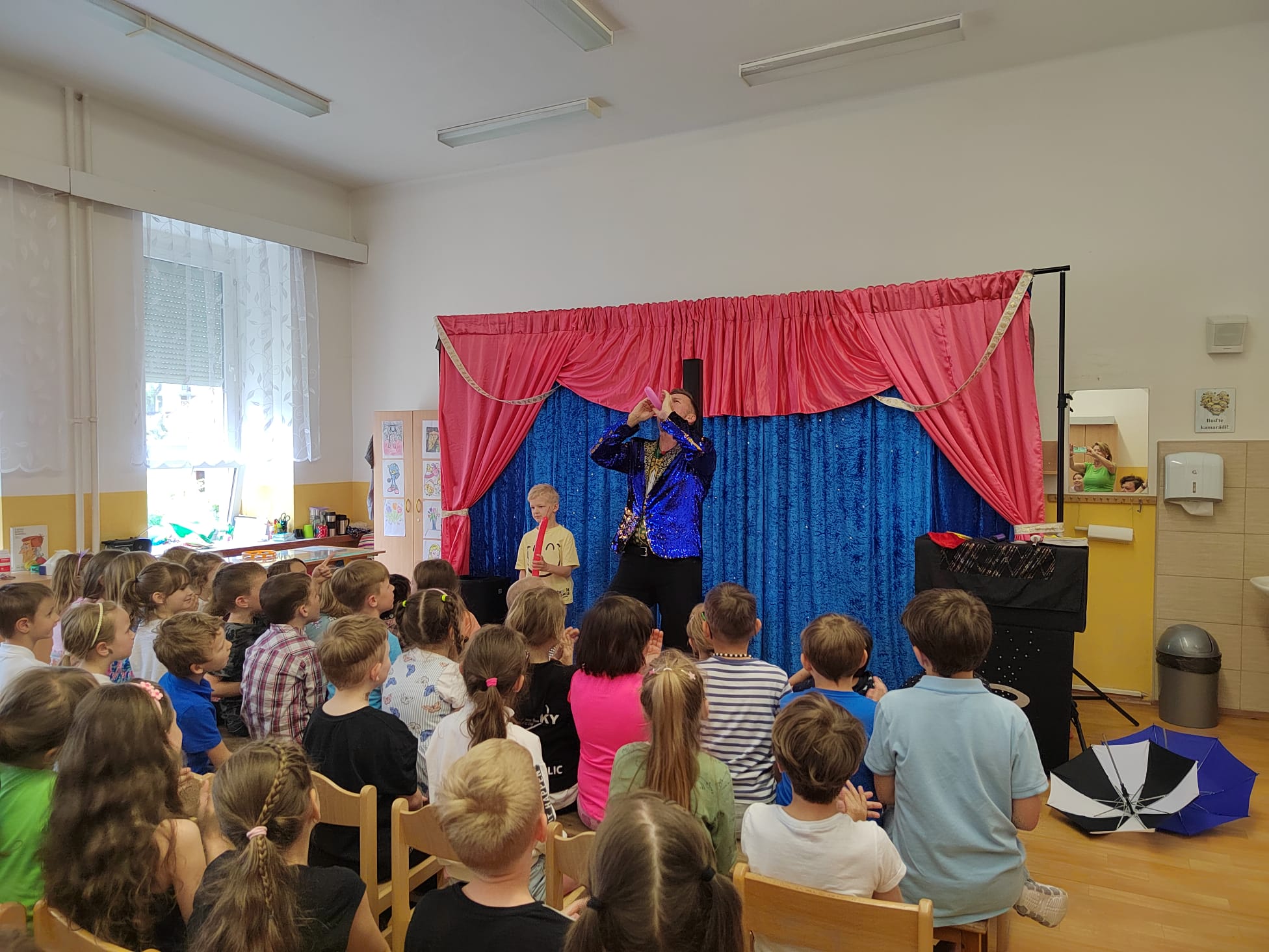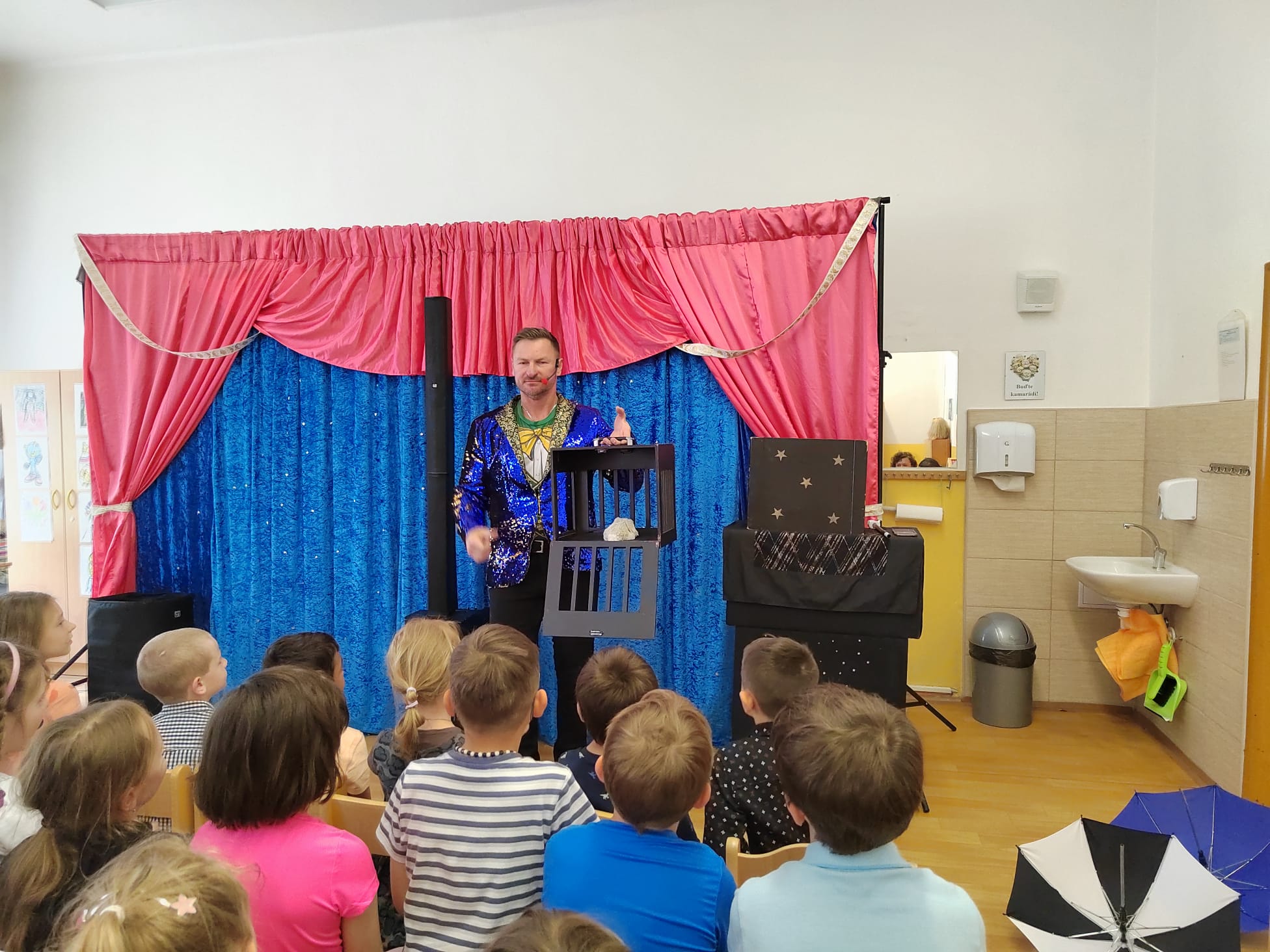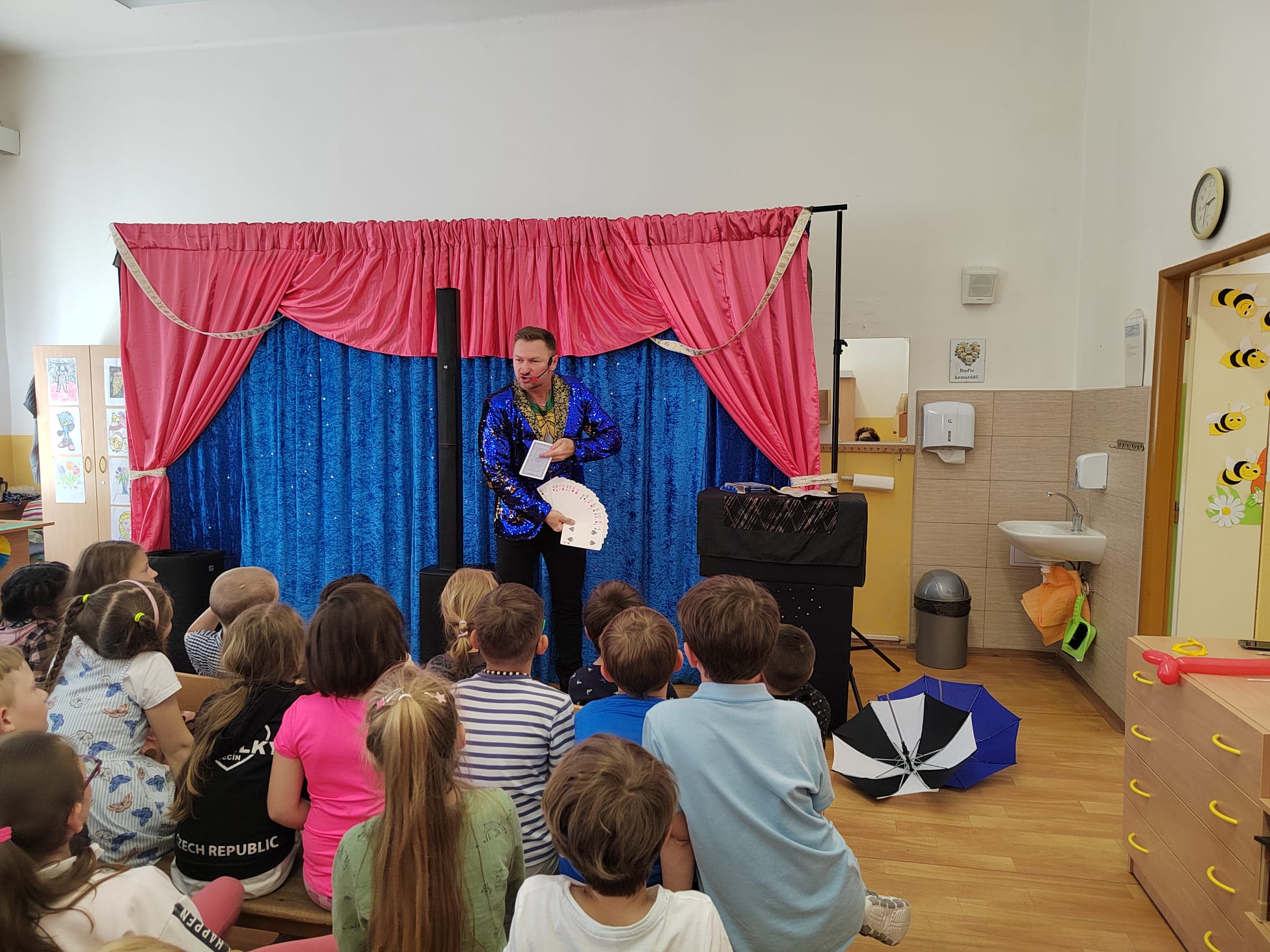 Na úvod svého vystoupení předvedl triky s deštníčky, CD disky a barevnými šátky. Dále si pozval děti, které mu asistovaly při kouzlech s papírem, hůlkou, balónky a Rubikovou kostkou. Ke spolupráci přizval také paní vychovatelku a ukázal trik s kartami.