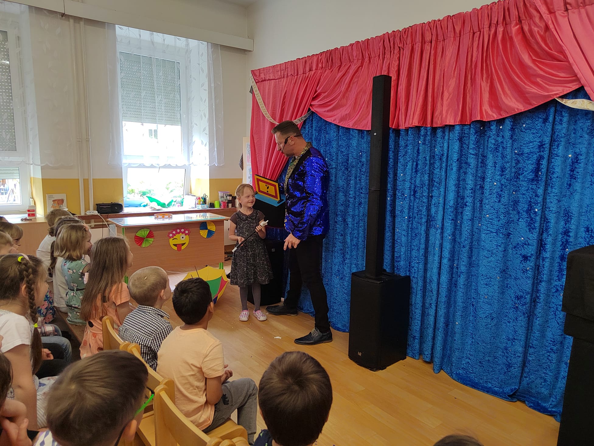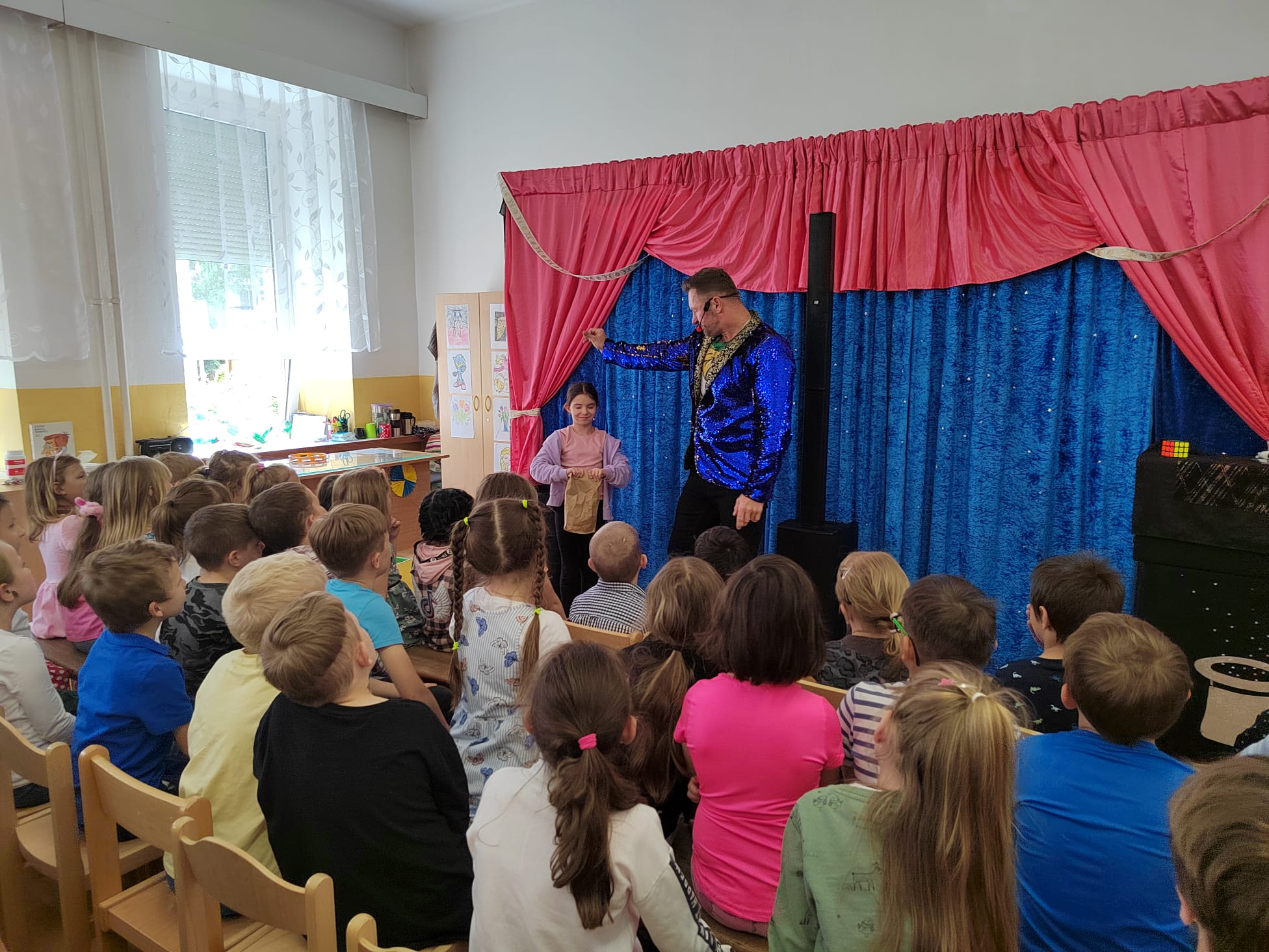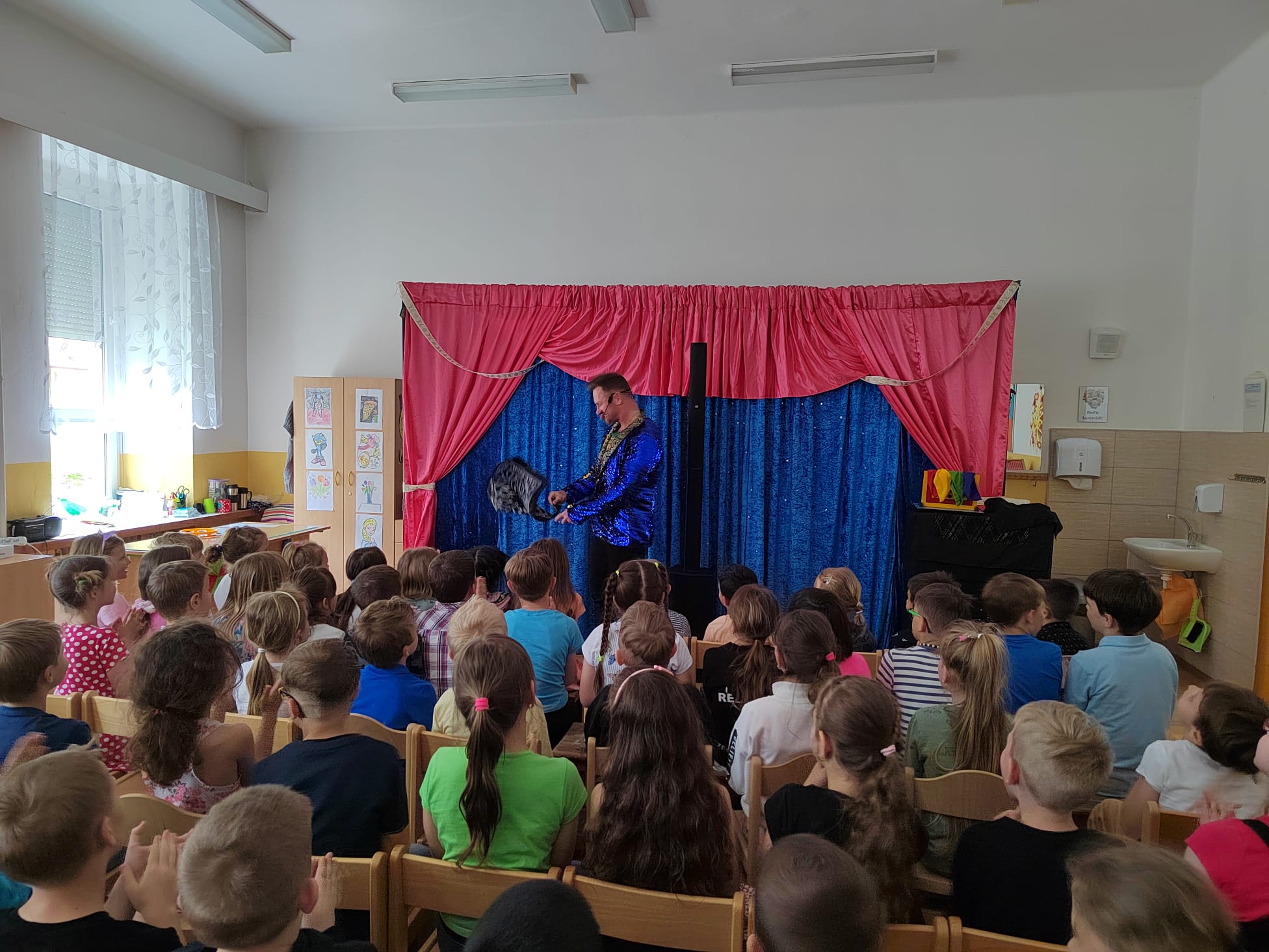 Na úvod svého vystoupení předvedl triky s deštníčky, CD disky a barevnými šátky. Dále si pozval děti, které mu asistovaly při kouzlech s papírem, hůlkou, balónky a Rubikovou kostkou. Ke spolupráci přizval také paní vychovatelku a ukázal trik s kartami.