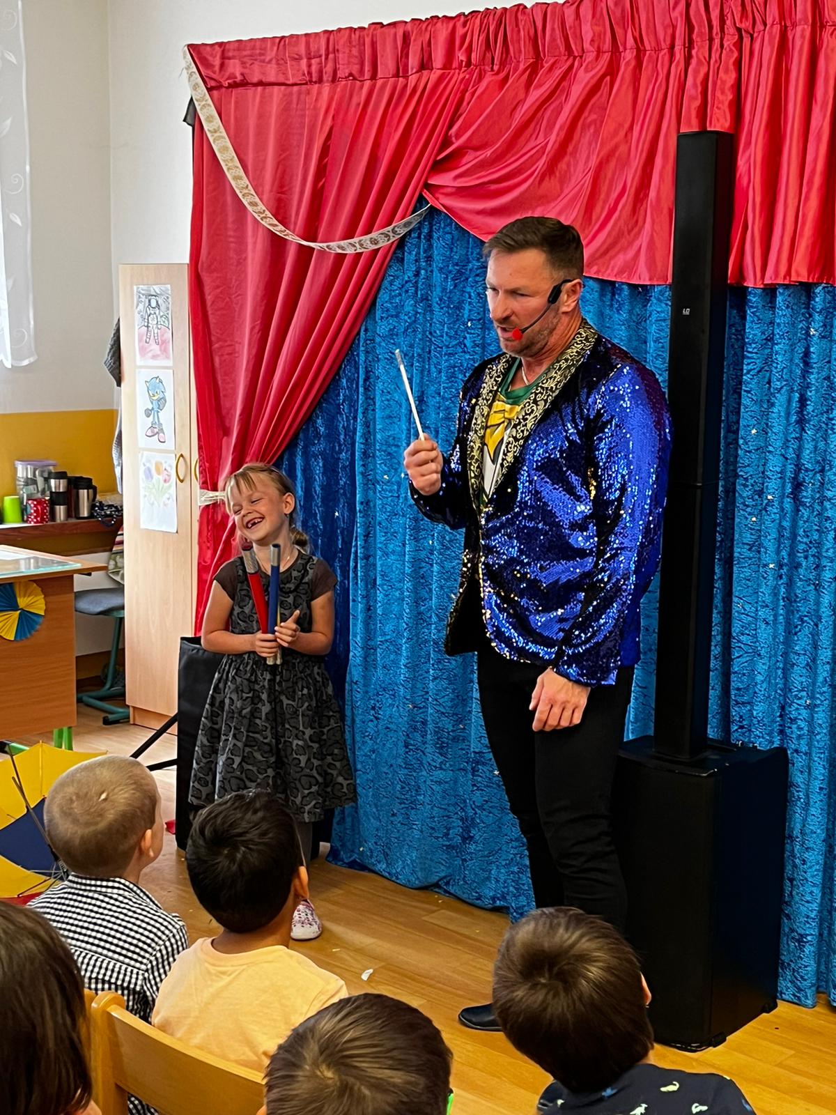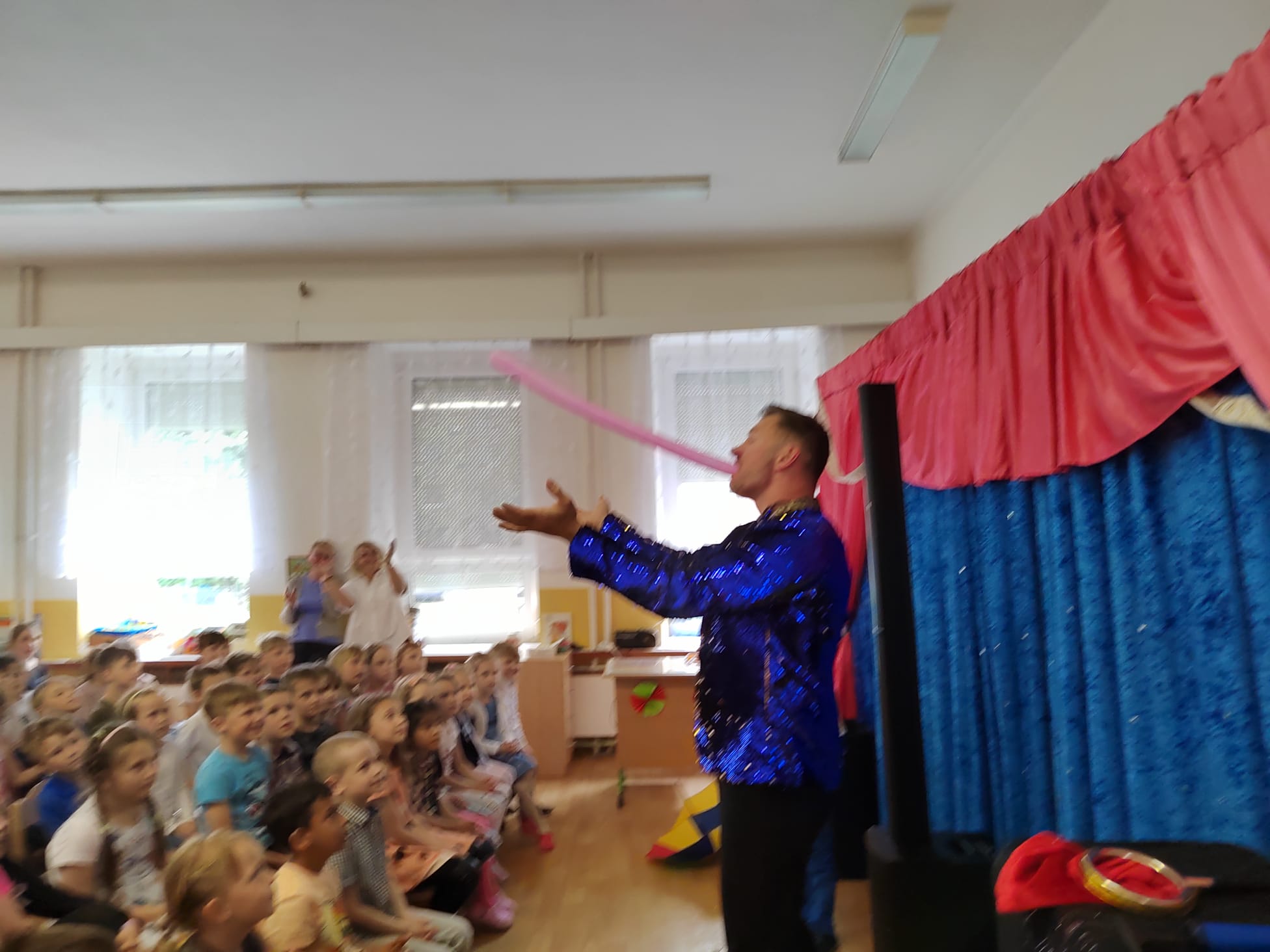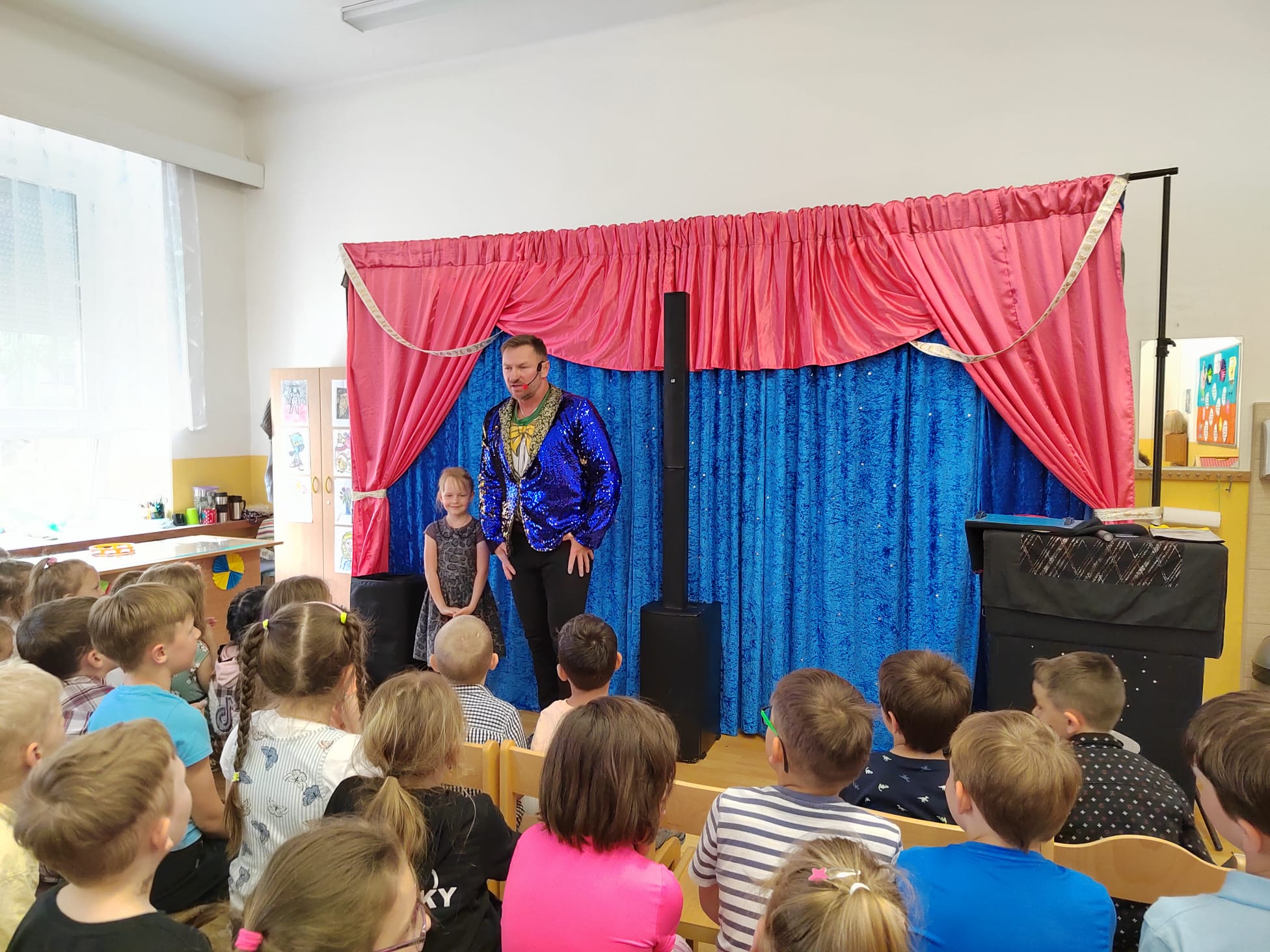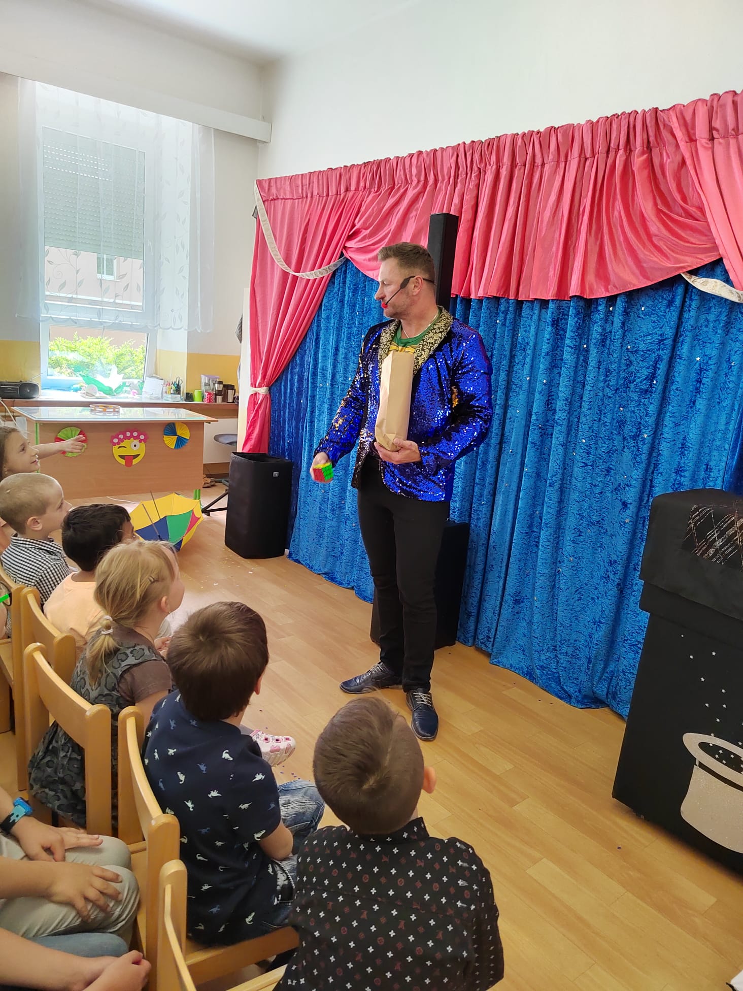 Na úvod svého vystoupení předvedl triky s deštníčky, CD disky a barevnými šátky. Dále si pozval děti, které mu asistovaly při kouzlech s papírem, hůlkou, balónky a Rubikovou kostkou. Ke spolupráci přizval také paní vychovatelku a ukázal trik s kartami.