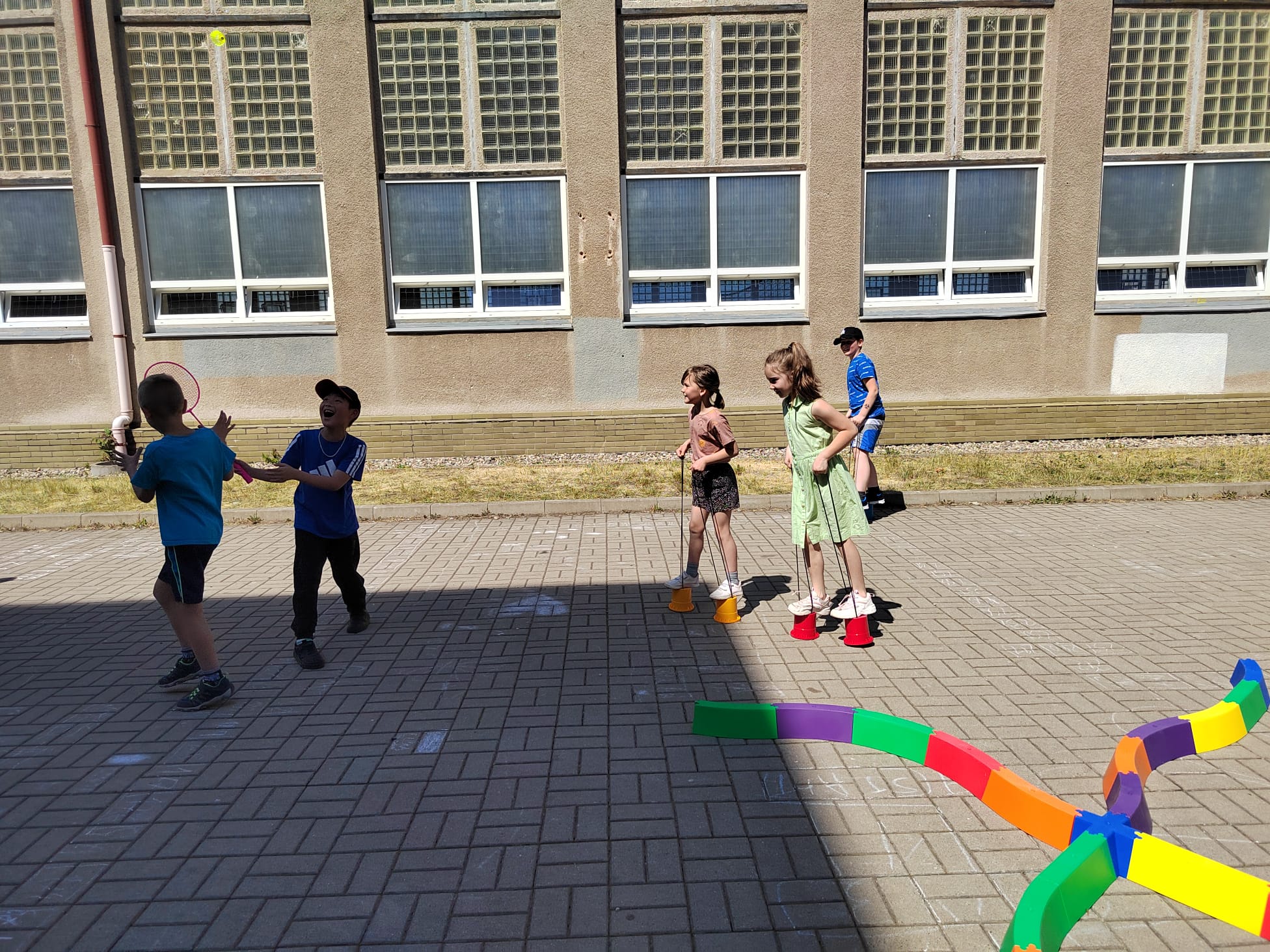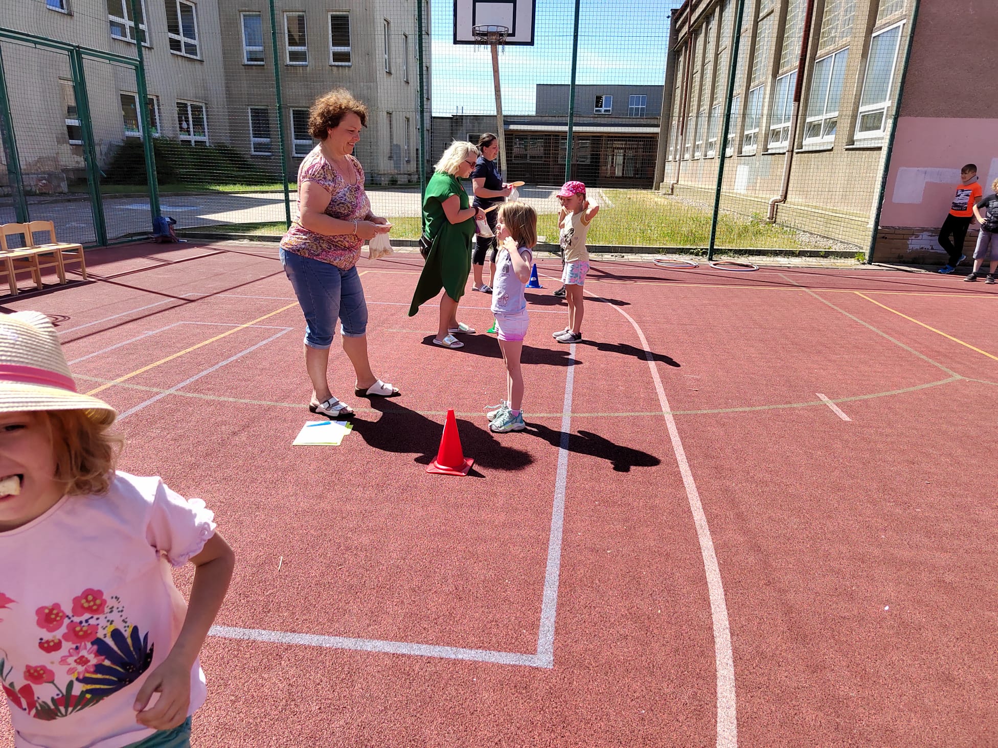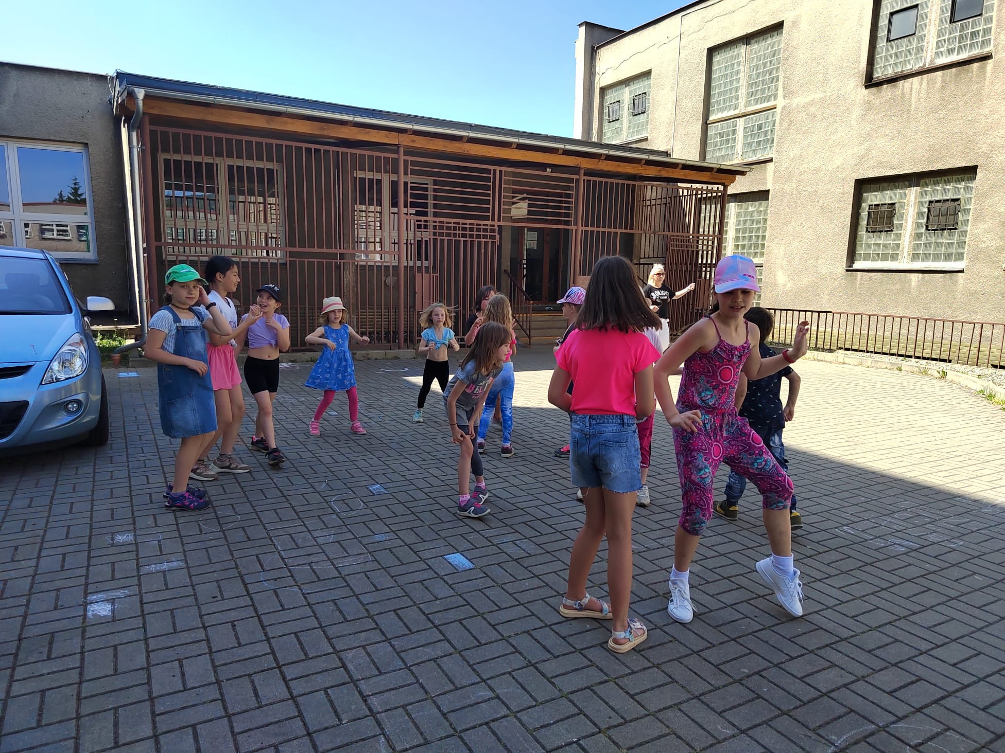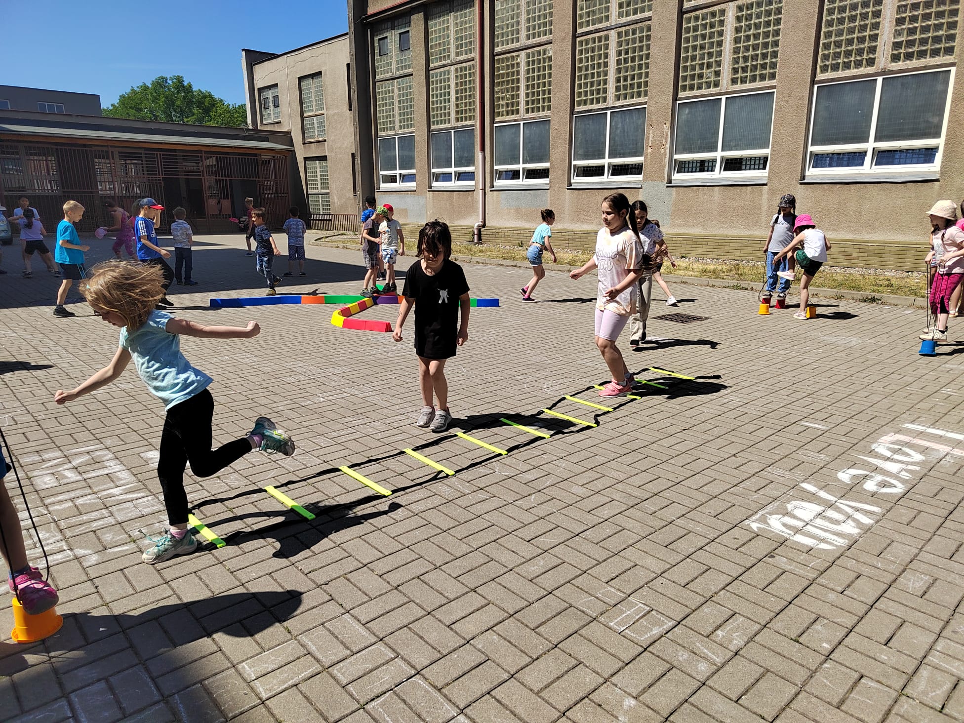 Venku si děti mohly vybrat ze spousty aktivit - například kopaná, kladina, chůdy, tanec, žebřík, míčové hry, malování křídami a jiných zábavných her.