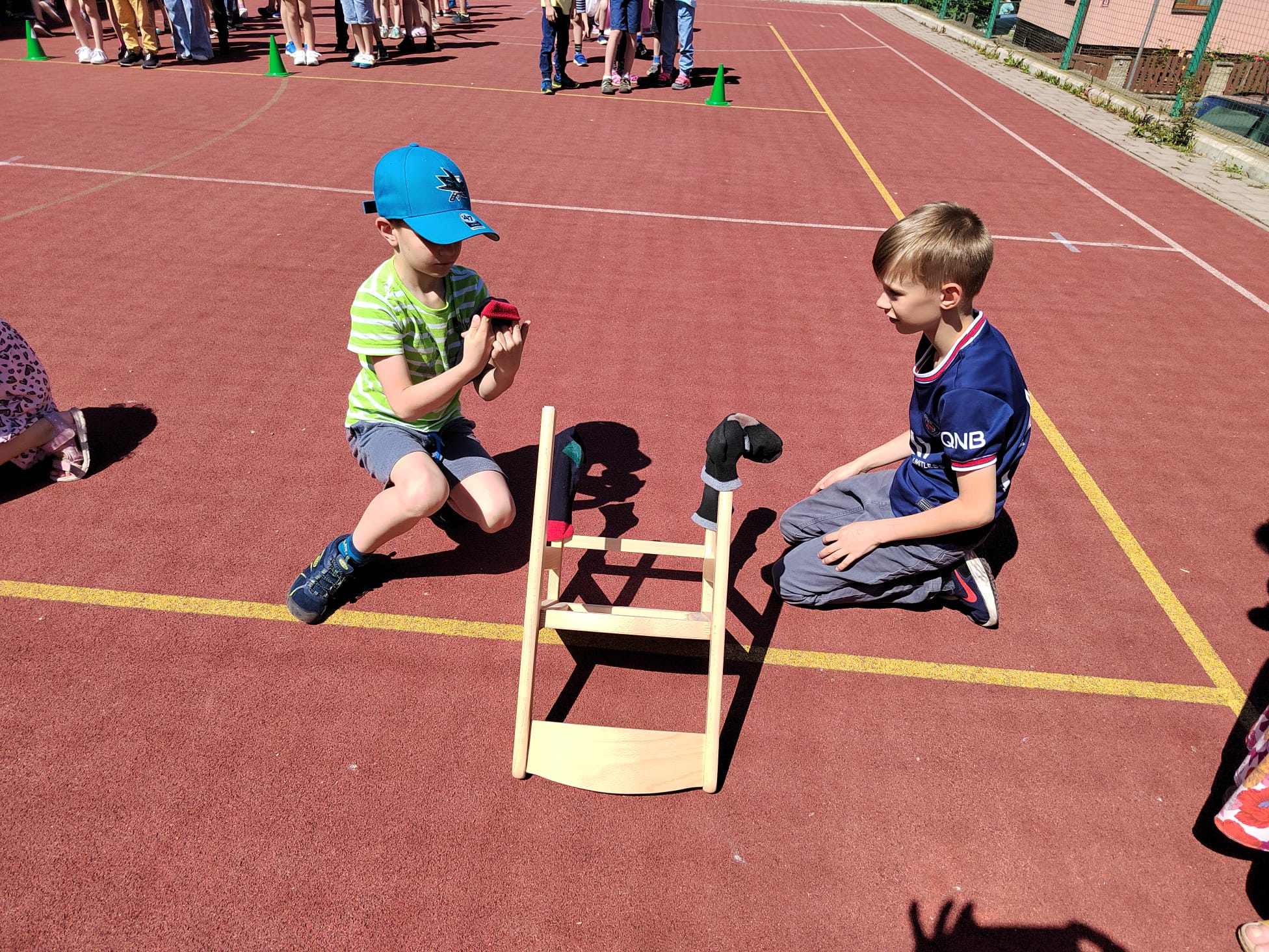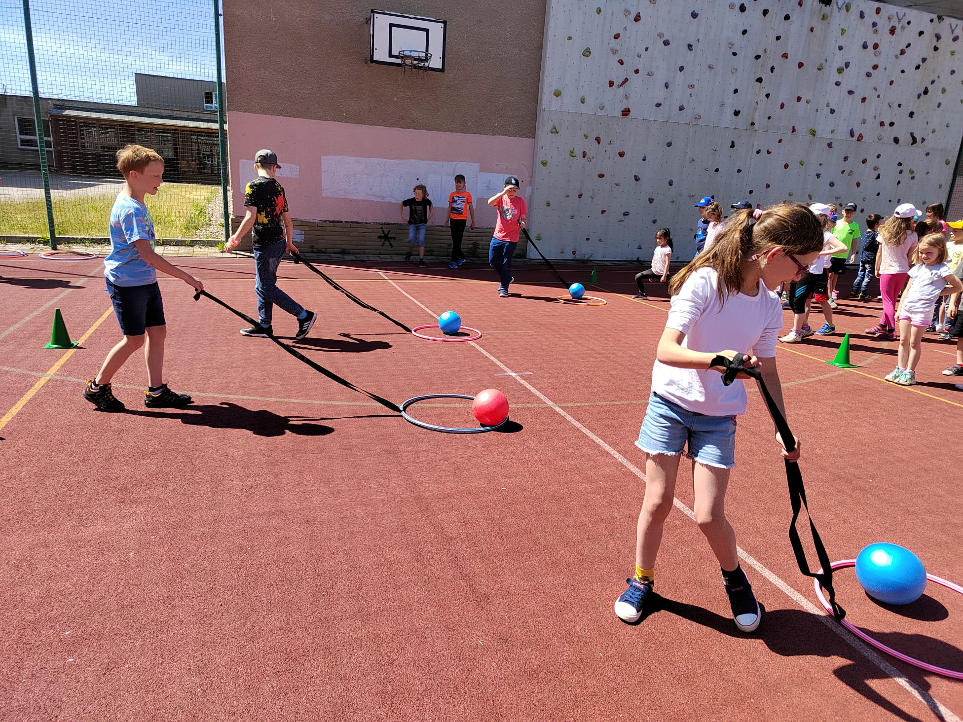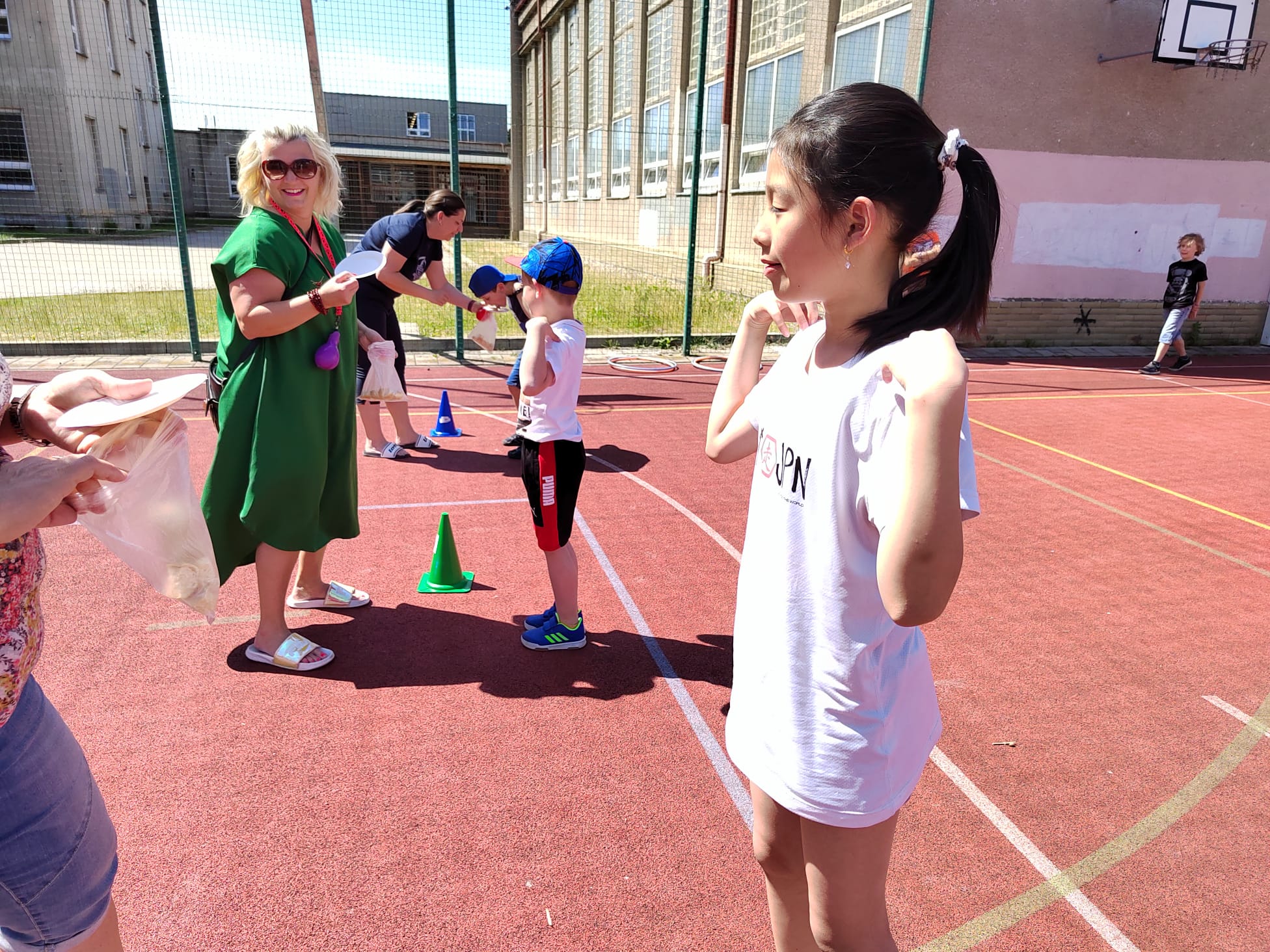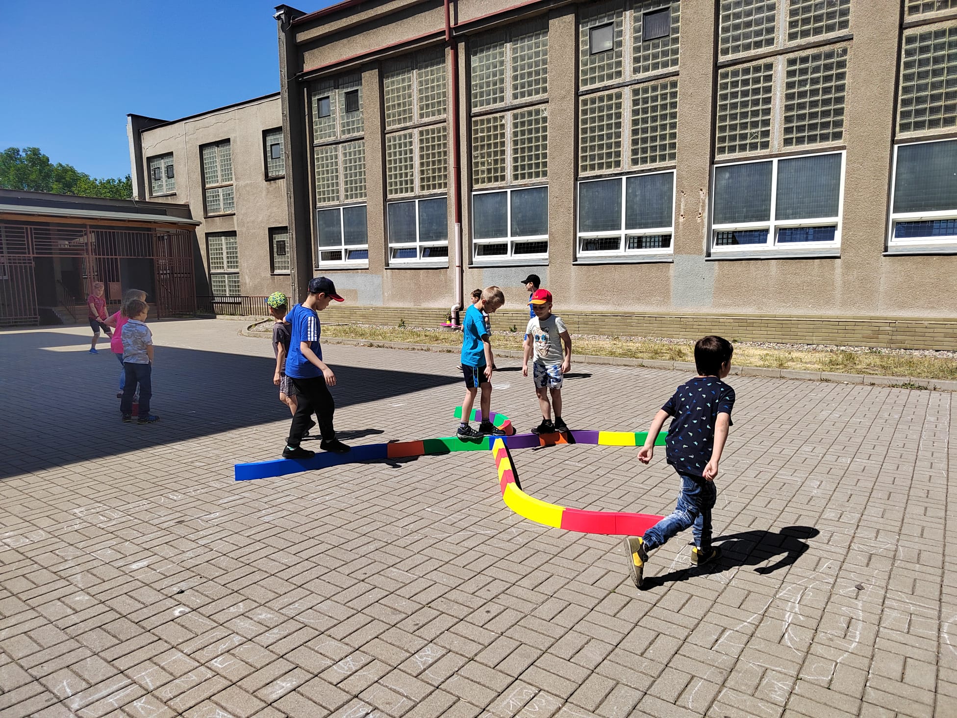 Venku si děti mohly vybrat ze spousty aktivit - například kopaná, kladina, chůdy, tanec, žebřík, míčové hry, malování křídami a jiných zábavných her.