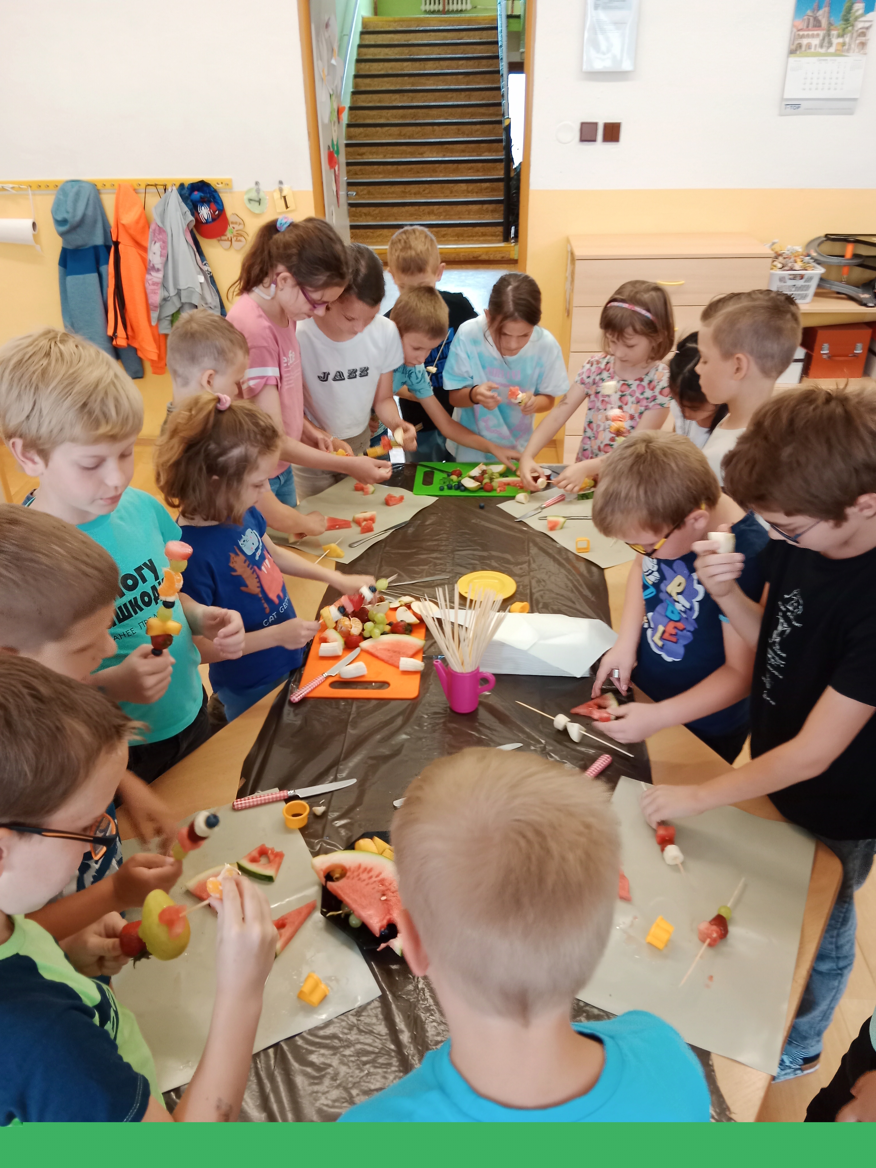 Zahráli jsme si Živé ovocné pexeso, luštili křížovky a zjišťovali odkud některé ovoce pochází. Poté jsme společně očistili a nakrájeli všechno ovoce a pustili se do výroby ovocných špízů, smoothie nebo dortíků, které si vytvářeli i za pomoci vykrajovátek jako nápady na dětskou či rodinnou párty.