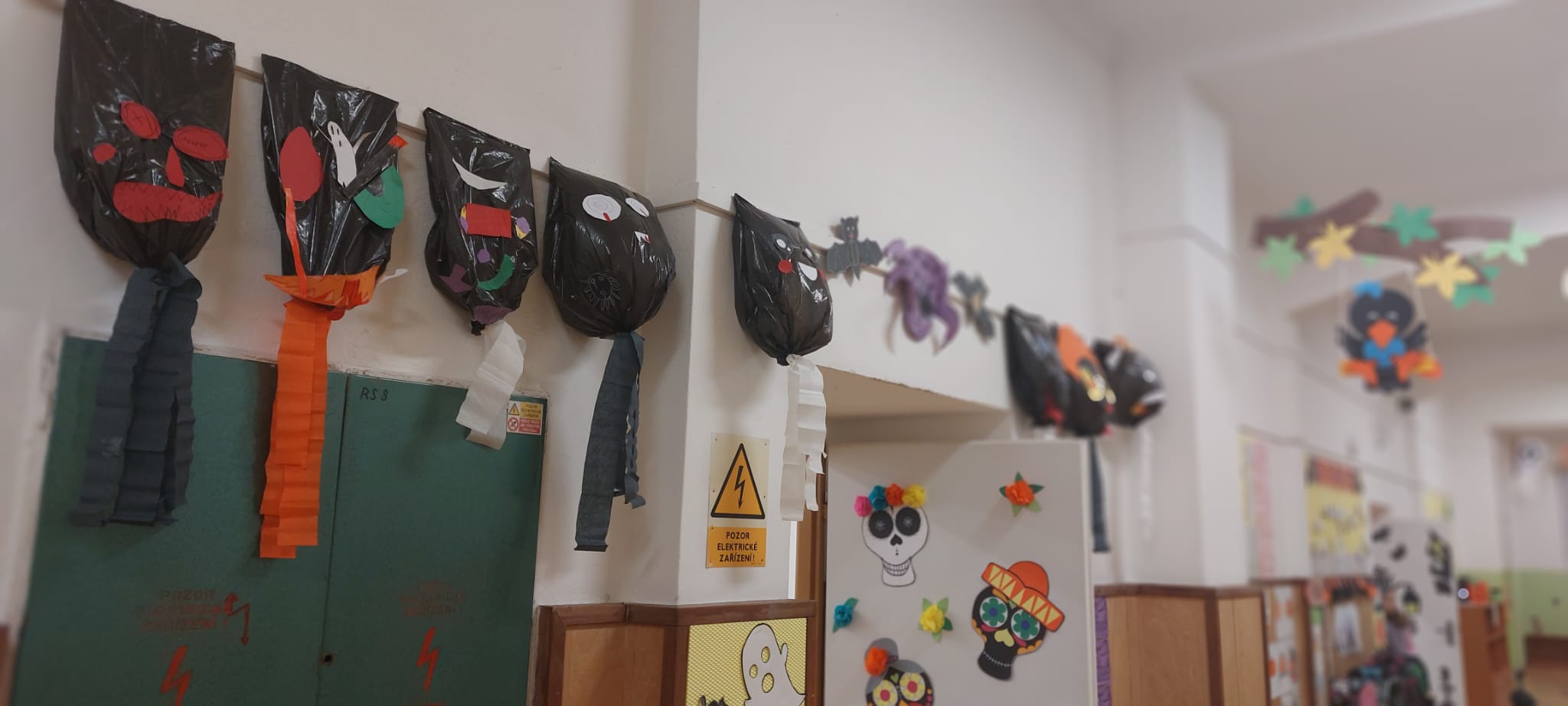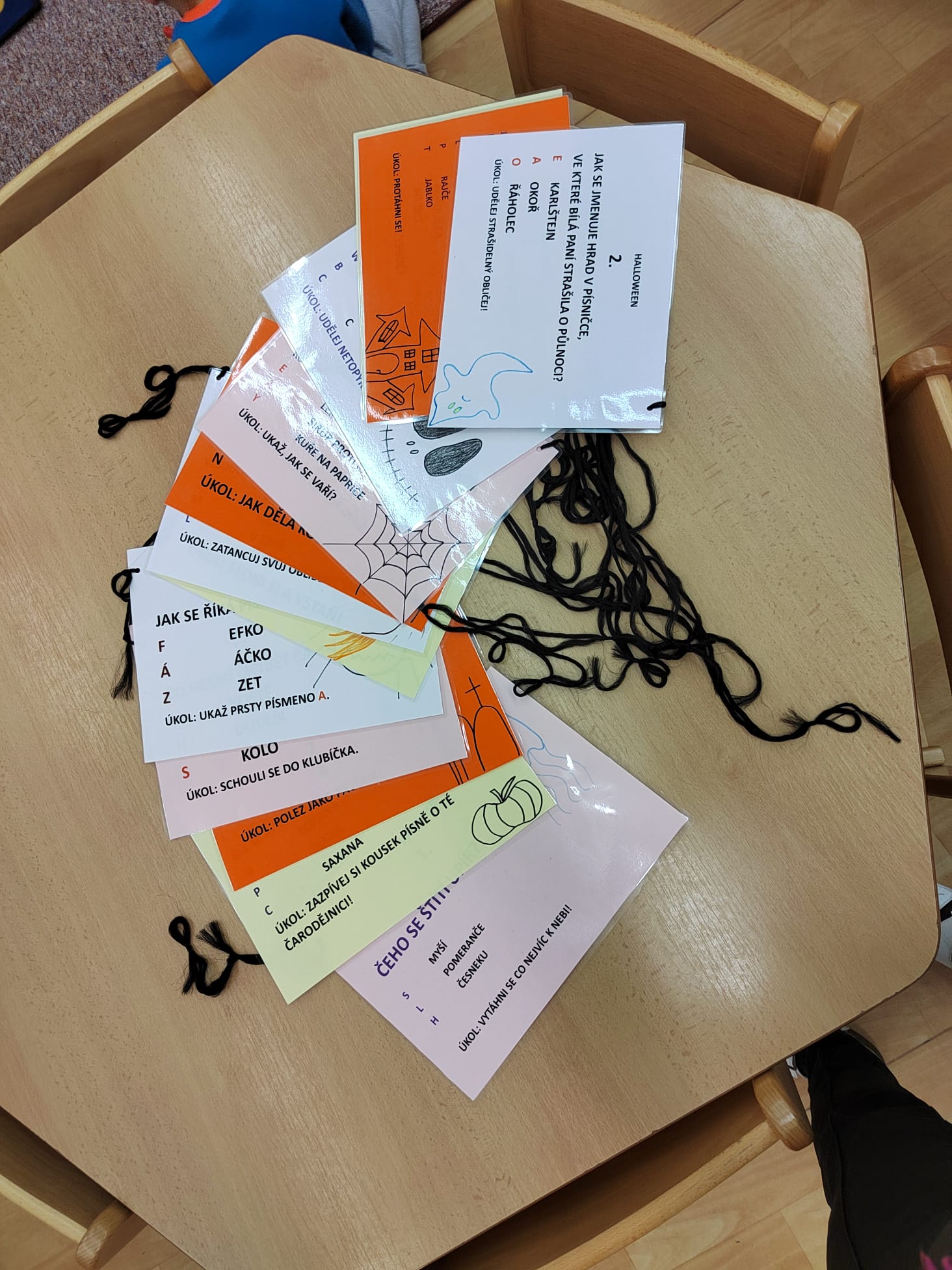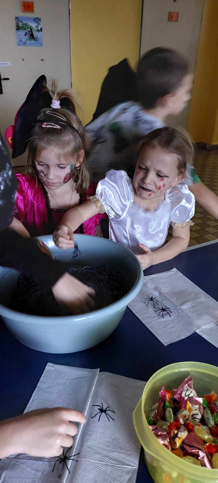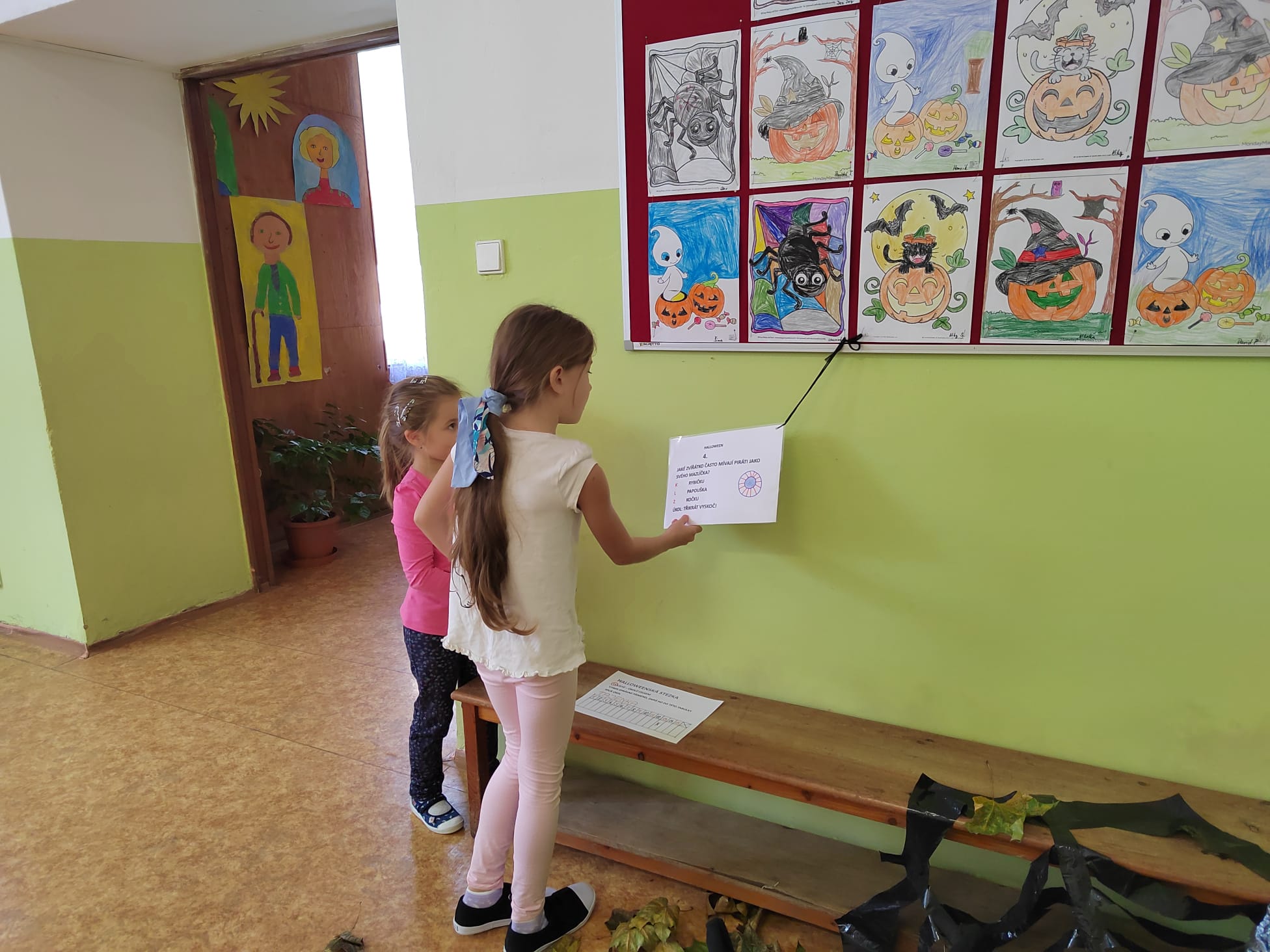 Stezky vedly z oddělení, po chodbách i v prostoru školních šaten. Děti chodily jednotlivě, ve dvojicích nebo ve skupinkách a plnily úkoly, řešily rébusy nebo měly praktické čarodějné úkoly. Jistě nezapomenou na společné luštění, hledání pavouků v modrém cosi:), na pití kouzelného lektvaru a další zážitky. Po vyplnění halloweenských tajenek a splnění daných úkolů čekala na děti opravdu sladká odměna v podobě pavouků, duchů, dýní a dalších dobrot.