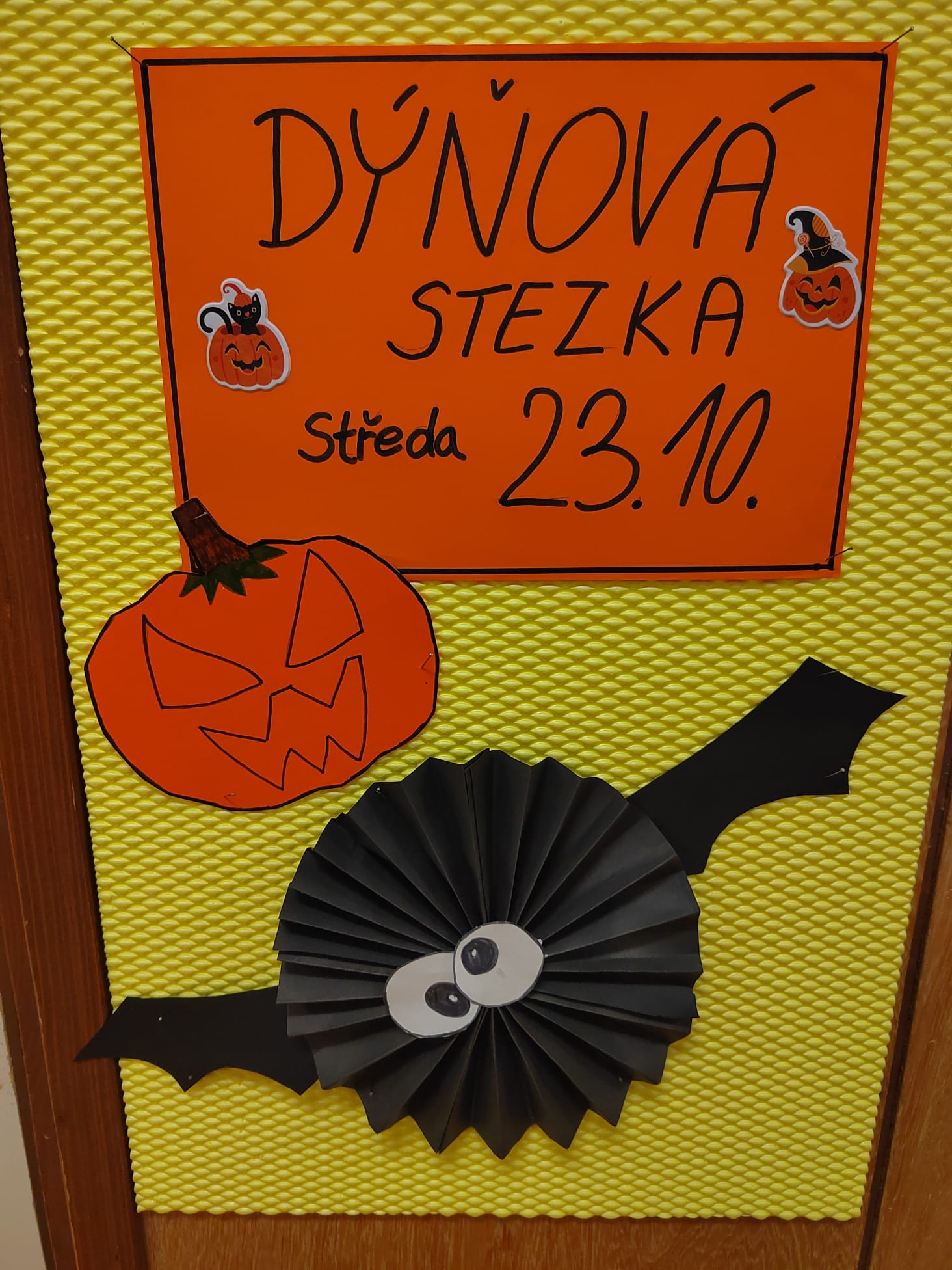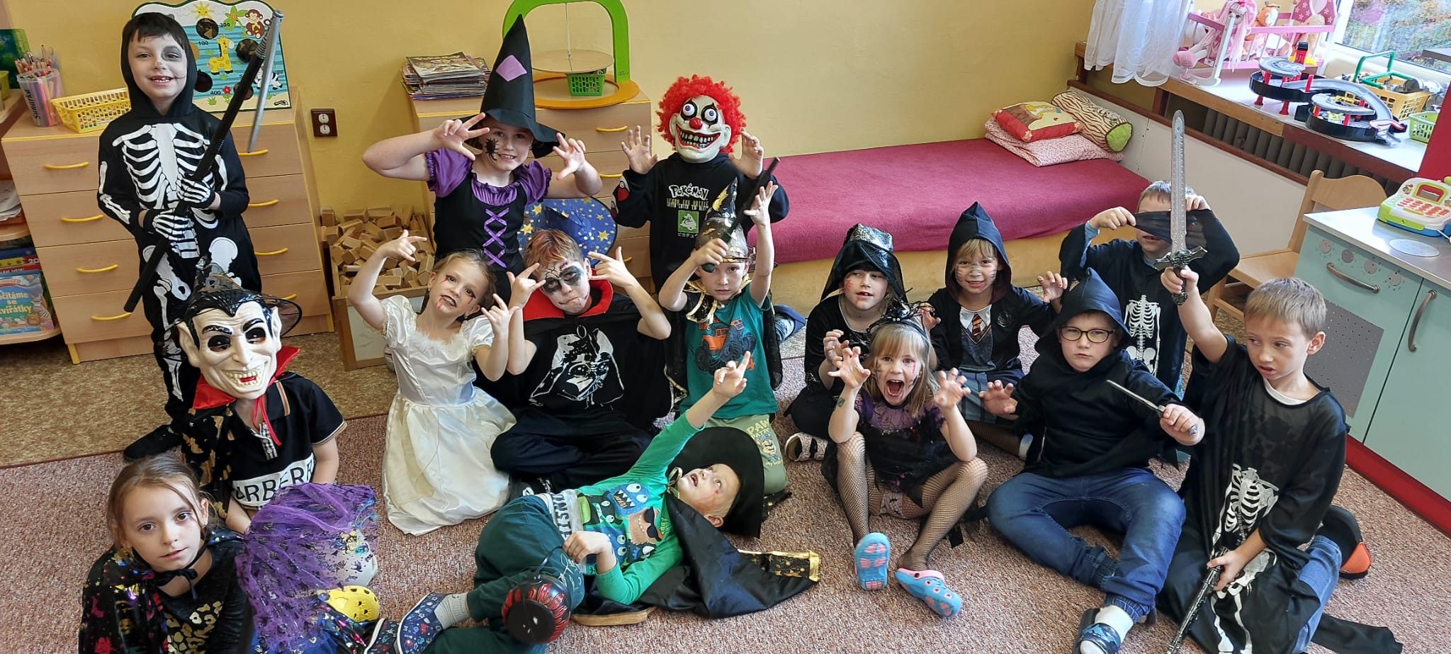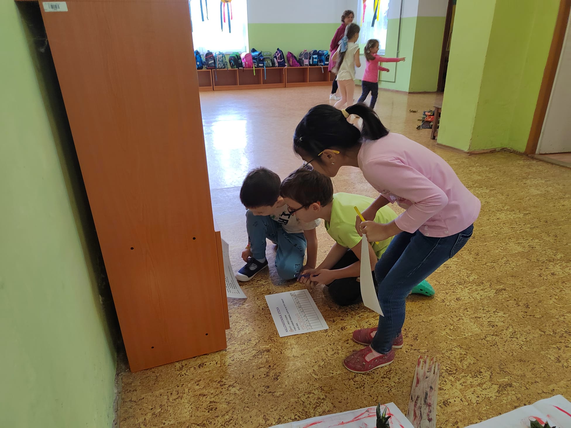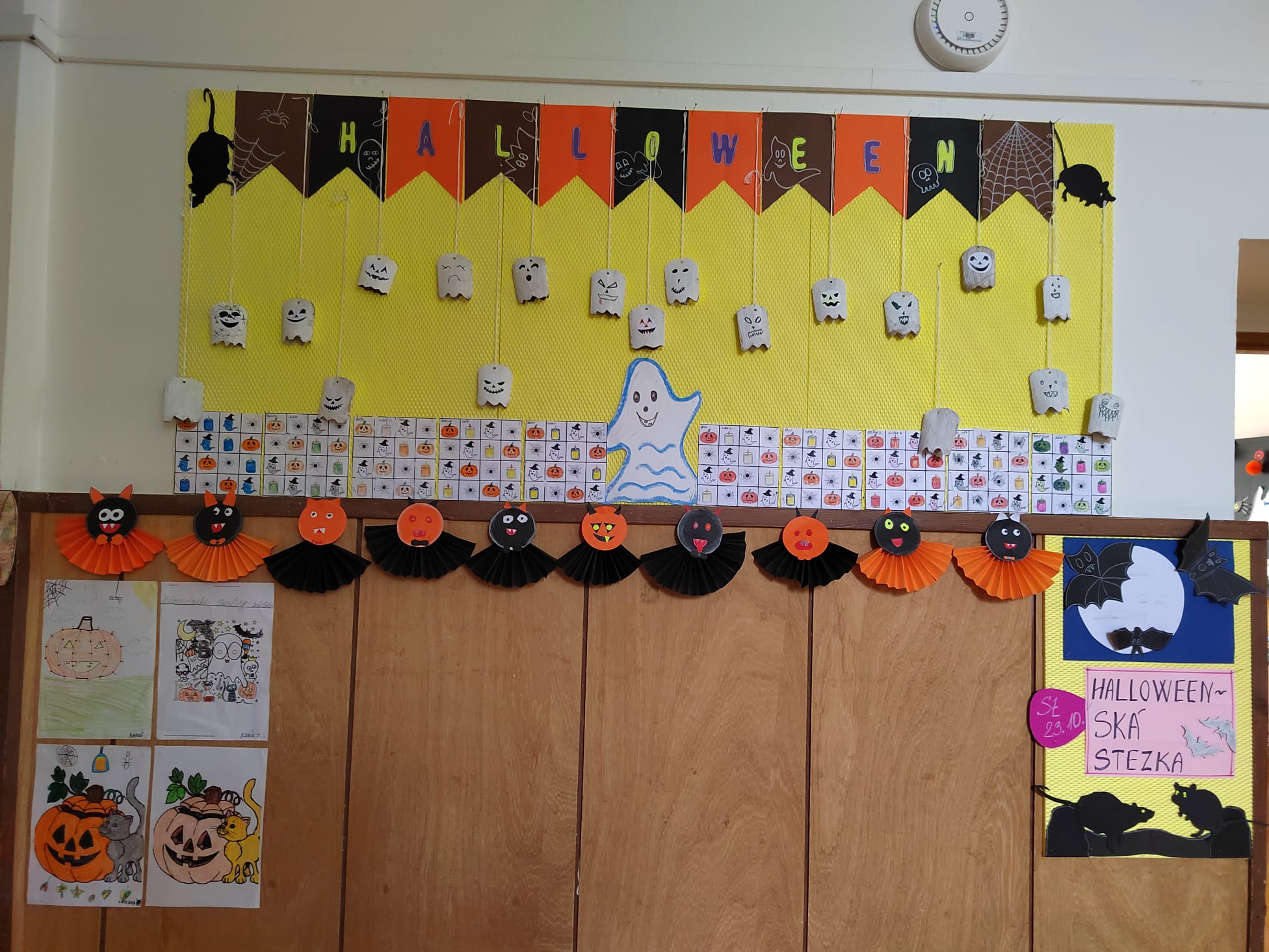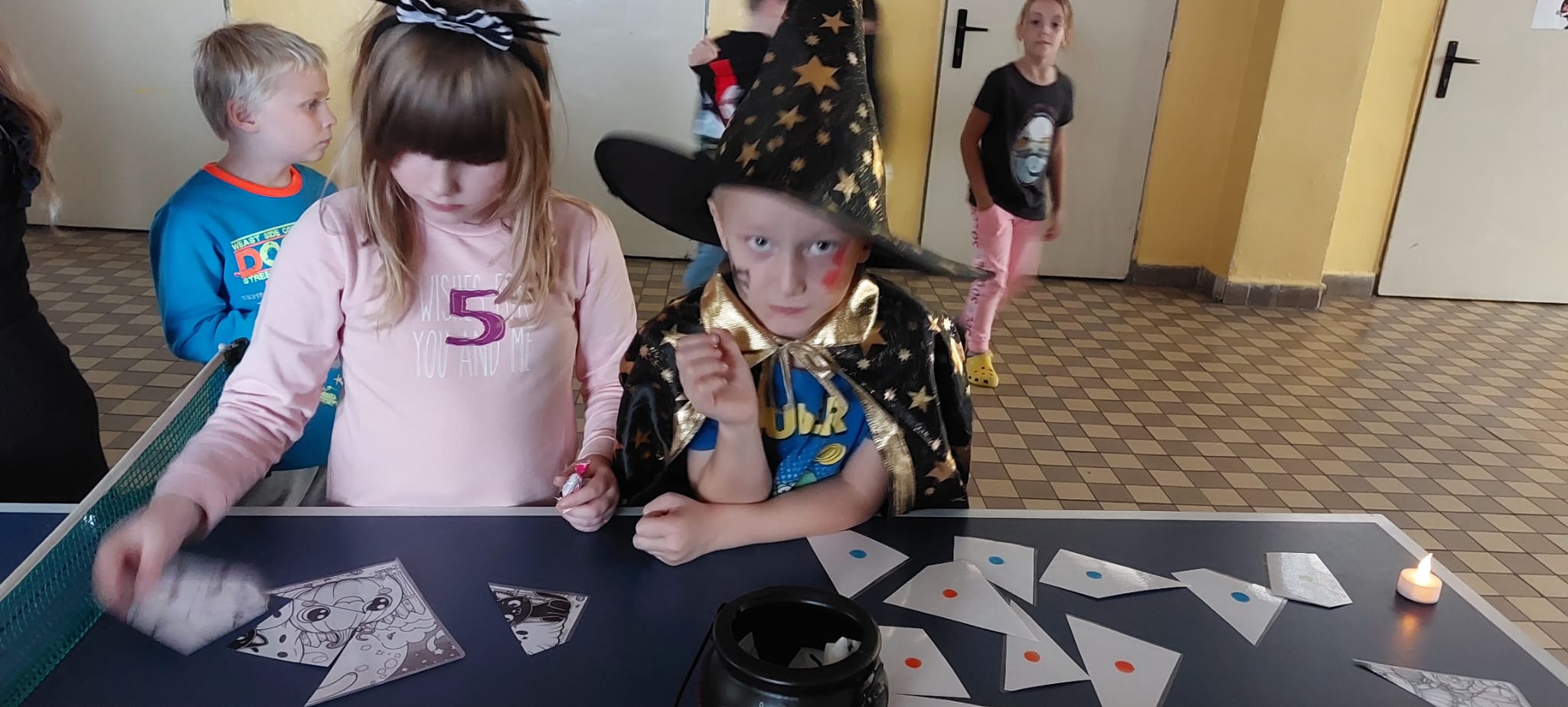 Stezky vedly z oddělení, po chodbách i v prostoru školních šaten. Děti chodily jednotlivě, ve dvojicích nebo ve skupinkách a plnily úkoly, řešily rébusy nebo měly praktické čarodějné úkoly. Jistě nezapomenou na společné luštění, hledání pavouků v modrém cosi:), na pití kouzelného lektvaru a další zážitky. Po vyplnění halloweenských tajenek a splnění daných úkolů čekala na děti opravdu sladká odměna v podobě pavouků, duchů, dýní a dalších dobrot.