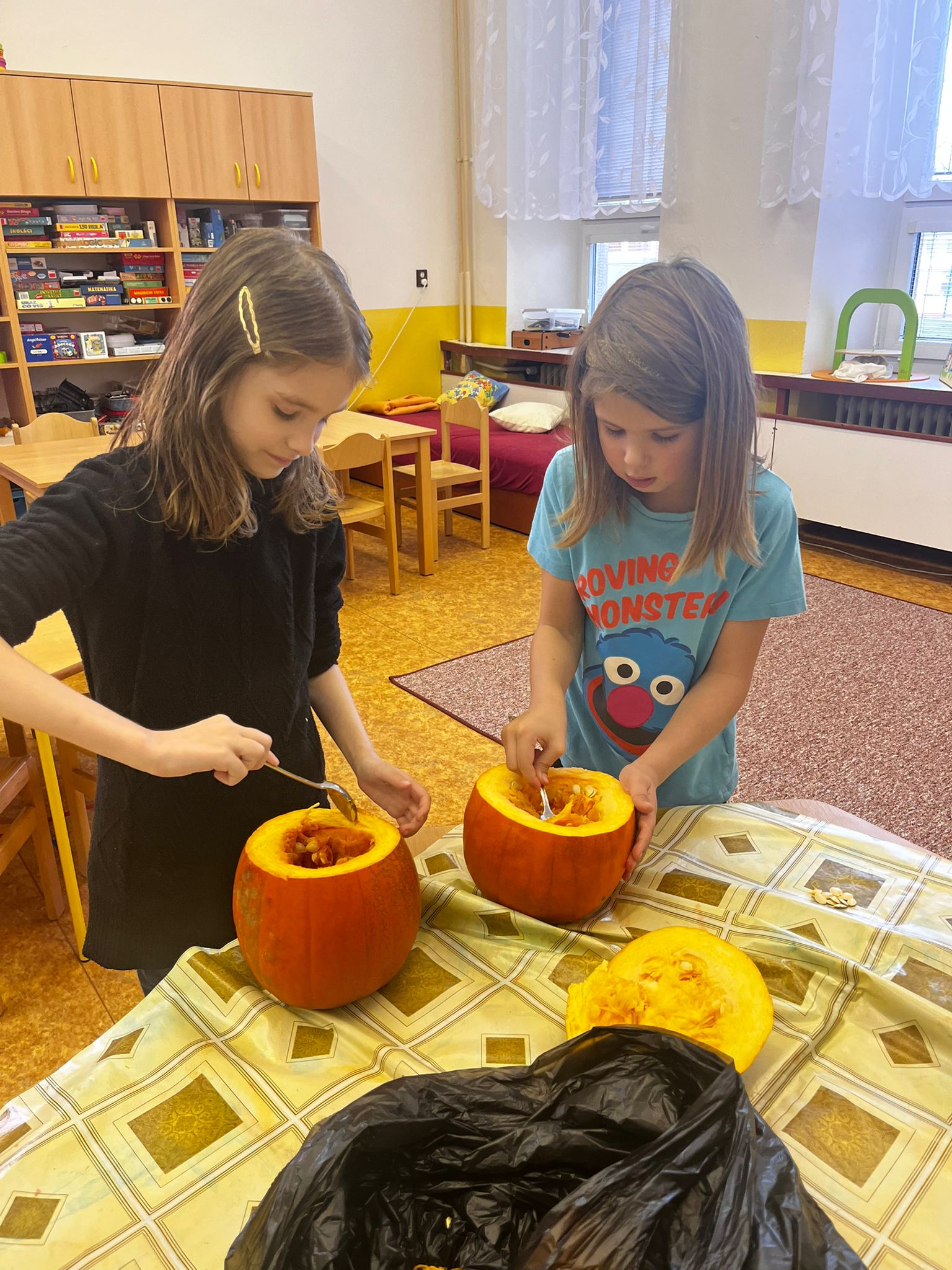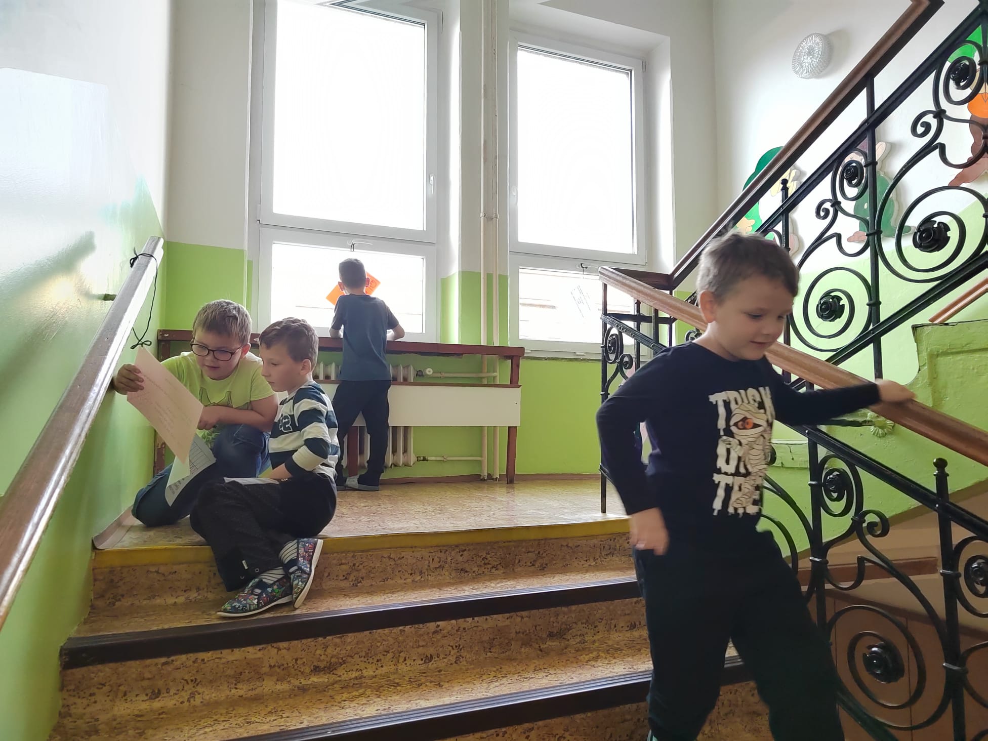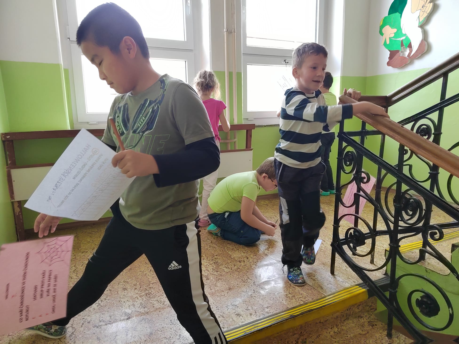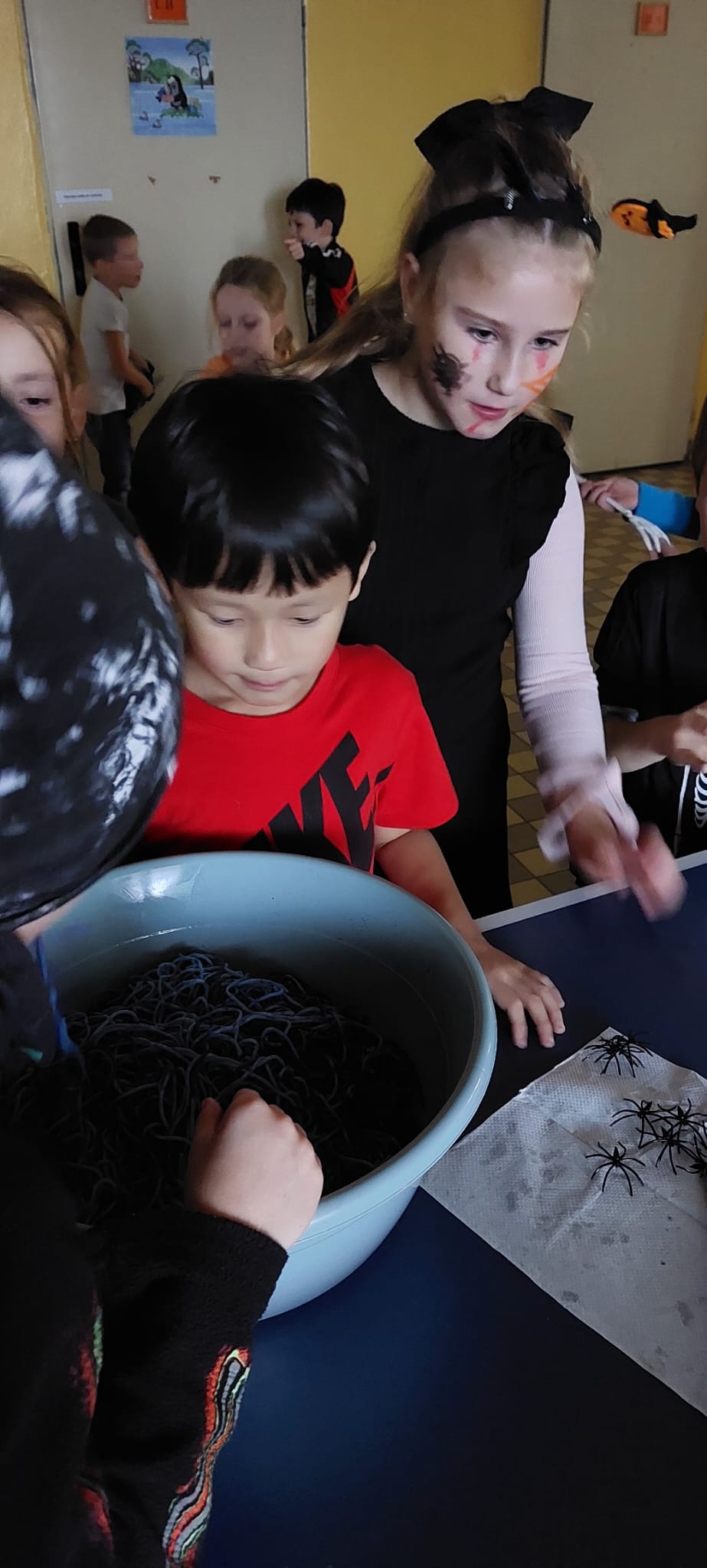 Stezky vedly z oddělení, po chodbách i v prostoru školních šaten. Děti chodily jednotlivě, ve dvojicích nebo ve skupinkách a plnily úkoly, řešily rébusy nebo měly praktické čarodějné úkoly. Jistě nezapomenou na společné luštění, hledání pavouků v modrém cosi:), na pití kouzelného lektvaru a další zážitky. Po vyplnění halloweenských tajenek a splnění daných úkolů čekala na děti opravdu sladká odměna v podobě pavouků, duchů, dýní a dalších dobrot.