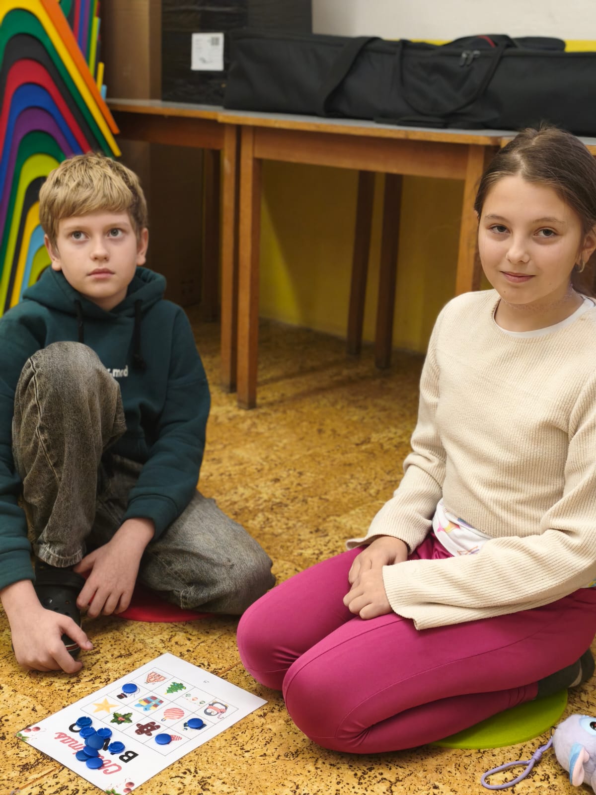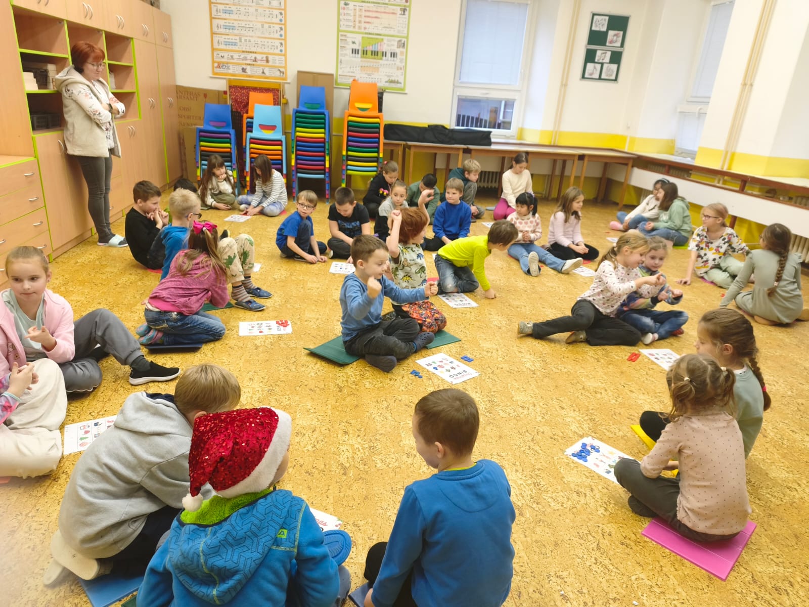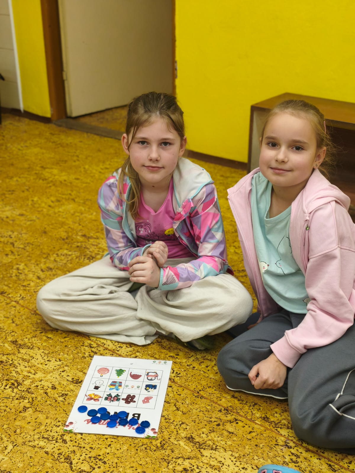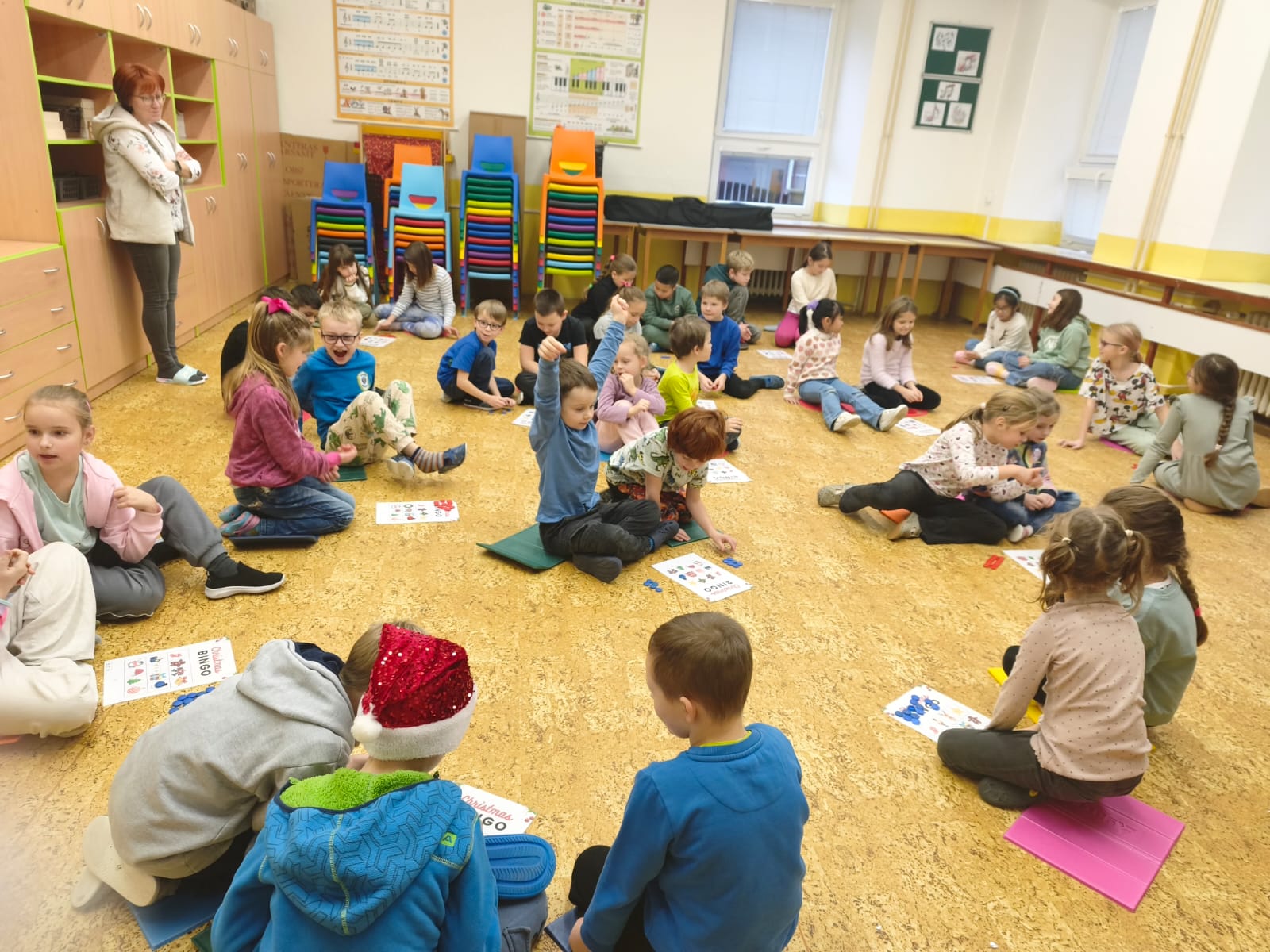 Sešli jsme se v hudebně, kde děti soutěžily ve dvojicích. Musely zaplnit všechna políčka své hrací karty žetony. Pro velký úspěch jsme hru protáhli na dvě kola.