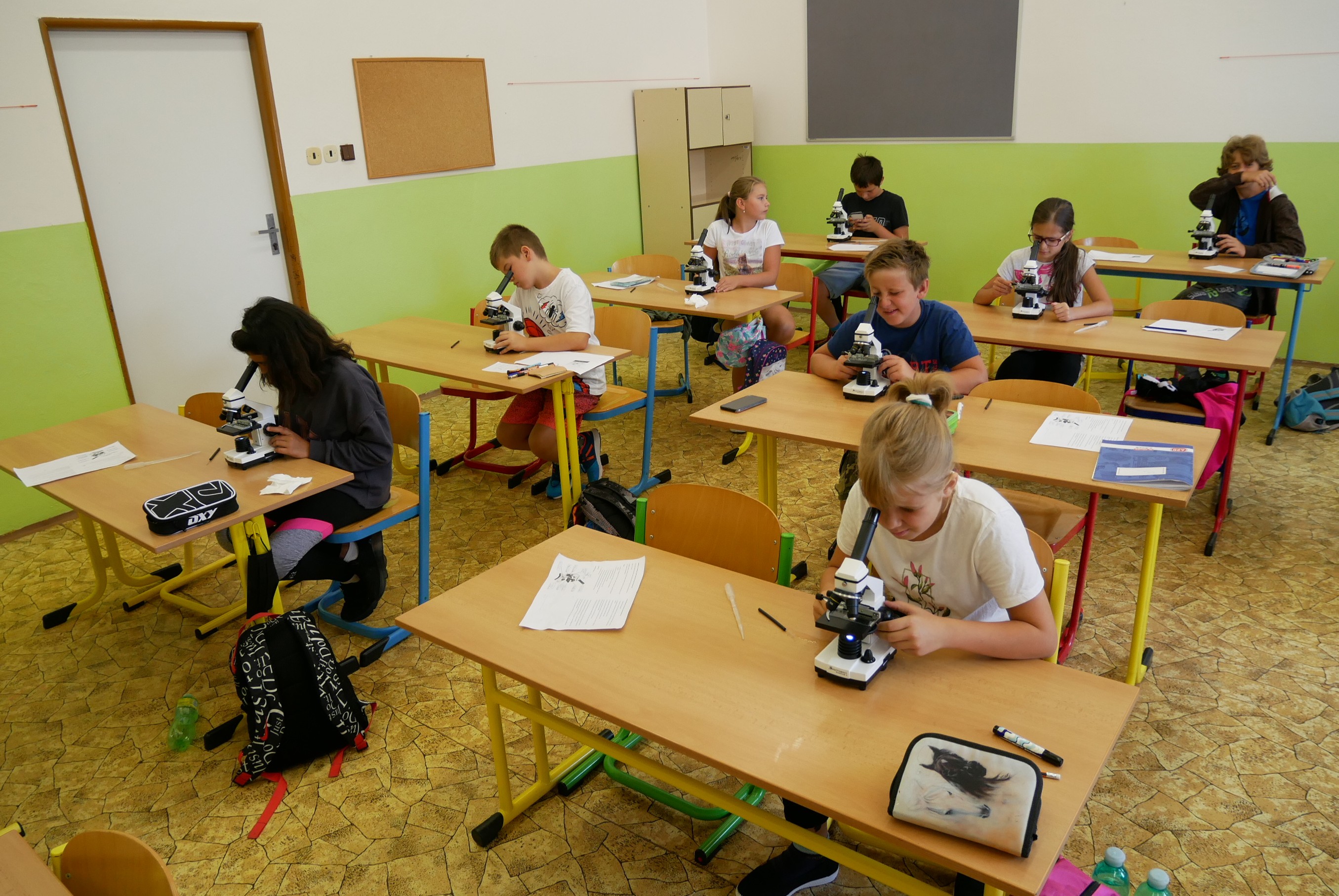 První den jsem žáky seznámil s mikroskopem. Žáci si osvojili práci s ním, zároveň se dozvěděli, jaká jsou pravidla mikroskopování a vypracovávání laboratorních protokolů. Sami si museli připravit vodní preparát mechu měříku, ve kterém viděli chloroplasty, naučili se vypočítávat zvětšení objektu v mikroskopu a formulování závěru laboratorního protokolu aj. Odpoledne pro ně byla připravena exkurze na Pastýřskou stěnu pod mým vedením. Žákům zde byly presentovány různé typy lesů a část fauny, která je obývá – např. se nám podařilo nalákat na nahrávku strakapouda velkého, děti si mohly z blízka prohlédnout slepýše či pozorovat saranče modrokřídlé, které obývá zejména naše stepní lokality a v Děčíně není mnoho míst, kde by se dalo vidět.
