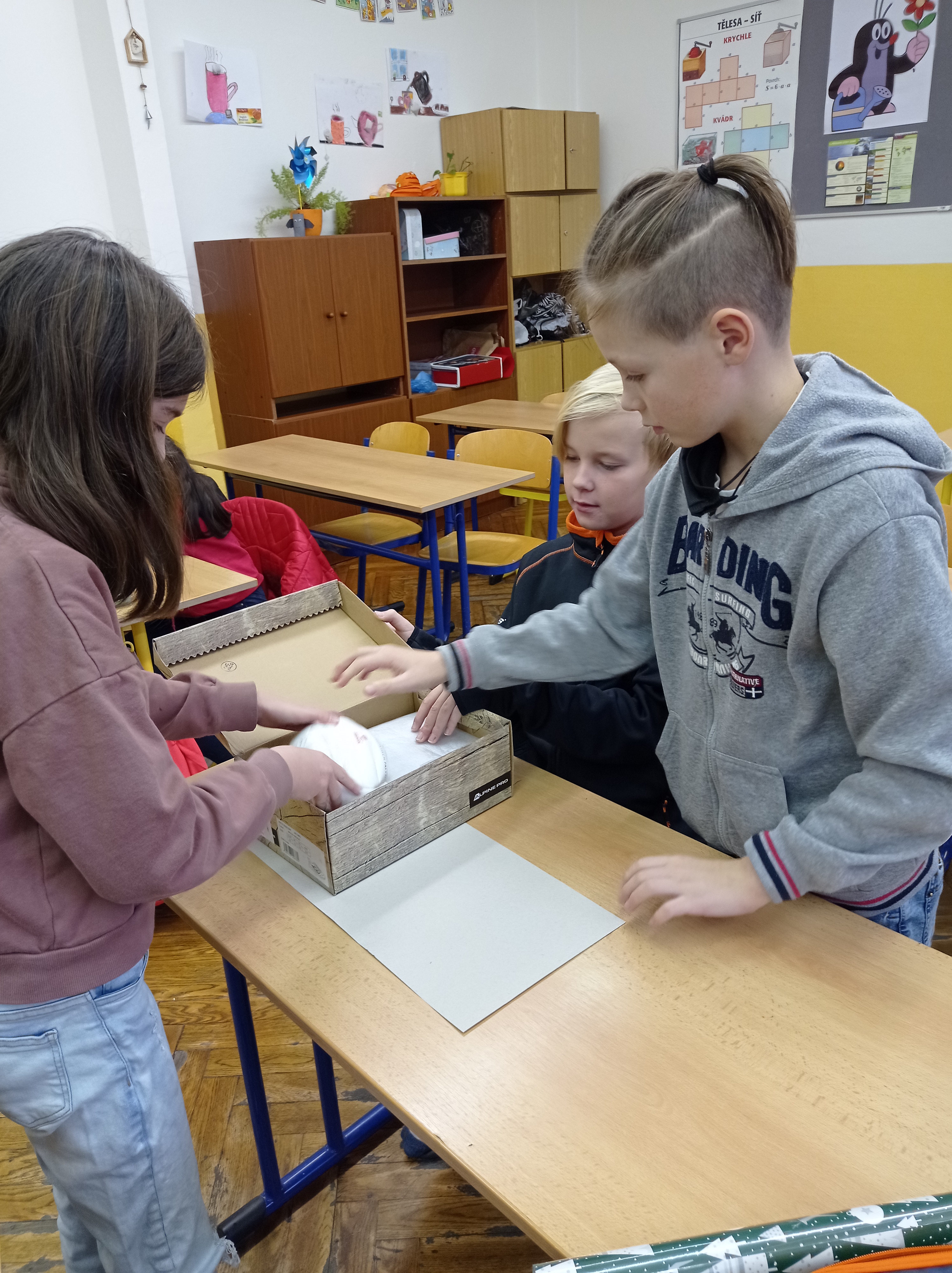 Sbírka Krabice od bot funguje tak, že si darující vybere ze seznamu dítě, které chce obdarovat a do hezky zabalené krabice od bot mu vloží dárky, které si dotyčné dítko přeje. Naše třída si vybrala chlapce Marka z Děčína (6 let), který si pod stromečkem od Ježíška přeje dostat míč, knihu a hru. Žáci mu k těmto darům navíc přidali vlastnoručně vyrobená přáníčka a další drobnosti, které by ho mohly také potěšit (miniaturky, autíčka, psací potřeby, aj.). Po naplnění krabice ji žáci sami hezky zabalili a nyní už krabice čeká na své doručení do sběrného místa a na pozdější předání Markovi.