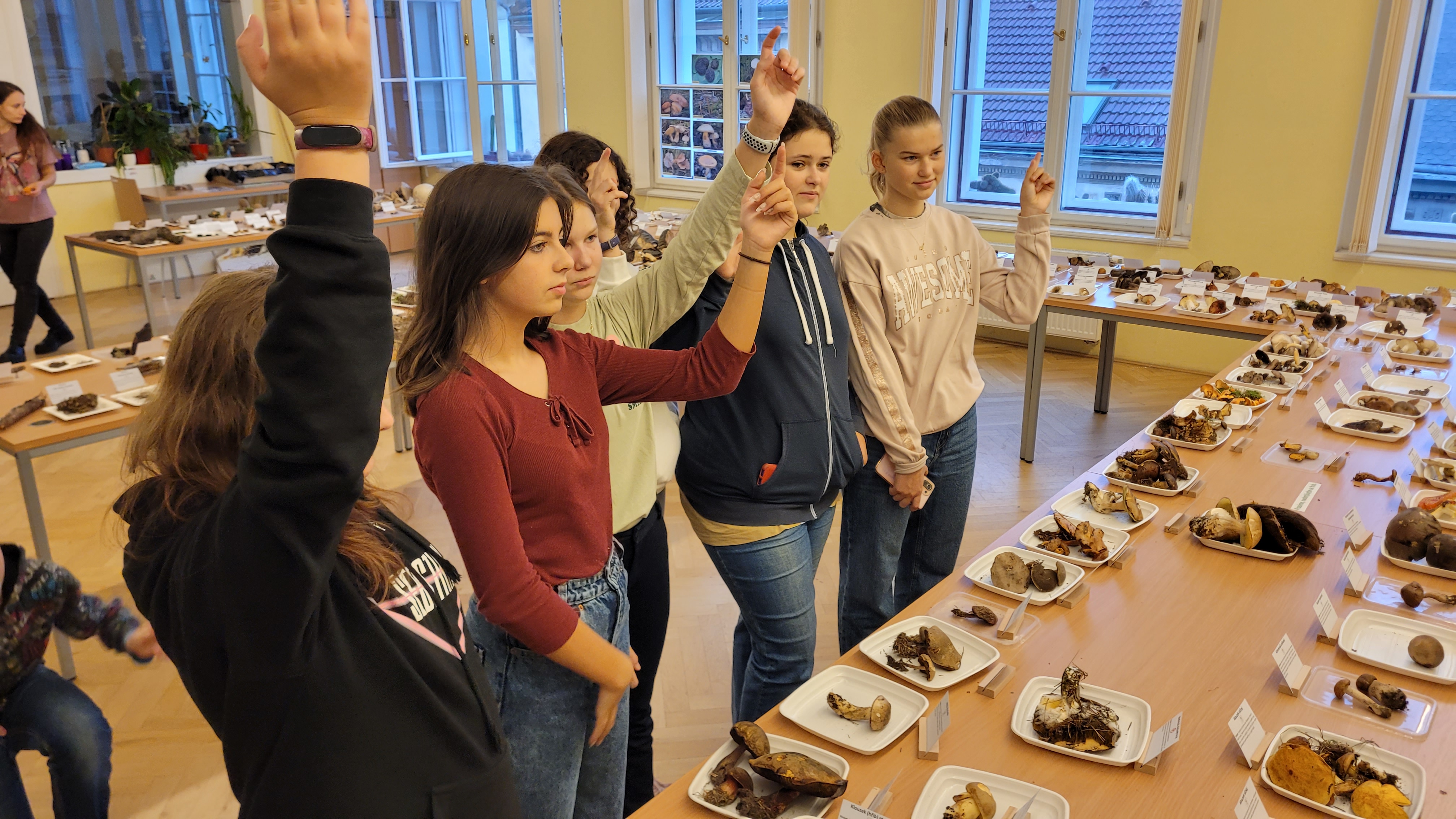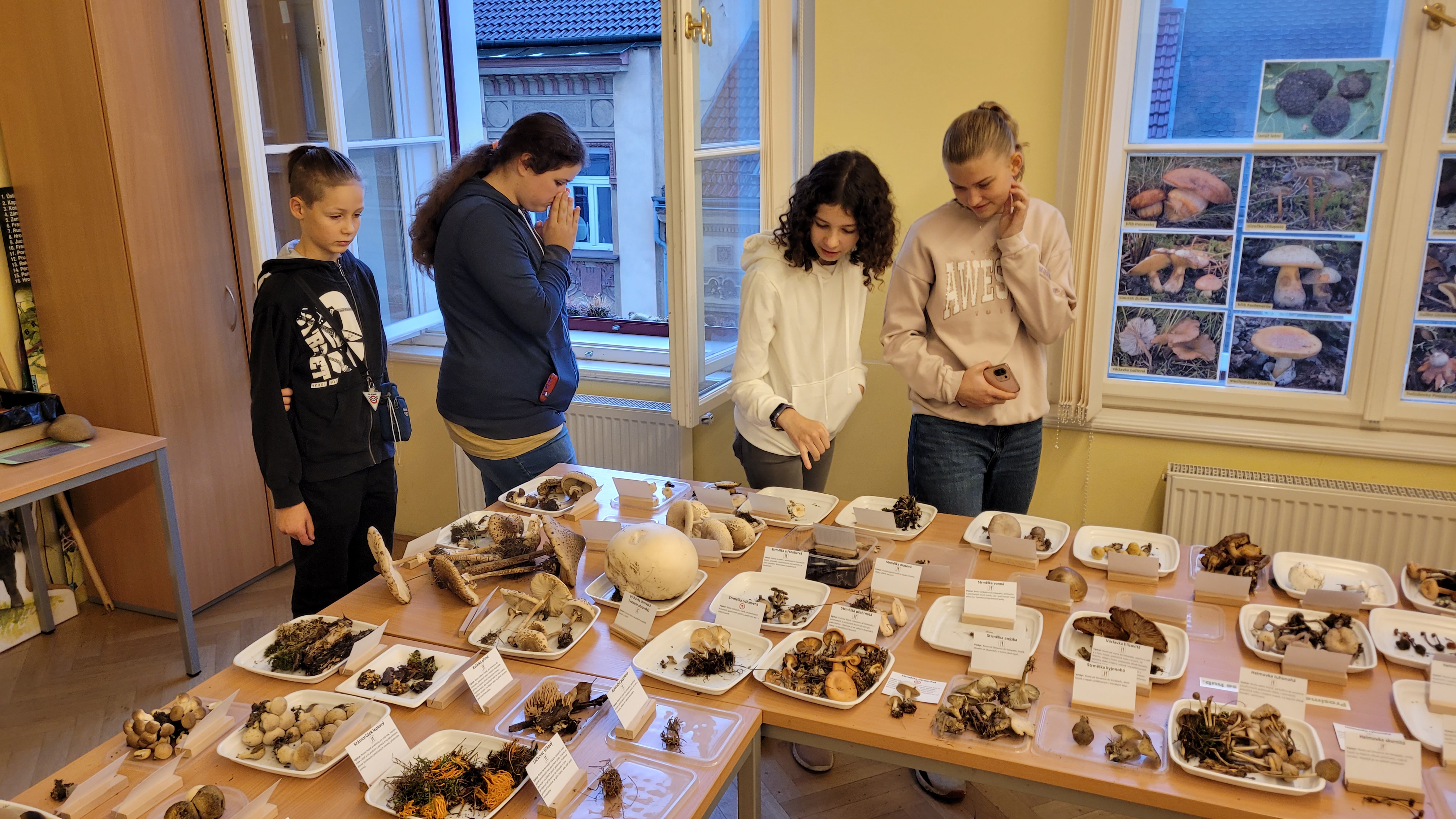 V úvodu si žáci nejprve prošli výstavou samostatně, následně pak proběhla komentovaná část od zaměstnankyně muzea. Výčet druhů byl obsáhlý, žáci měli možnost vidět vedle sebe jak běžné učebnicové druhy, tak i druhy, o kterých by ani neřekli, že patří mezi houby.
