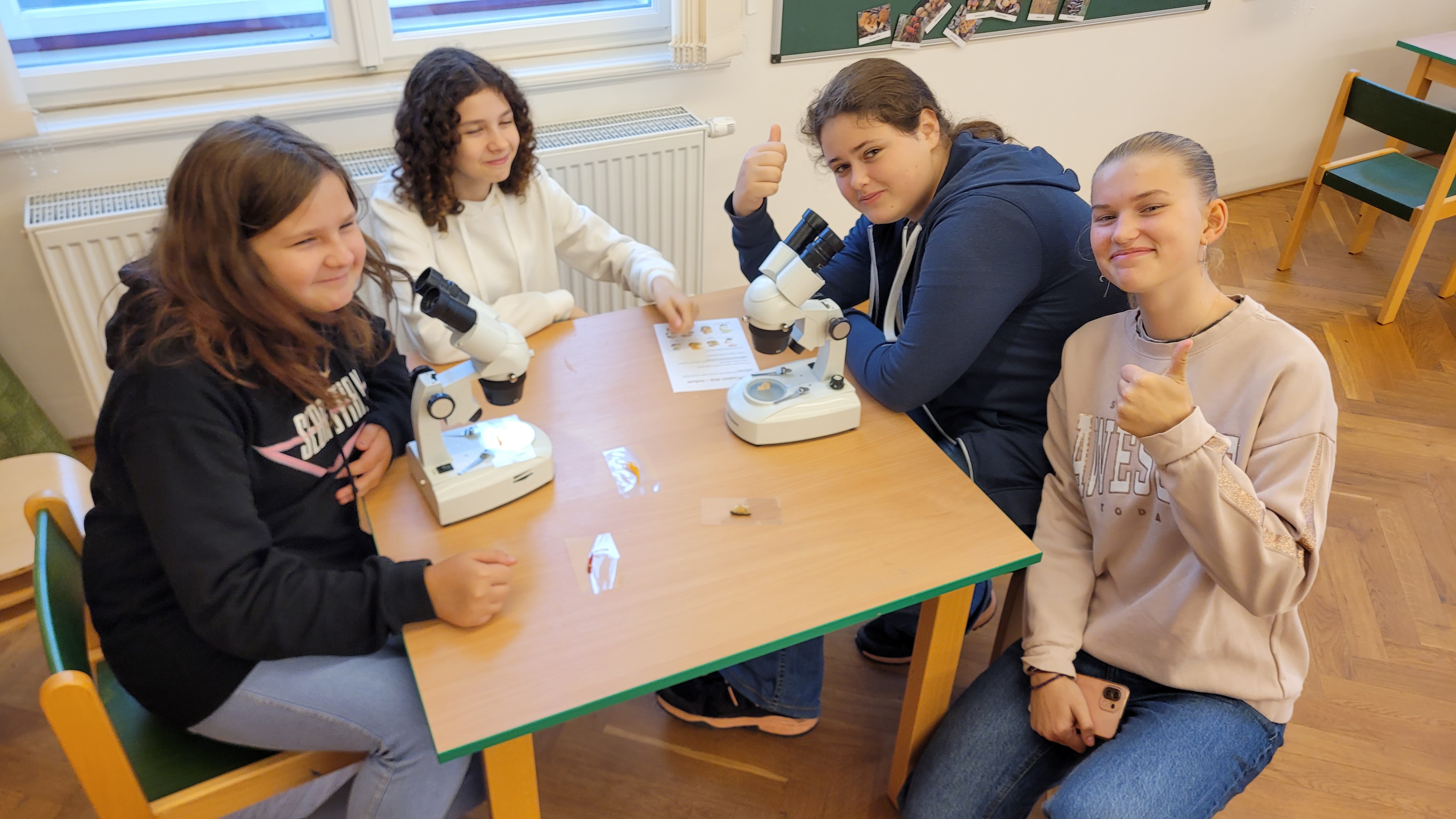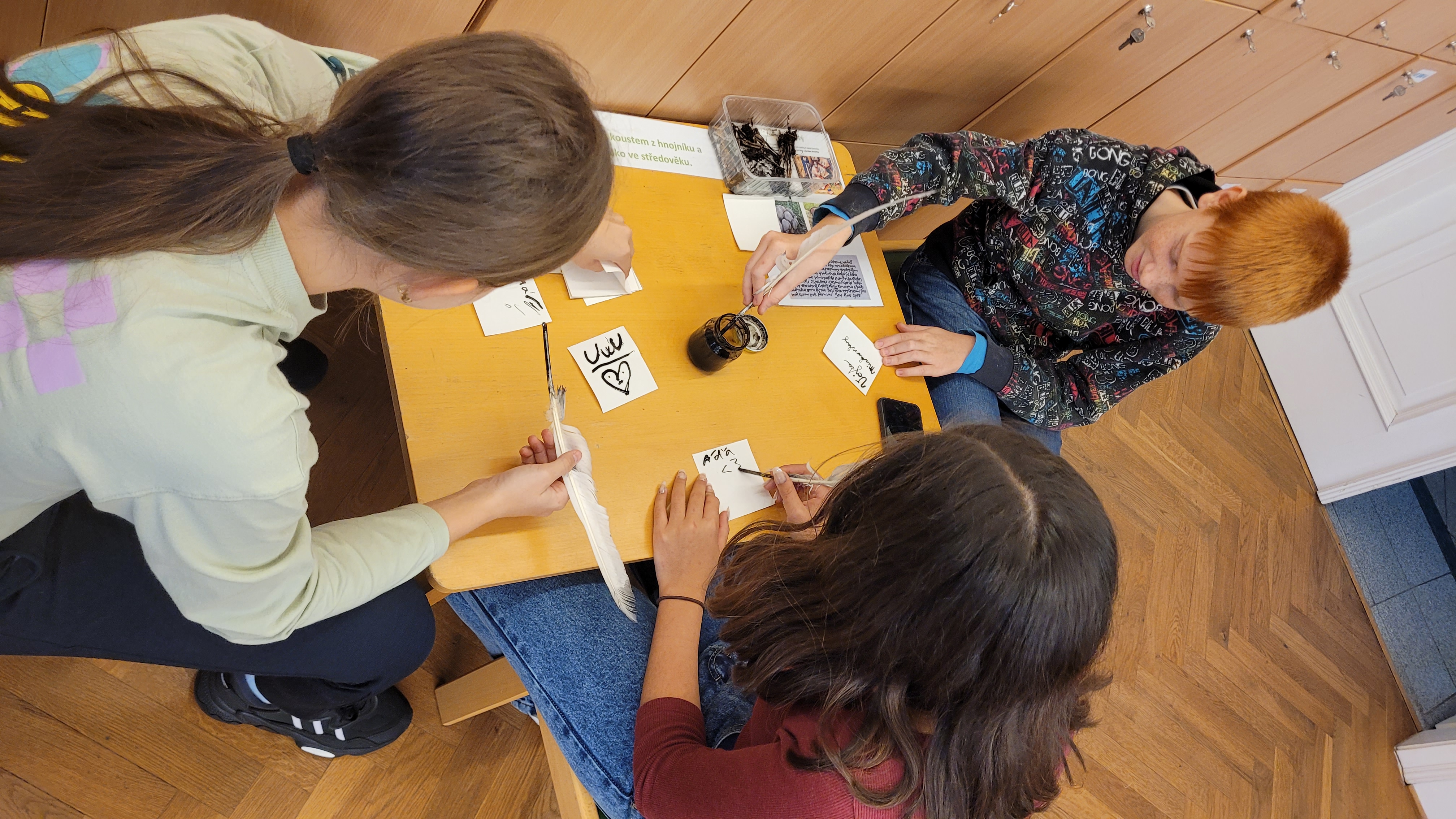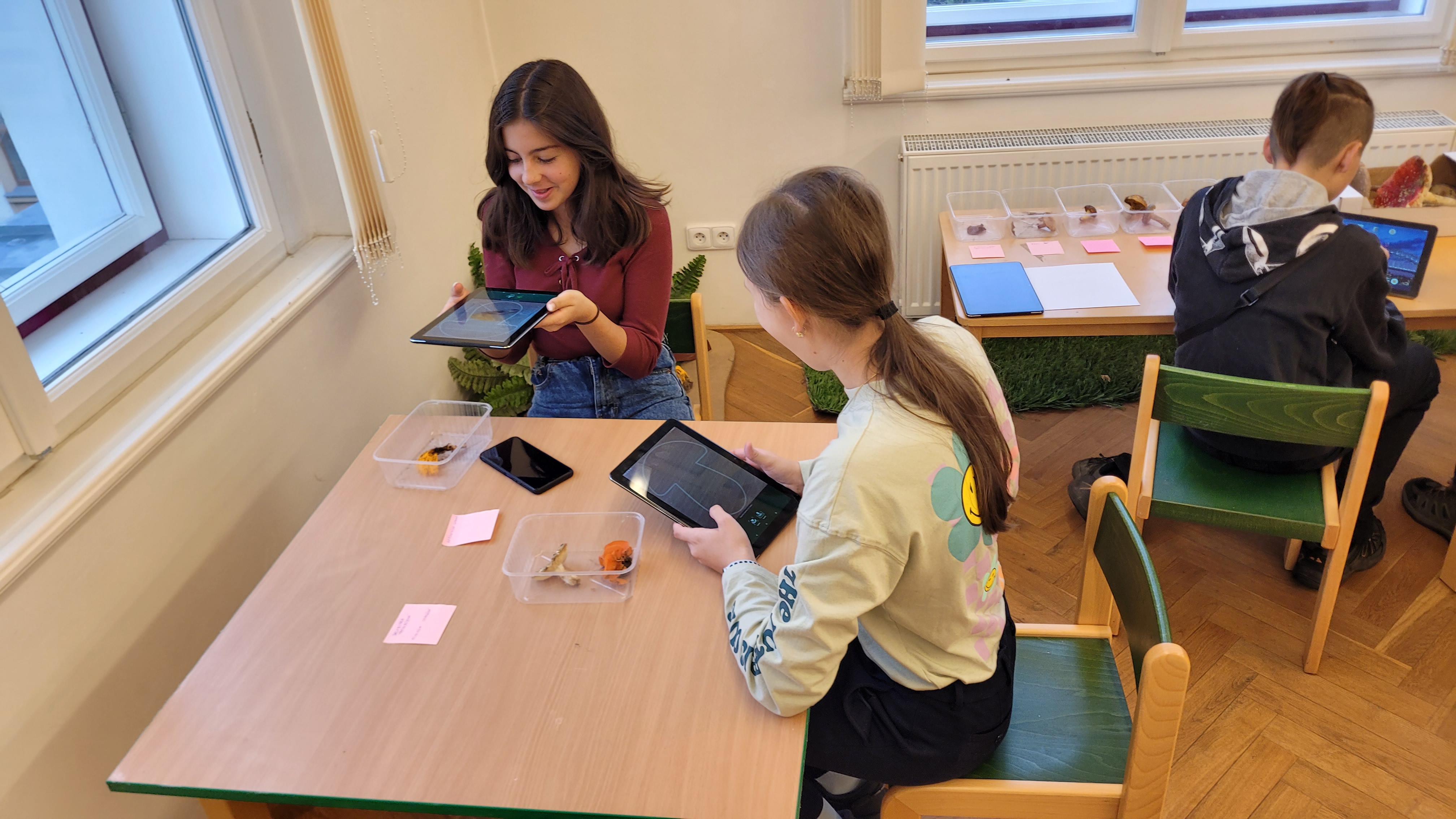Po projití výstavy se žáci přesunuli do vzdělávacích prostor muzea, kde pro ně byly připraveny různé aktivity. Prohlédli si zde houby pod bino-lupou, vyzkoušeli funkčnost nebo spíše nefunkčnost aplikace k určování hub (vývojáři aplikace mají ještě co vylepšovat), zahráli si společenskou hru s houbovou tématikou a někteří si vyzkoušeli psaní brkem pomocí inkoustu z hnojníku.