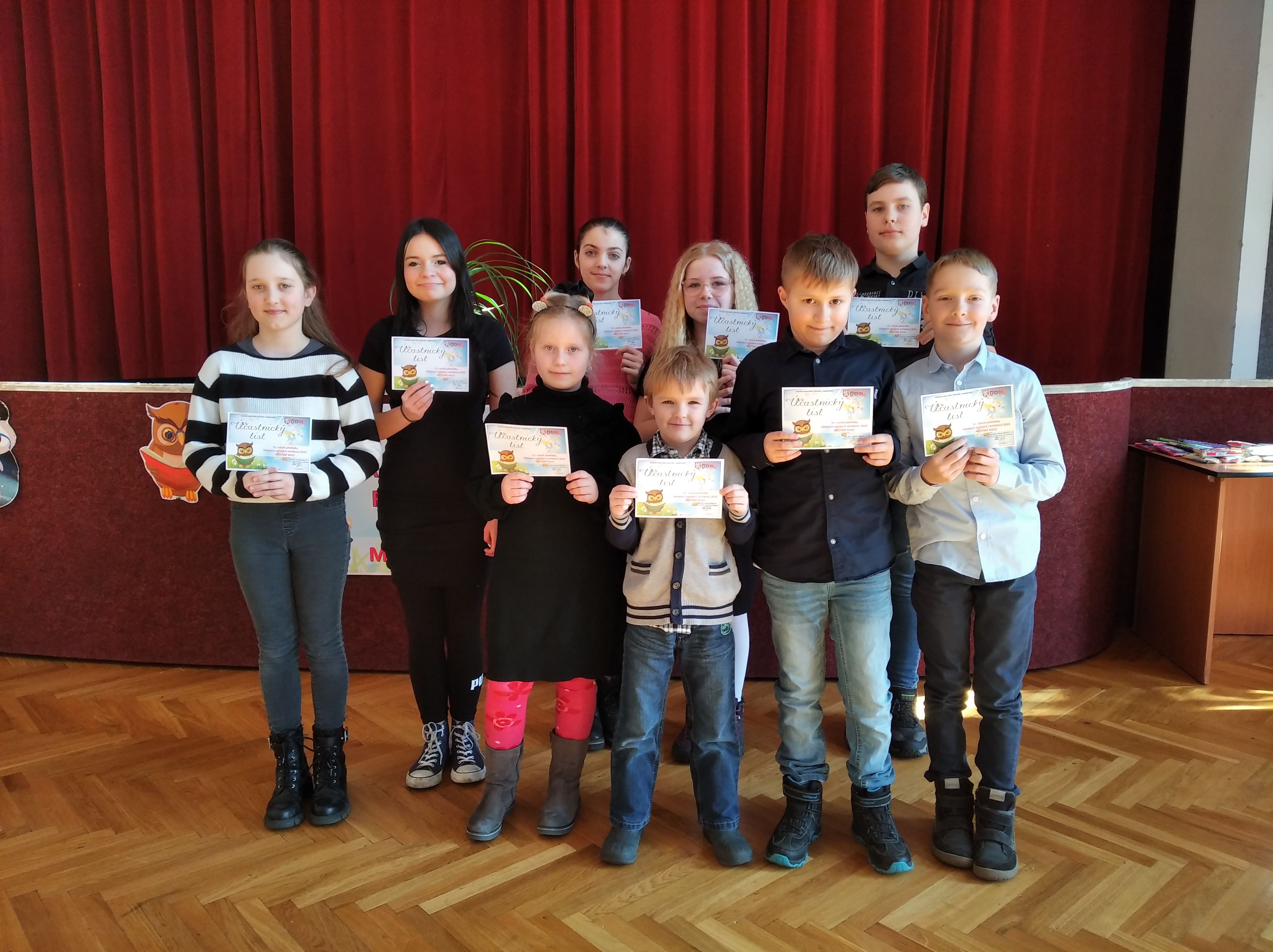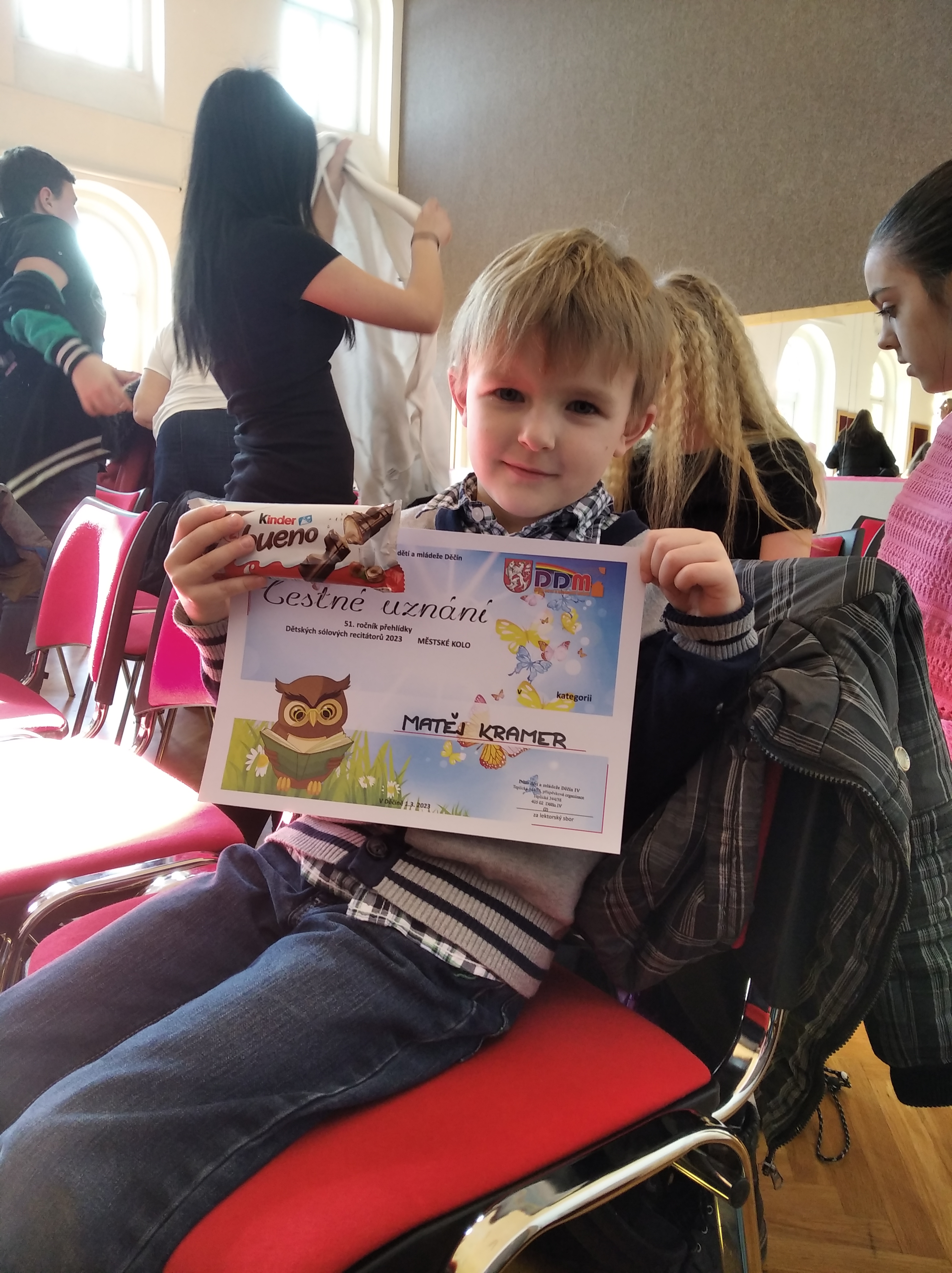 Dne 1. března se v prostorách velkého sálu v DDM na Teplické ulici v Děčíně konalo Městské kolo Recitační soutěže. Do tohoto kola postoupilo celkem 9 našich žáků, kteří se úspěšně probojovali sítem školního kola. Každý z postupujících musel mít na Městské kolo připravené 2 básničky. S výběrem básniček pomáhali žákům vyučující českého jazyka.