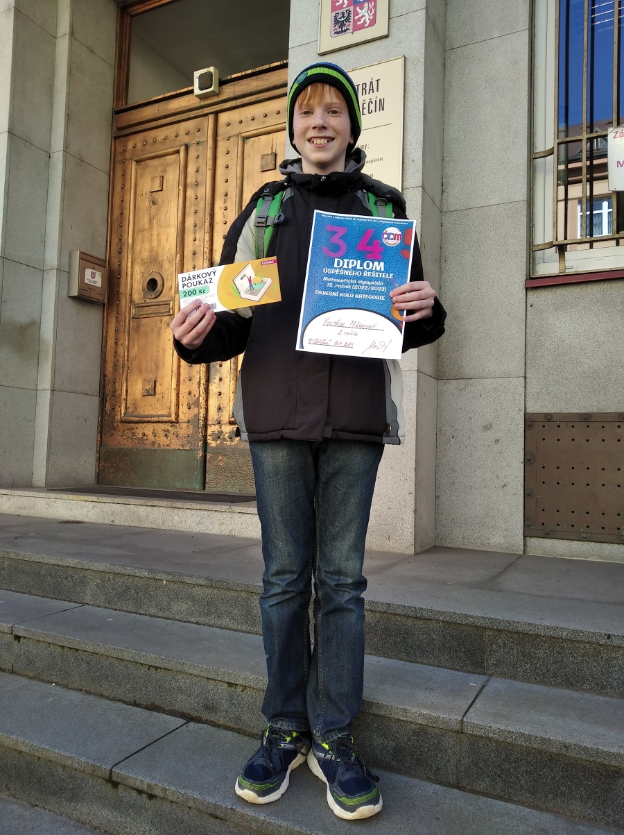 Ve středu 12. dubna 2023 se na magistrátu města Děčín konalo okresní kolo matematické olympiády kategorie Z6, ve kterém měla naše škola svého zástupce. V souboji nejšikovnějších matematikářů celého okresu bojoval i Vojtěch Miškovský ze 6.B a získal za svůj výkon 2. místo, které je tak fantastickým úspěchem v dané konkurenci ostatních žáků.