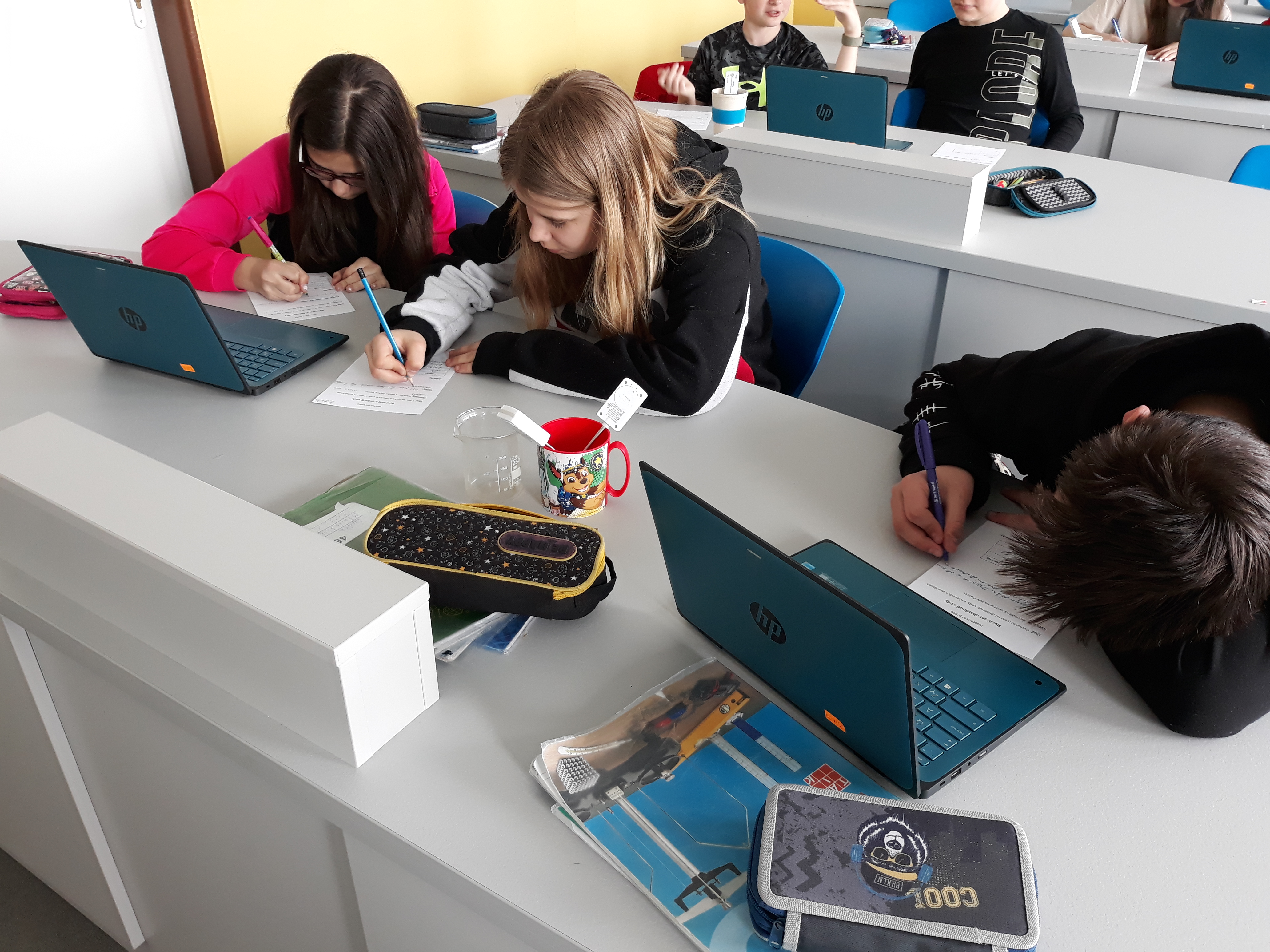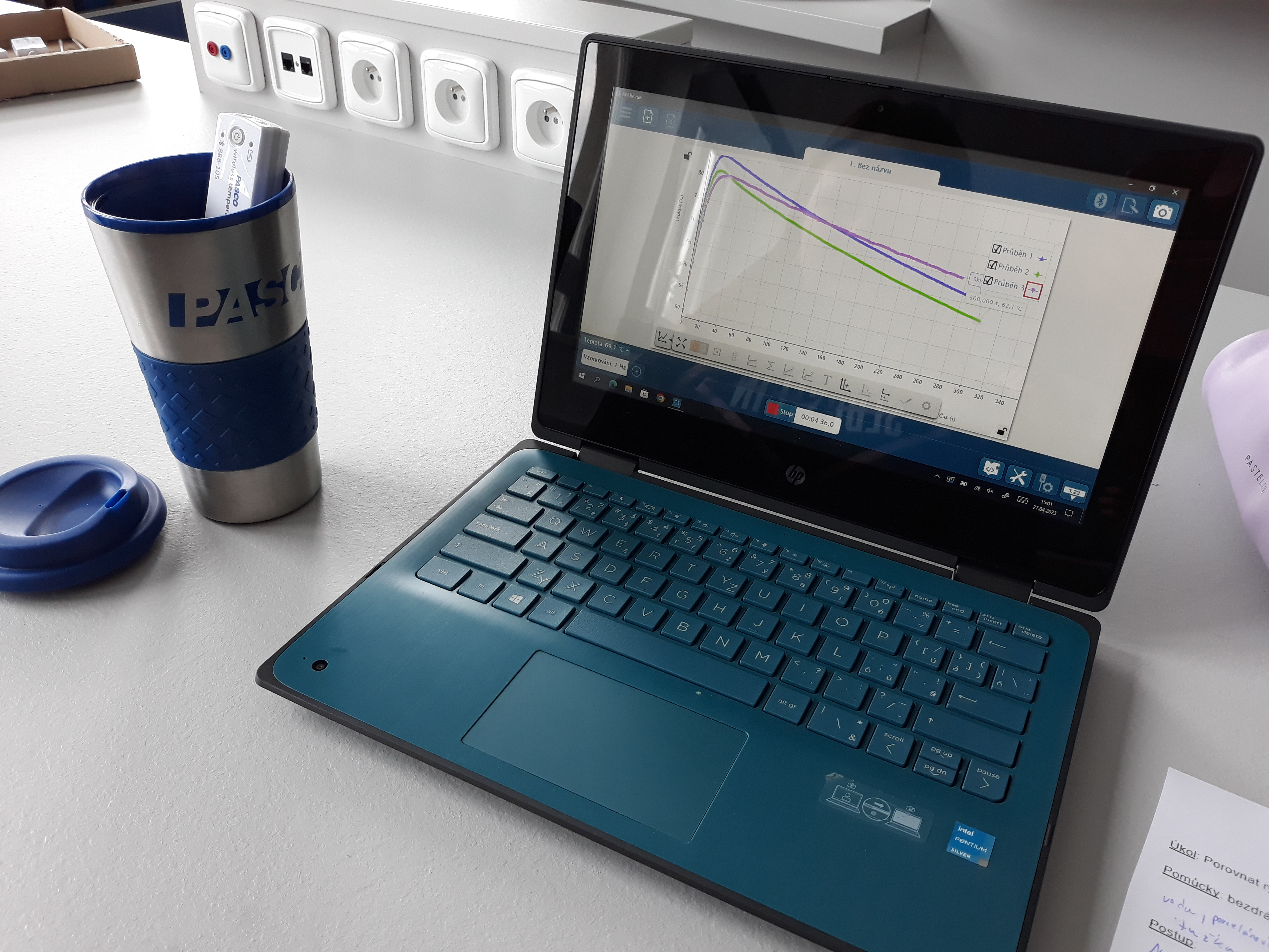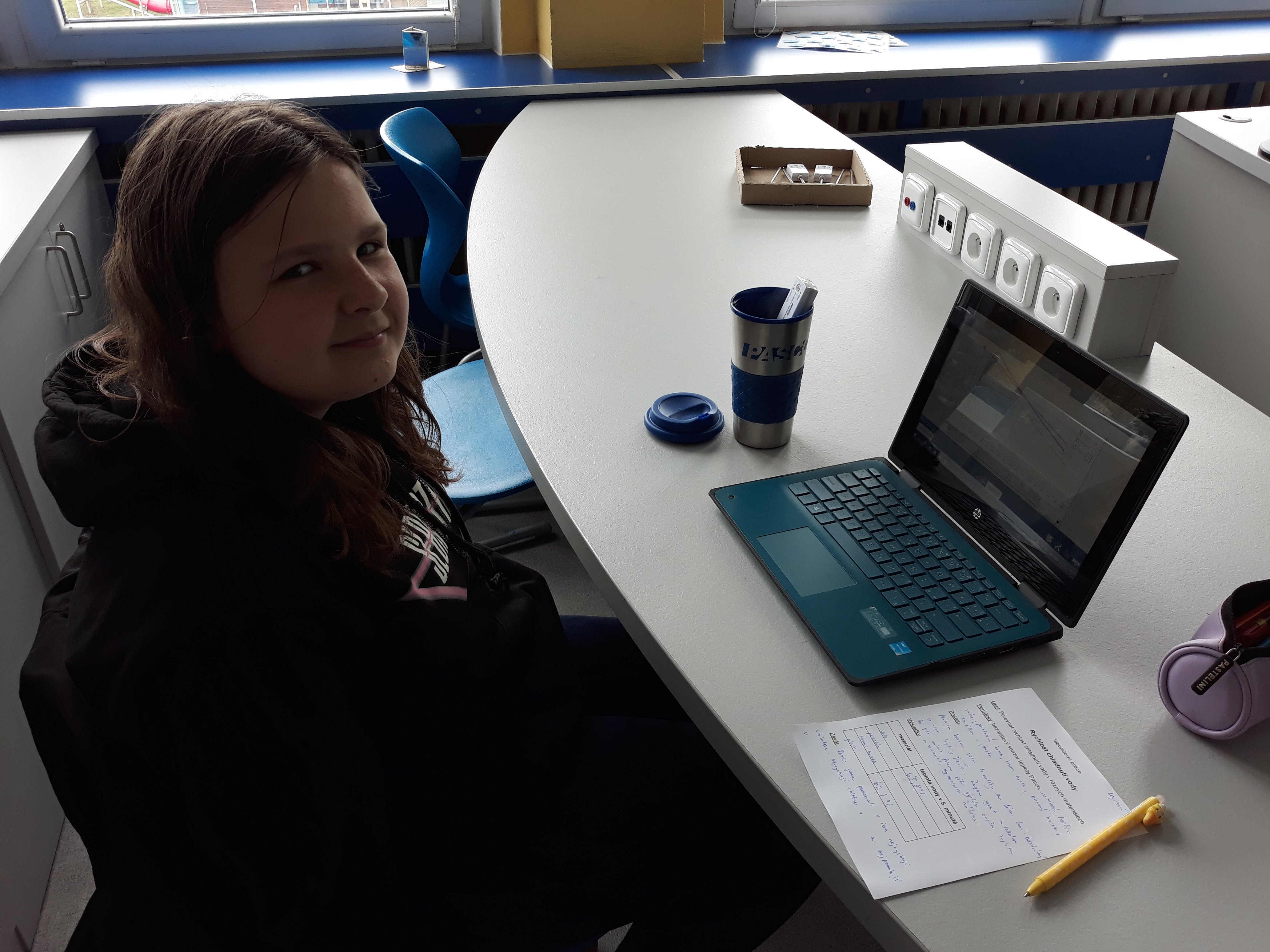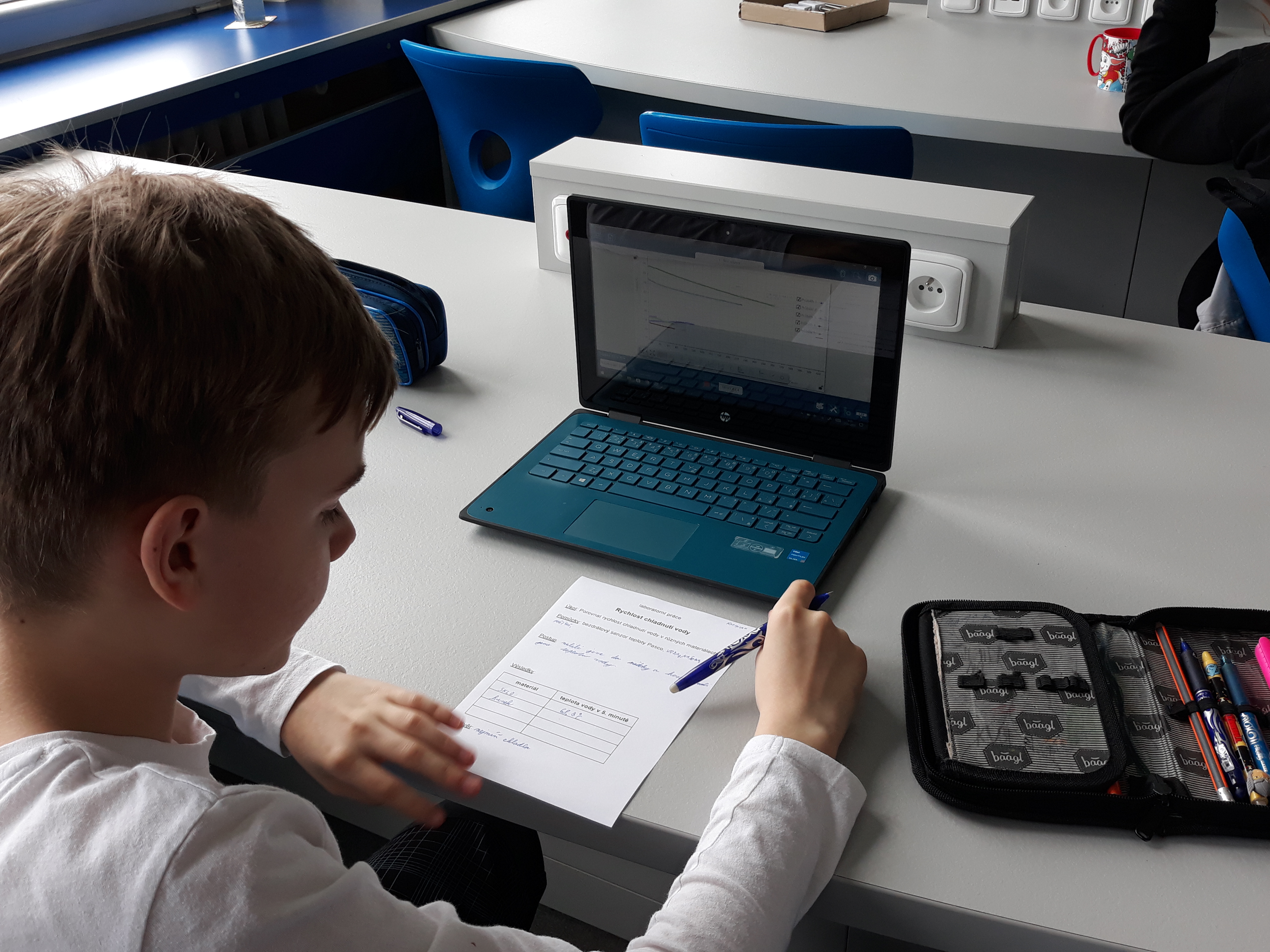 Žáci 6. ročníků se při hodině fyziky seznámili s různými druhy bezdrátových čidel od firmy Pasco. Poprvé si vyzkoušeli práci s jedním z nich, a tím byl senzor teploty. Dostali horkou vodu a po stanovenou dobu měřili její teplotu. Chladnutí vody sledovali v grafu pomocí softwaru Sparkvue. Porovnávali, jak rychle vychladne stejné množství vody v porcelánovém hrnku, plastovém kelímku, skleněné kádince a termohrnku.