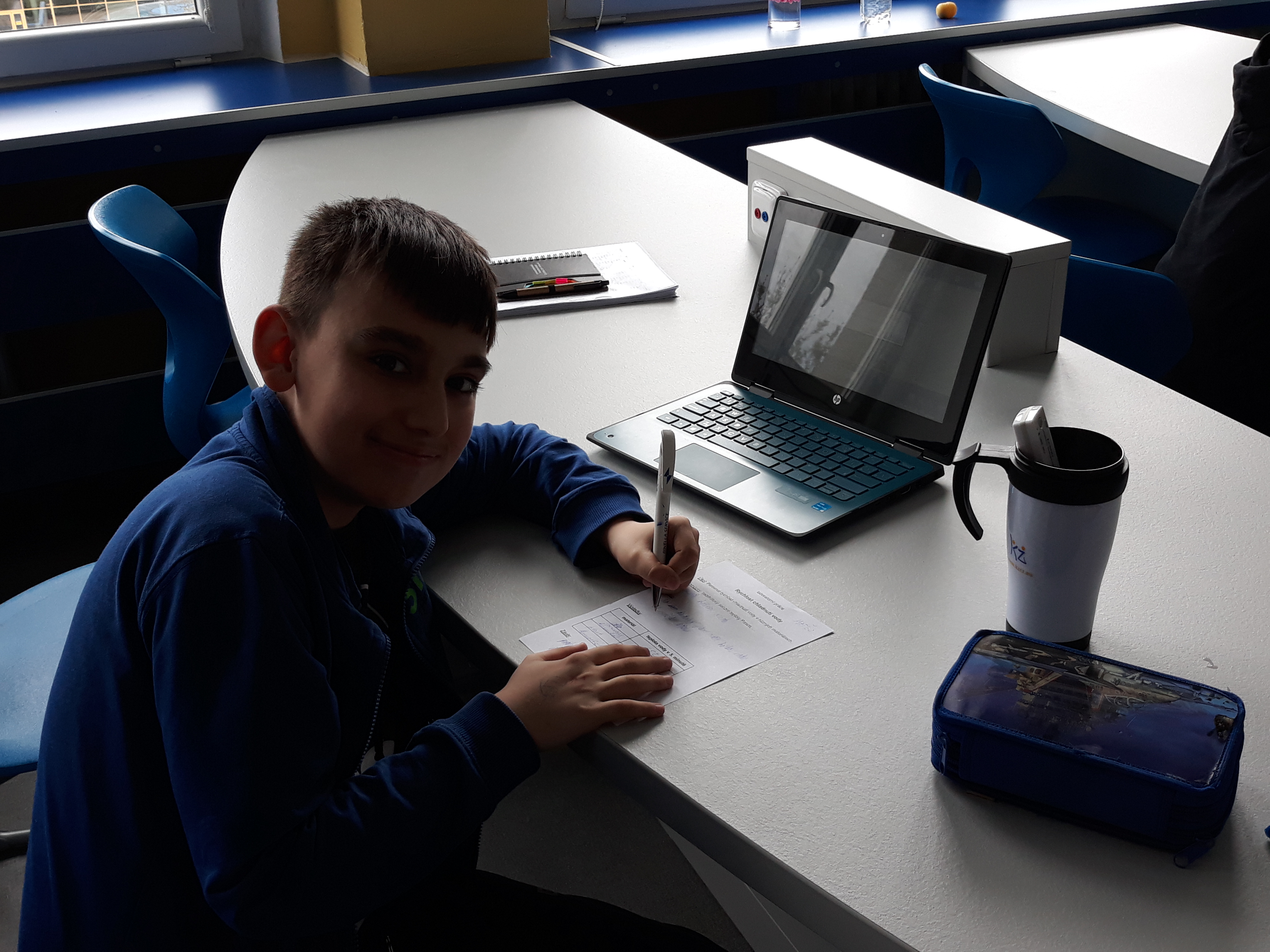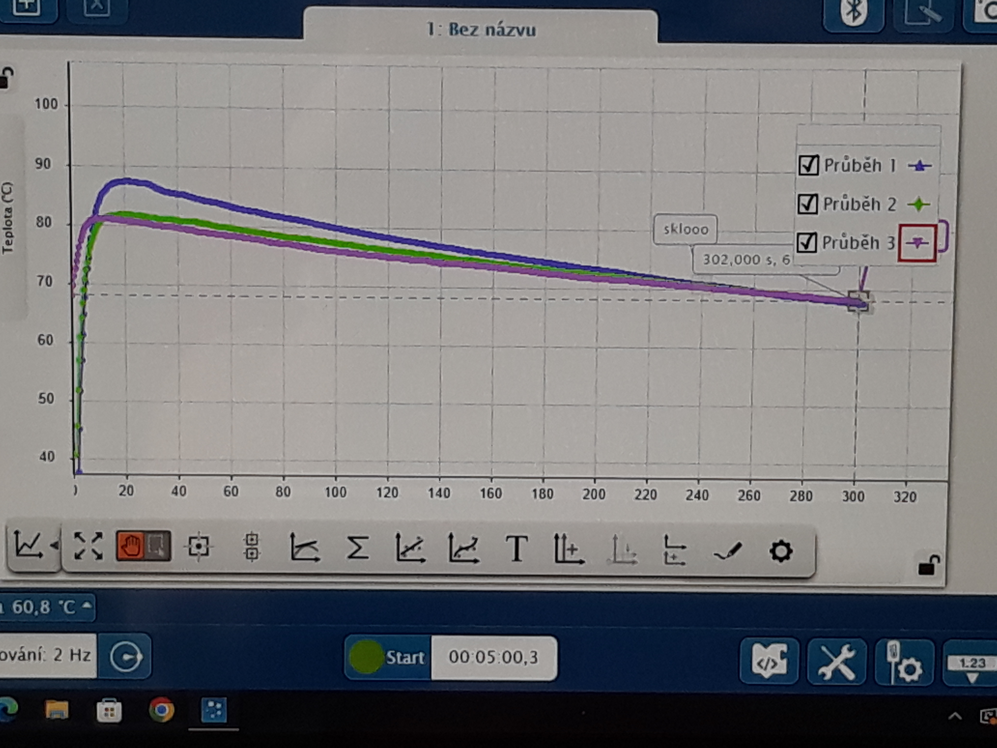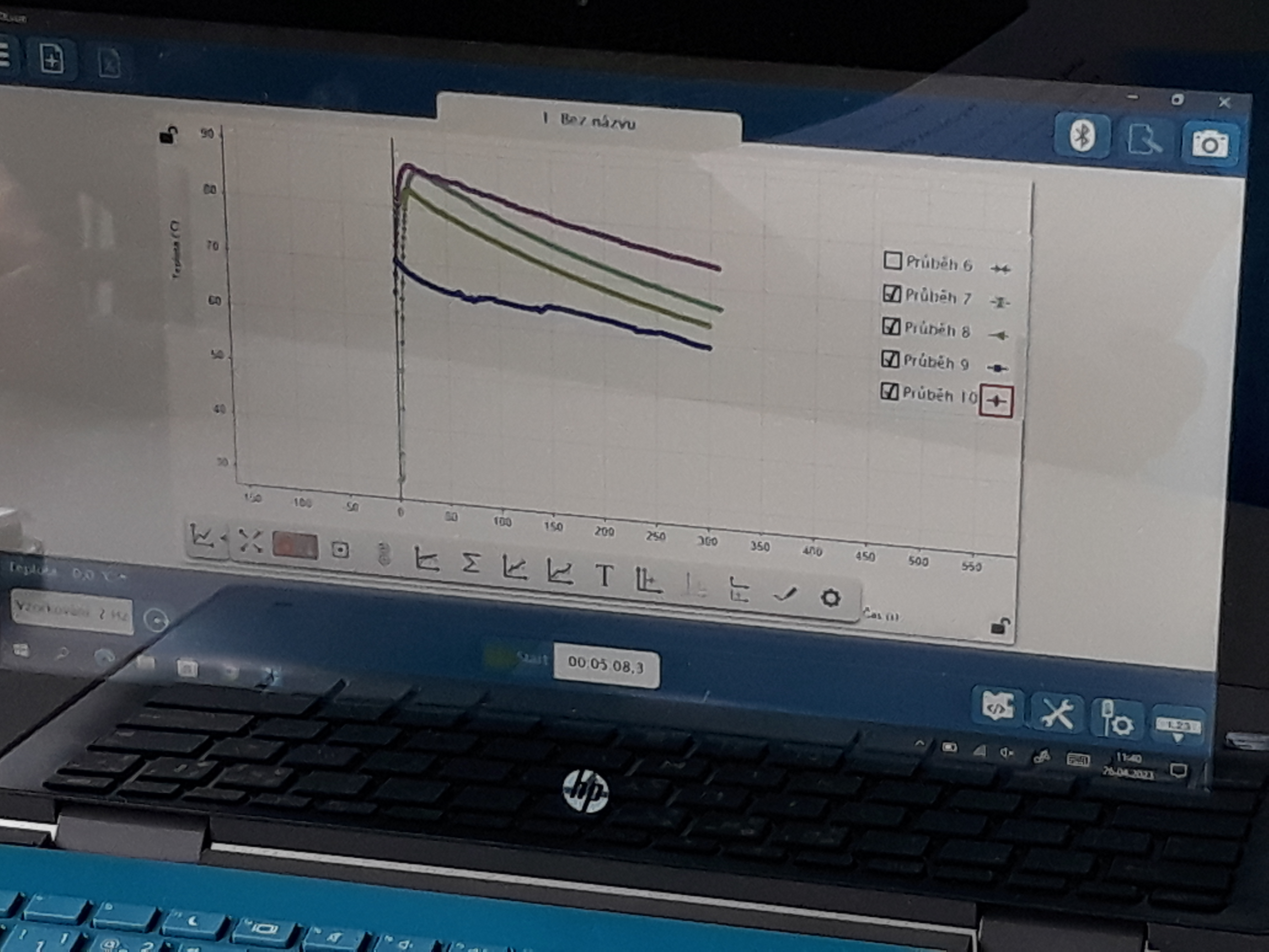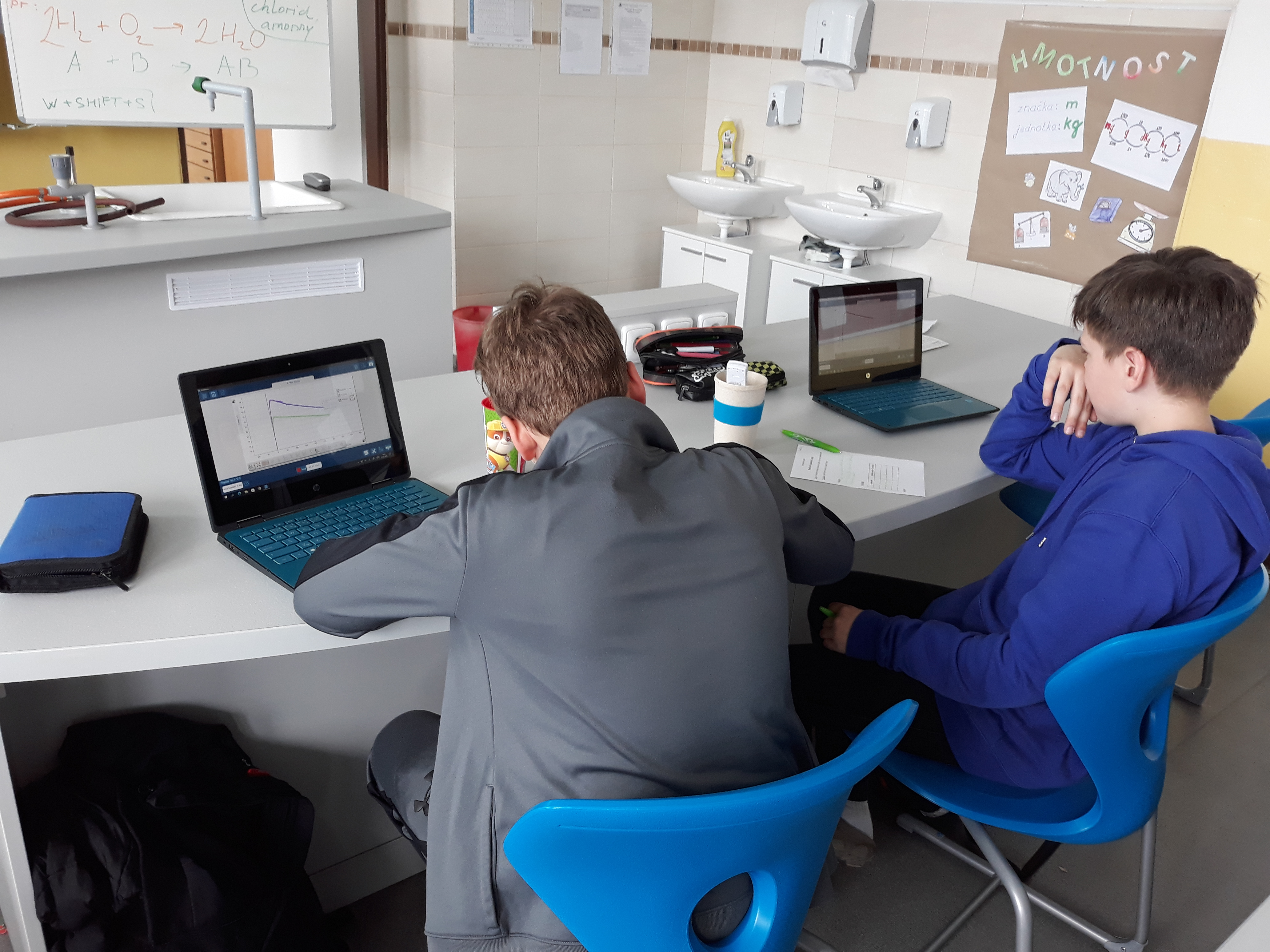Žáci 6. ročníků se při hodině fyziky seznámili s různými druhy bezdrátových čidel od firmy Pasco. Poprvé si vyzkoušeli práci s jedním z nich, a tím byl senzor teploty. Dostali horkou vodu a po stanovenou dobu měřili její teplotu. Chladnutí vody sledovali v grafu pomocí softwaru Sparkvue. Porovnávali, jak rychle vychladne stejné množství vody v porcelánovém hrnku, plastovém kelímku, skleněné kádince a termohrnku.