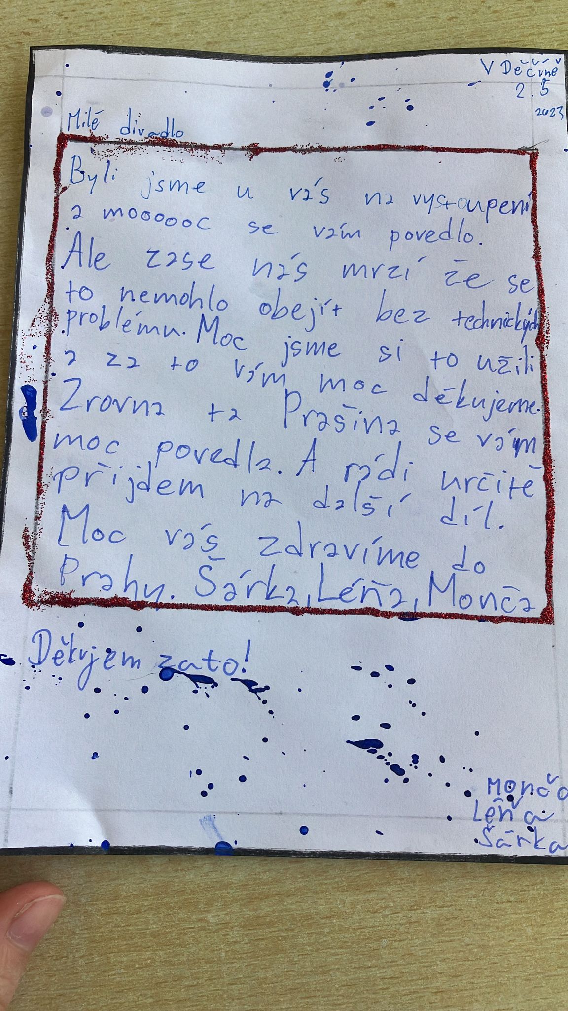 Pomyslnou tečkou na dortu pak byly dopisy žáků 6. tříd, které byly adresovány přímo hercům do divadla v Hradci Králové a které se jim také odeslaly. ![]()