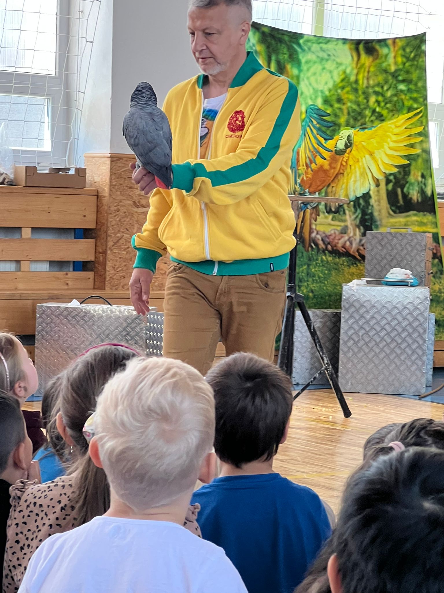 V pátek 19. května 2023 se v naší škole, pro žáky a žakyně 1. stupně, uskutečnilo představení "Papoušci z celého světa". Celým programem děti provázel pan Radek Jareš a se svým kolegou. Dětem přivezli na ukázku celkem 14 papoušků. Papoušci dětem předvedli létání, válení sudů, houpačku, šplh, namlouvání, hádku a spoustu dalších kousků. Těšíme se zase někdy příště 🖐