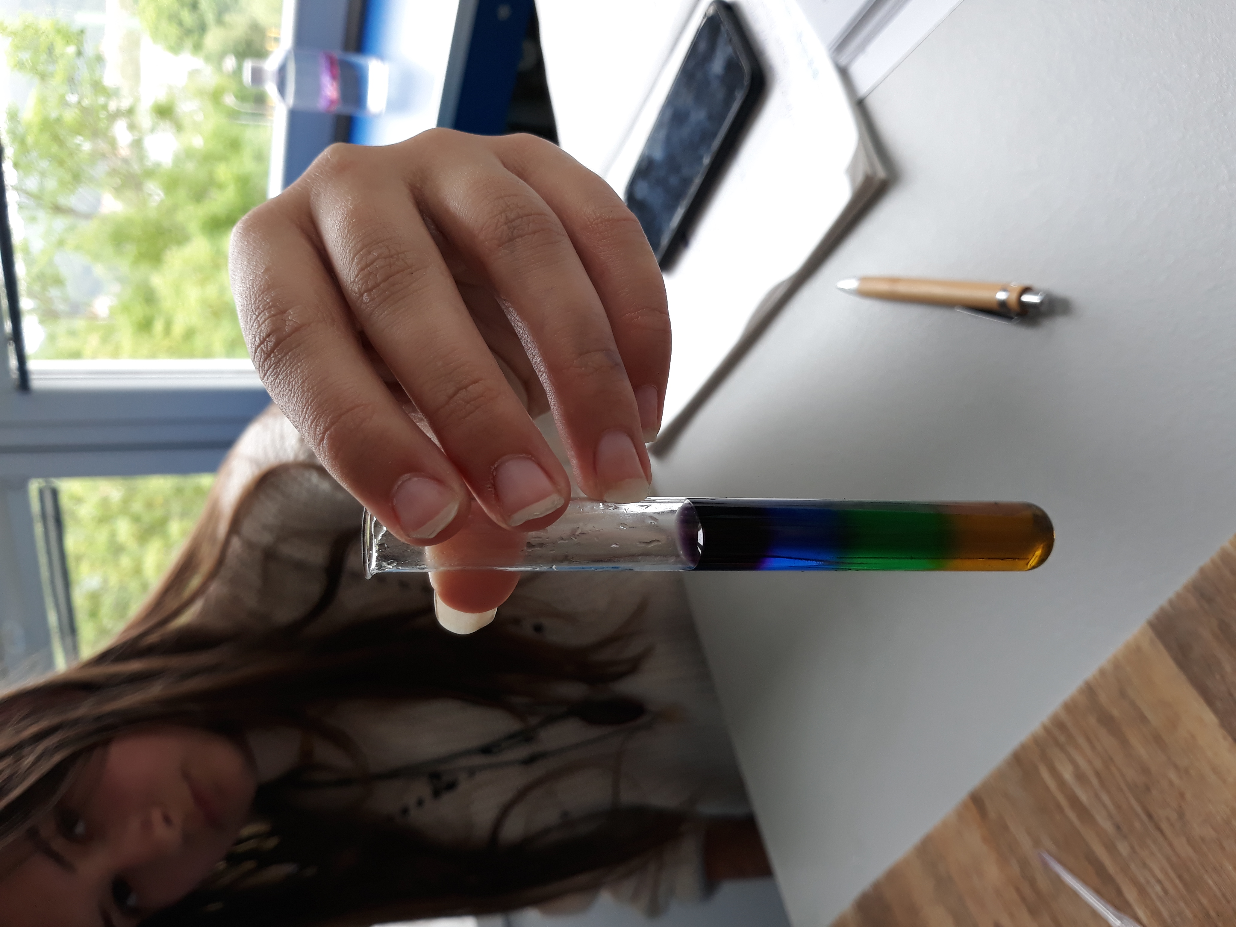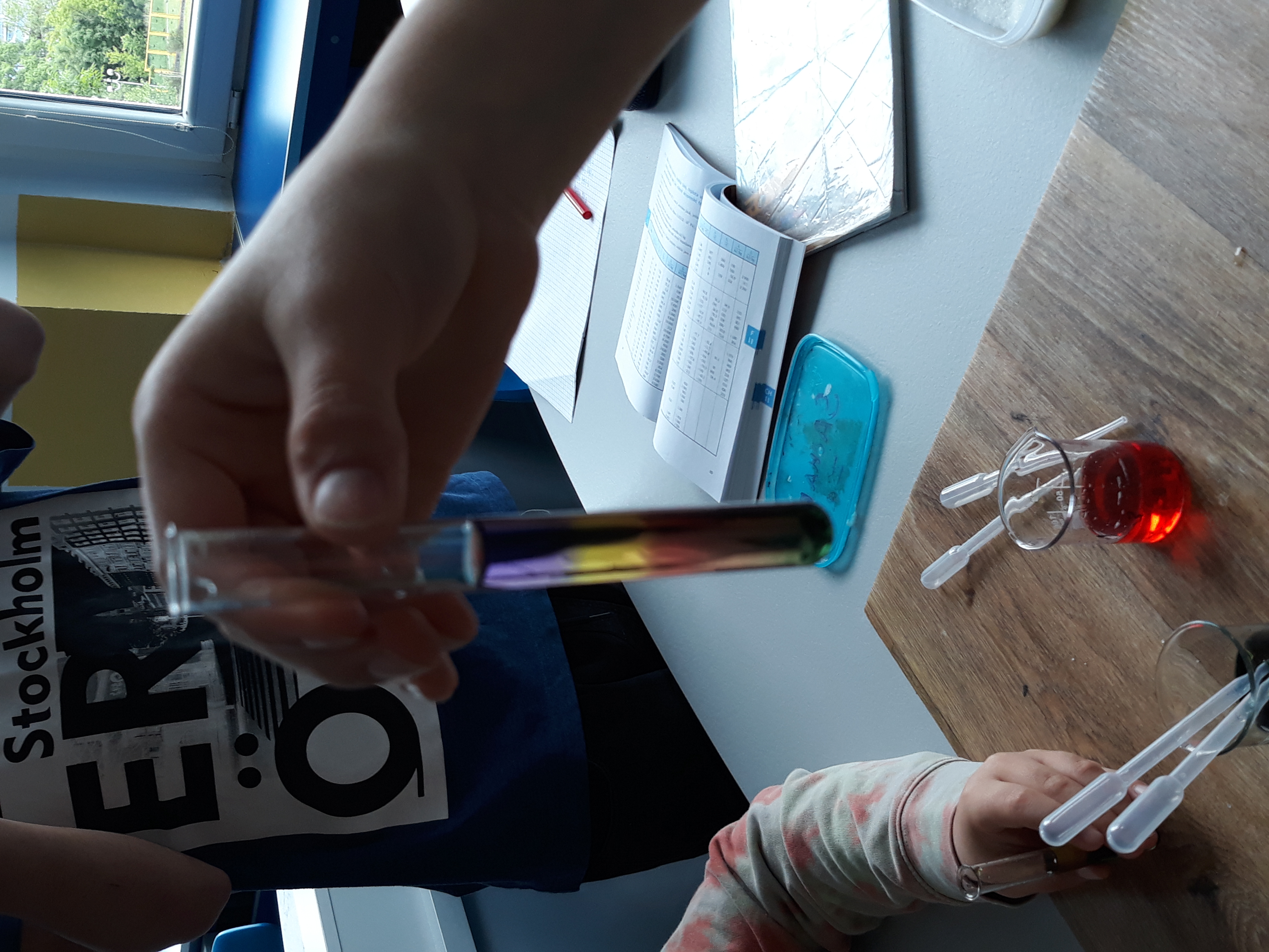 Pak si každý vyzkoušel do zkumavky namíchat svůj vlastní "koktejl". Tedy opatrně nalít jednotlivé barevné vrstvy odspodu od té s největší hustotou až po tu s nejmenší.