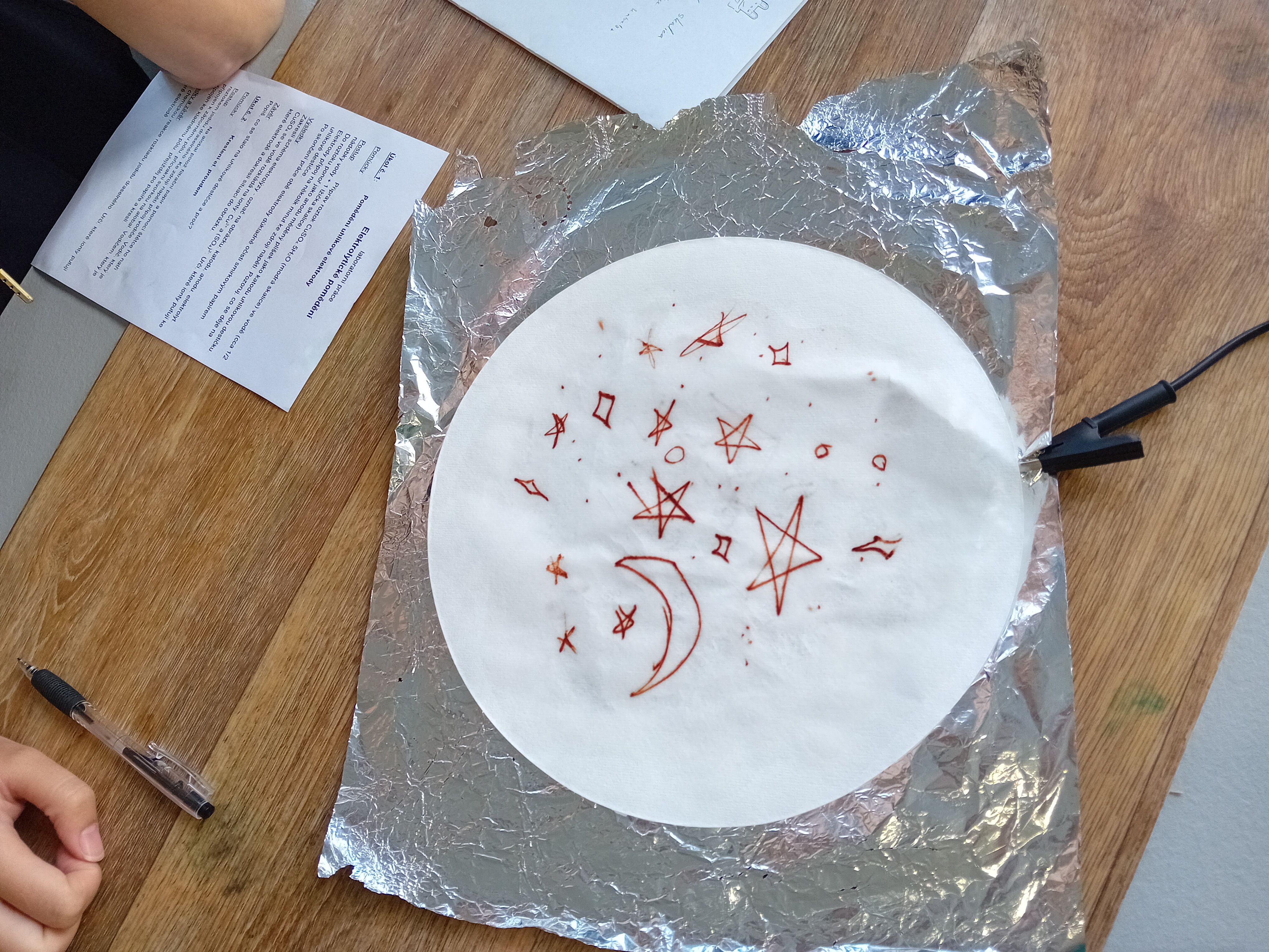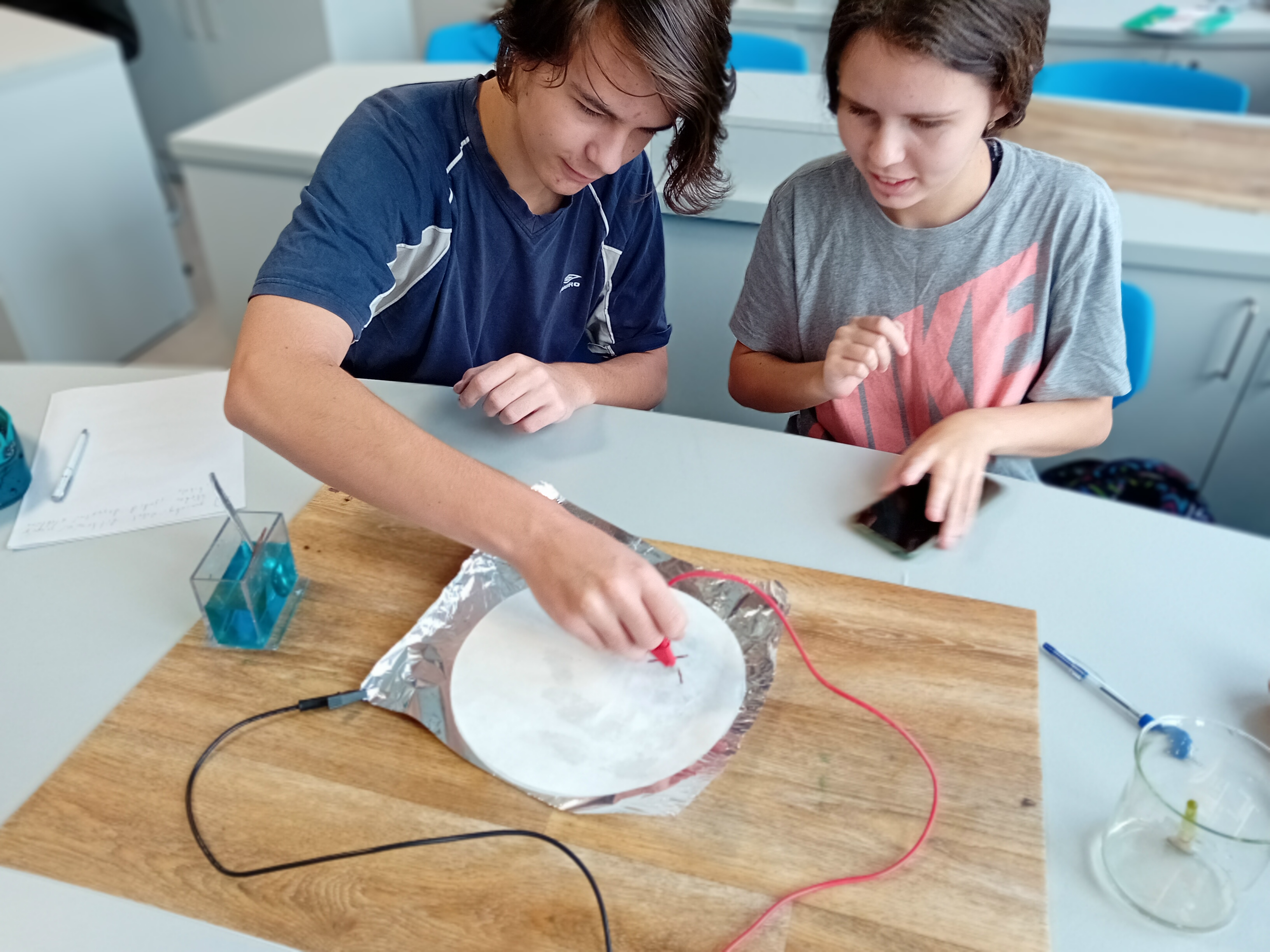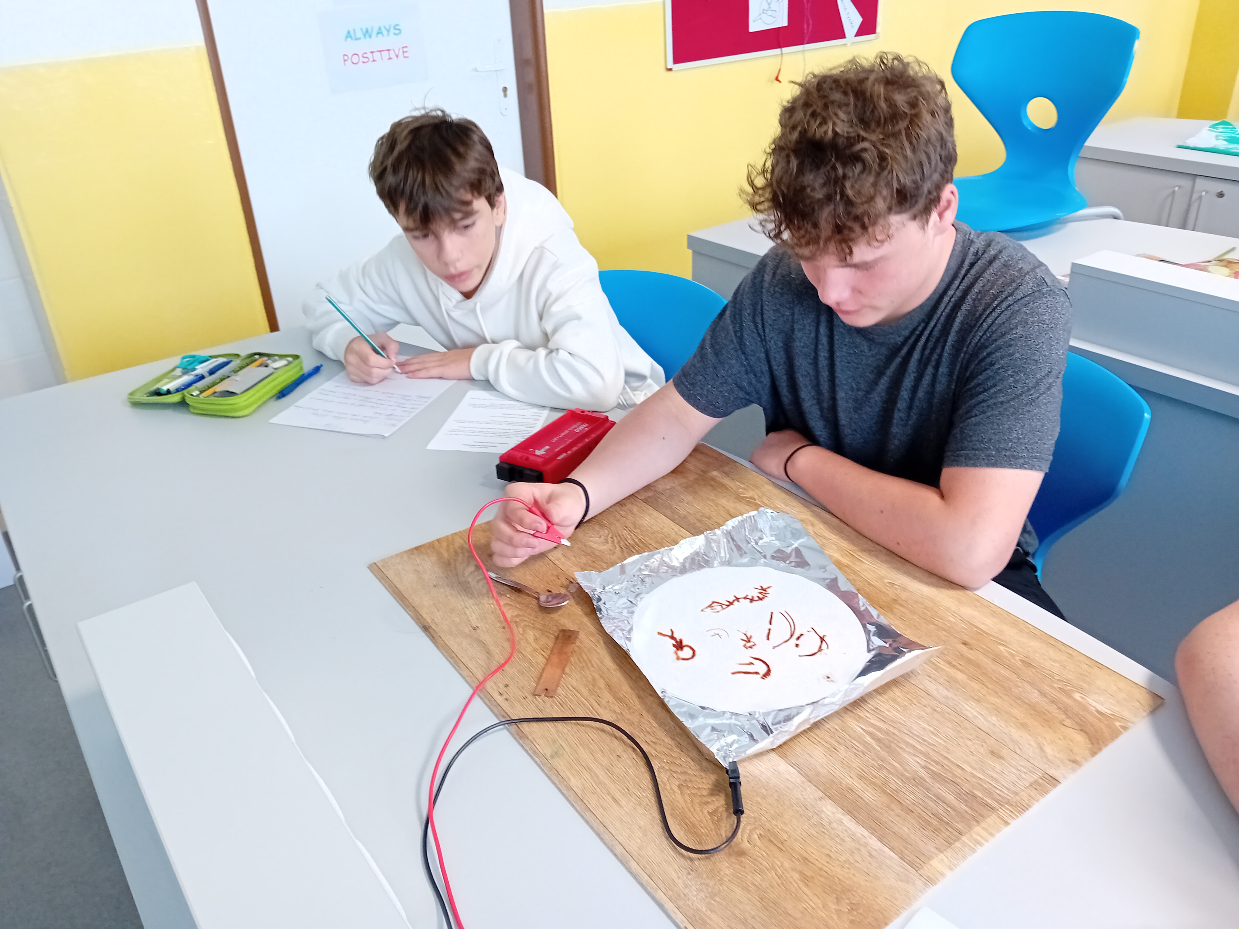 Deváťáci si při fyzice zopakovali vedení proudu v kapalinách. Sestavili vše potřebné pro elektrolýzu a povedlo se jim úspěšně potáhnout uhlíkovou destičku mědí. Nakonec si vyzkoušeli, že i elektrickým proudem je možné kreslit obrázky.