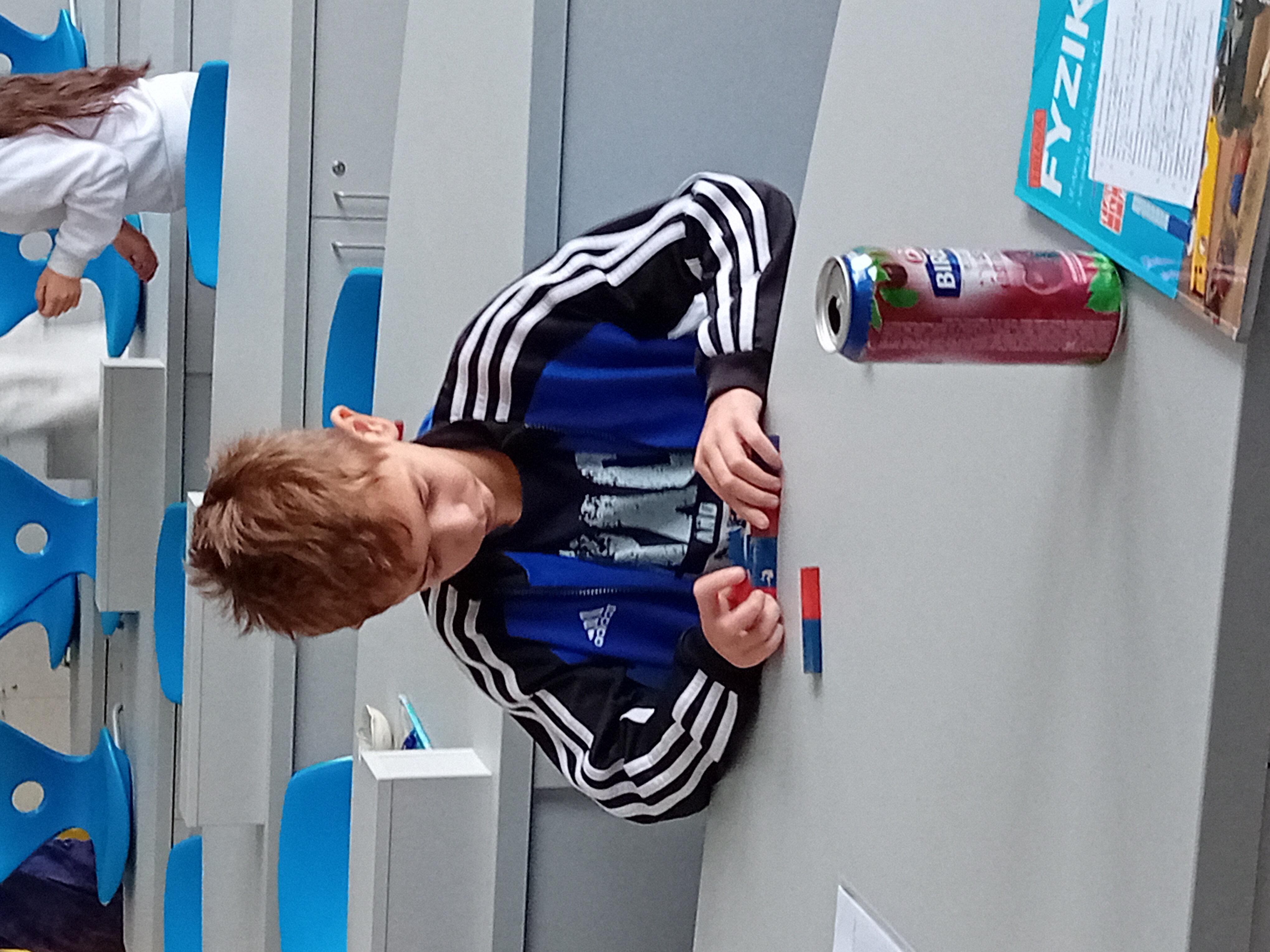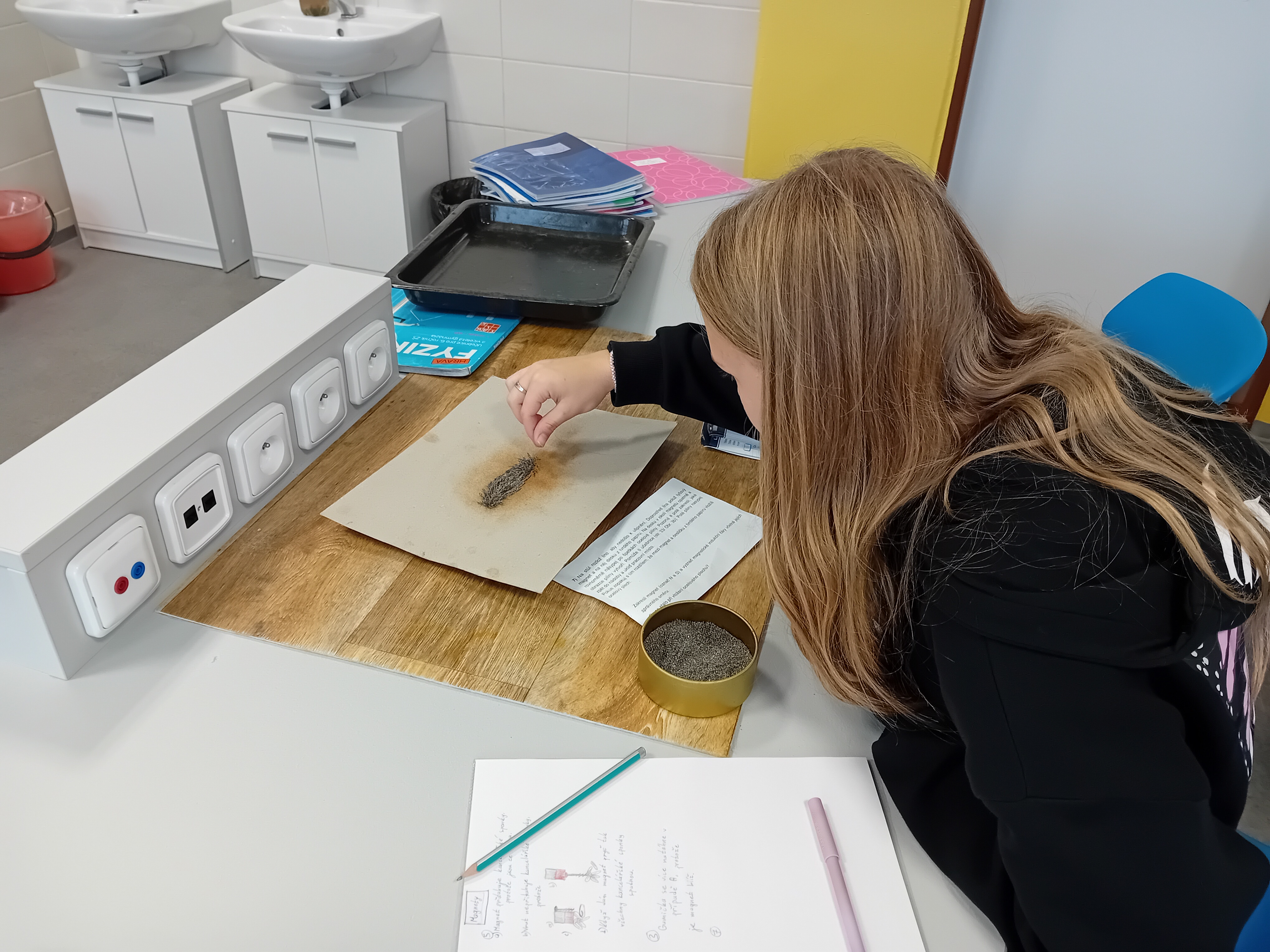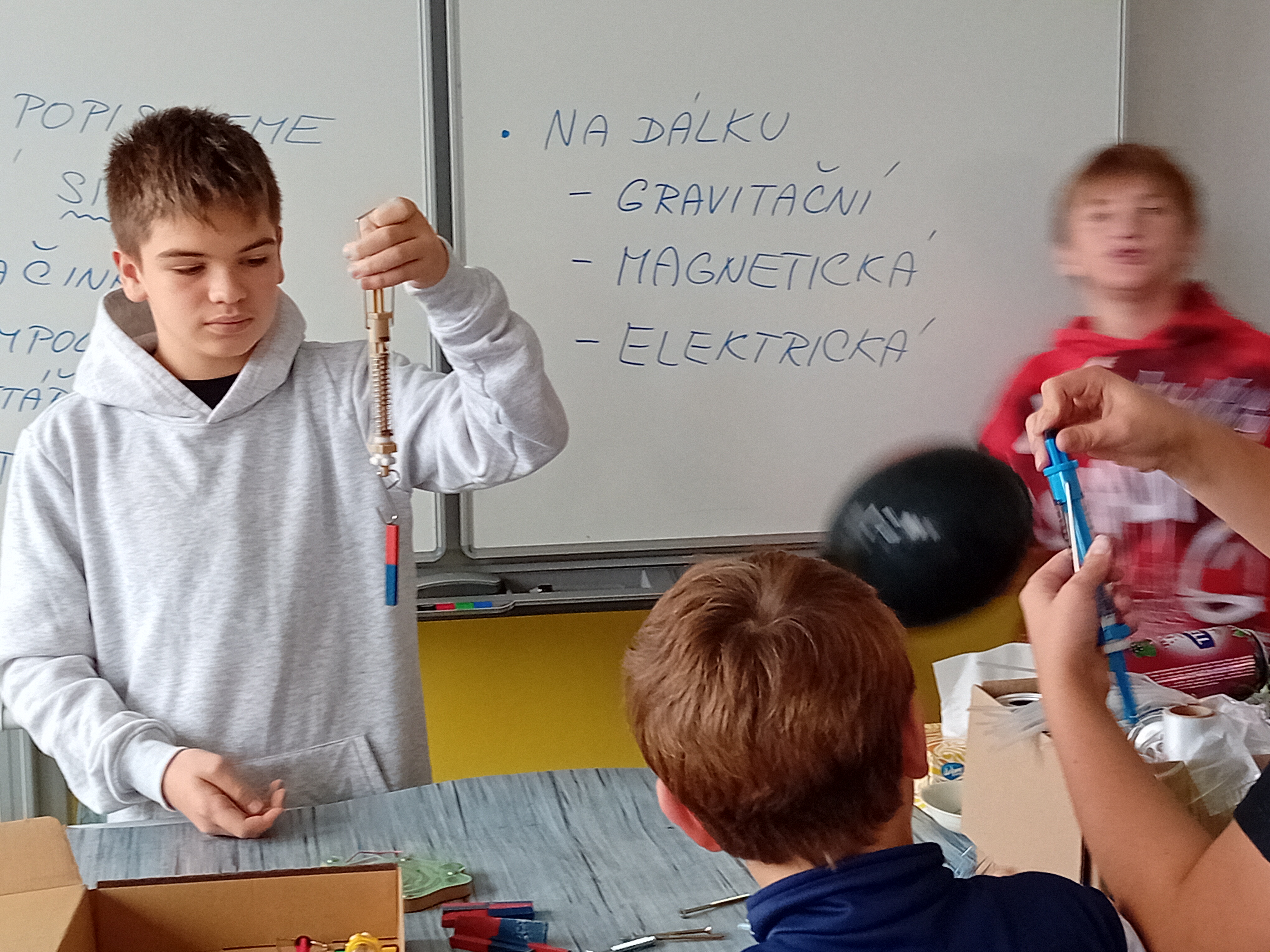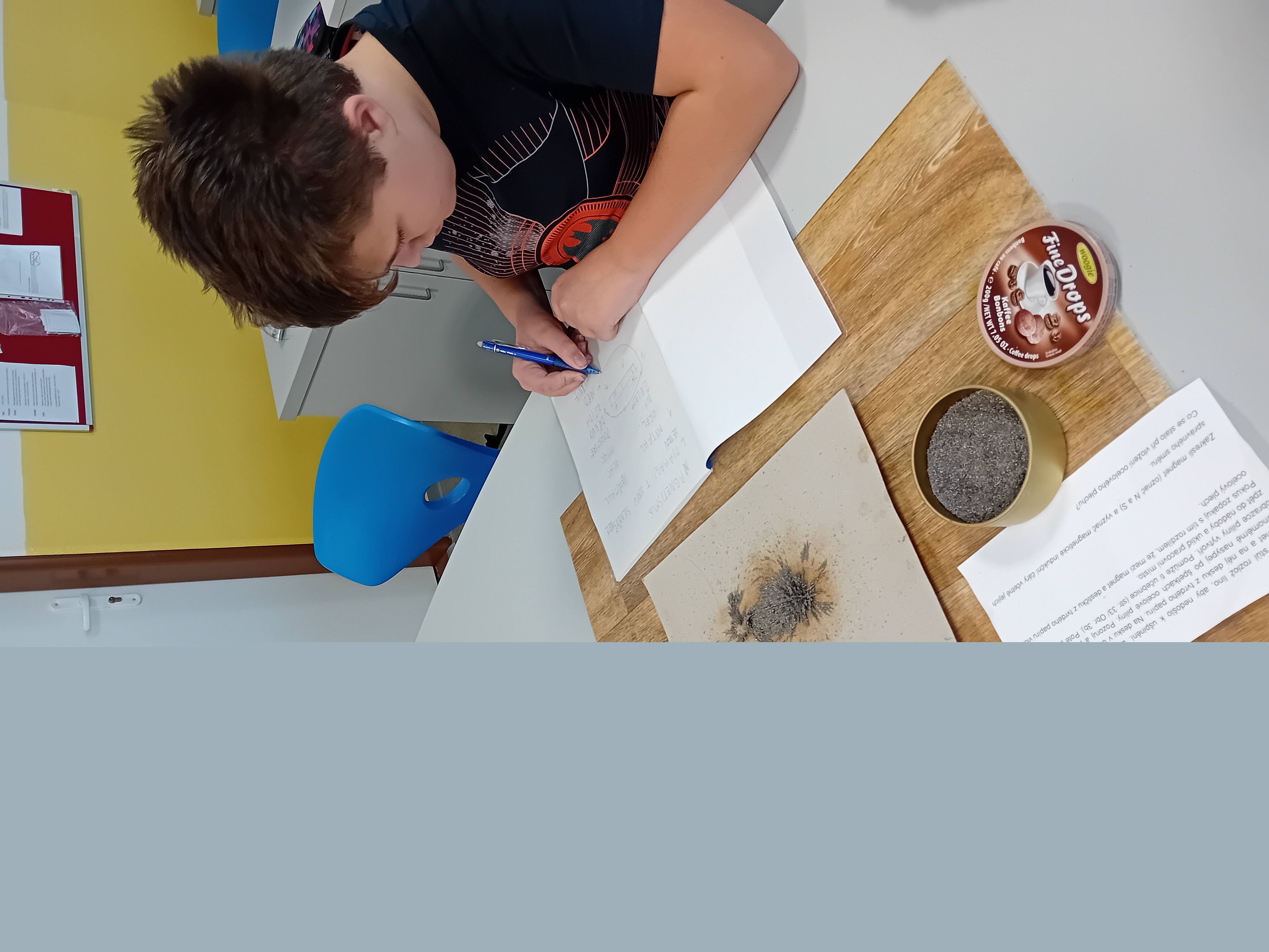 Potom magnetismus. Na něm si vyzkoušeli svou úplně první laboratorní práci. Zjistili, že magnetická síla působí i na dálku a které materiály ji mohou zničit a které ji naopak neovlivní. Neviditelné magnetické pole si zviditelnili a znázornili pomocí železných pilin.