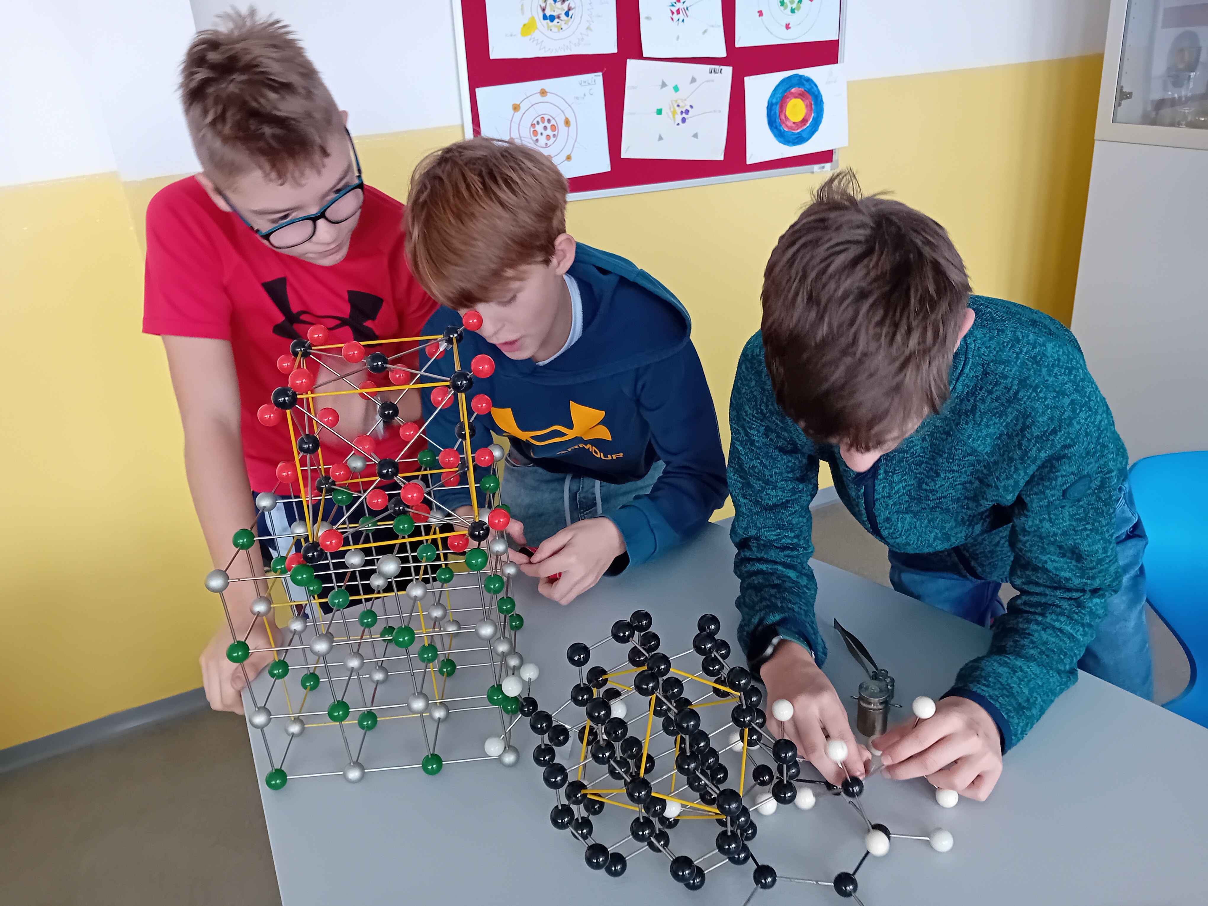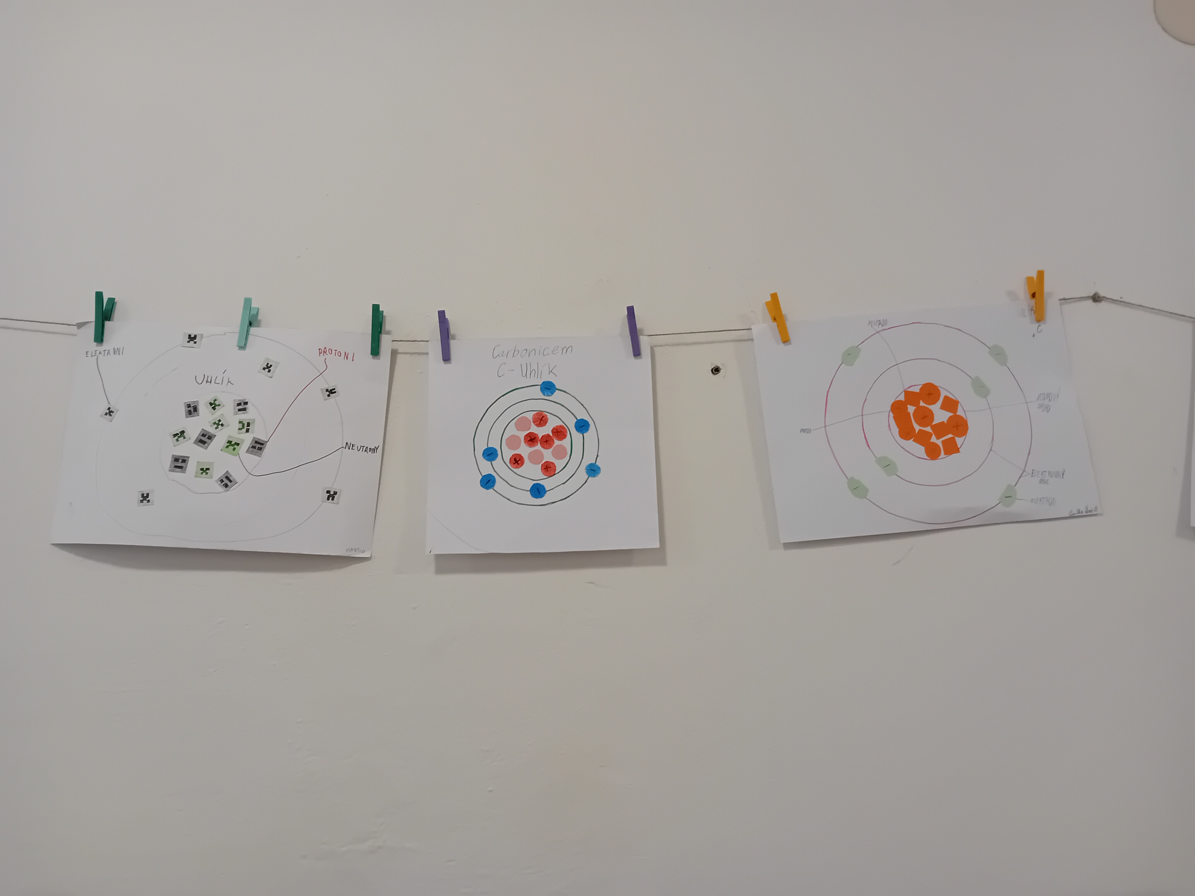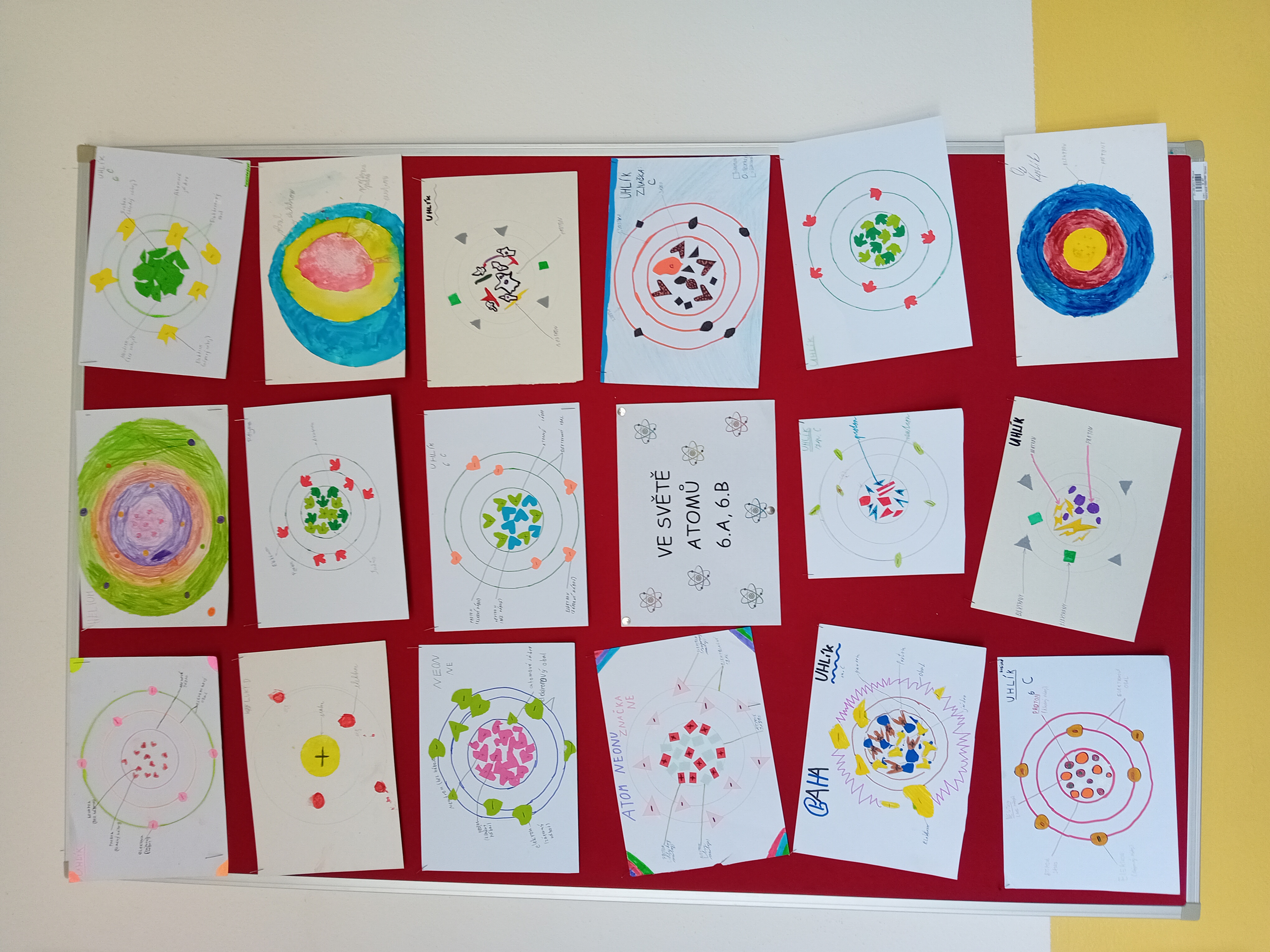 Tak třeba atomy. Ty se sice představují celkem obtížně, ale 6.A i 6.B je ztvárnili krásně výtvarně a vyzdobili nám nástěnky na chodbě i v učebně fyziky.