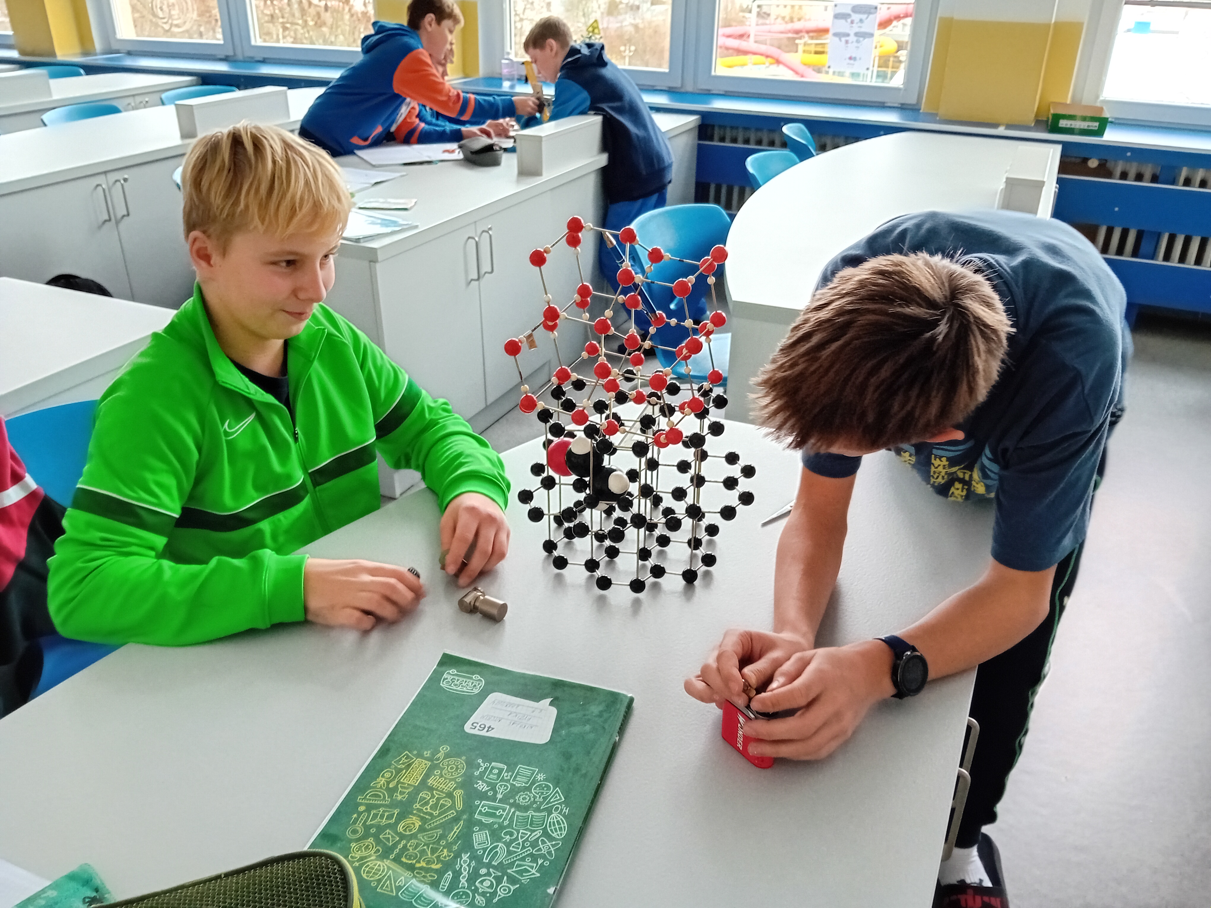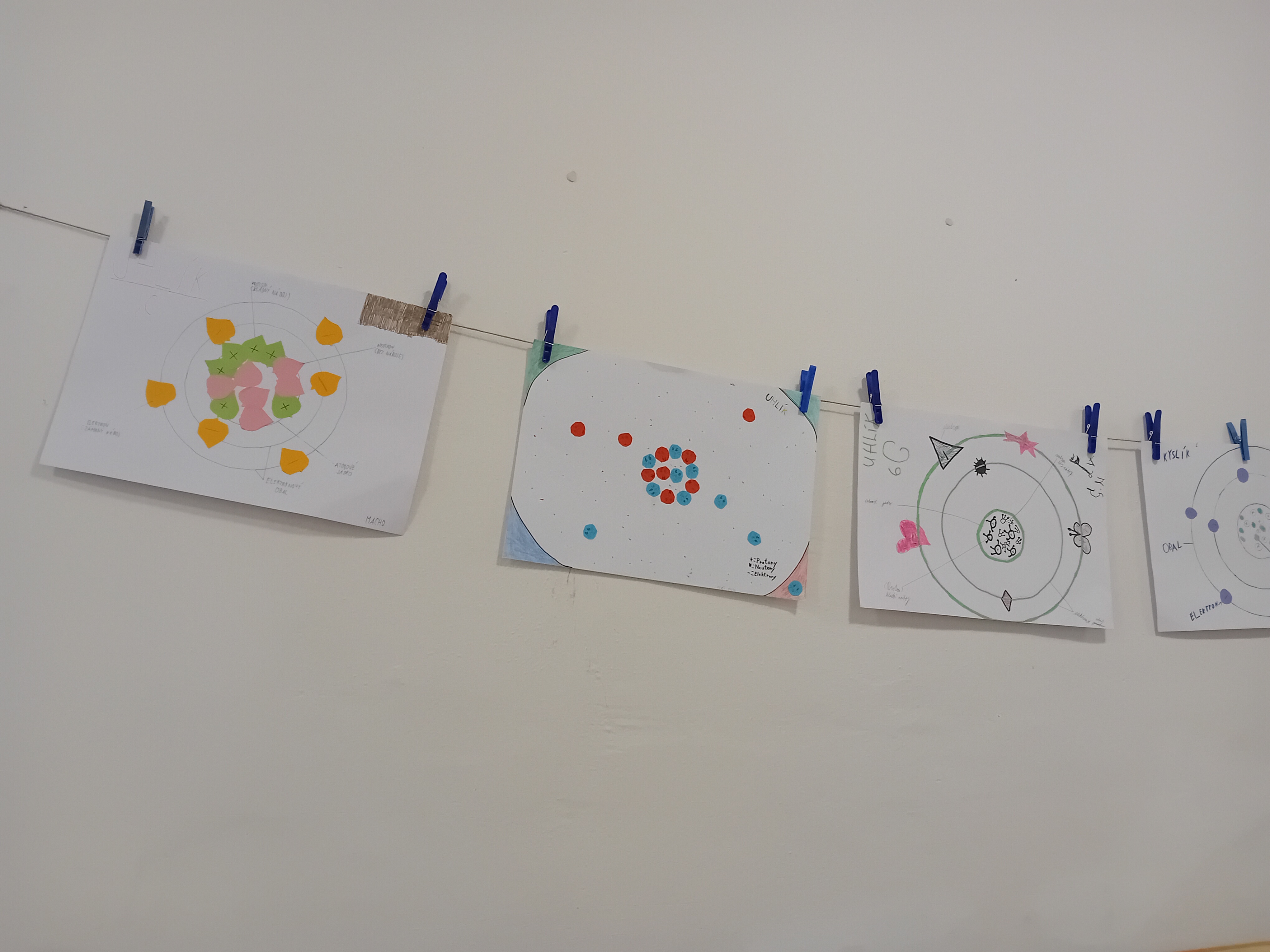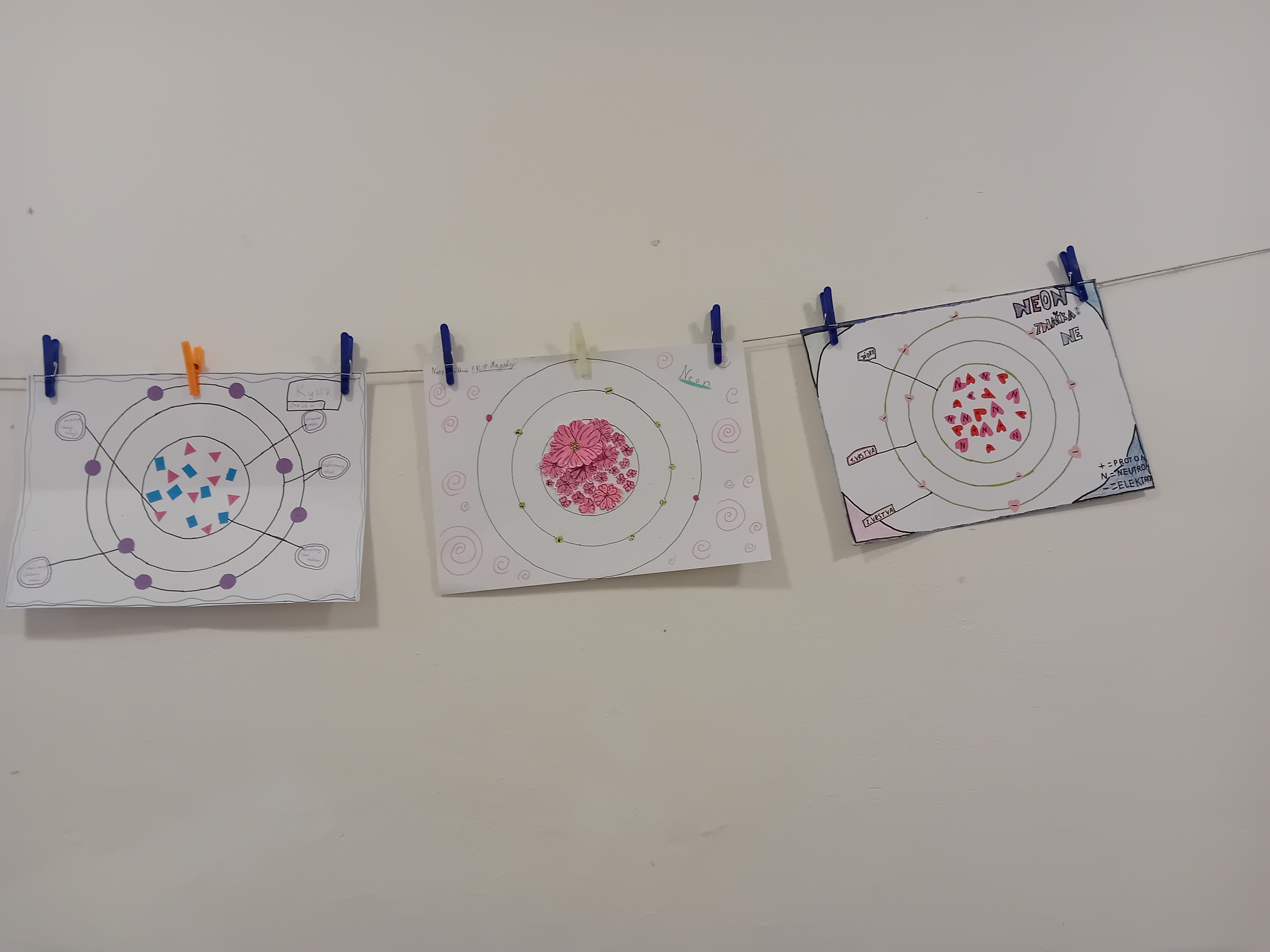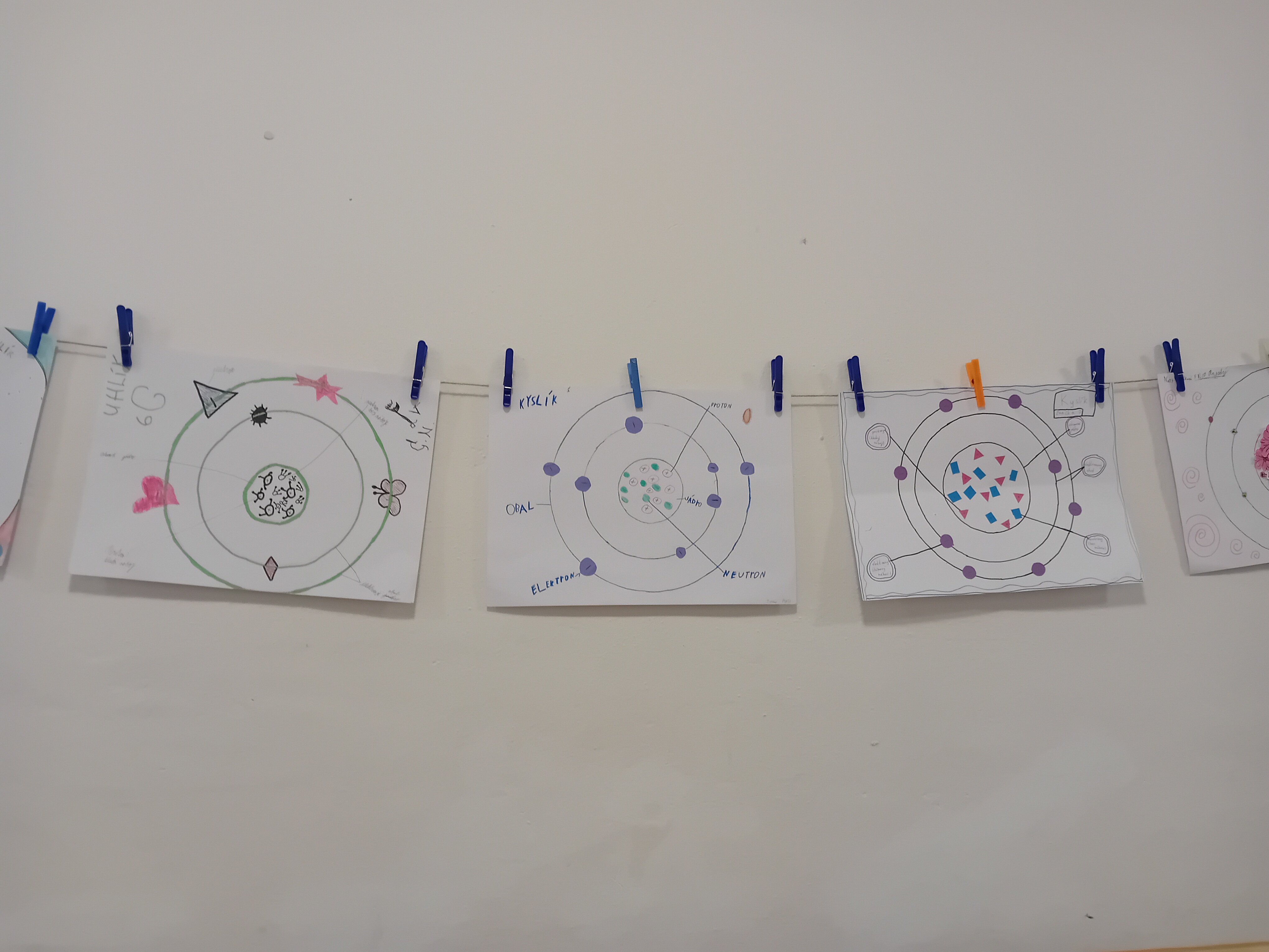 Tak třeba atomy. Ty se sice představují celkem obtížně, ale 6.A i 6.B je ztvárnili krásně výtvarně a vyzdobili nám nástěnky na chodbě i v učebně fyziky.