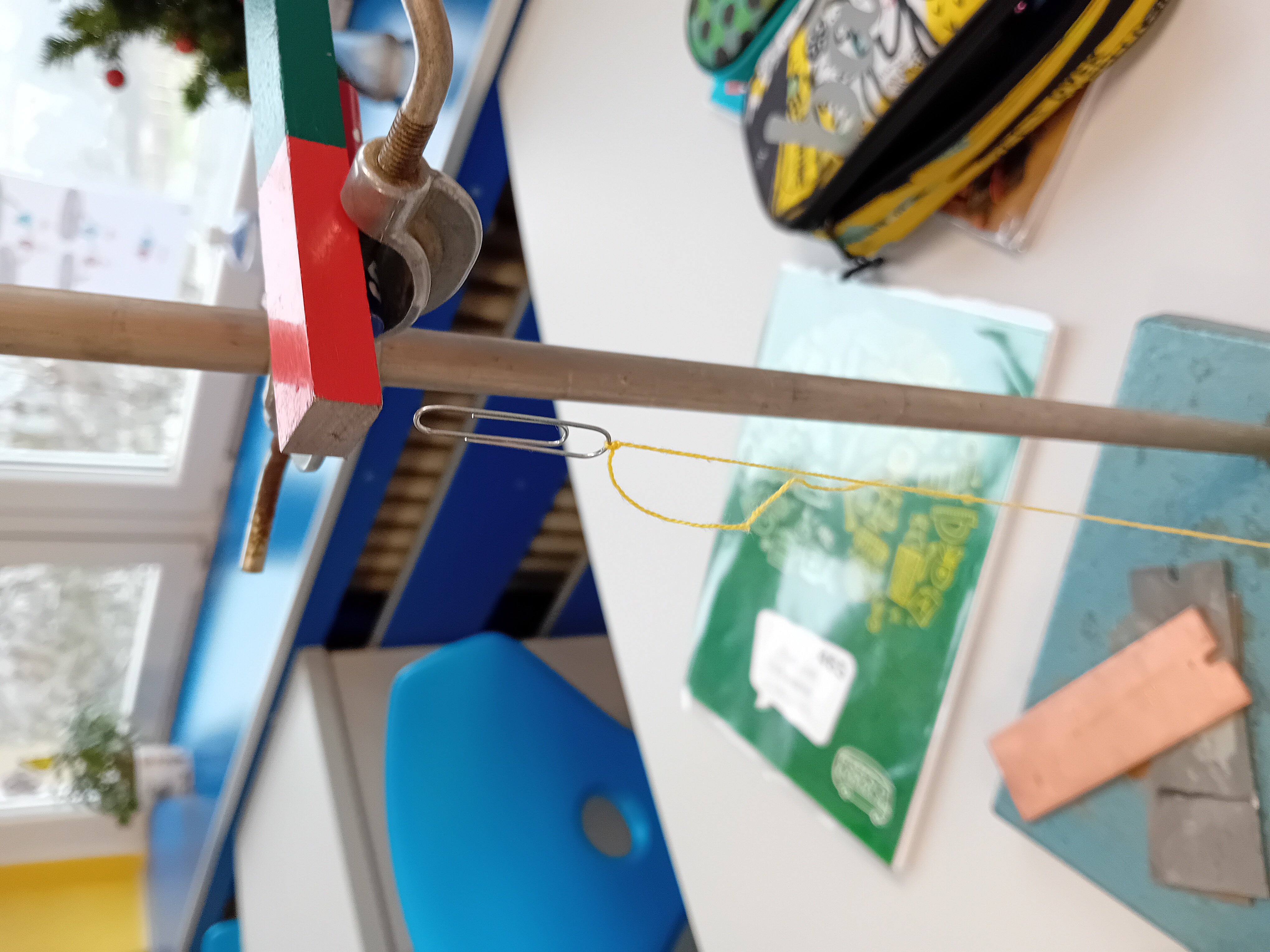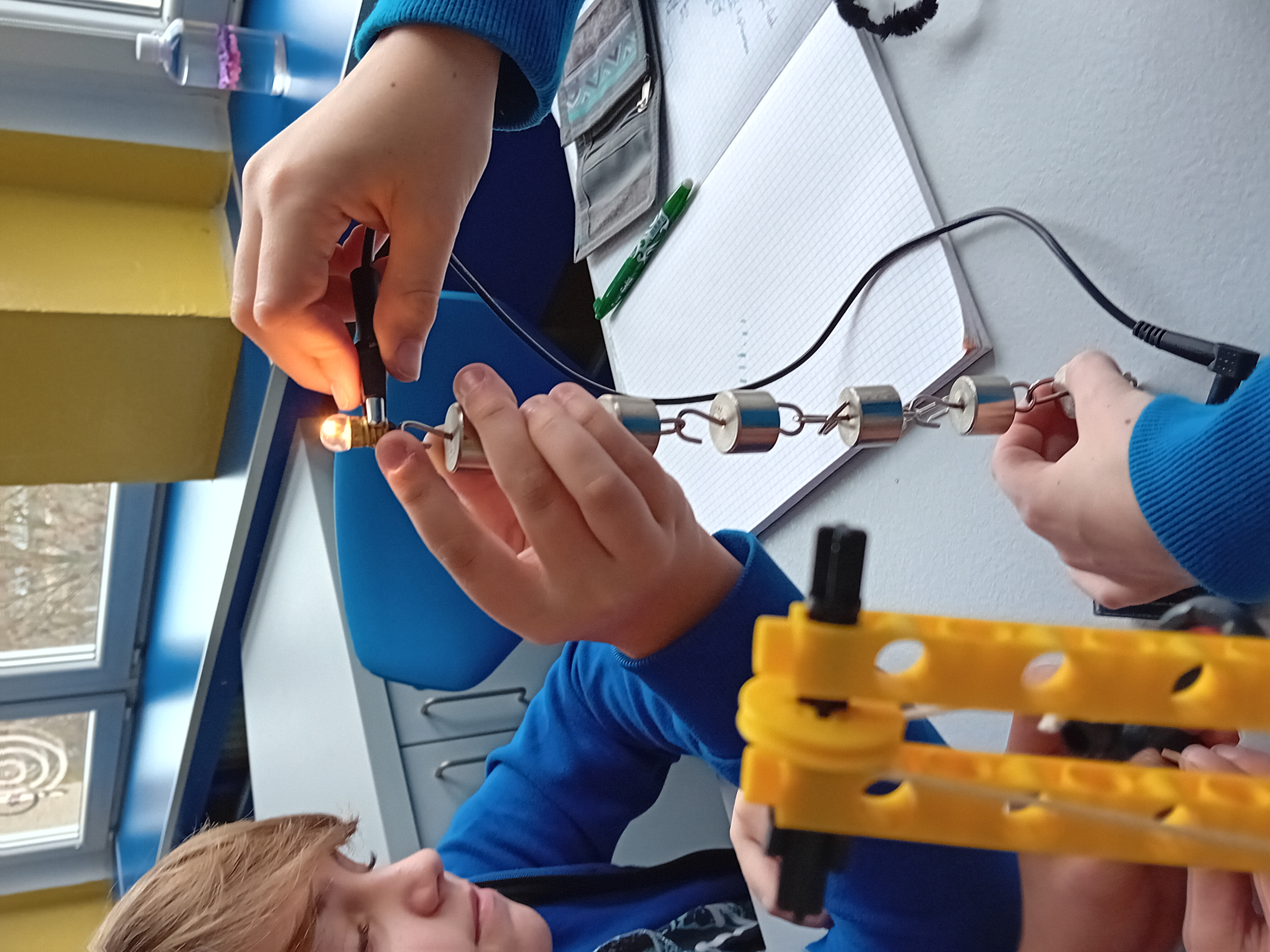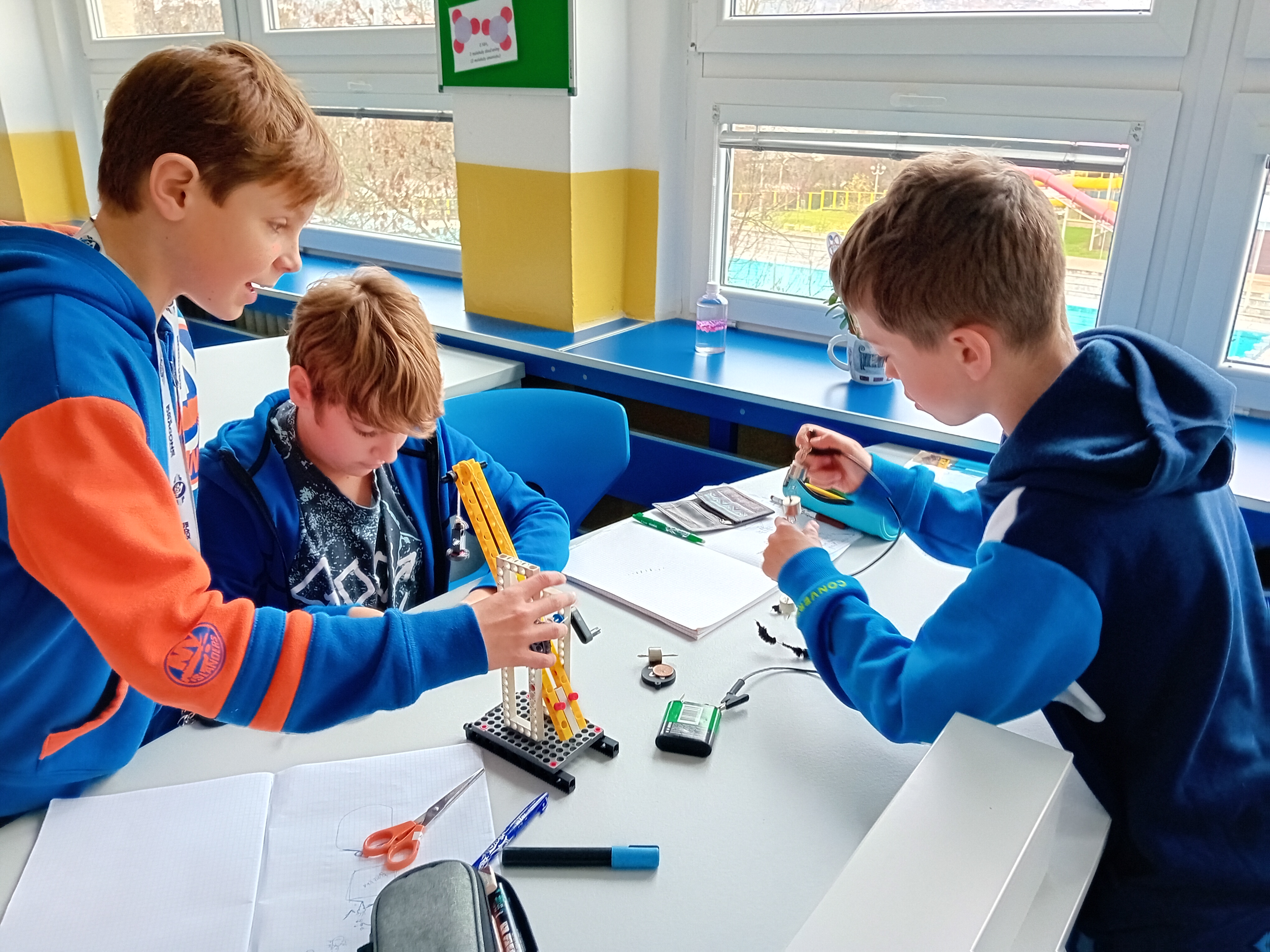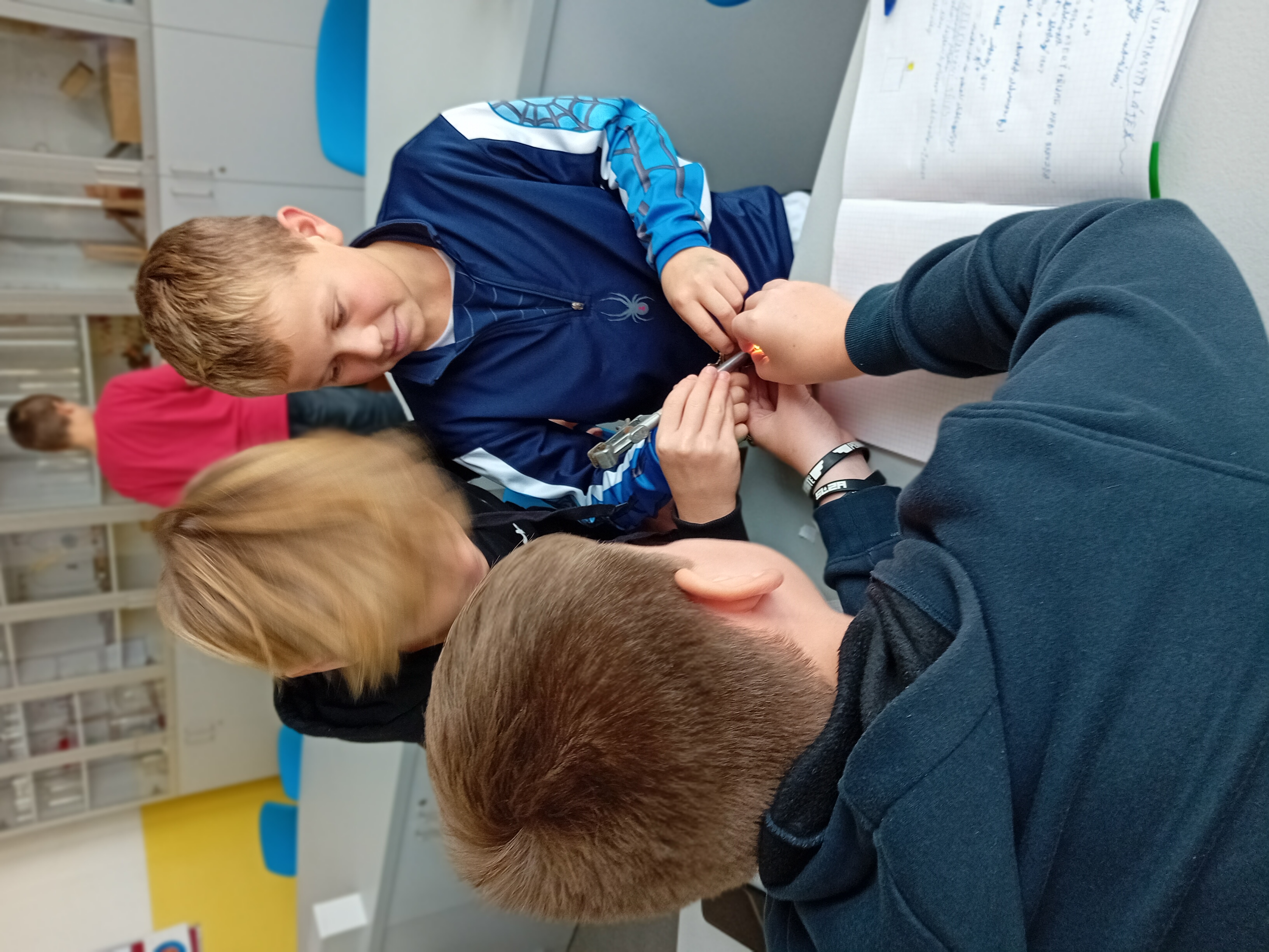 A pak už stačí najít kolem sebe co nejvíce předmětů, které vedou proud. Prozatimní rekord je cca 40 ks kovových věcí, který vytvořili Matěj, Mára a Patrik ze 6.B.