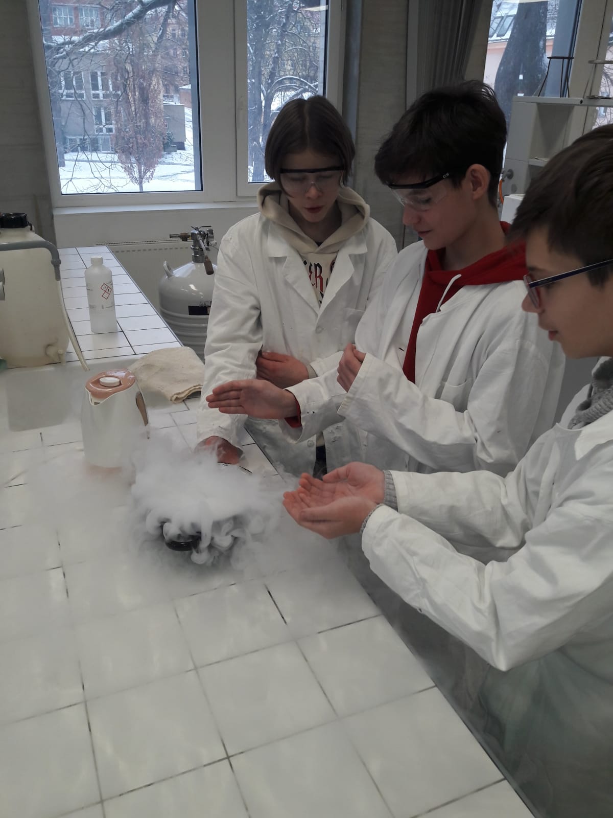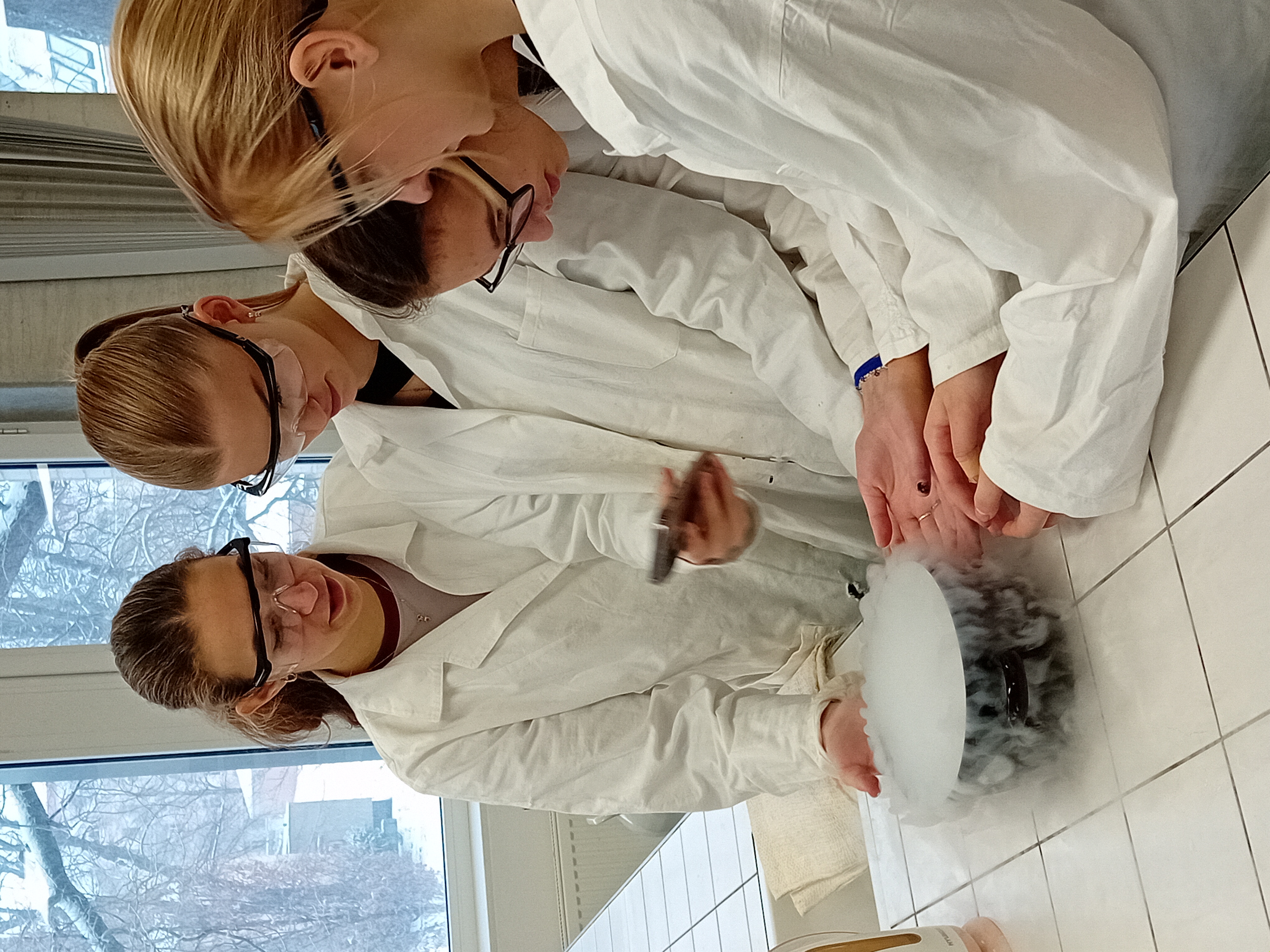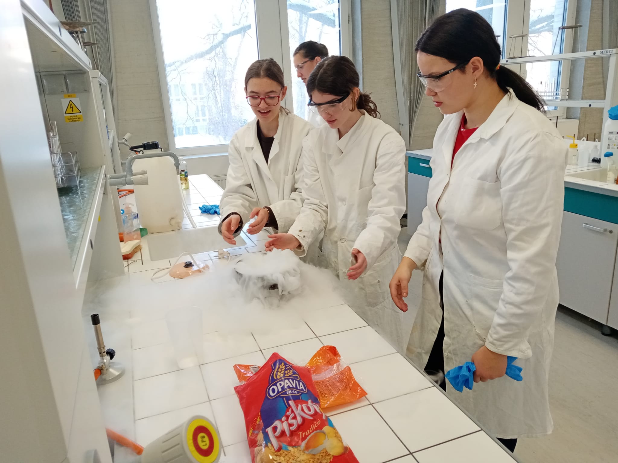 V laboratoři si každý vyzkoušel několik chemických pokusů - přípravu dendritických krystalů, barevné bengálské ohně a práci s tekutým dusíkem. Třešničkou na dortu pro zájemce bylo vzplanutí propanbutanové pěny přímo v dlaních.