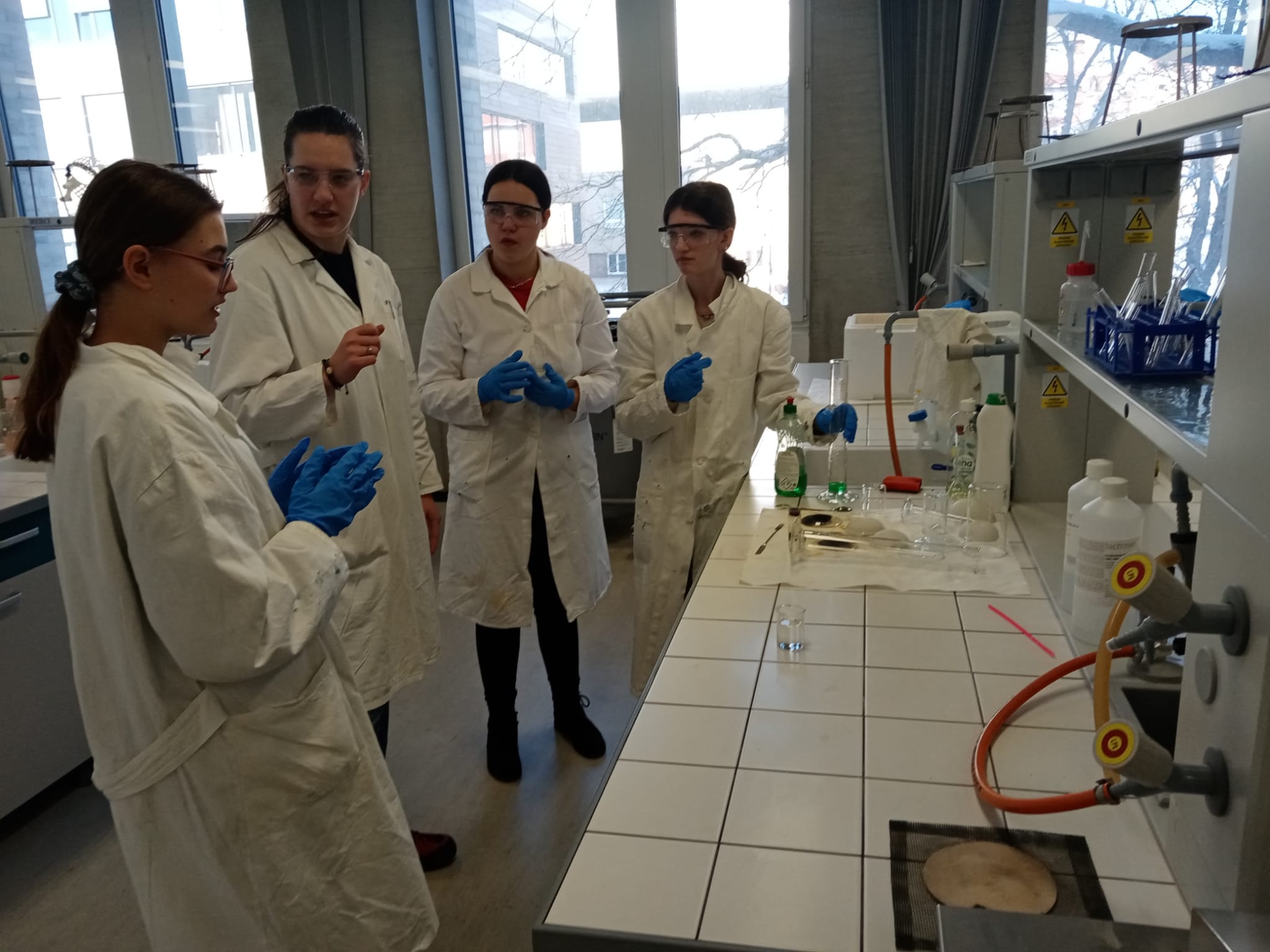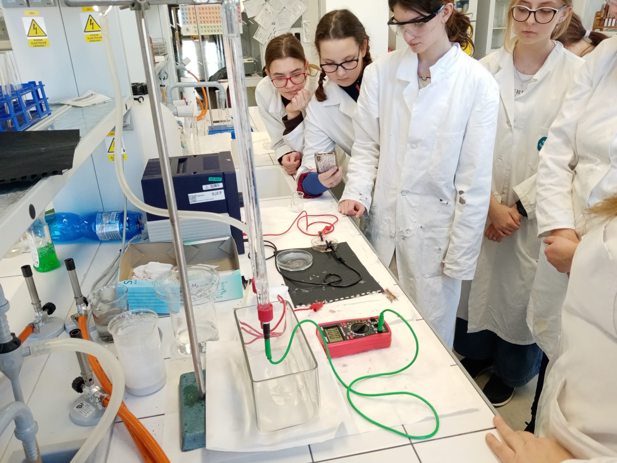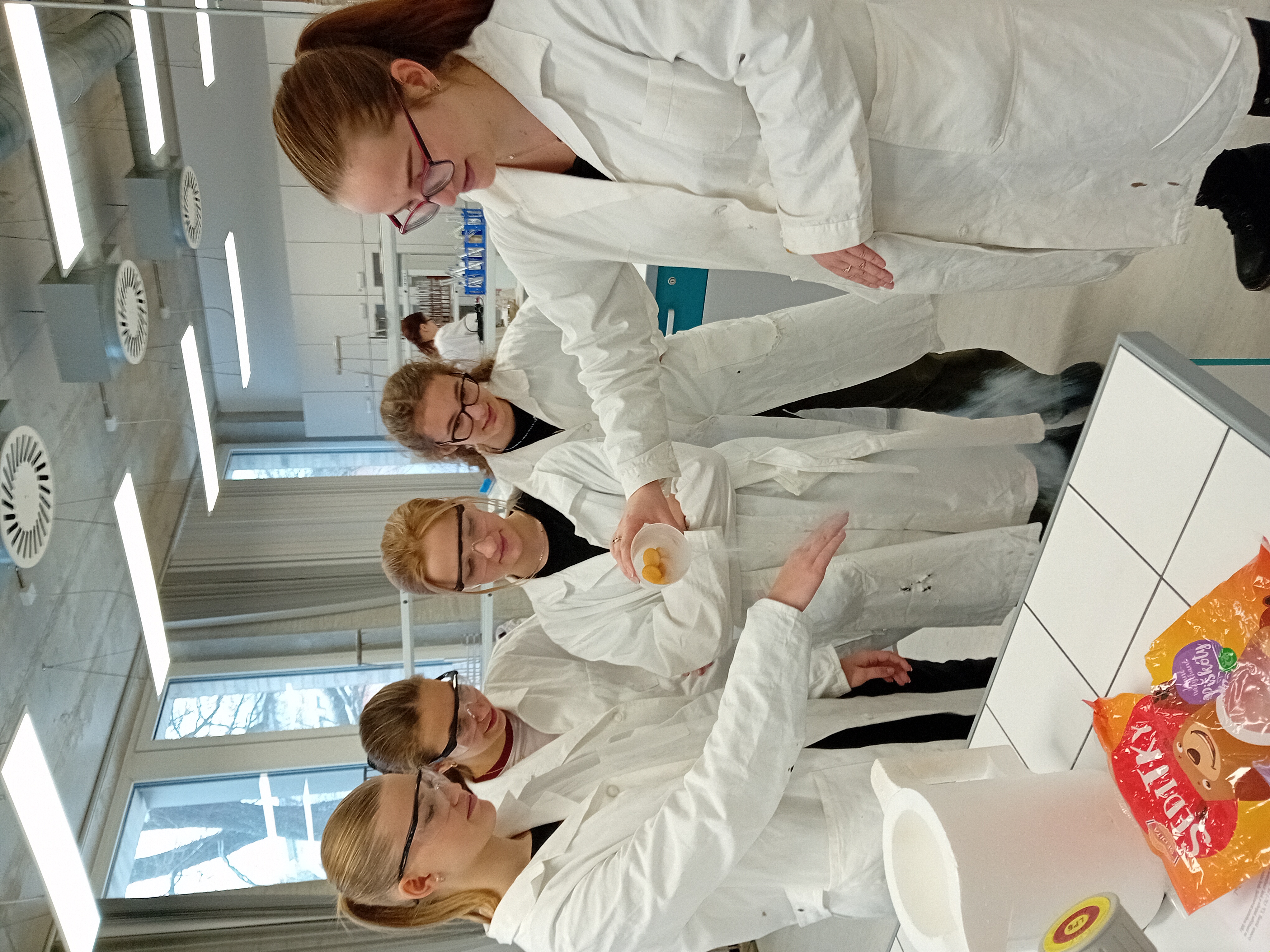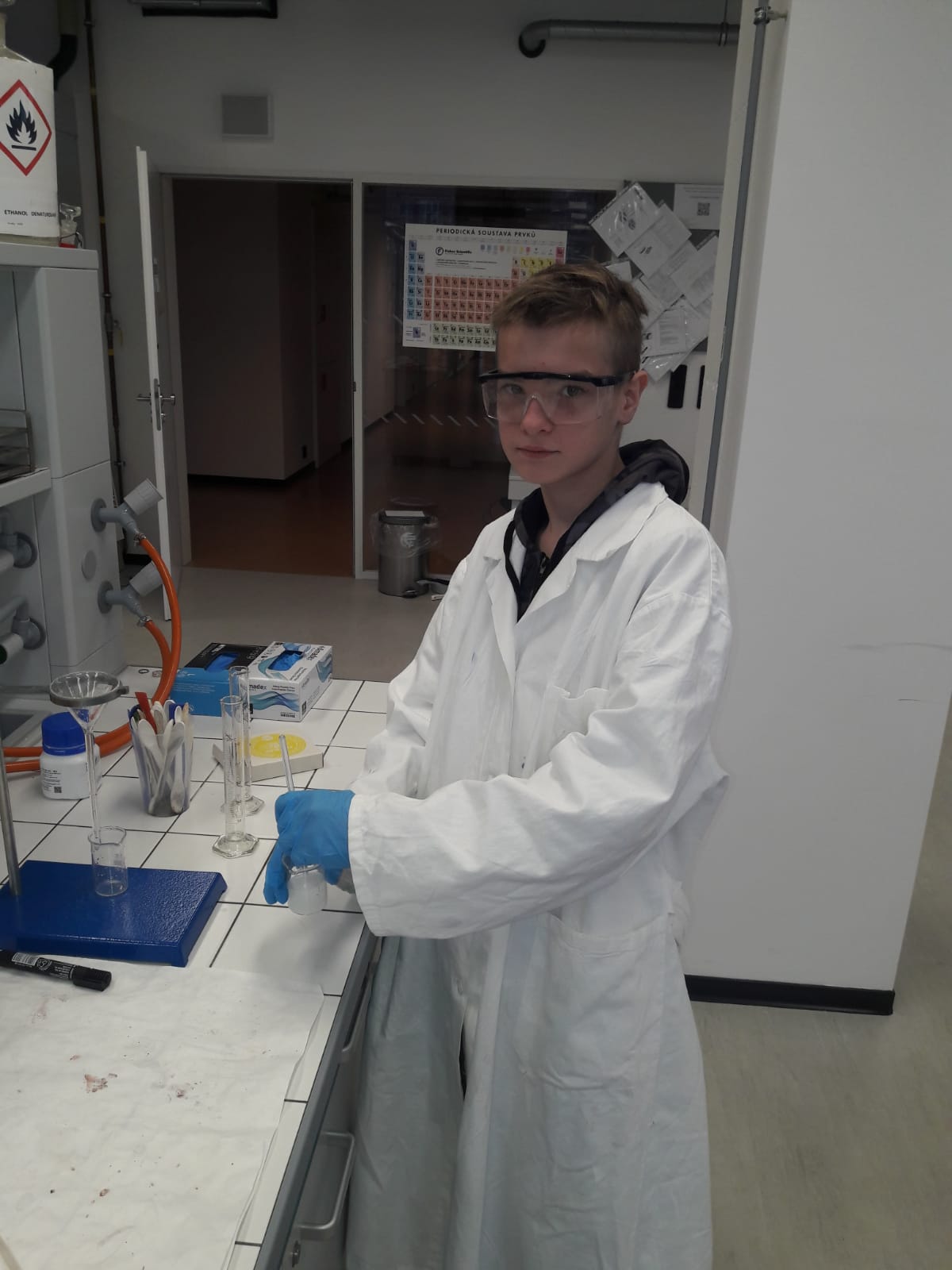 V laboratoři si každý vyzkoušel několik chemických pokusů - přípravu dendritických krystalů, barevné bengálské ohně a práci s tekutým dusíkem. Třešničkou na dortu pro zájemce bylo vzplanutí propanbutanové pěny přímo v dlaních.