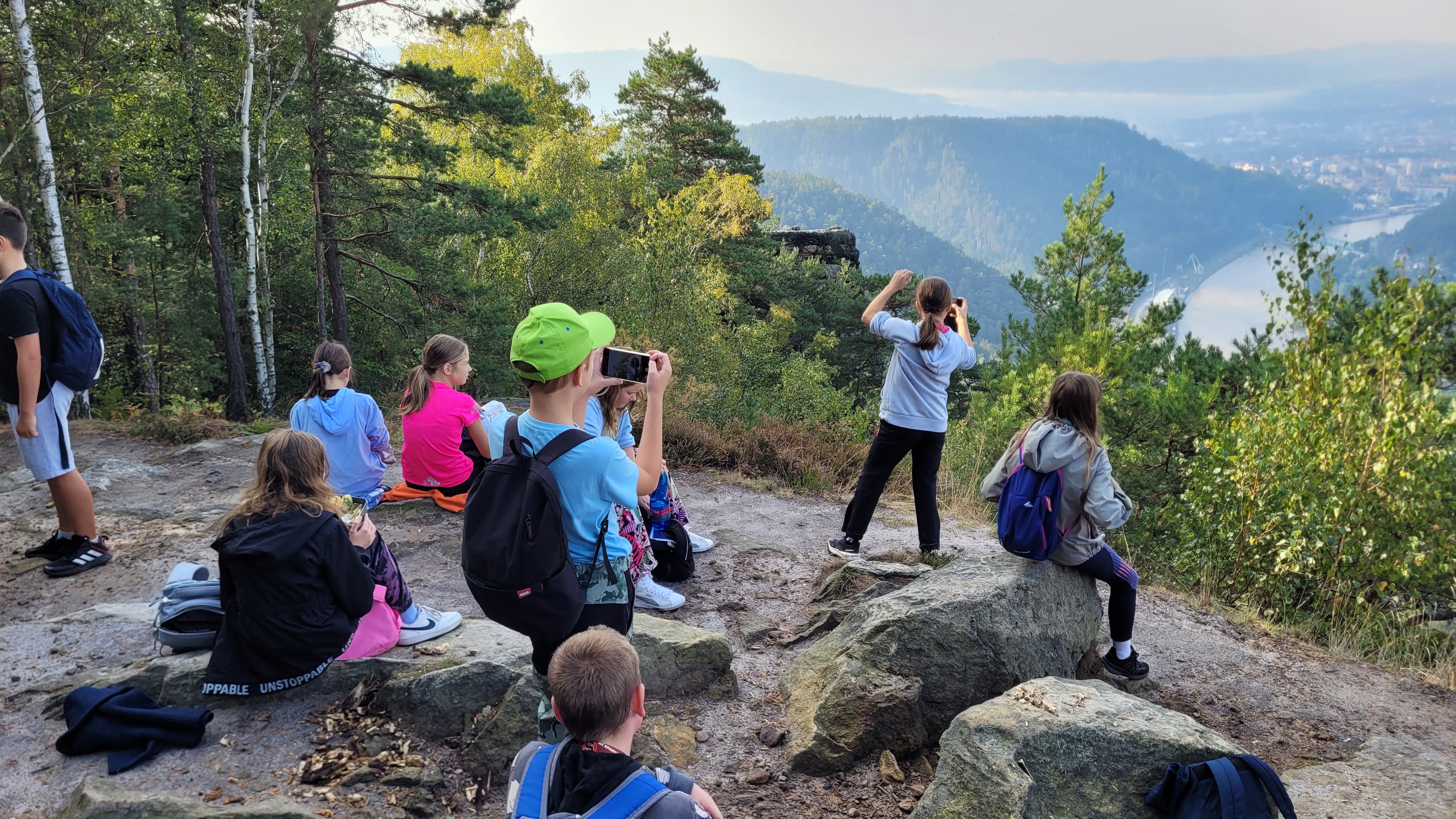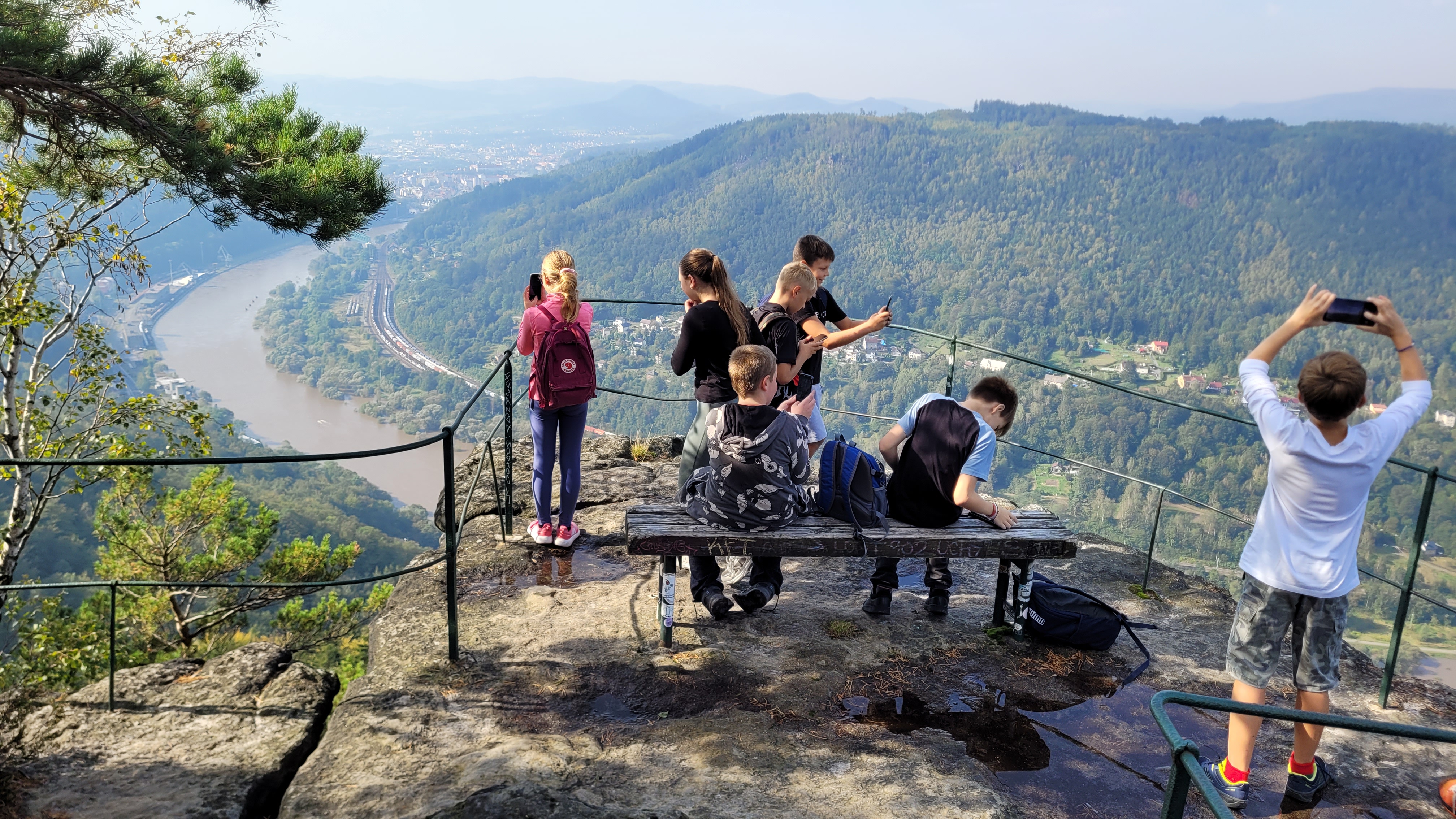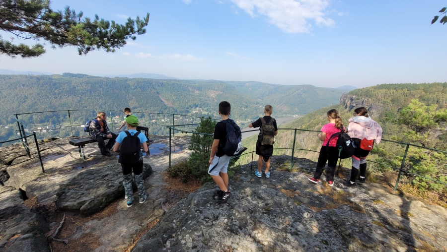 Ačkoli mnozí žáci místo již znali, pro některé z nich to byla premiéra. Už od samotného rána bylo jasné, že nás čeká pěkný den. Slunce svítilo, nálada byla skvělá a výprava začala svižným tempem. První zastávka na vyhlídce nad kaňonem všem vyrazila dech. Pohled na hluboké údolí, ve kterém se klikatí majestátní Labe, je působivý zážitek. Děti se radostně bavily, fotily a sdílely dojmy z tohoto úchvatného výhledu.