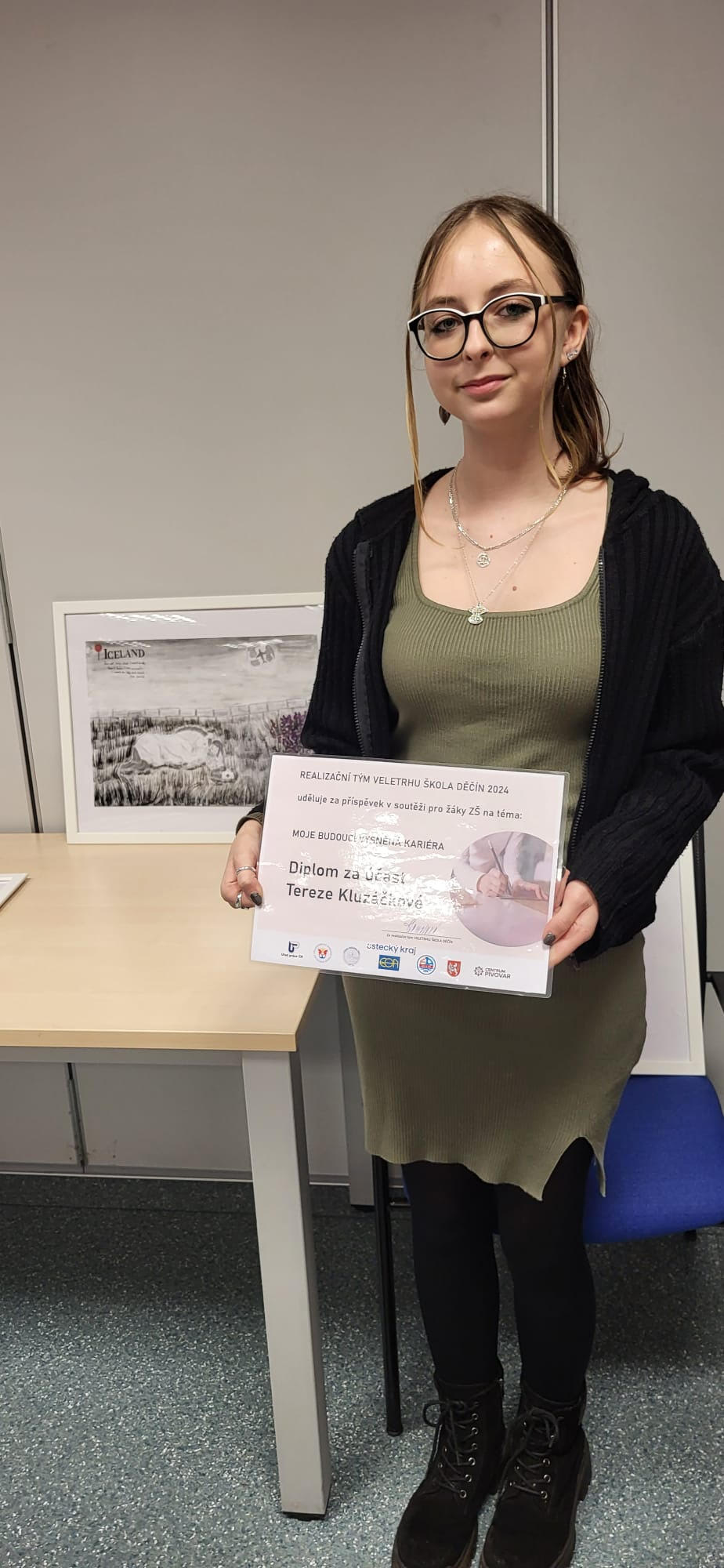 Dne 27.11.2024 proběhlo na děčínském Úřadu práce předávání cen v soutěž Moje vysněné budoucí povolání. Soutěž spočívala v tom, aby žáci jakýmkoliv způsobem ztvárnili, co by chtěli v budoucnu dělat. Za naši školu jsem vybrala sedm prací i a jedna z nich byla oceněna pátým místem. Moc gratuluji Terezce Kluzáčkové k jejímu a přeji, ať své vysněné kariéry dosáhne. Mgr. Martina Hanzaliusová