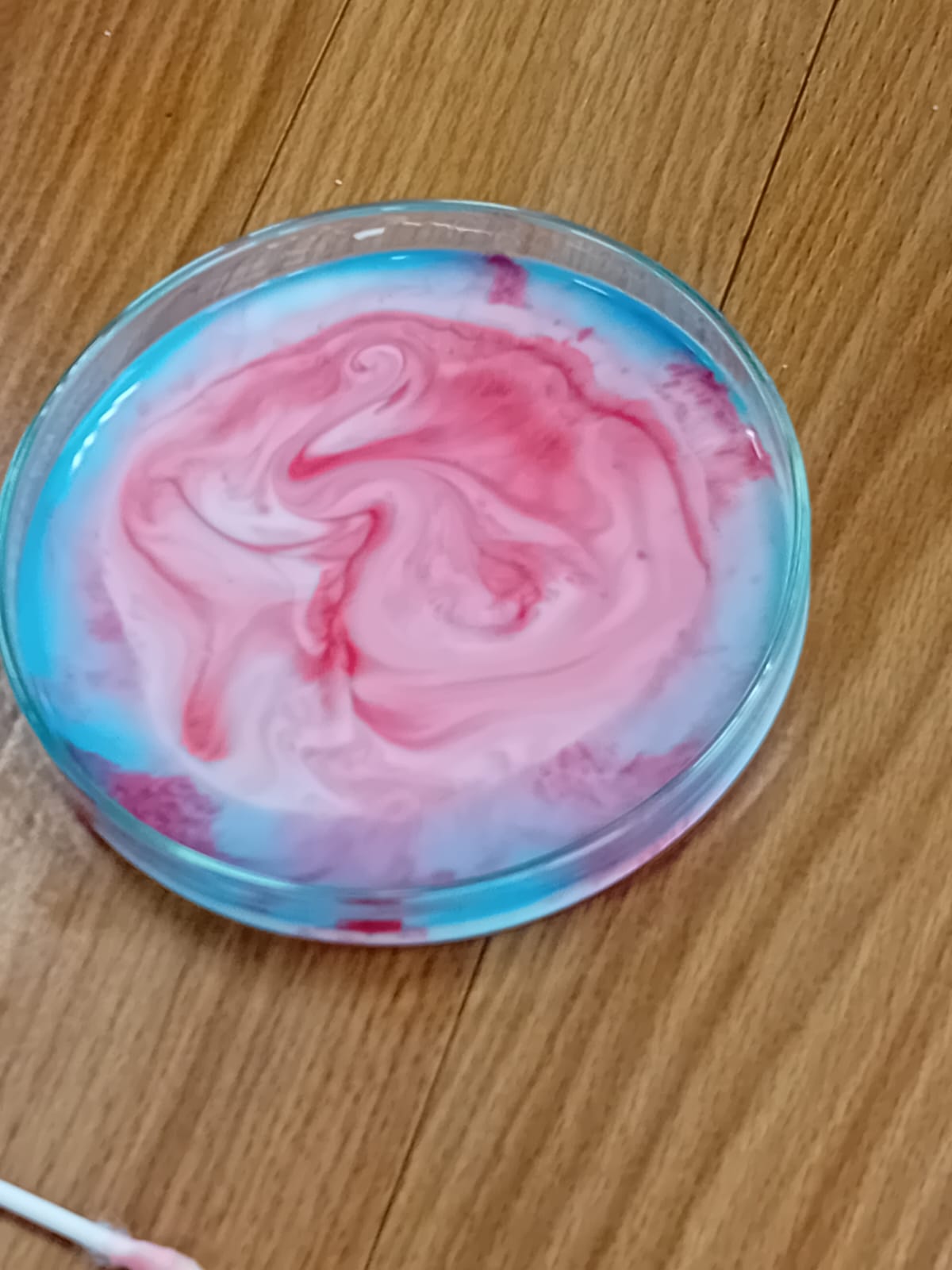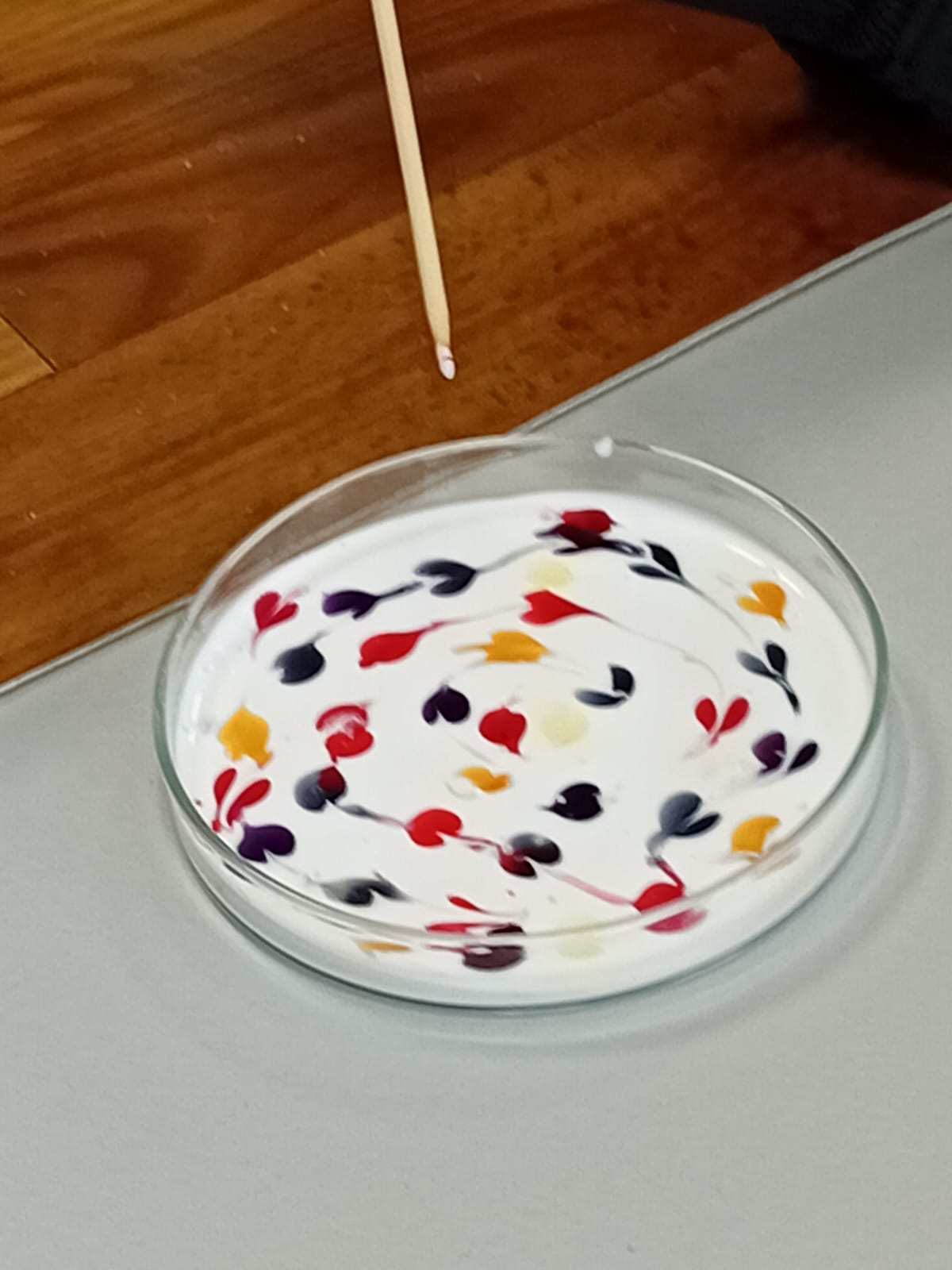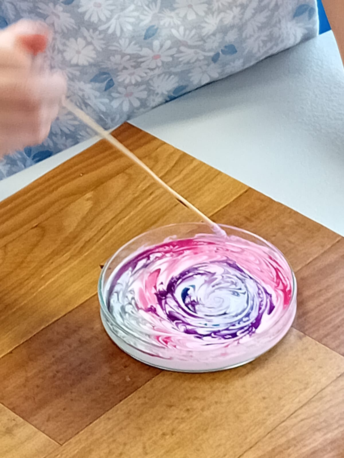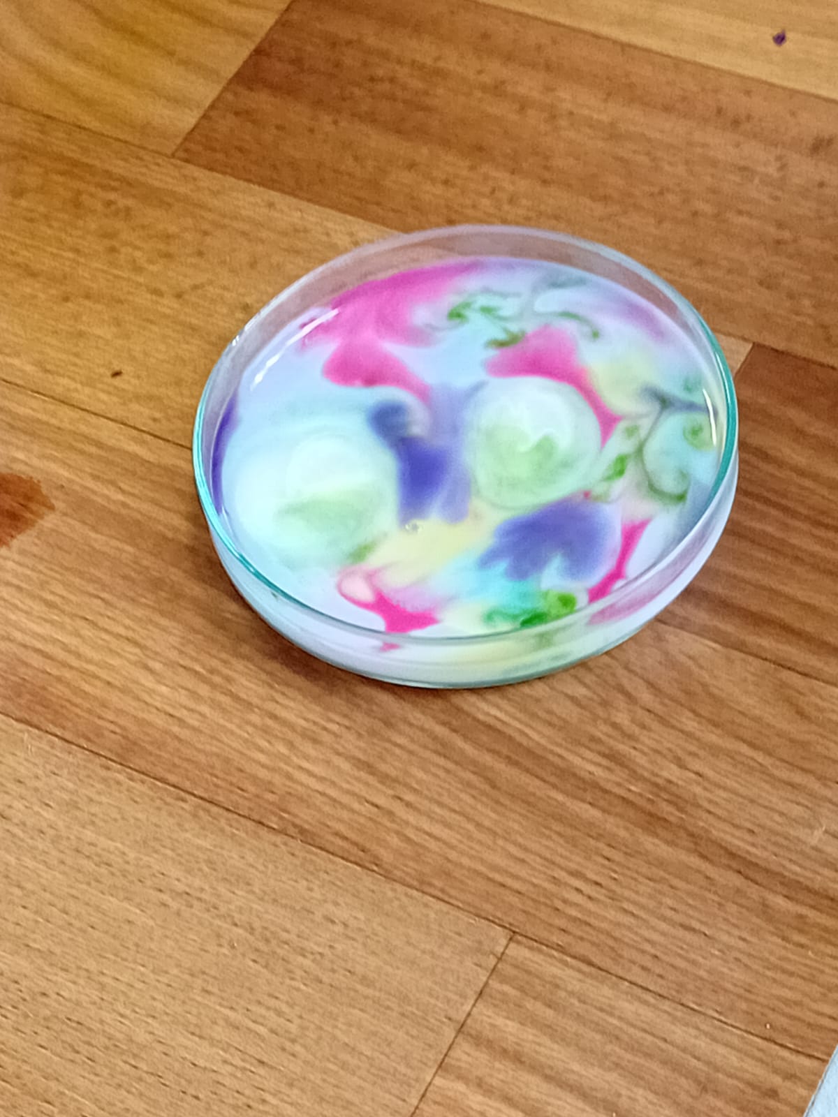 Pak každé z dětí dostalo na vyzkoušení mističku s mlékem a tekuté barvičky podle vlastního výběru. Vytvořili nejrůznější barevné kreace a potom pozorovali, co se s barvami děje, když se jich dotknou tyčinkou namočenou v jaru. Ještě o dost krásnější byl stejný pokus, ale s tekutým lepidlem. Protože je lepidlo hustší než mléko, dají se vytvořit ještě o mnoho krásnější barevné obrazce. Leckdy až umělecká díla…