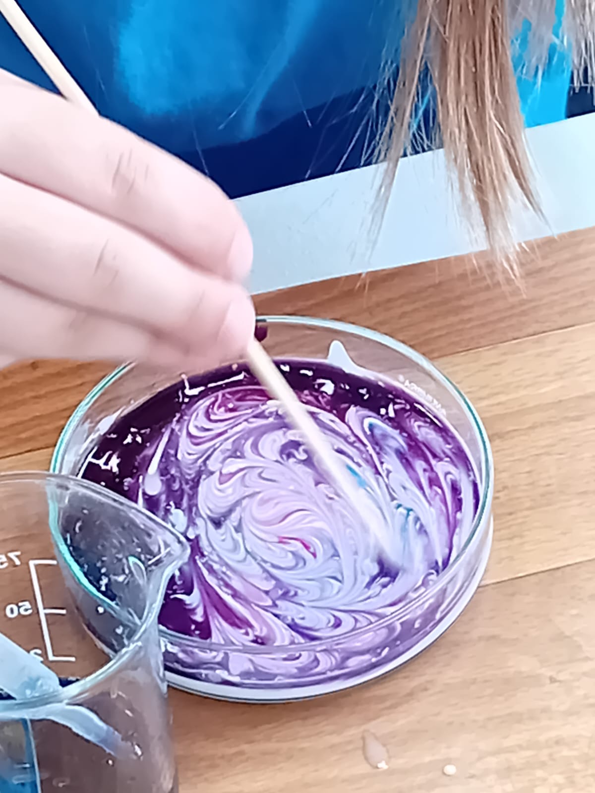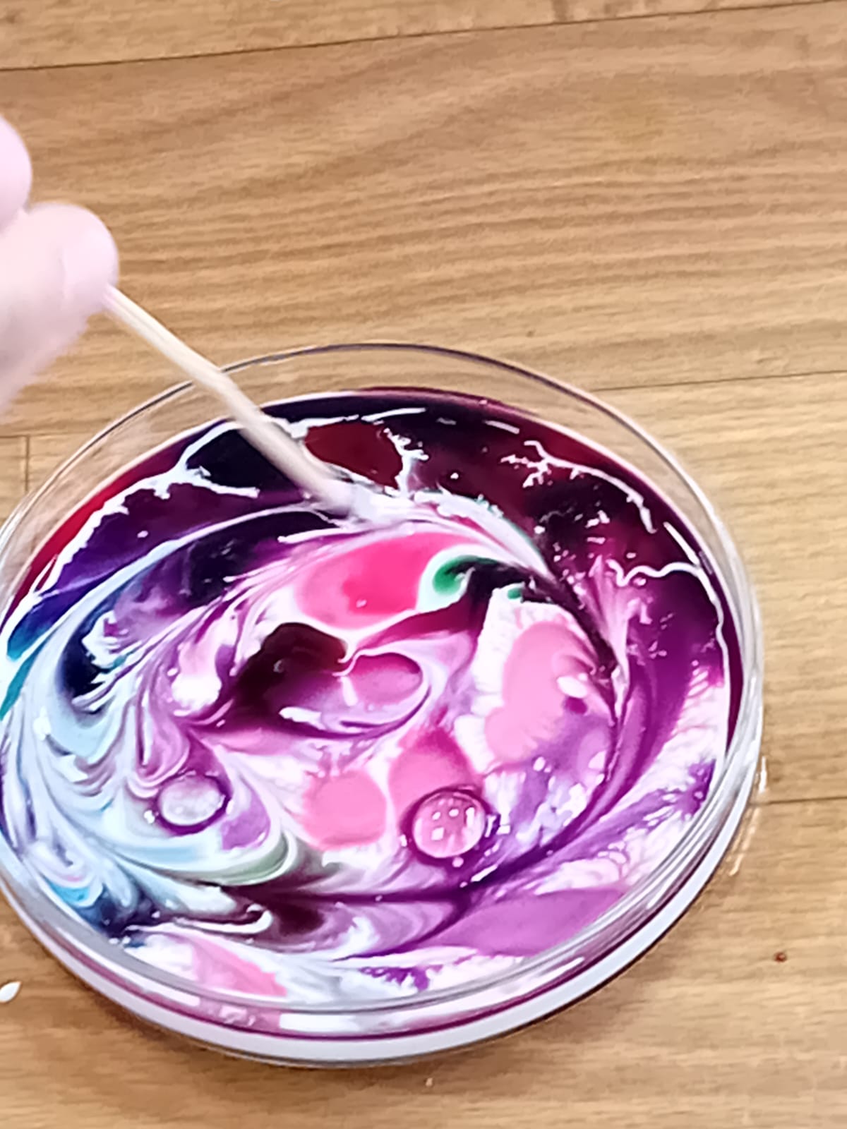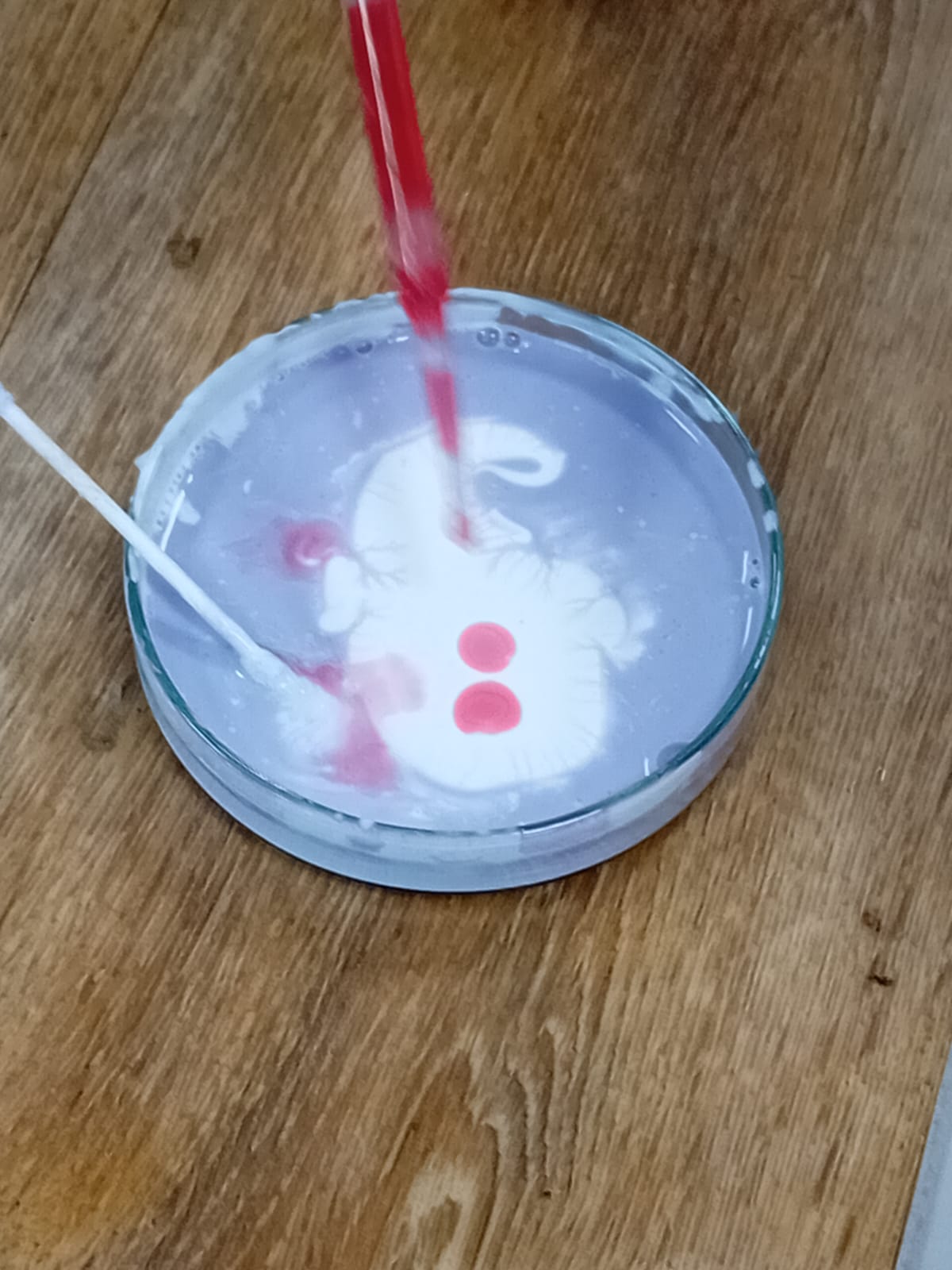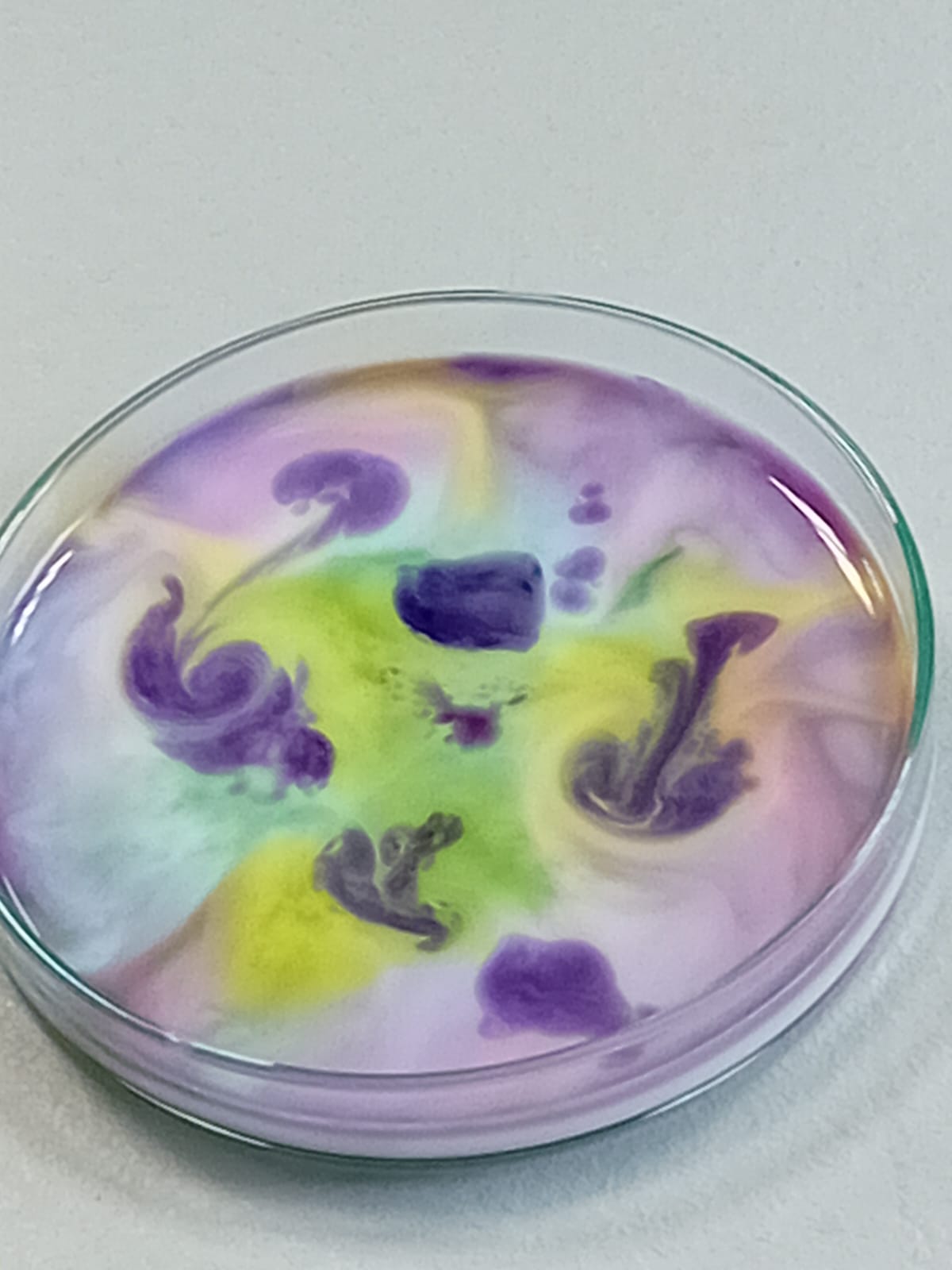 Pak každé z dětí dostalo na vyzkoušení mističku s mlékem a tekuté barvičky podle vlastního výběru. Vytvořili nejrůznější barevné kreace a potom pozorovali, co se s barvami děje, když se jich dotknou tyčinkou namočenou v jaru. Ještě o dost krásnější byl stejný pokus, ale s tekutým lepidlem. Protože je lepidlo hustší než mléko, dají se vytvořit ještě o mnoho krásnější barevné obrazce. Leckdy až umělecká díla…