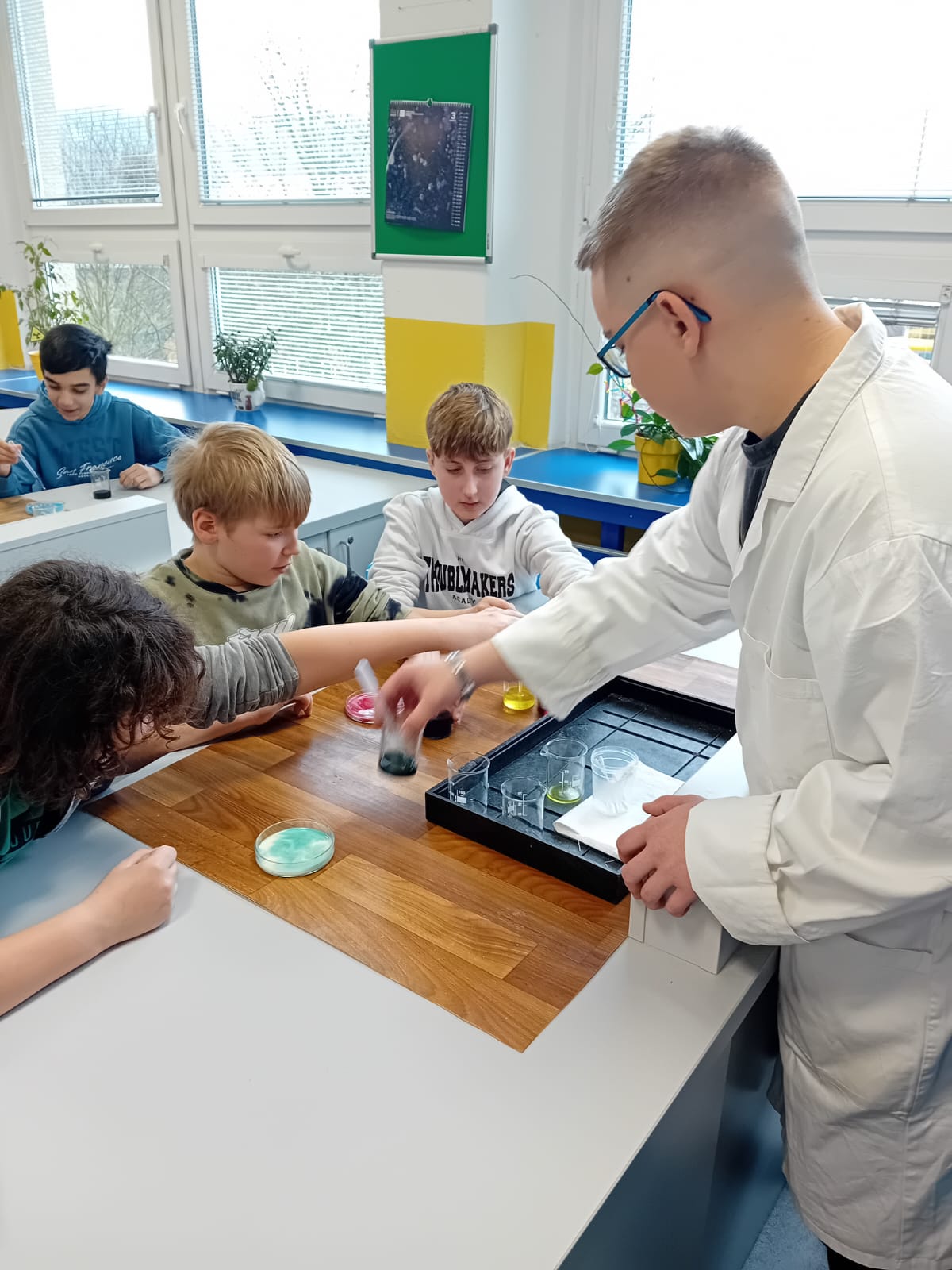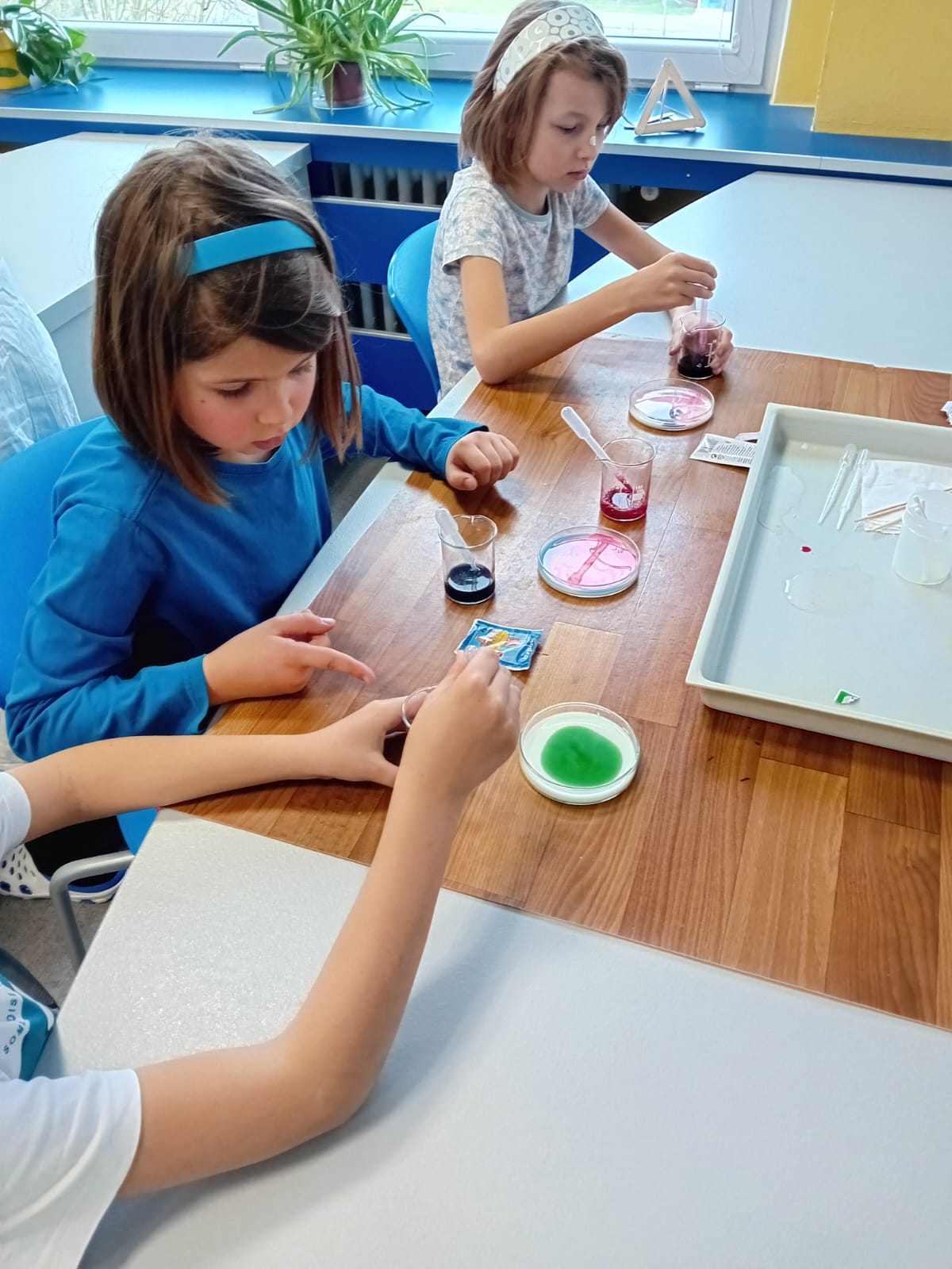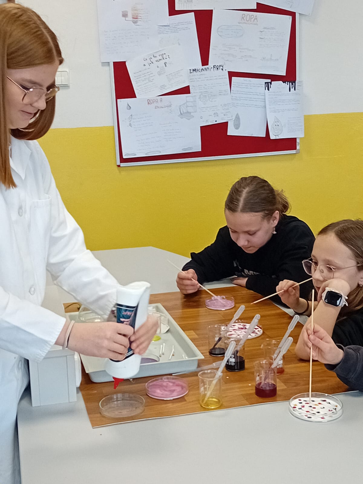 Jednalo se o spojení chemie a výtvarné výchovy. Áďa, Marťa, Linda, Eliška, Honza a Vojta si pro žáky 3.A a 5.B připravili pokusy na téma povrchové napětí.