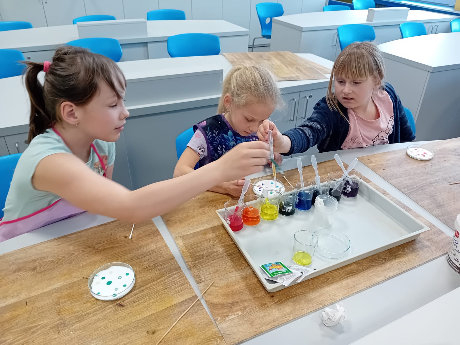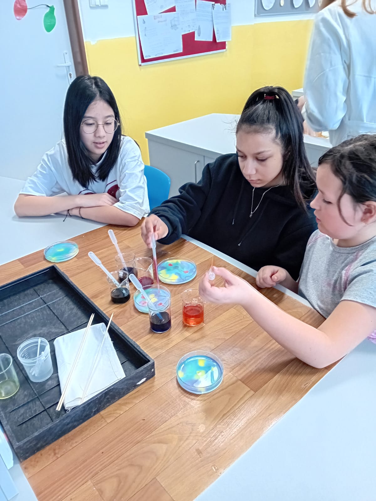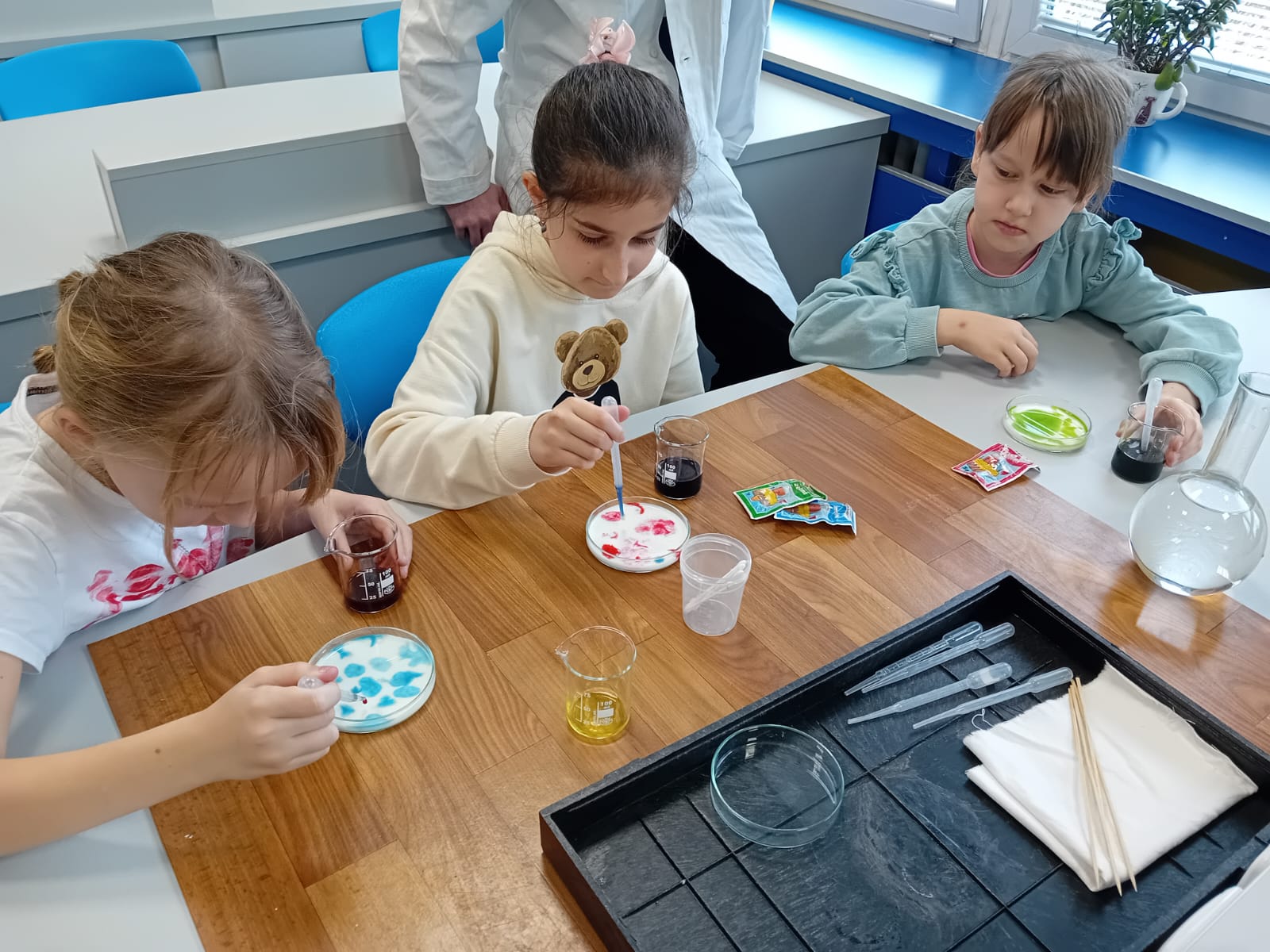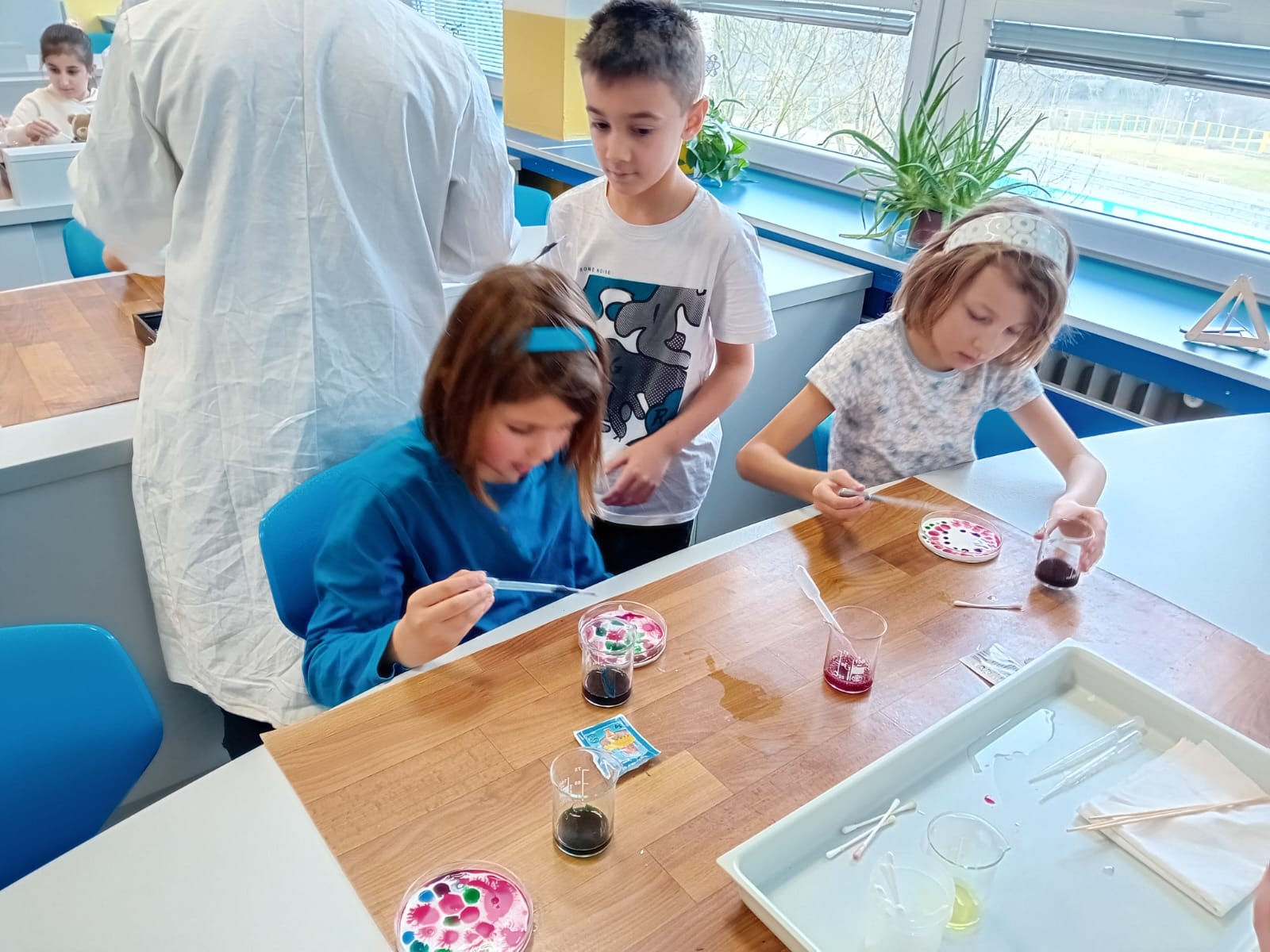 Jednalo se o spojení chemie a výtvarné výchovy. Áďa, Marťa, Linda, Eliška, Honza a Vojta si pro žáky 3.A a 5.B připravili pokusy na téma povrchové napětí.