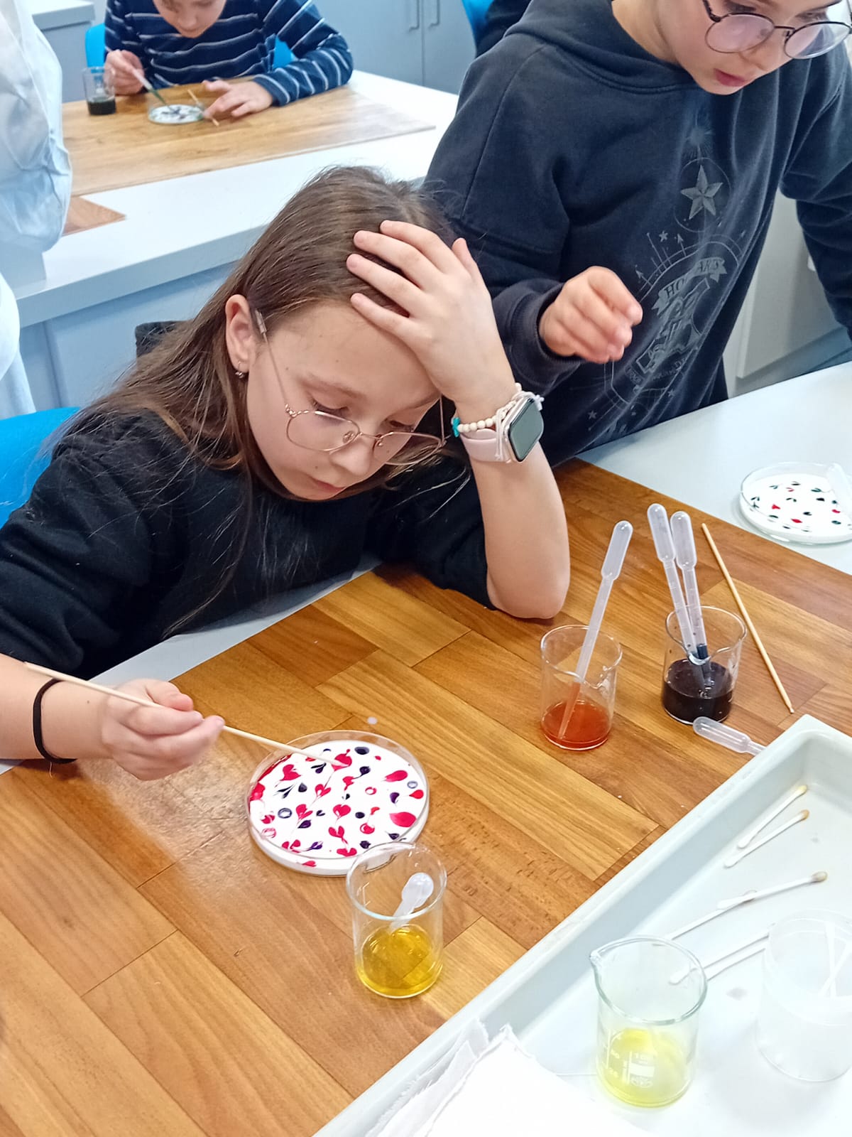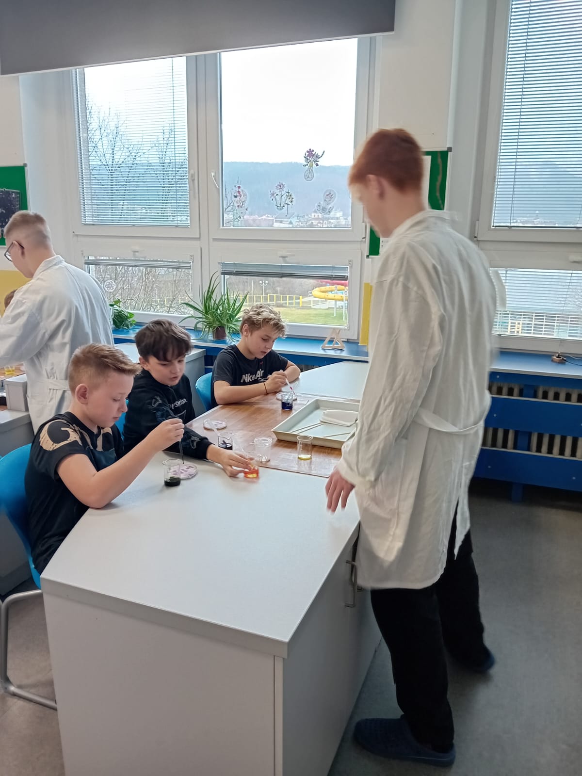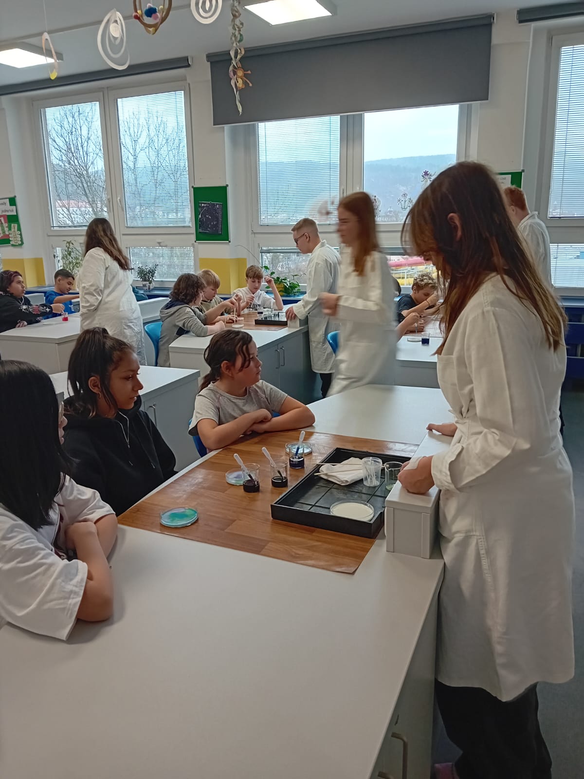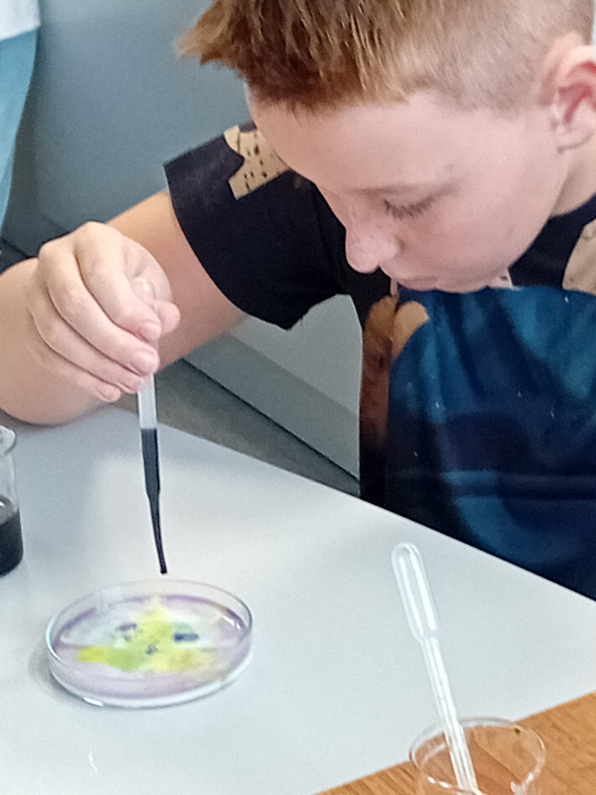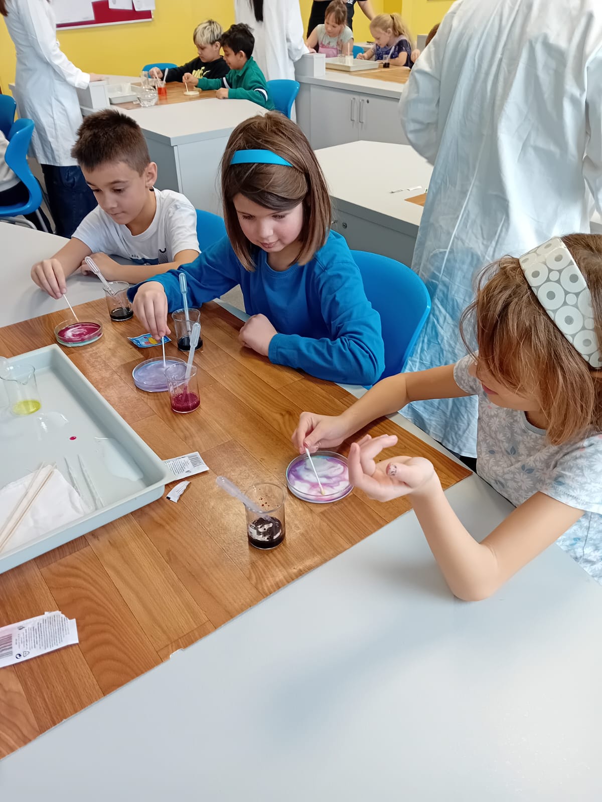 Žáci 5. B pak při hodině výtvarné výchovy ztvárnili chemický pokus, který si všichni osobně vyzkoušeli. Čtvrtku žáci nejprve natřeli silnější vrstvou lepidla Herkules, do které zapouštěli anilínové barvy. Po zaschnutí plochy vystřihli kruh, který představoval misku na pokus.