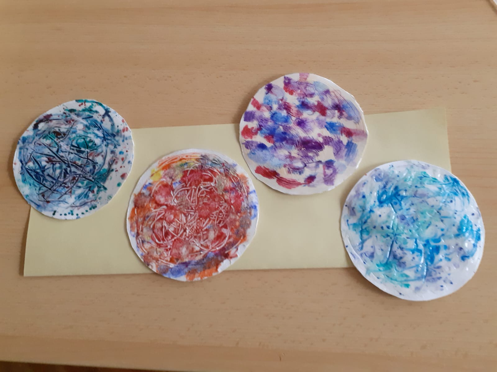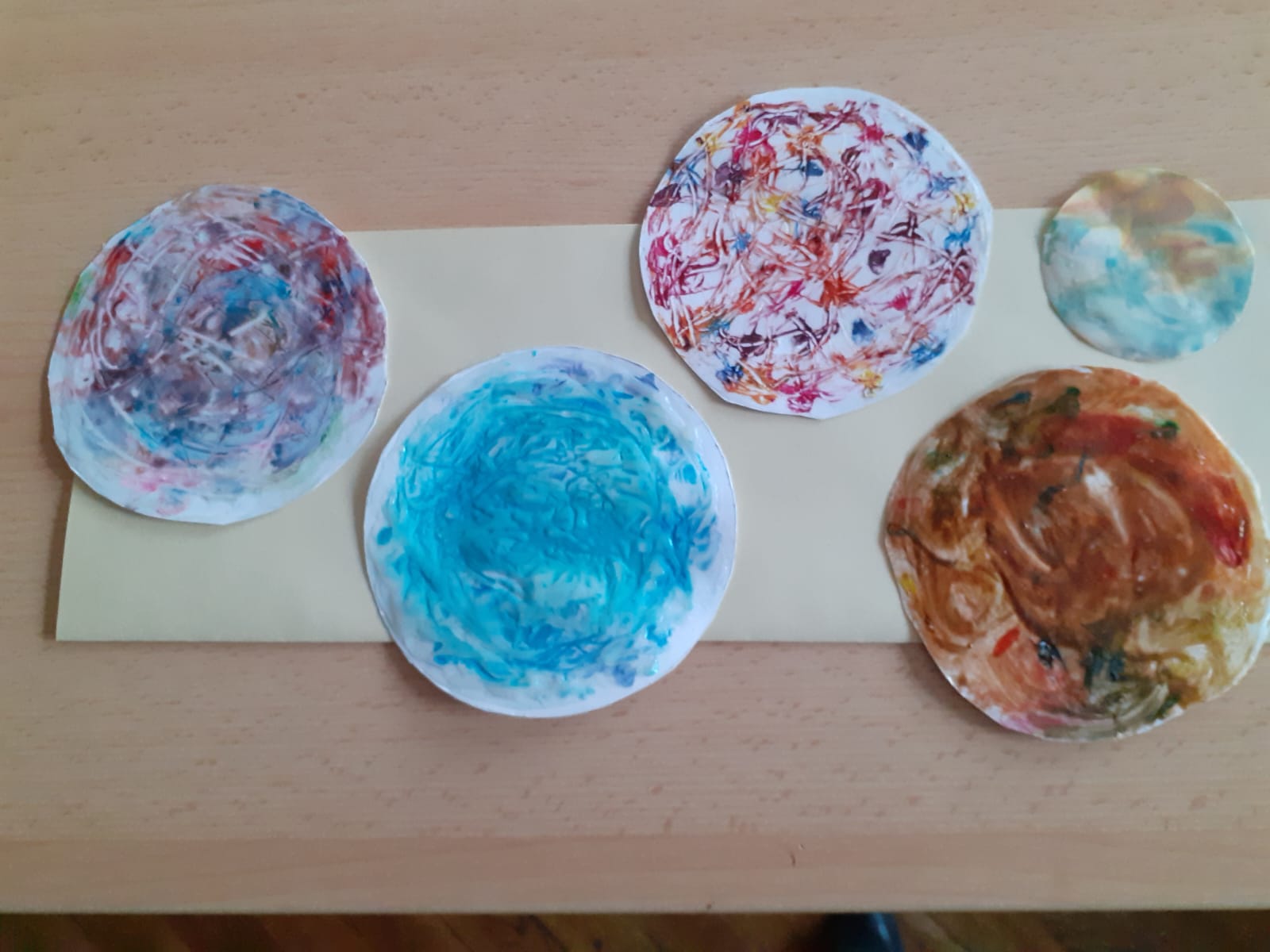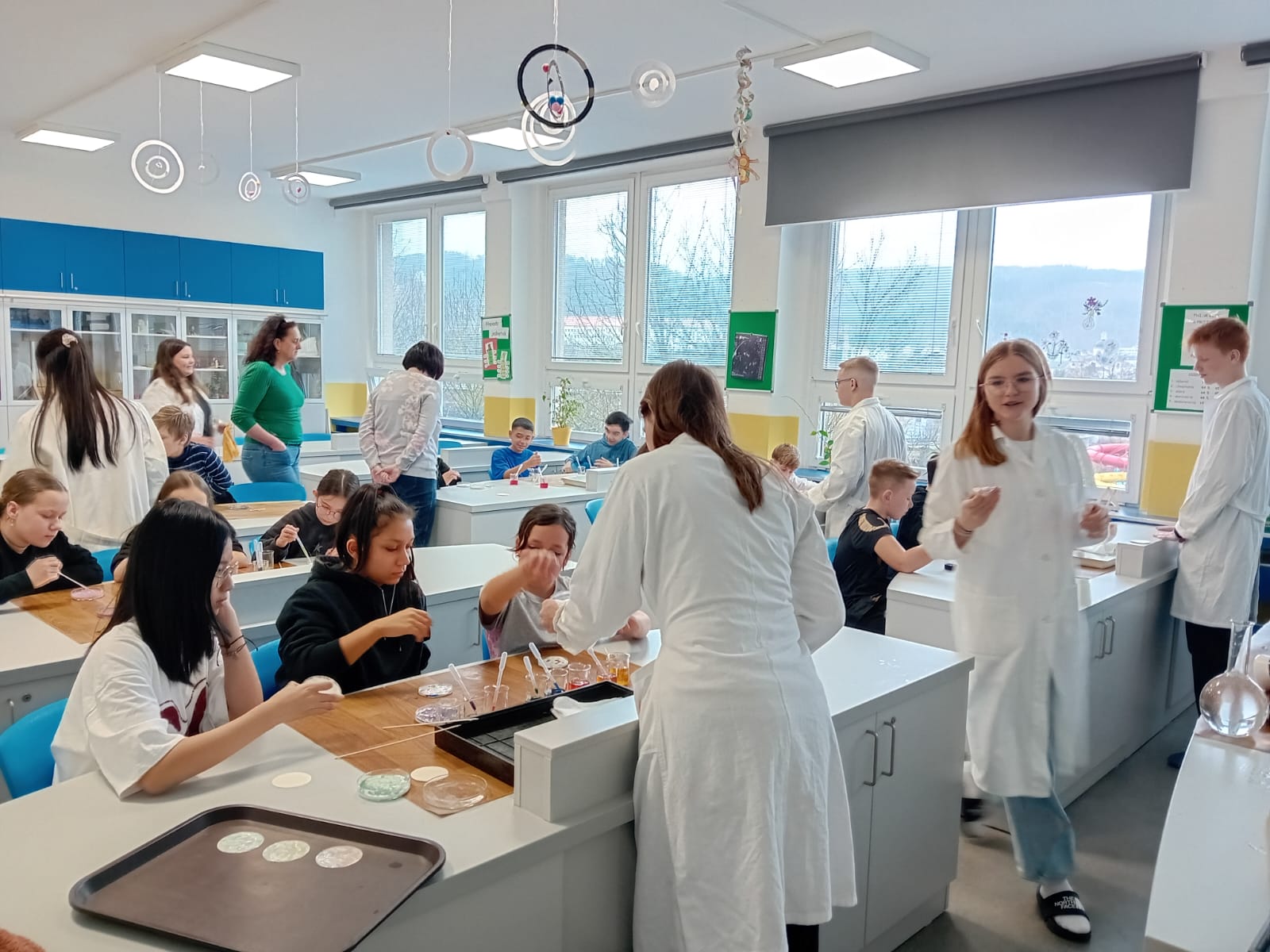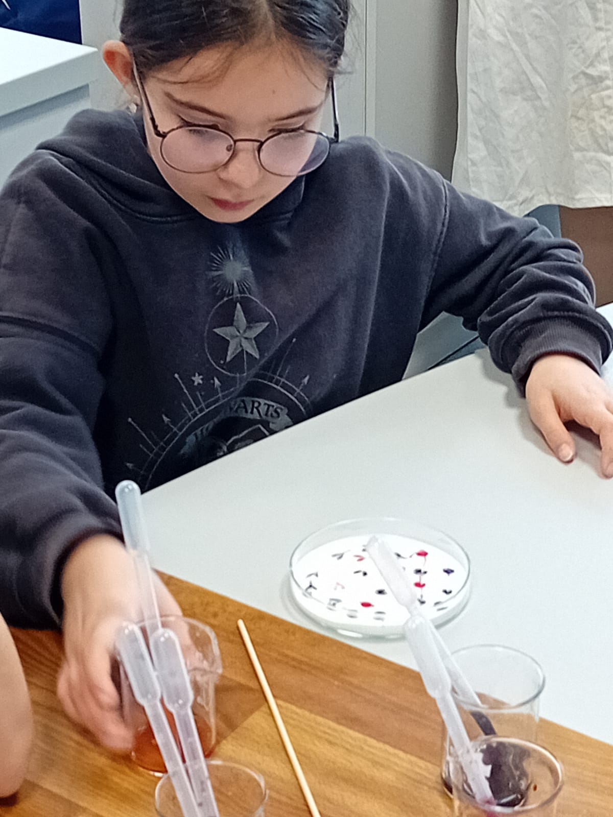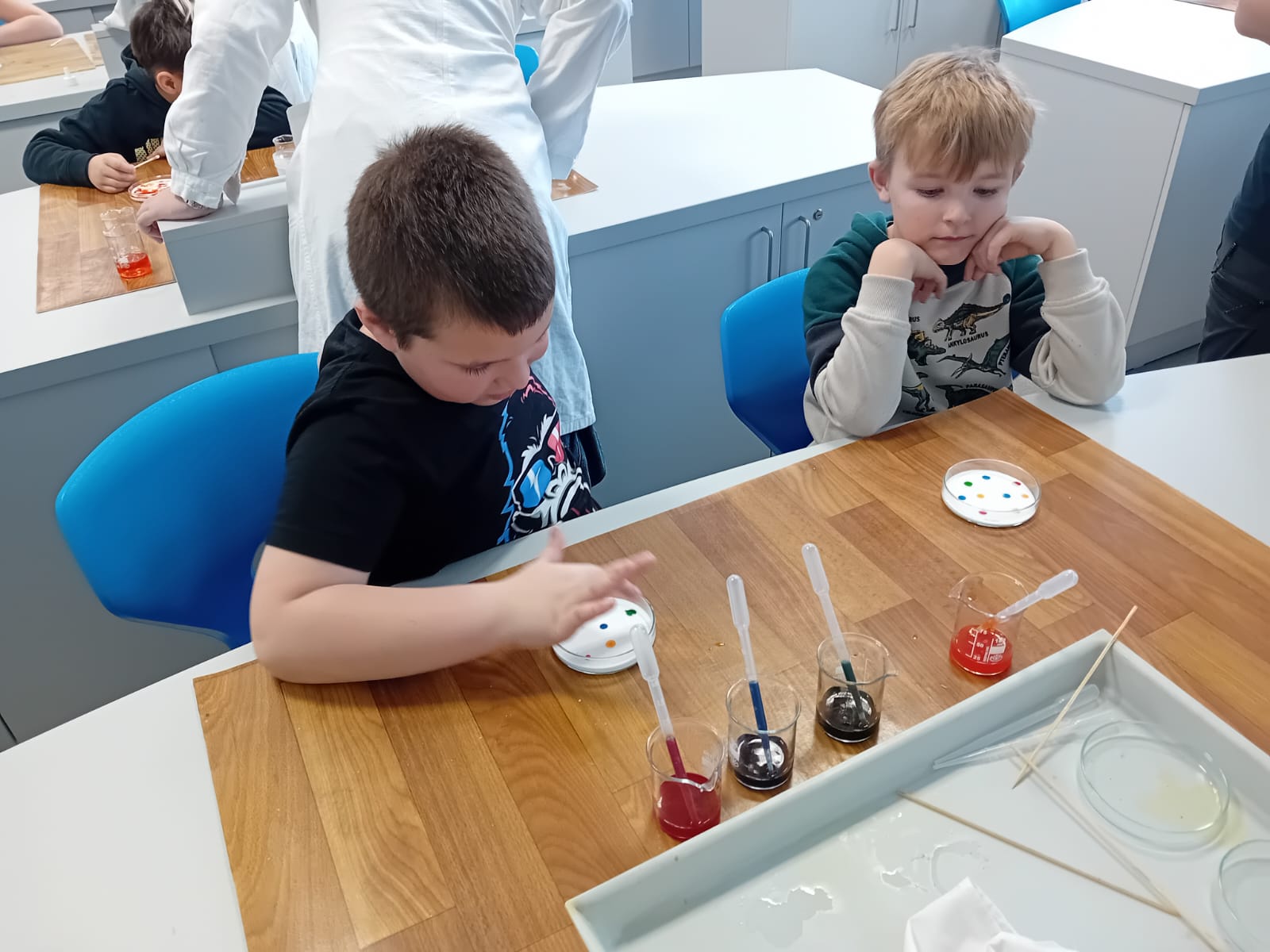Žáci 5. B pak při hodině výtvarné výchovy ztvárnili chemický pokus, který si všichni osobně vyzkoušeli. Čtvrtku žáci nejprve natřeli silnější vrstvou lepidla Herkules, do které zapouštěli anilínové barvy. Po zaschnutí plochy vystřihli kruh, který představoval misku na pokus.