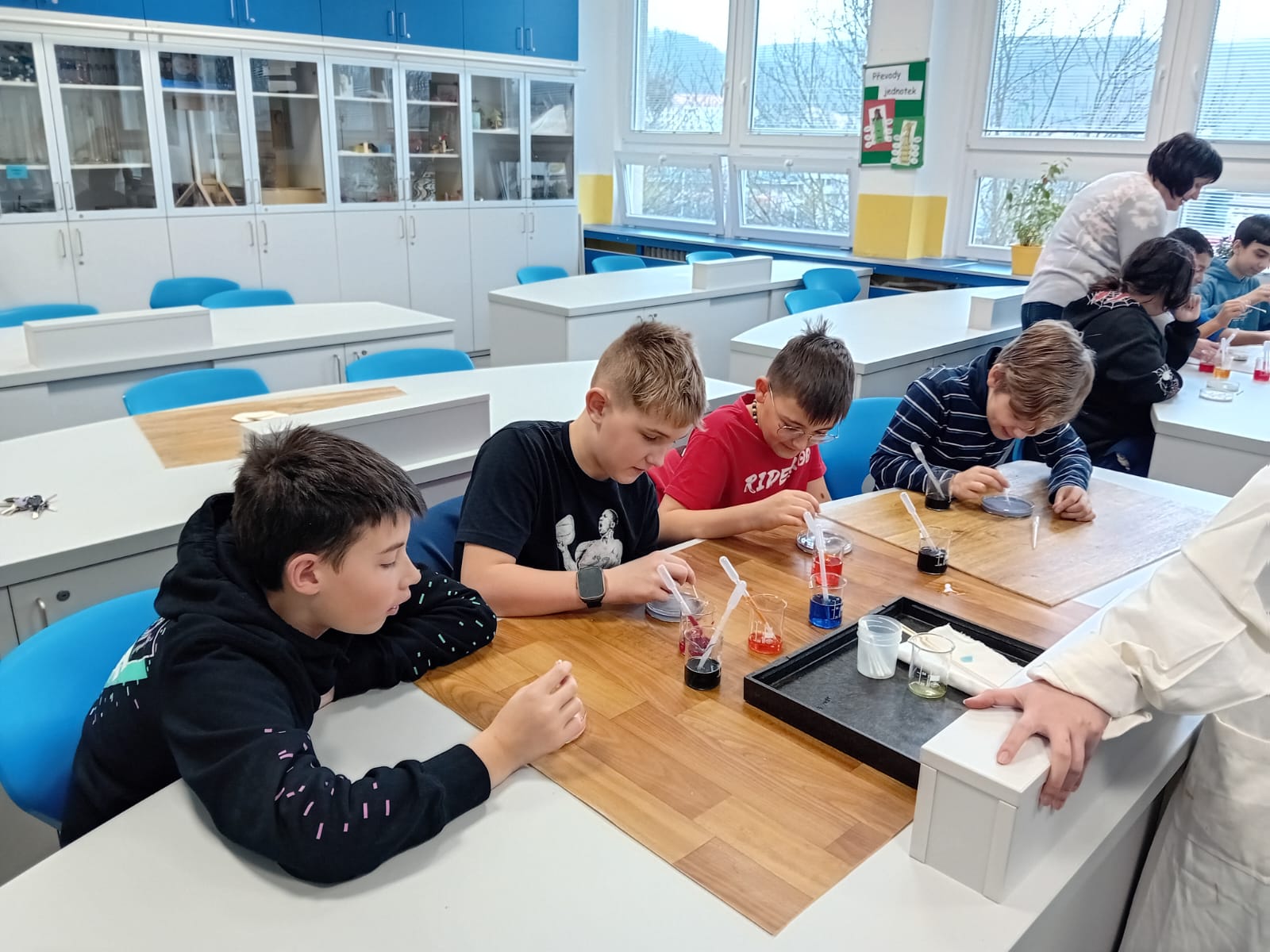 Osmákům patří velké poděkování ode mě nejen za to, jak perfektně se věnovali dětem během hodiny, ale i za velkou pomoc při chystání materiálů a úklidu nekonečného množství zalepených misek a kádinek :-)