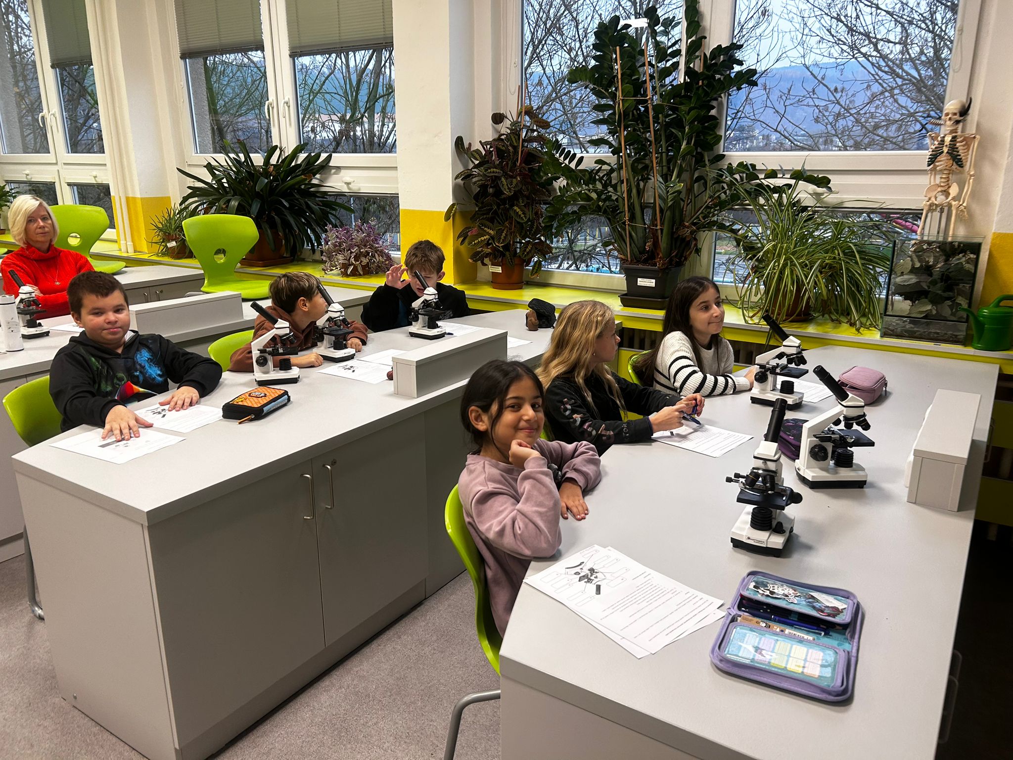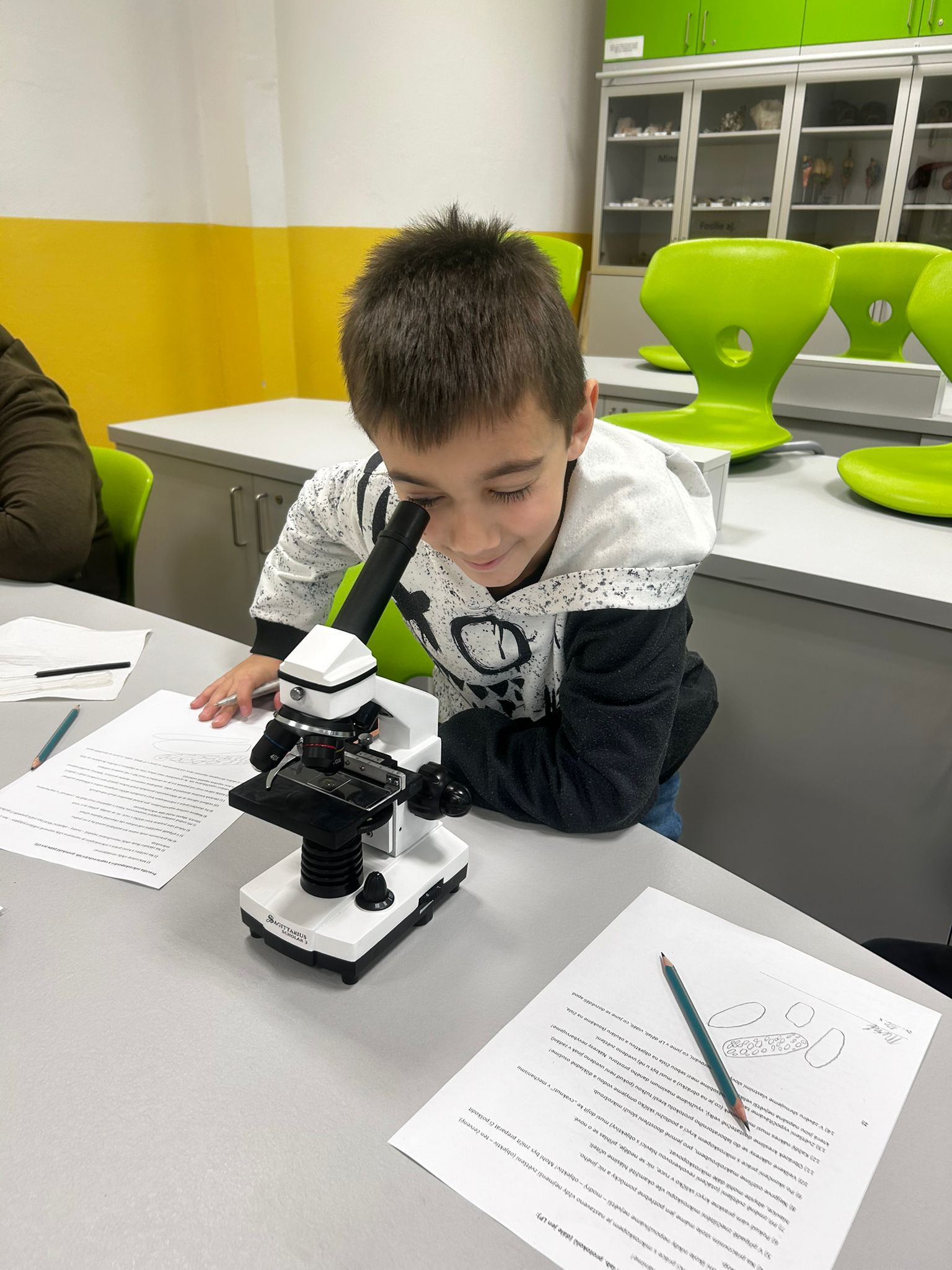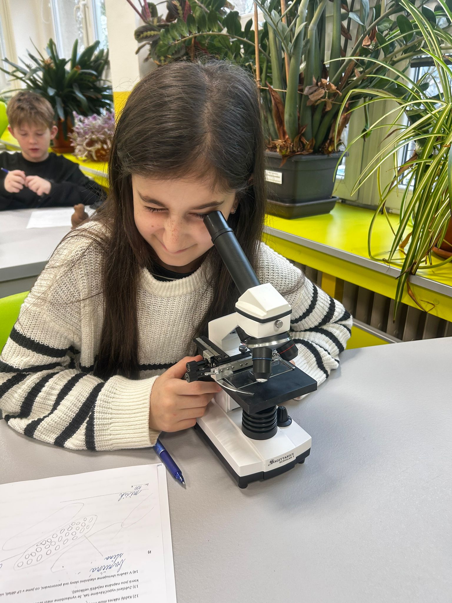 Pan učitel Bartoň měl pro žáky připravenou laboratorní práci s využitím mikroskopů. Děti si tak vyzkoušely to, co je bude za pár let čekat na druhém stupni. Laboratorní práce s mikroskopem jsou totiž velmi častými aktivitami, které pan učitel do výuky zařazuje.