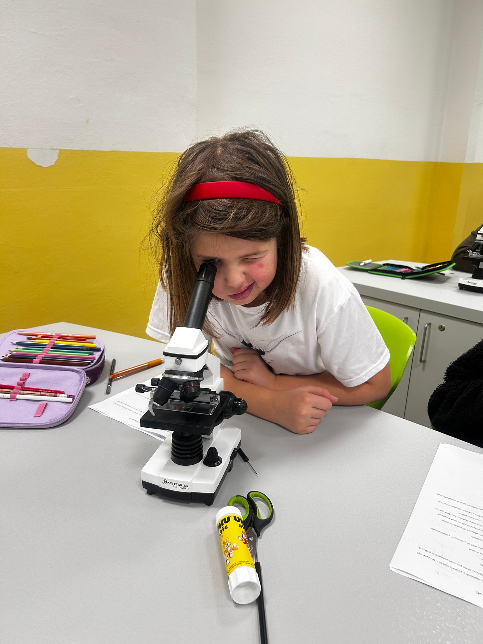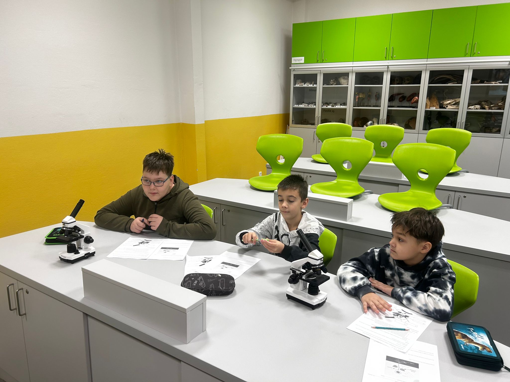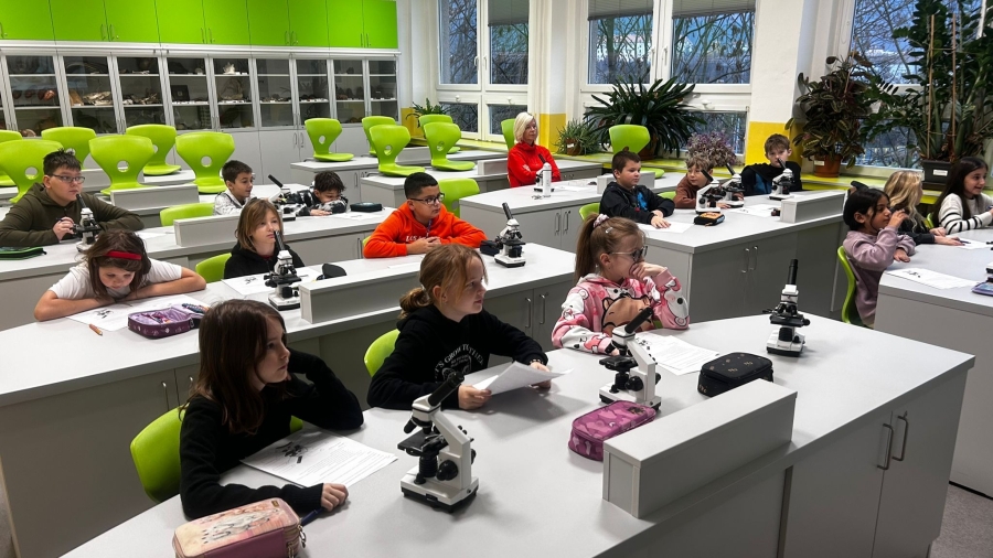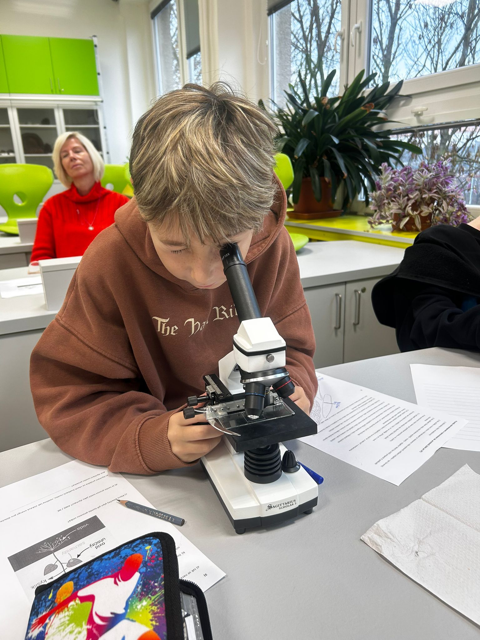Pan učitel Bartoň měl pro žáky připravenou laboratorní práci s využitím mikroskopů. Děti si tak vyzkoušely to, co je bude za pár let čekat na druhém stupni. Laboratorní práce s mikroskopem jsou totiž velmi častými aktivitami, které pan učitel do výuky zařazuje.
