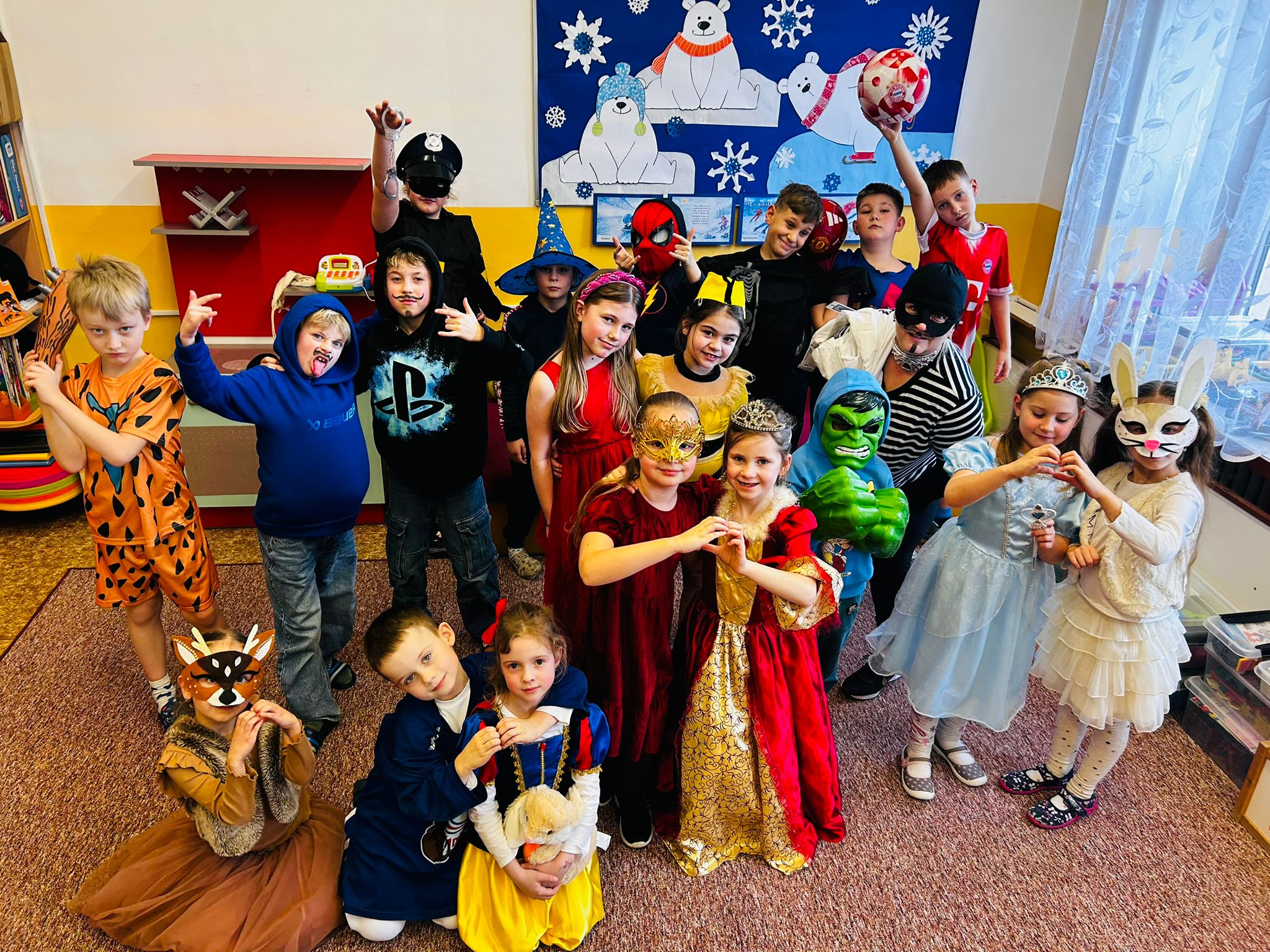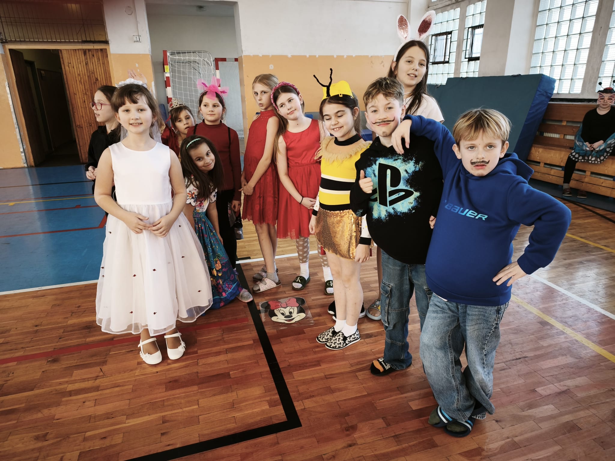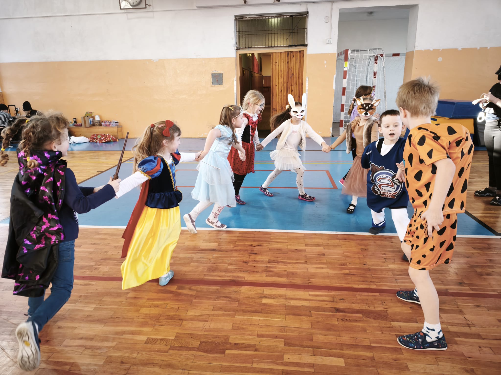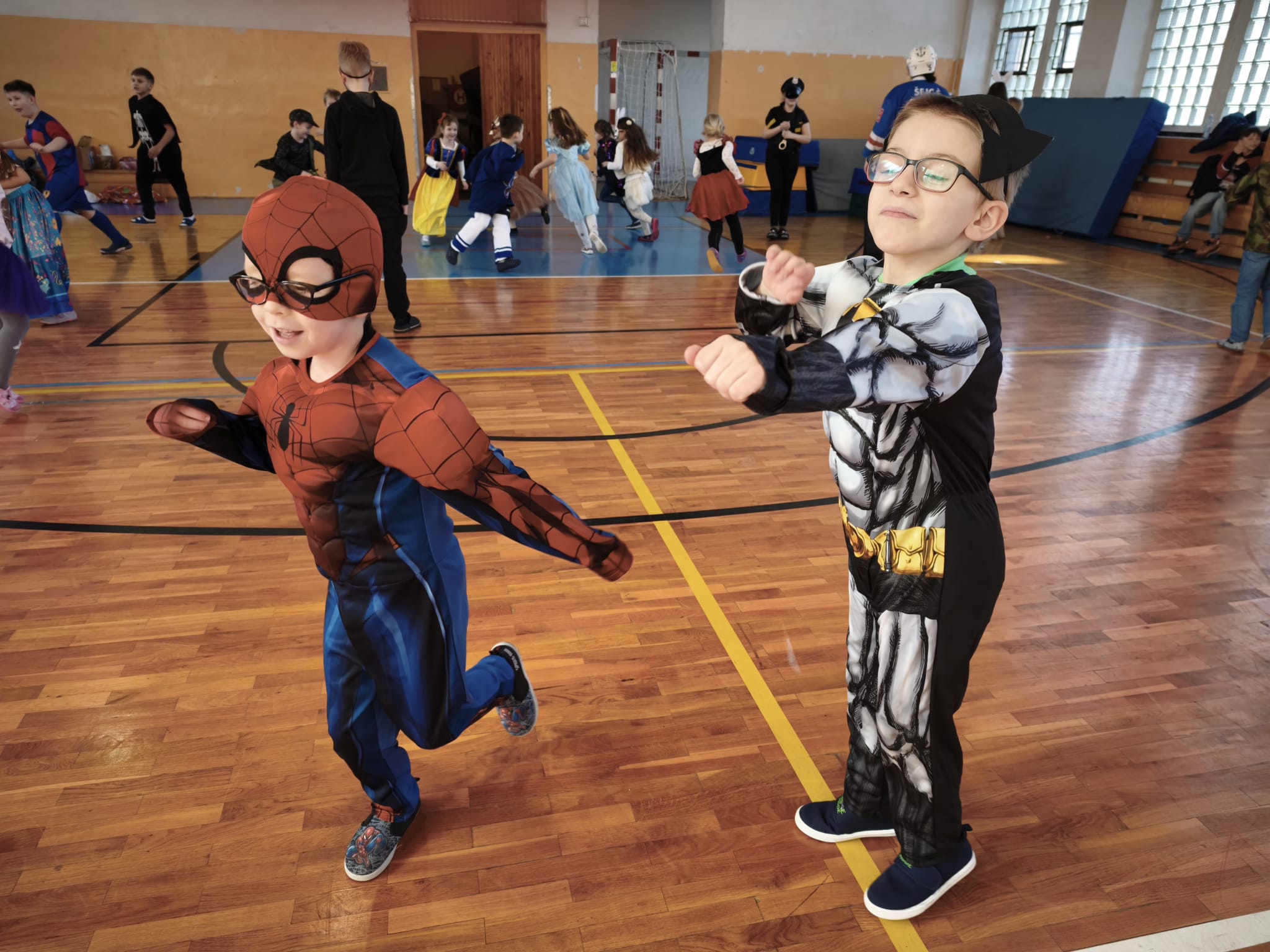 Školní tělocvična se proměnila v taneční sál plný pohádkových bytostí, zvířat, sportovců, princezen, víl, superhrdinů.