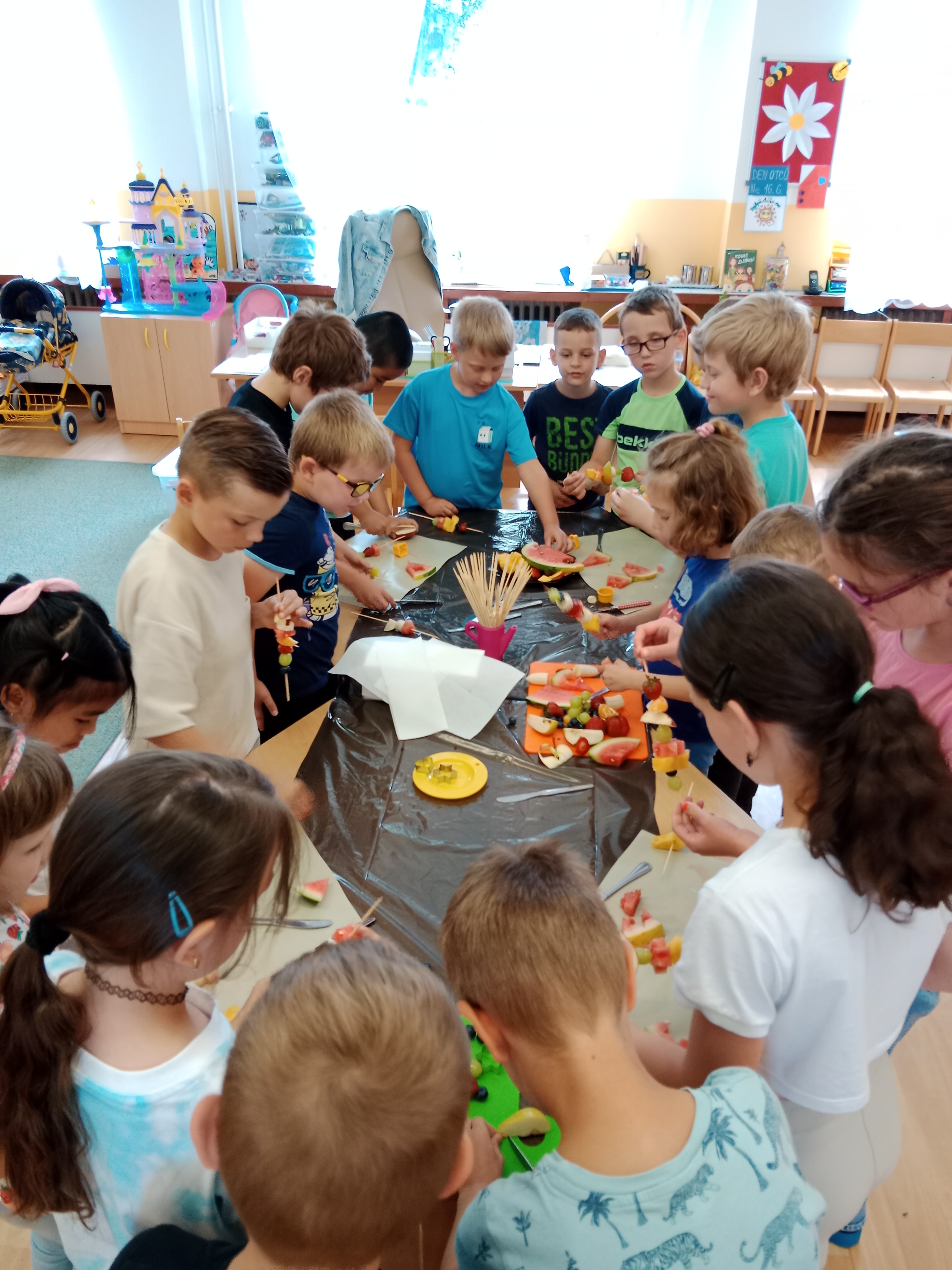 Zahráli jsme si Živé ovocné pexeso, luštili křížovky a zjišťovali odkud některé ovoce pochází. Poté jsme společně očistili a nakrájeli všechno ovoce a pustili se do výroby ovocných špízů, smoothie nebo dortíků, které si vytvářeli i za pomoci vykrajovátek jako nápady na dětskou či rodinnou párty.