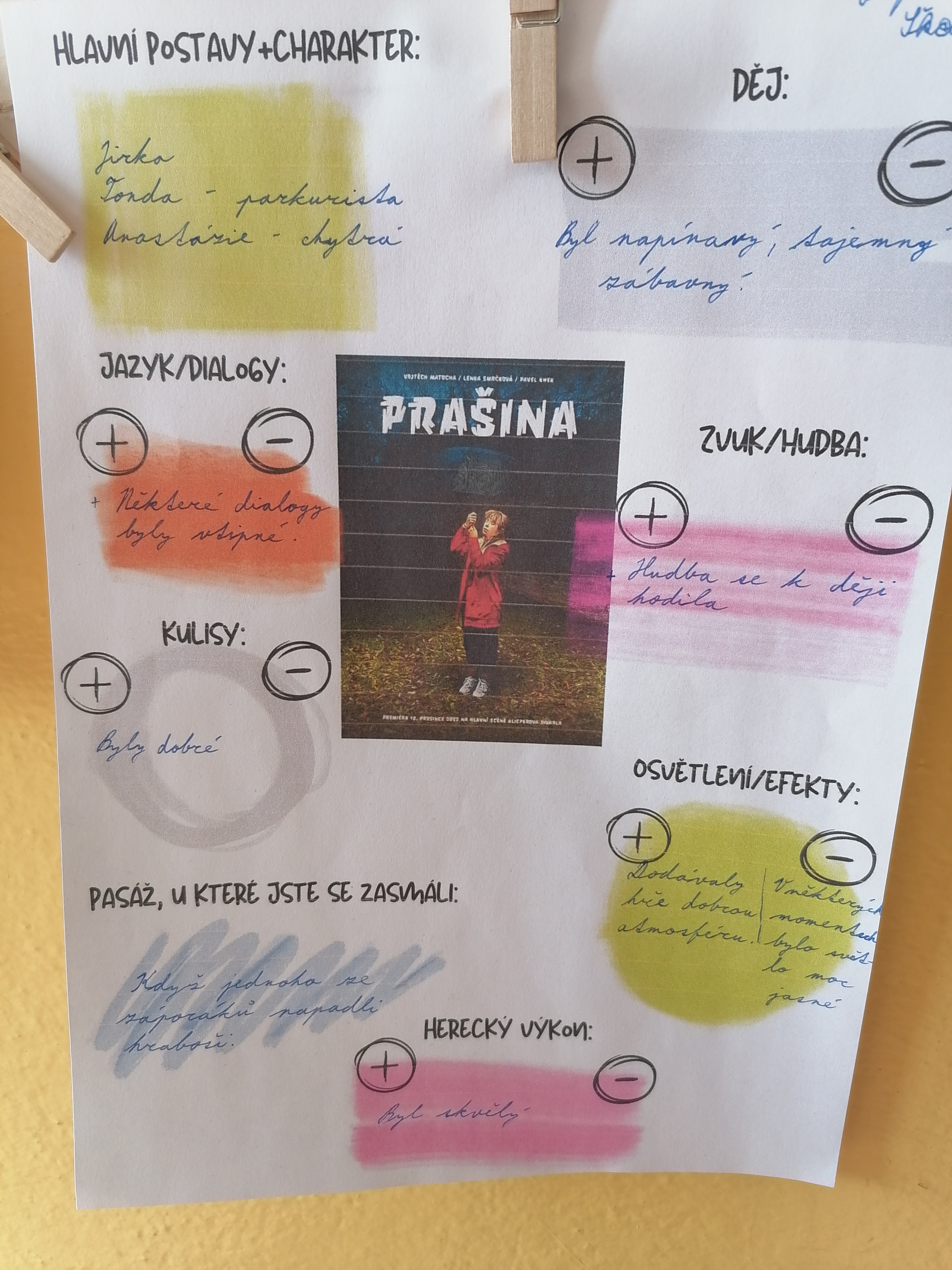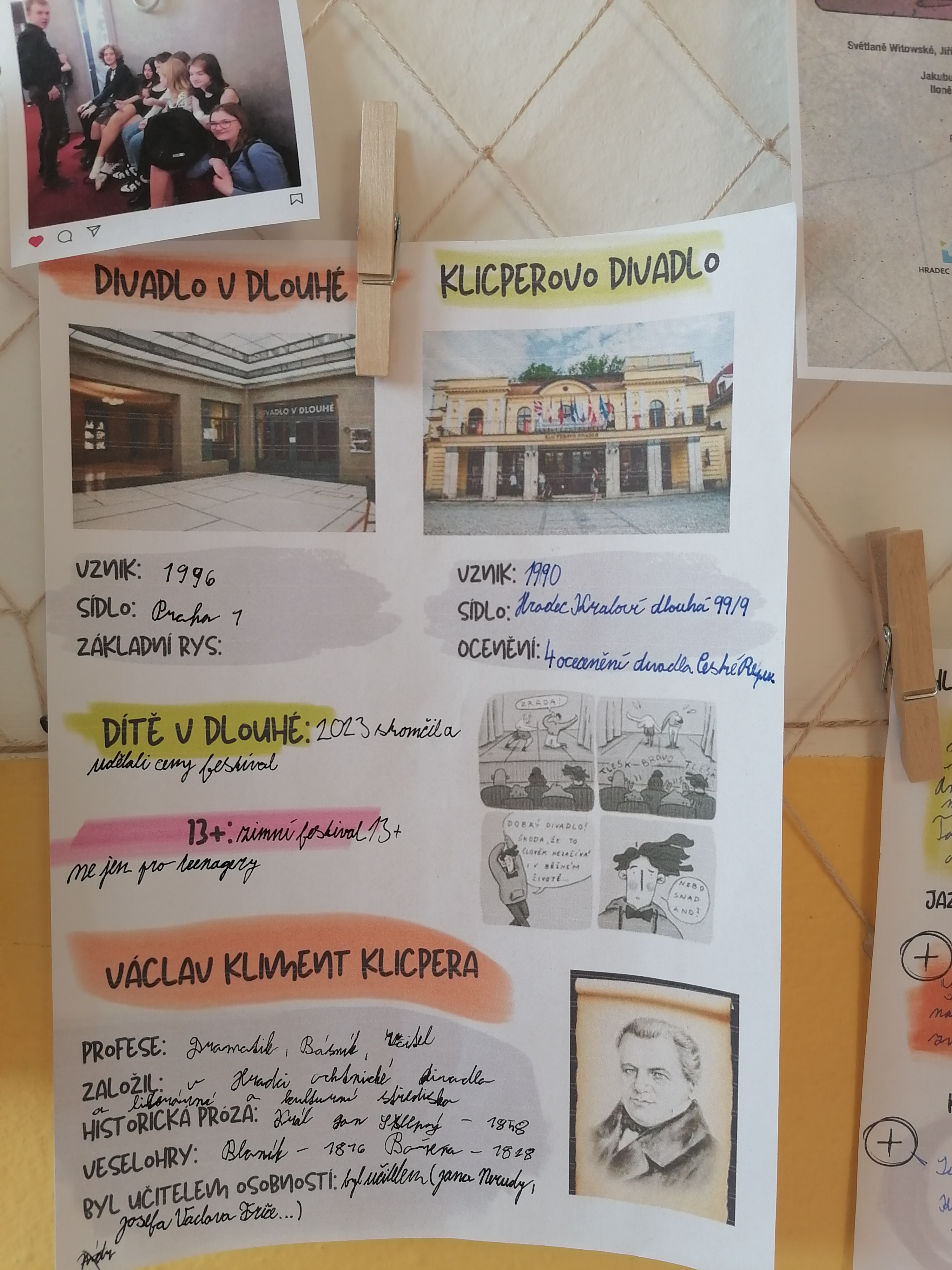 Ten, kdo se divadelního představení neúčastnil, měl svůj pracovní list, ve kterém vyplňoval informace o pražském Divadle v Dlouhé a zároveň i Klicperově divadle v Hradci Králové. Tento divadelní soubor má totiž Prašinu ve svém repertoáru.