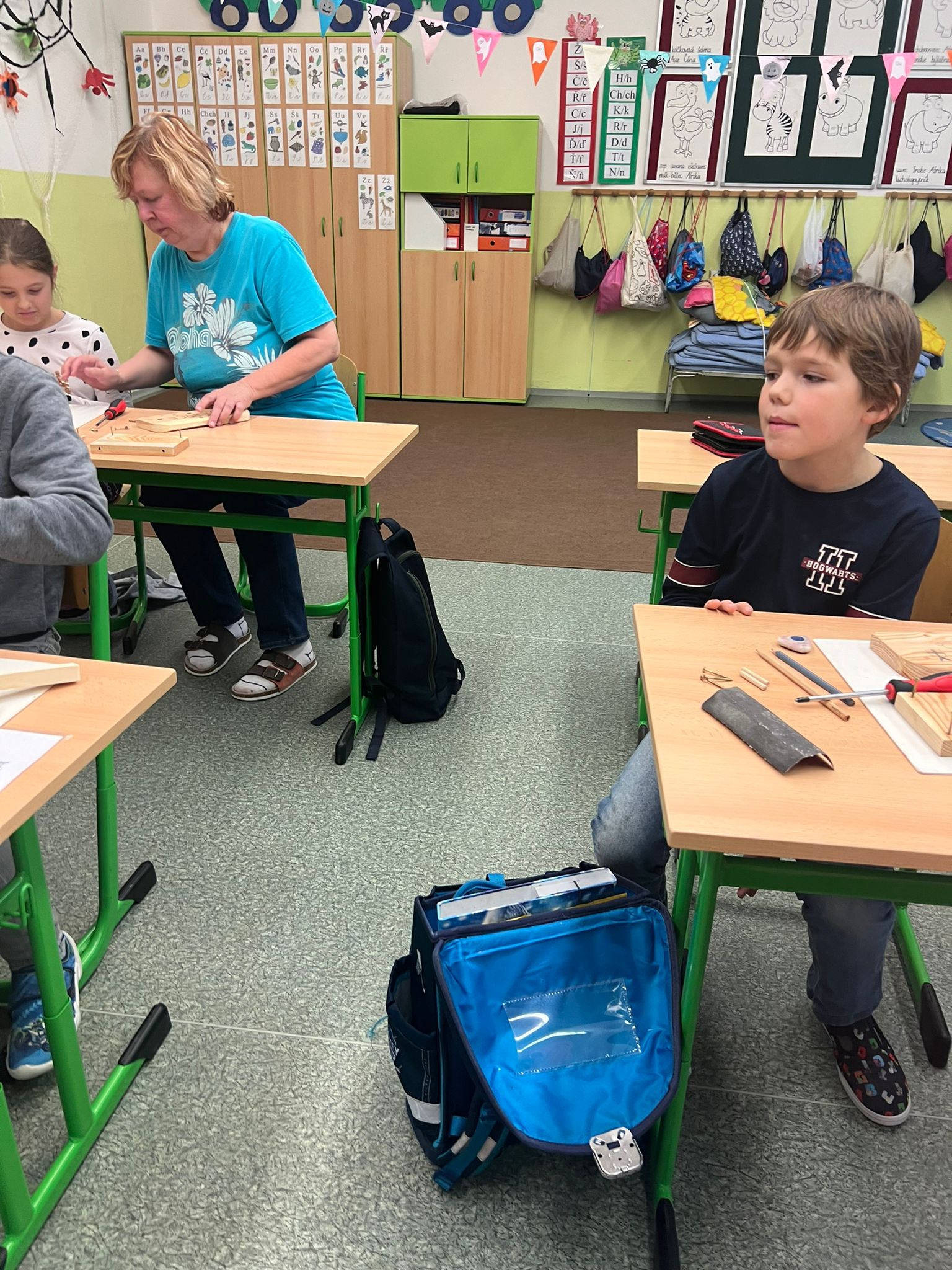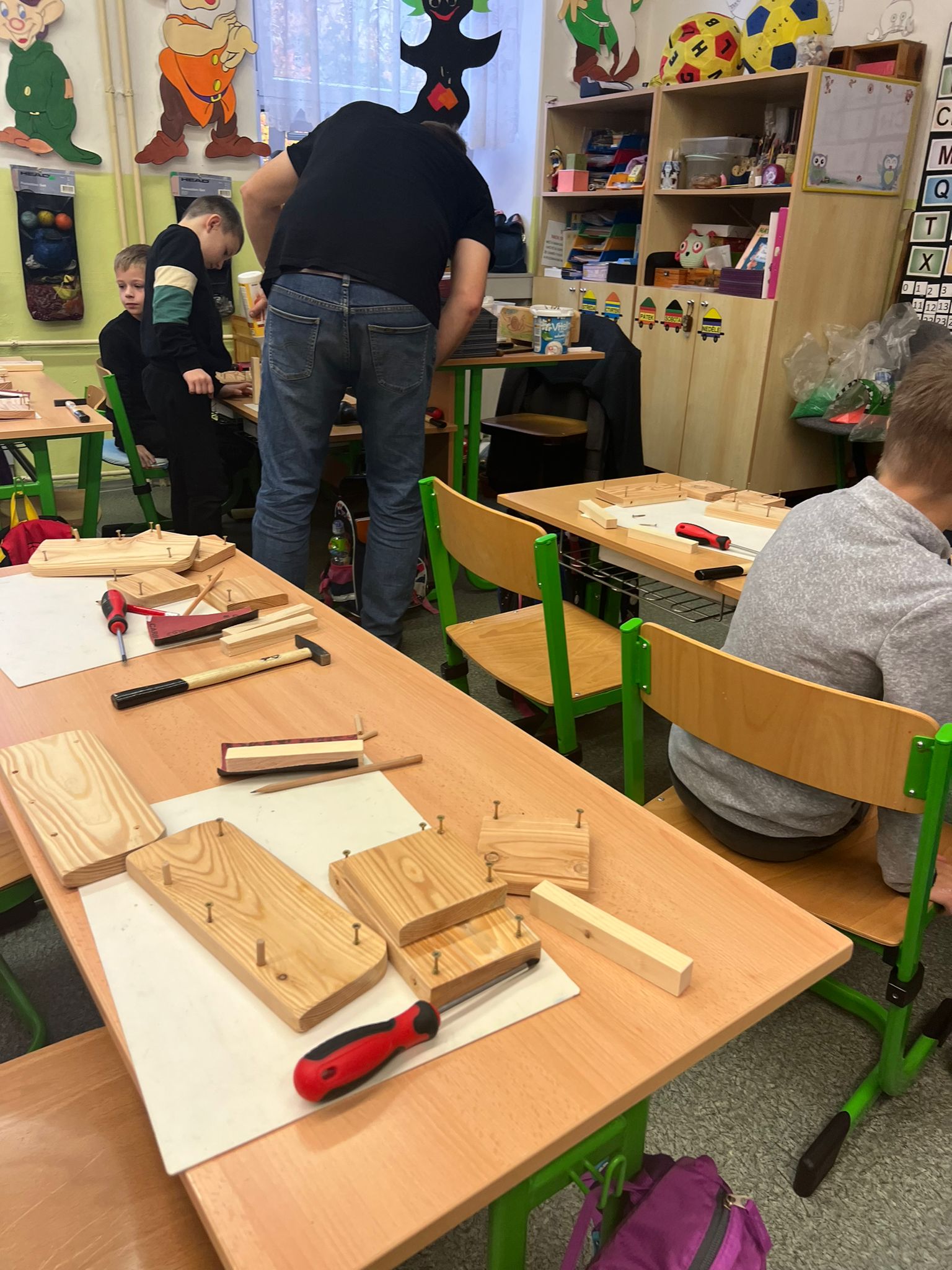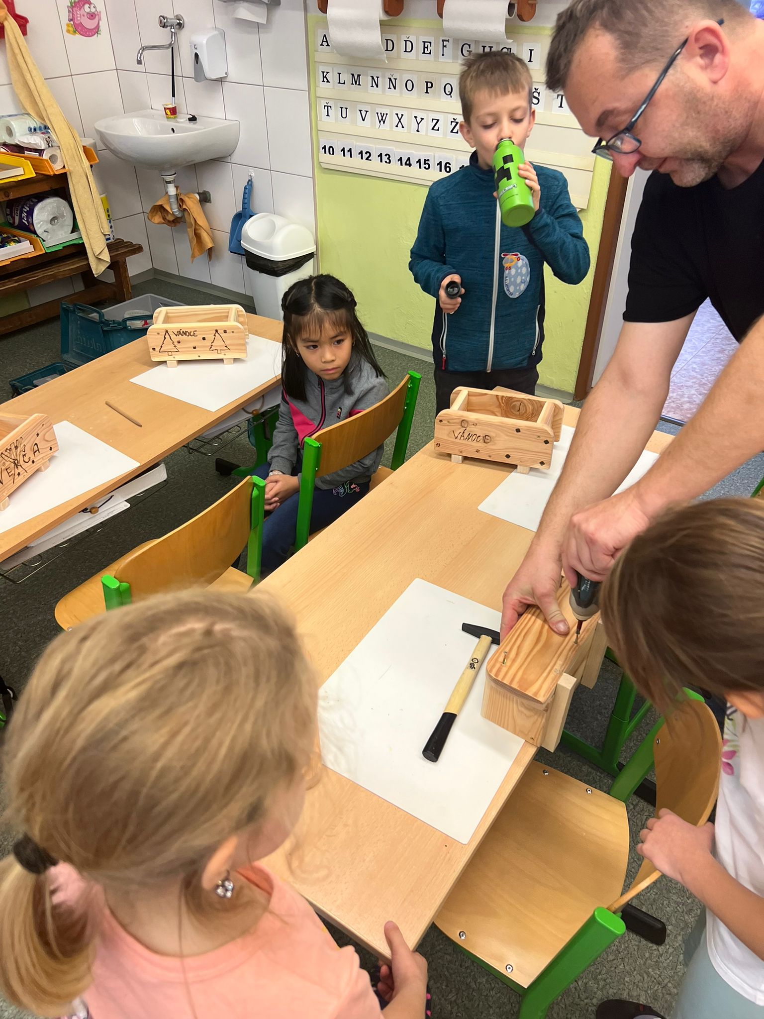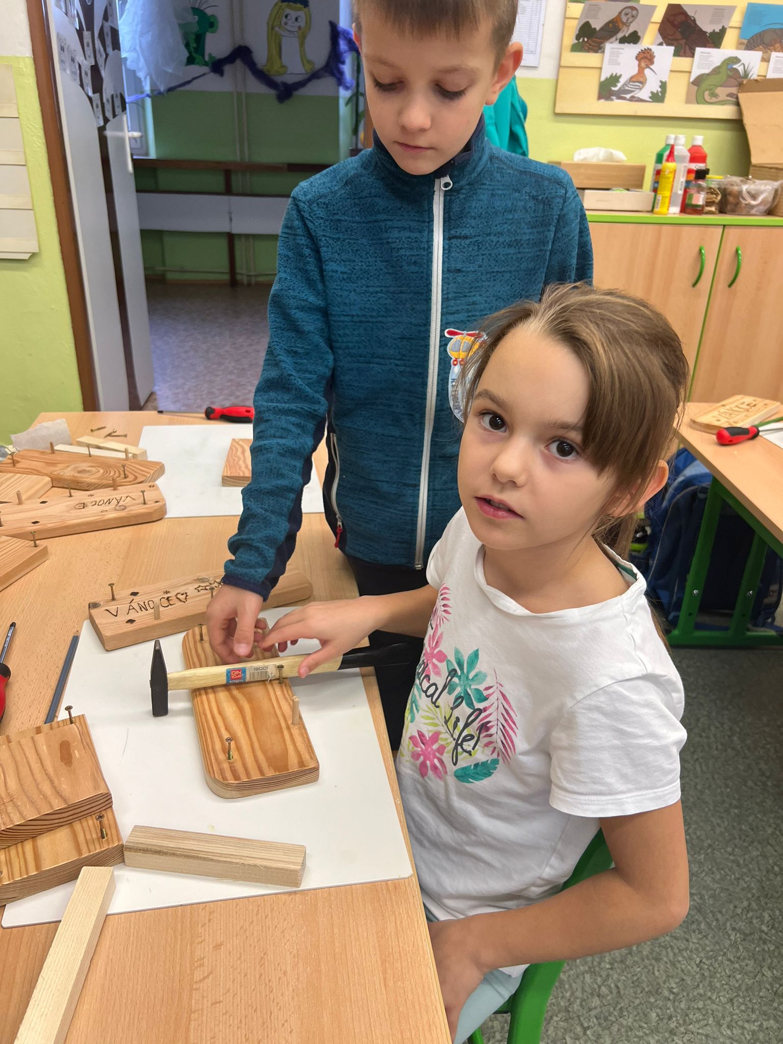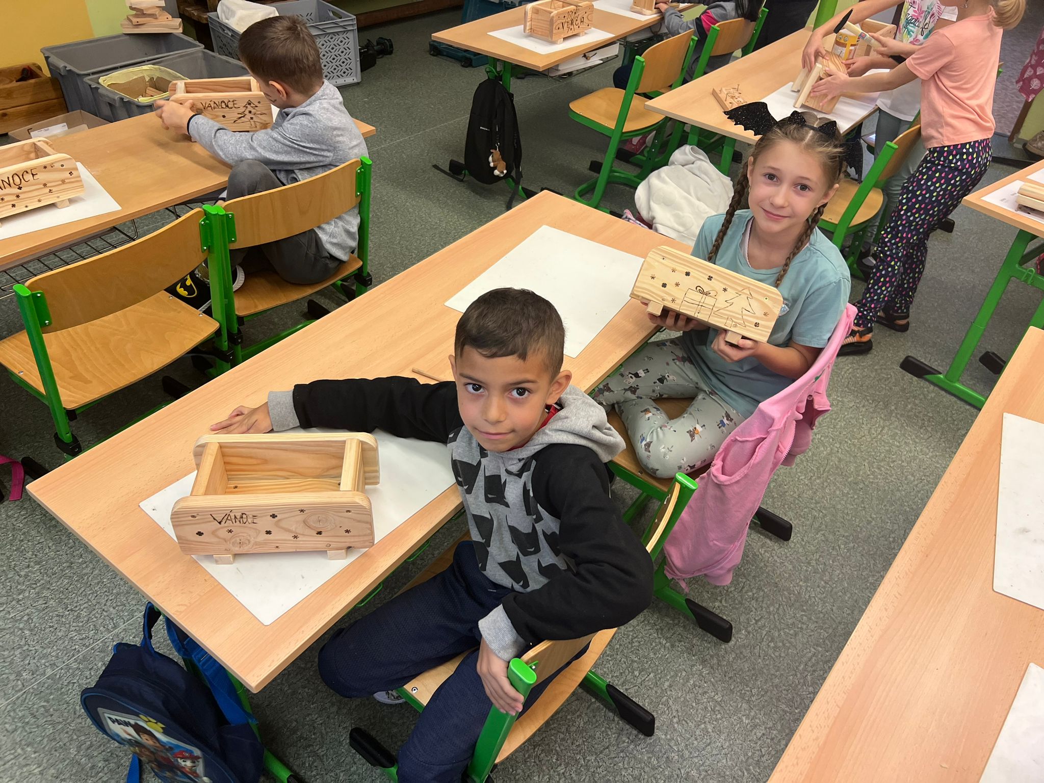 V pátek 3. 11. 2023 si děti ze tříd 2. A a 2. B zahrály pod vedením pana truhláře na malé truhláře a truhlářky.