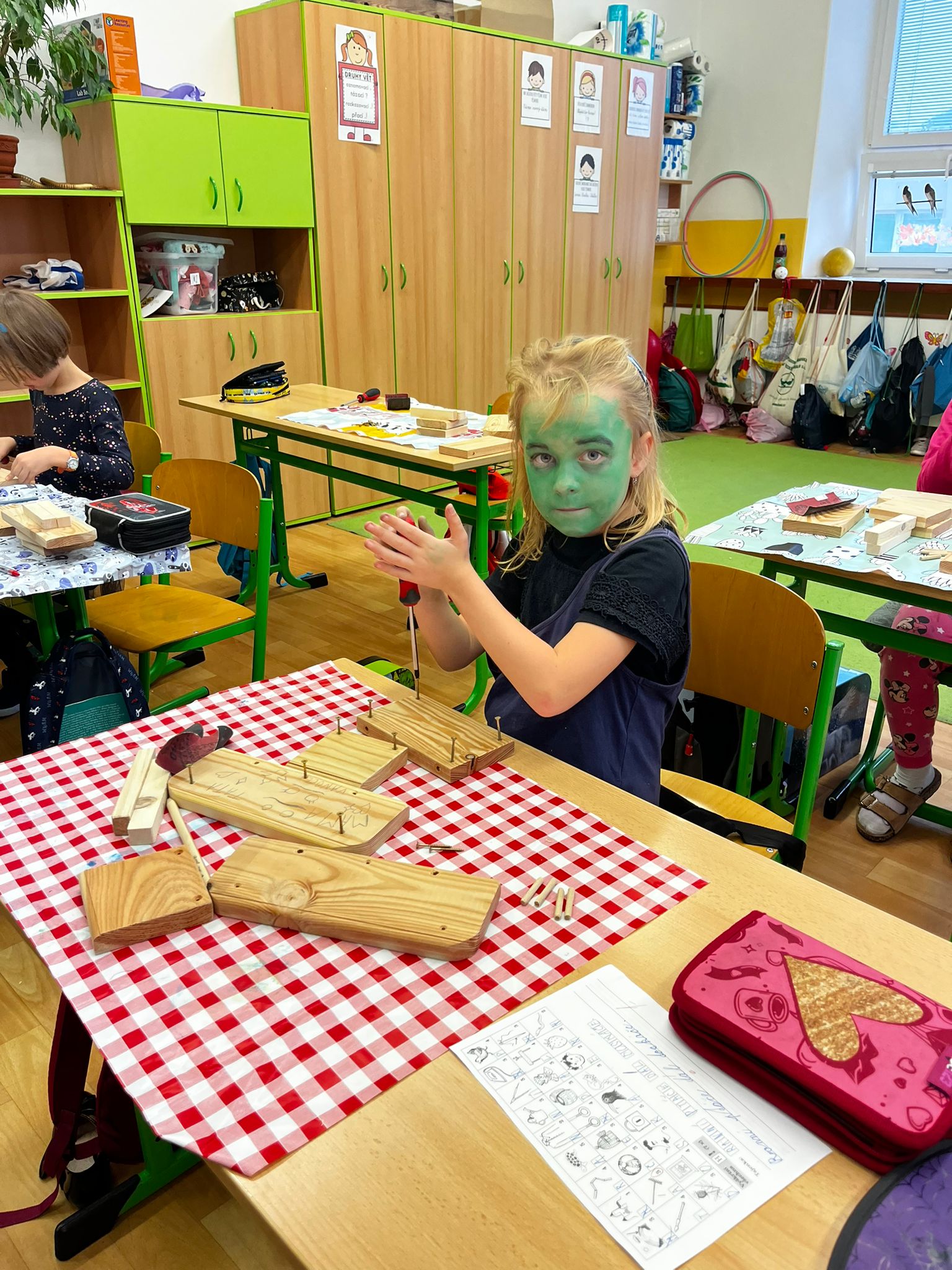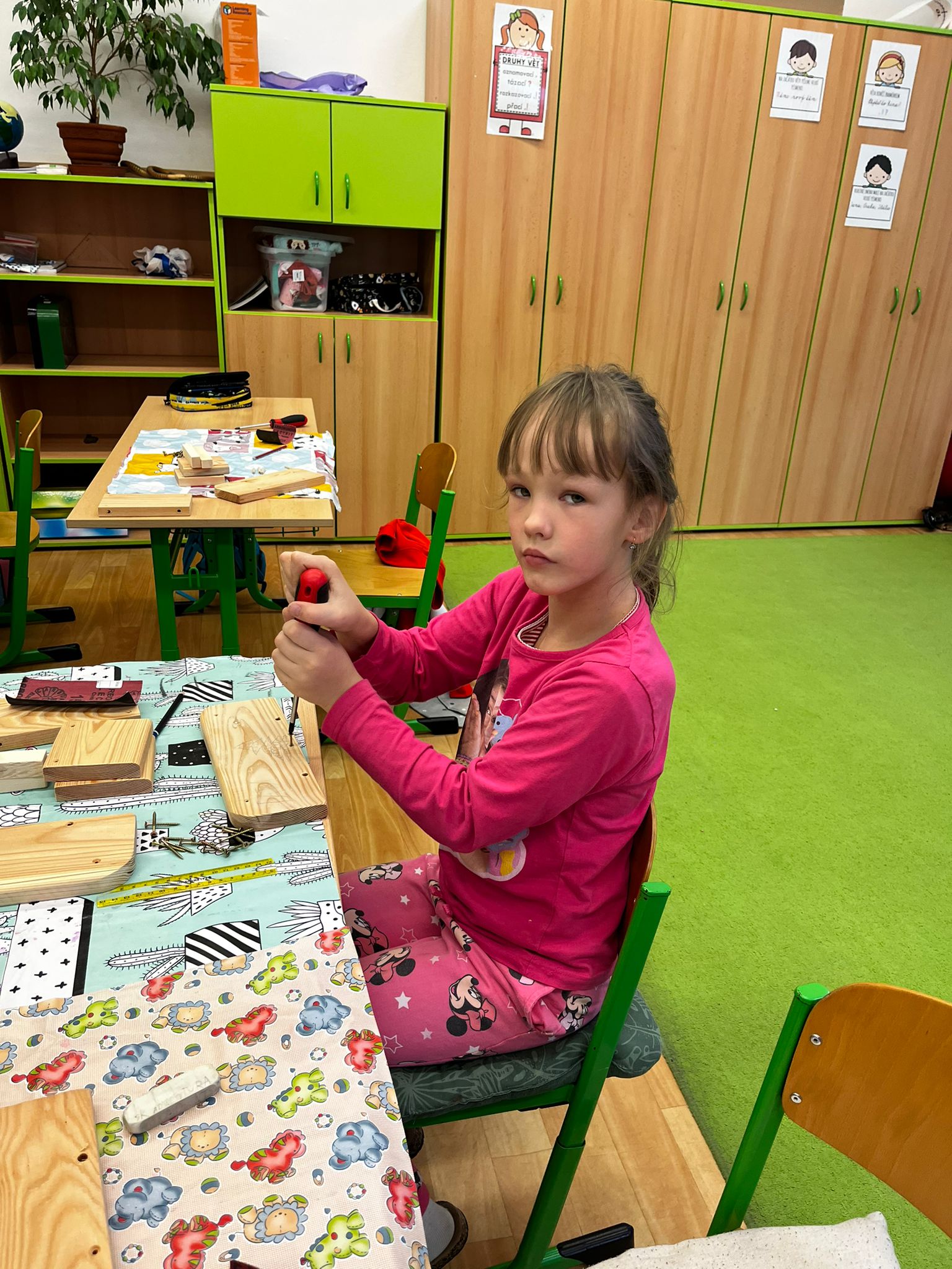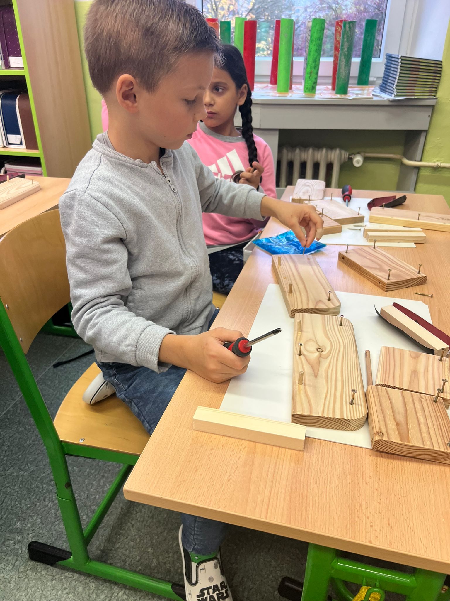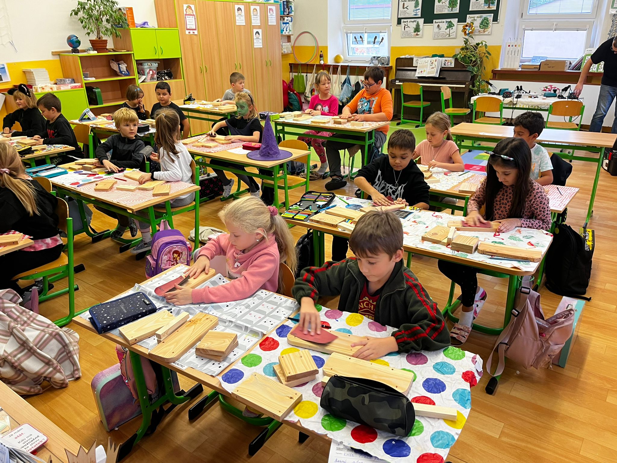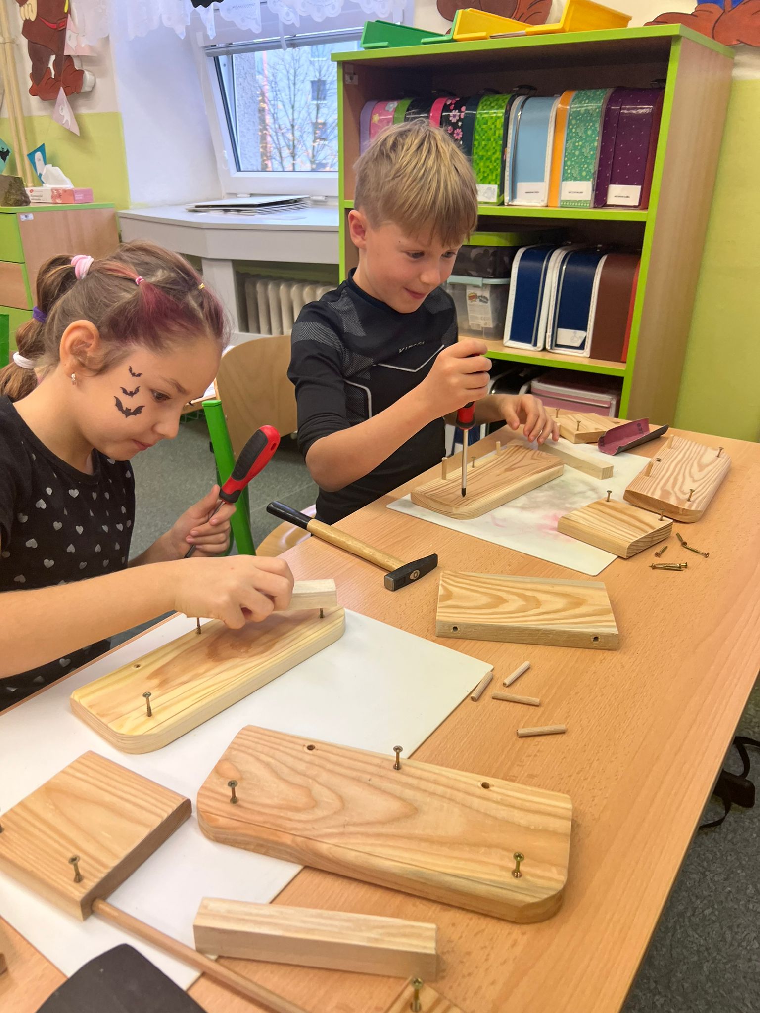 V pátek 3. 11. 2023 si děti ze tříd 2. A a 2. B zahrály pod vedením pana truhláře na malé truhláře a truhlářky.