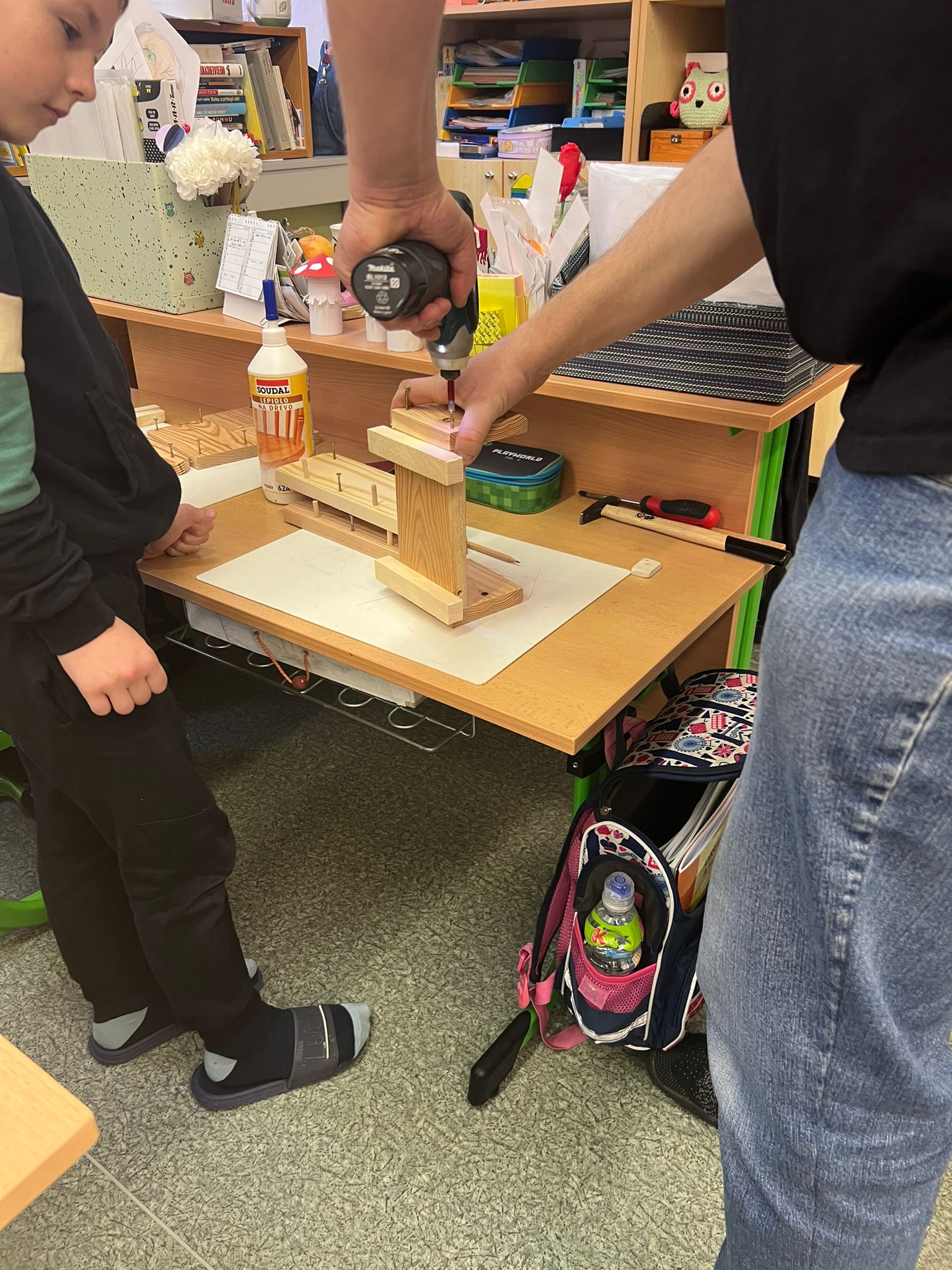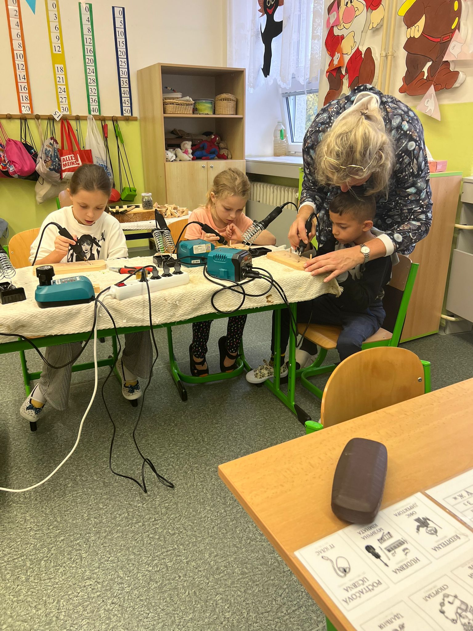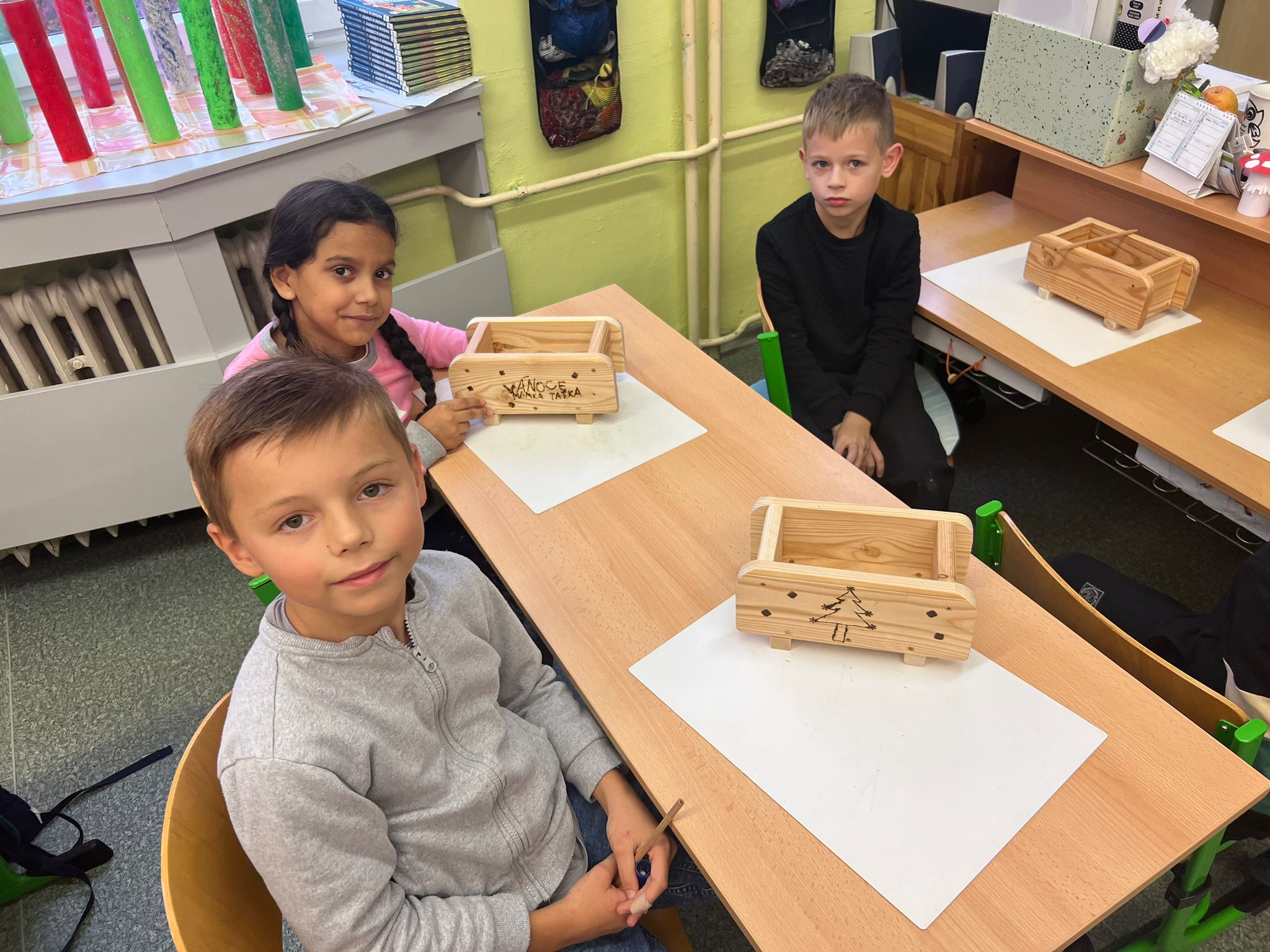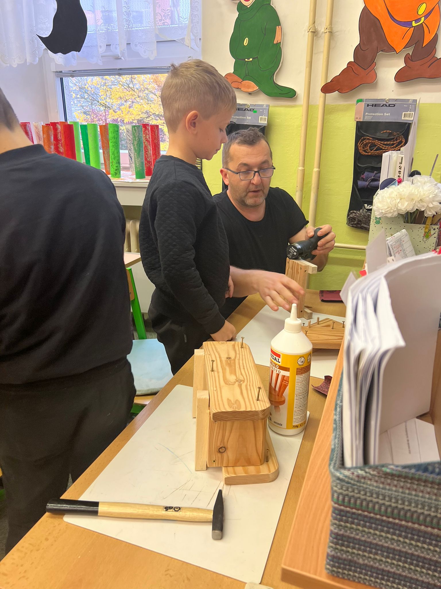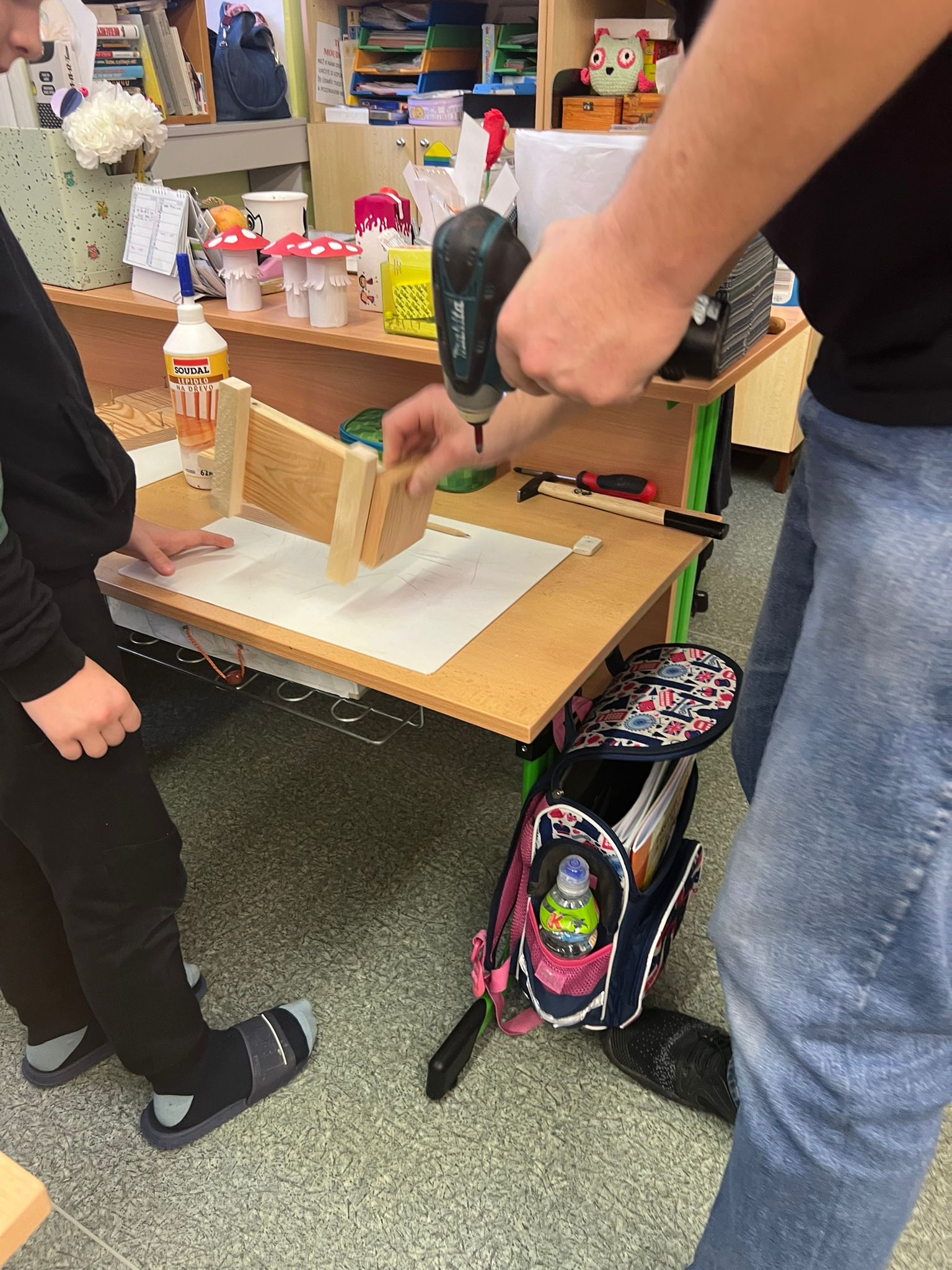V pátek 3. 11. 2023 si děti ze tříd 2. A a 2. B zahrály pod vedením pana truhláře na malé truhláře a truhlářky.