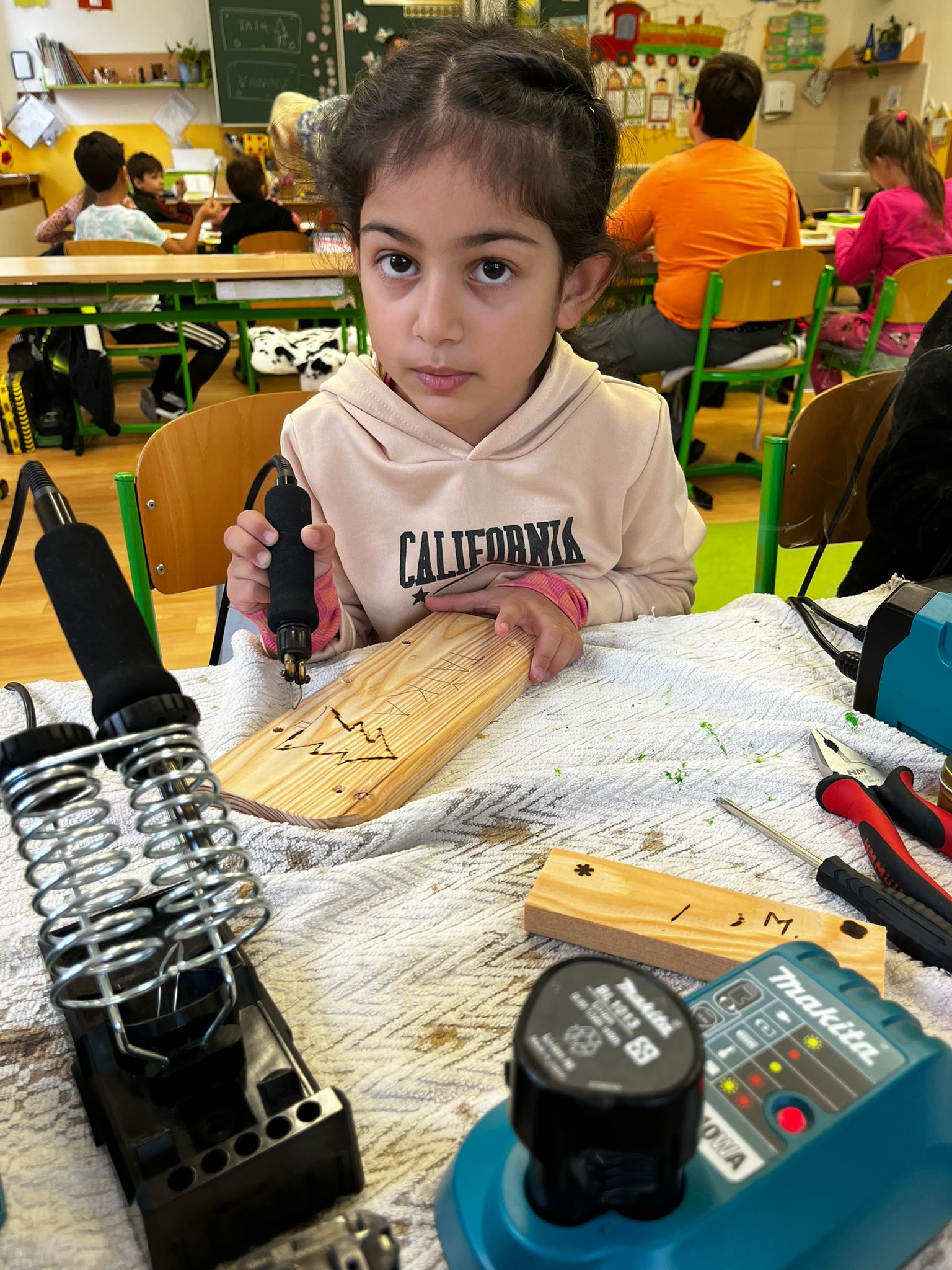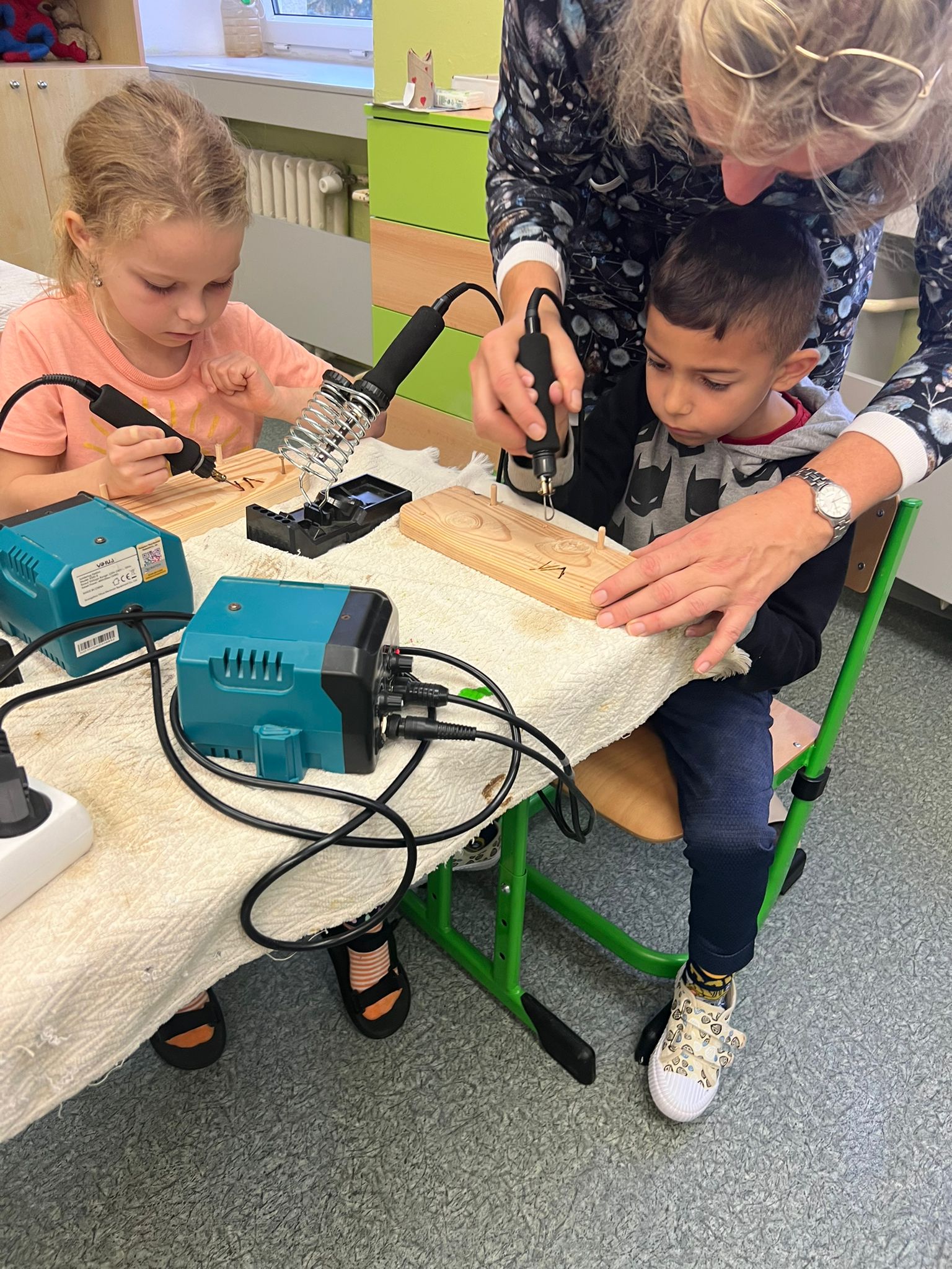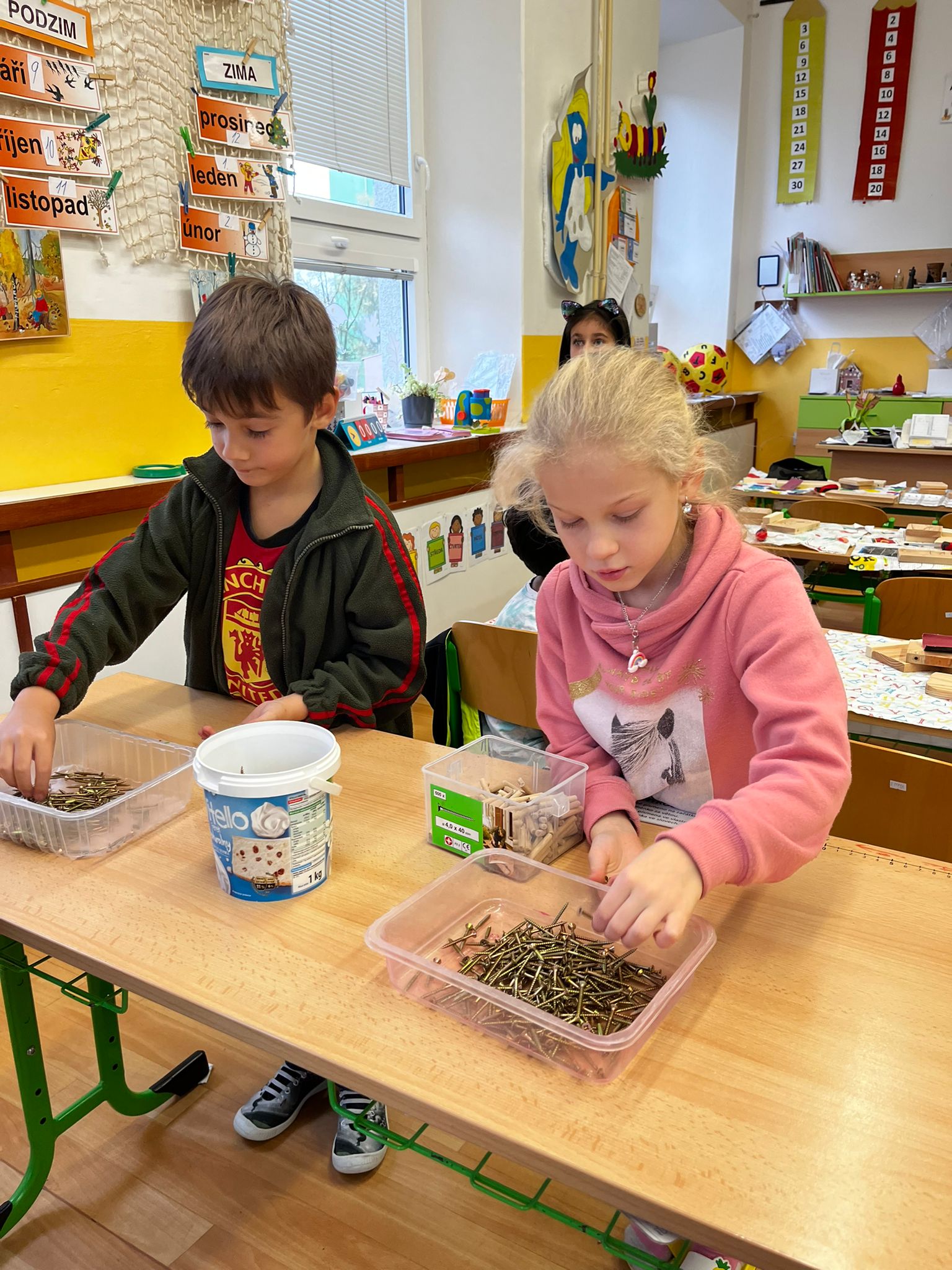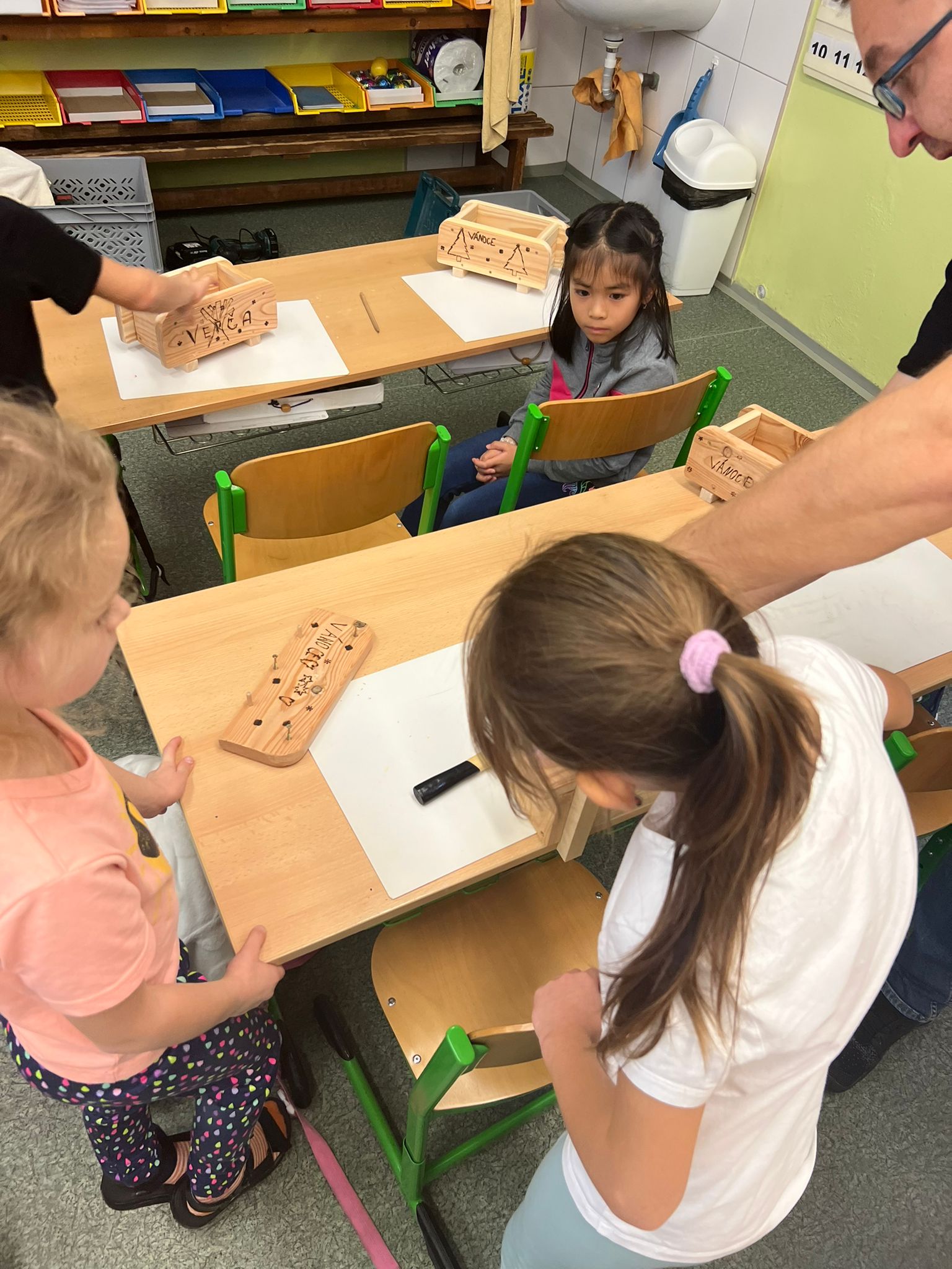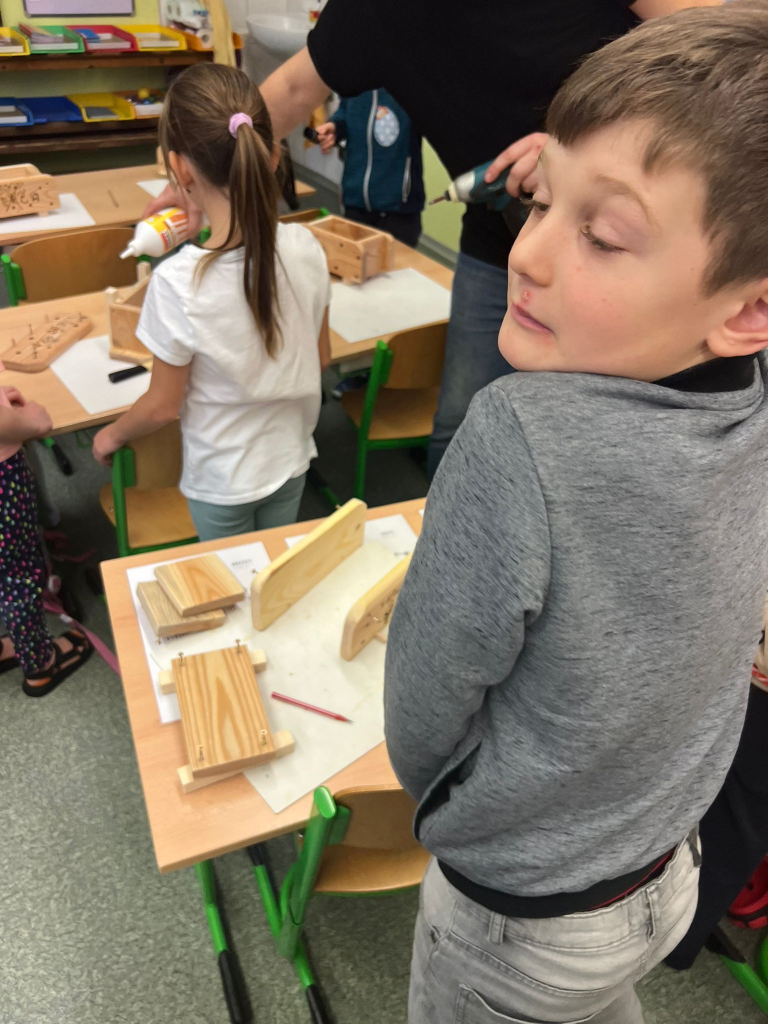 V pátek 3. 11. 2023 si děti ze tříd 2. A a 2. B zahrály pod vedením pana truhláře na malé truhláře a truhlářky.