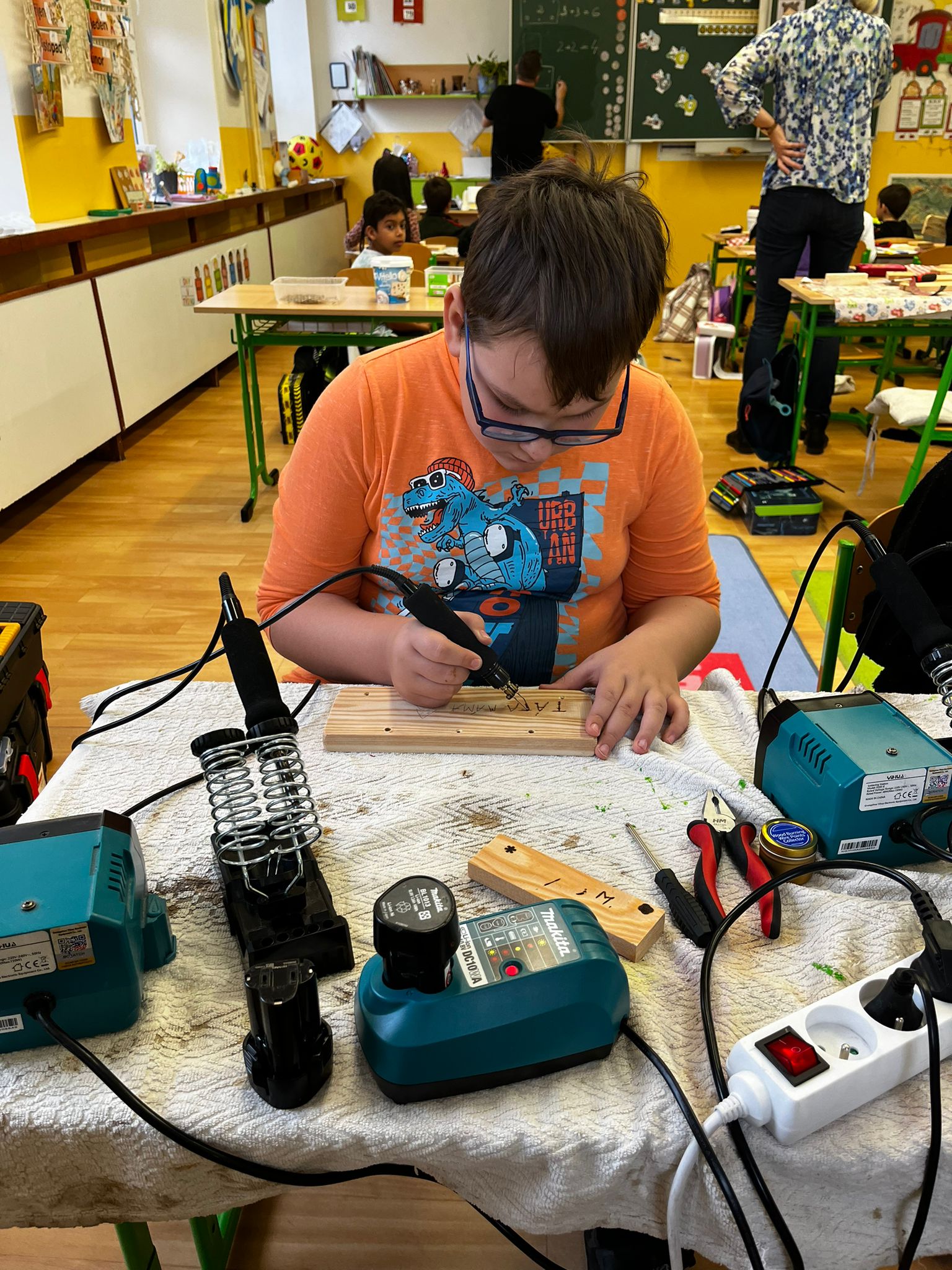 Žáci si vyrobili krásný dřevěný truhlík. Používali kladivo, šroubovák, akušroubovák, hřebíky, šrouby a dřevěné tyble. Obrázek na své truhlíky si pak vypálili pomocí speciální pájky.