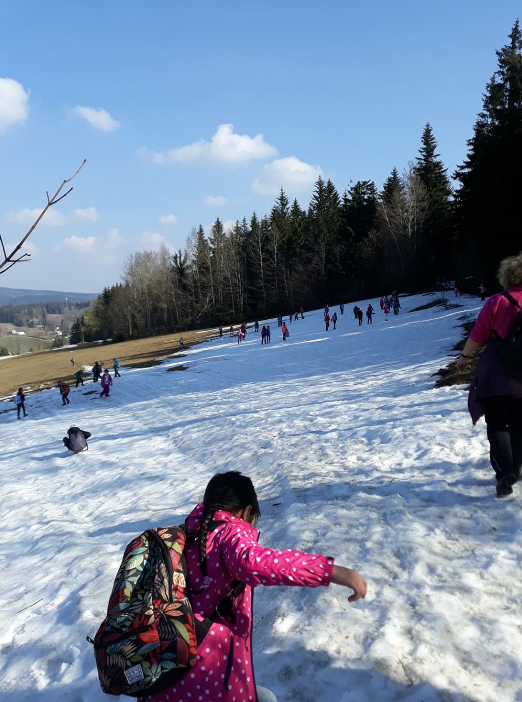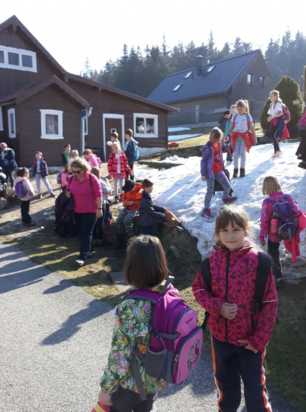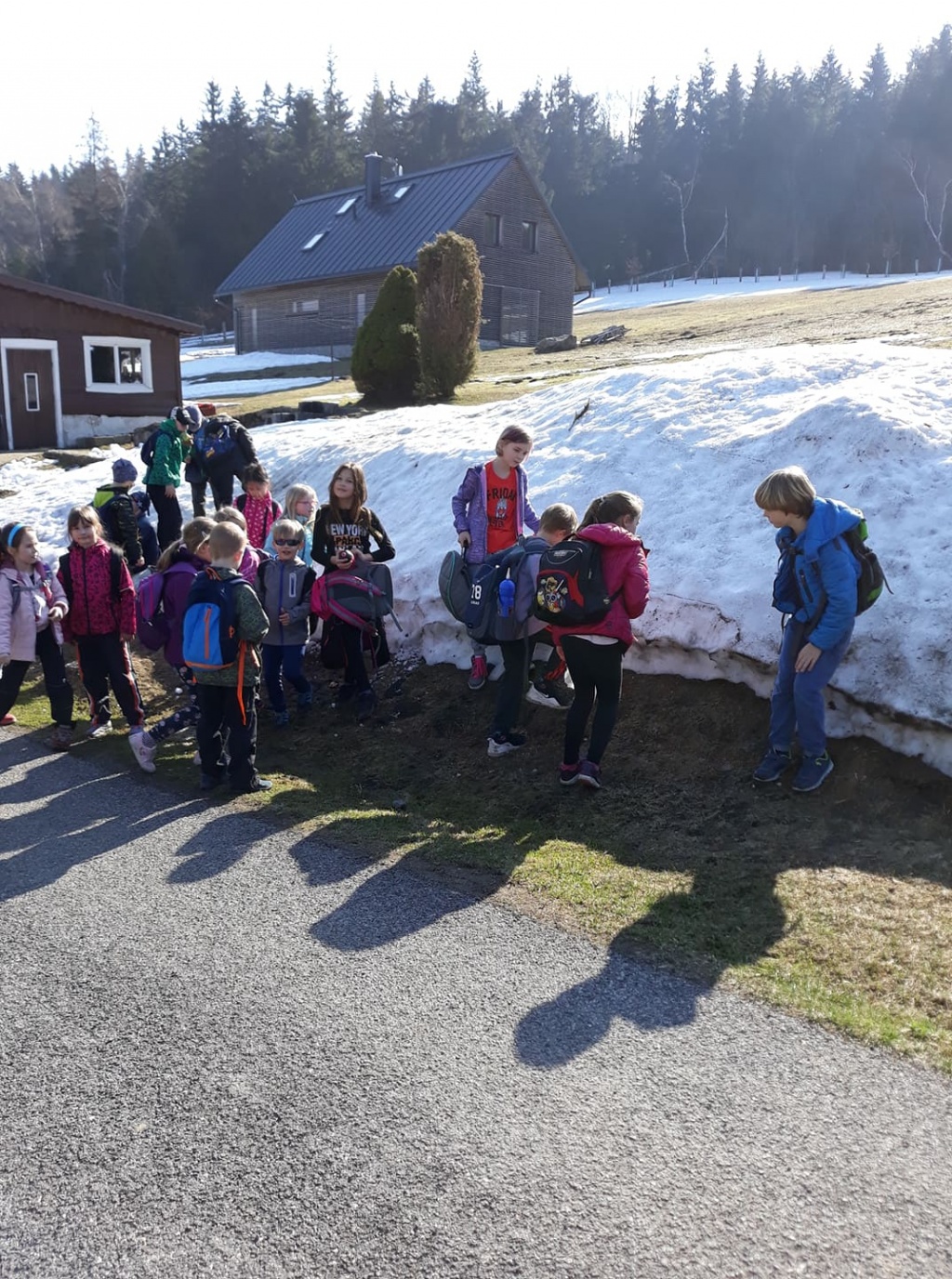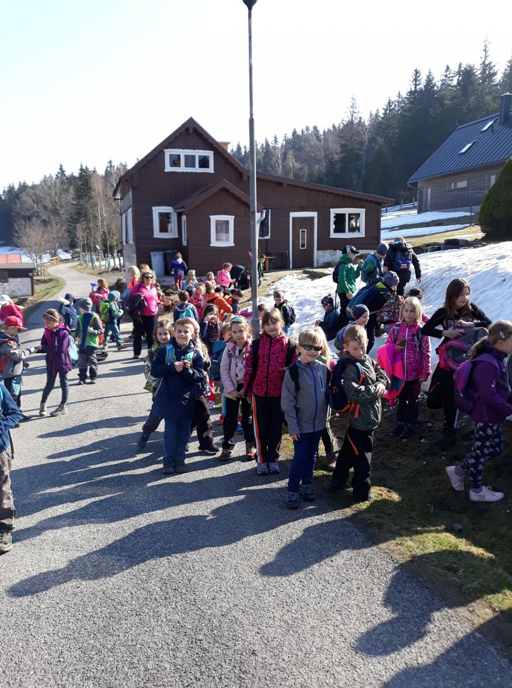 Pondělí jsme strávili skoro celý den venku. Bylo krásné slunečné počasí. Hned po snídani, která proběhla formou švédských stolů, jsme vyrazili na vycházku po okolí. Děti si užily poslední zbytky sněhu. Cestou pozorovaly jarní přírodu. K obědu jsme měli bramborovou kaši a kuře. Po poledním klidu, proběhlo odpoledne plné her a soutěží. K večeři byly špagety. Po večeři se vyhodnocovalo bodování pokojů a soutěží.
