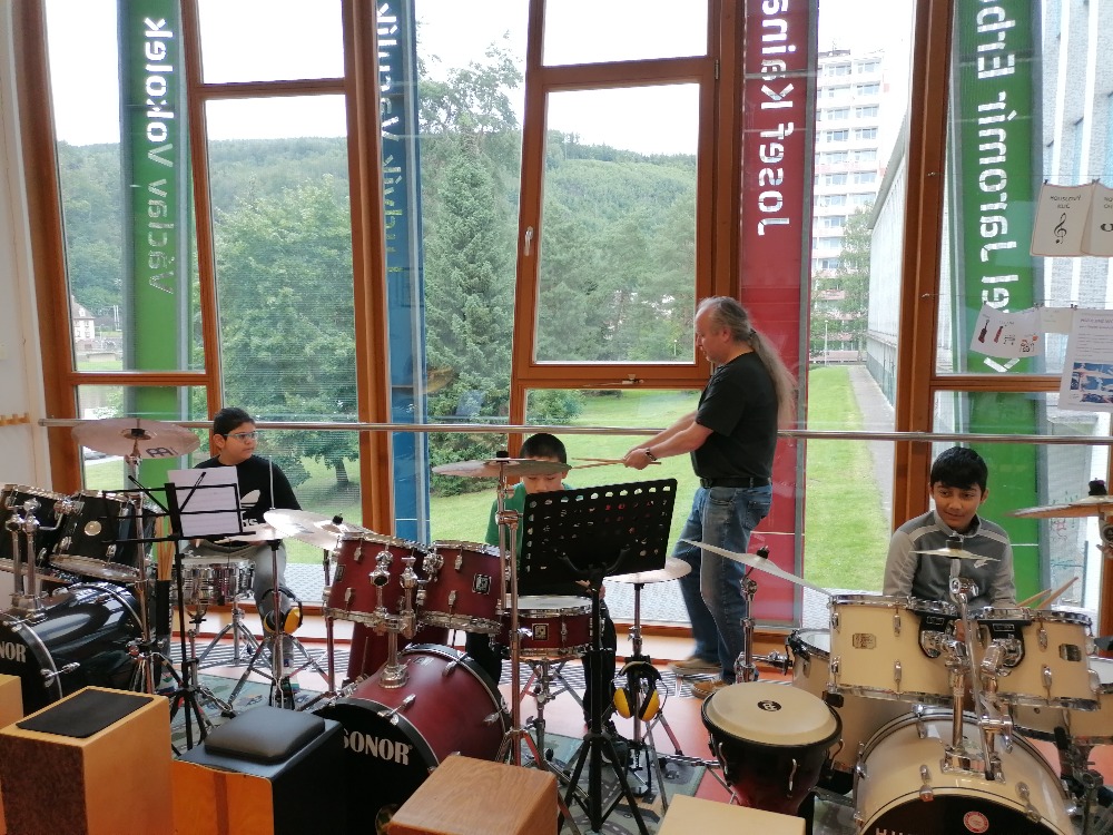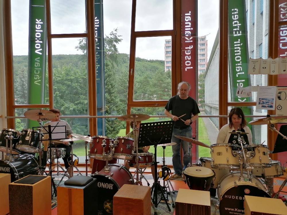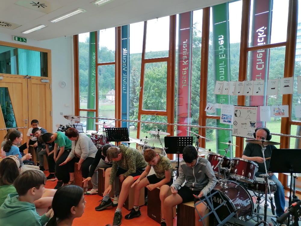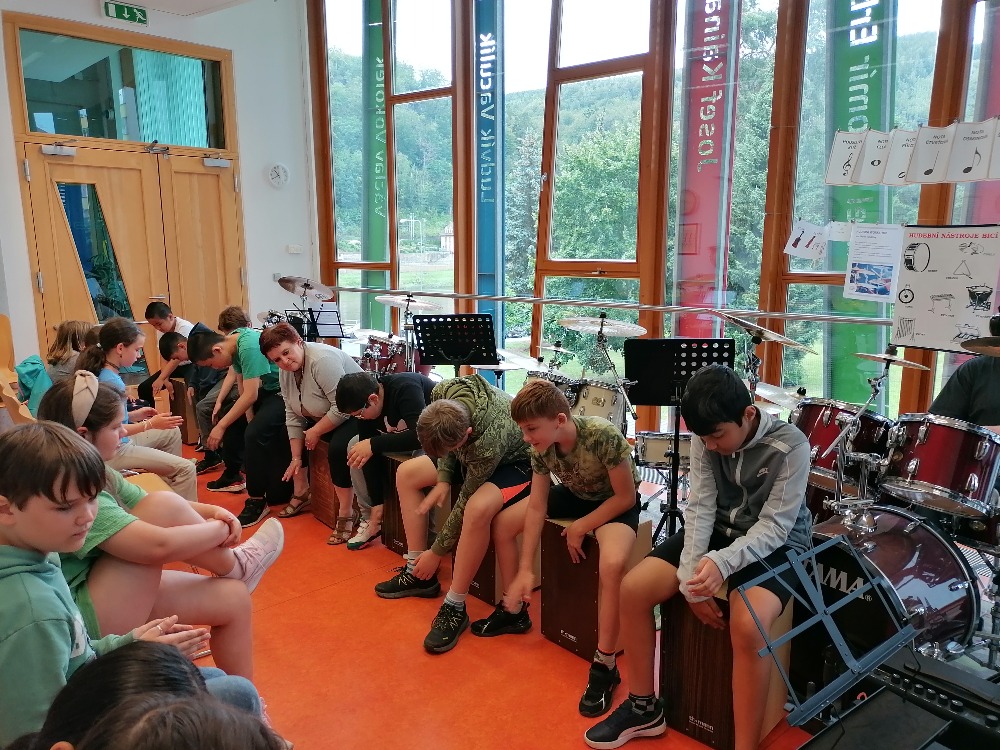 Nejdříve si děti zopakovaly základní rytmy při hře na bicí soupravu, které již znaly z prvního dílu tohoto hudebního programu. Poté se děti seznámily s dalšími a již složitějšími druhy rytmických doprovodů a všichni si je postupně vyzkoušeli (včetně nás učitelek). Tato již navazující lekce proběhla tedy ryze v praktickém duchu a celou hodinu žáci jen hráli, hráli a hráli.