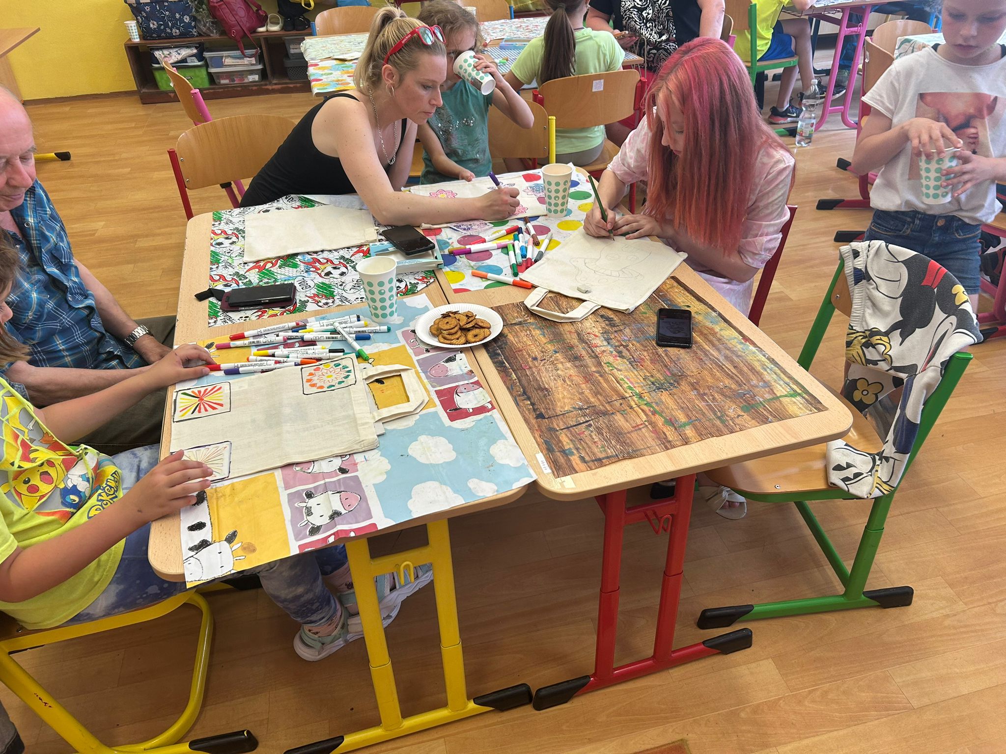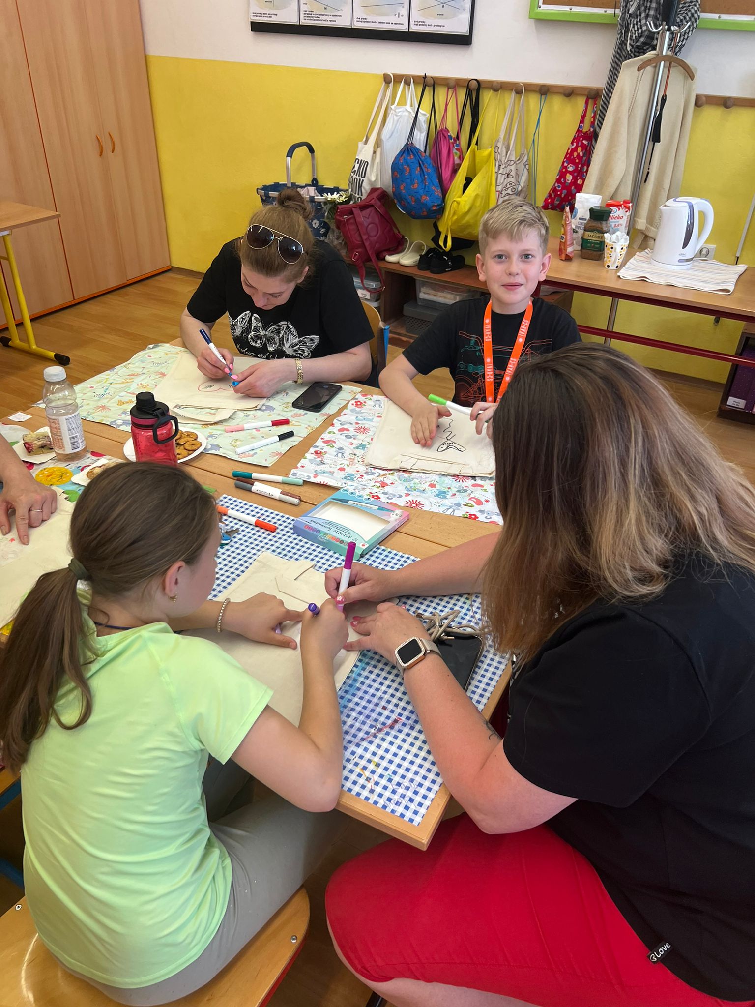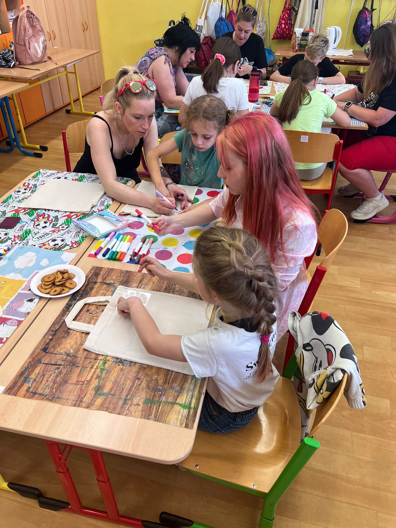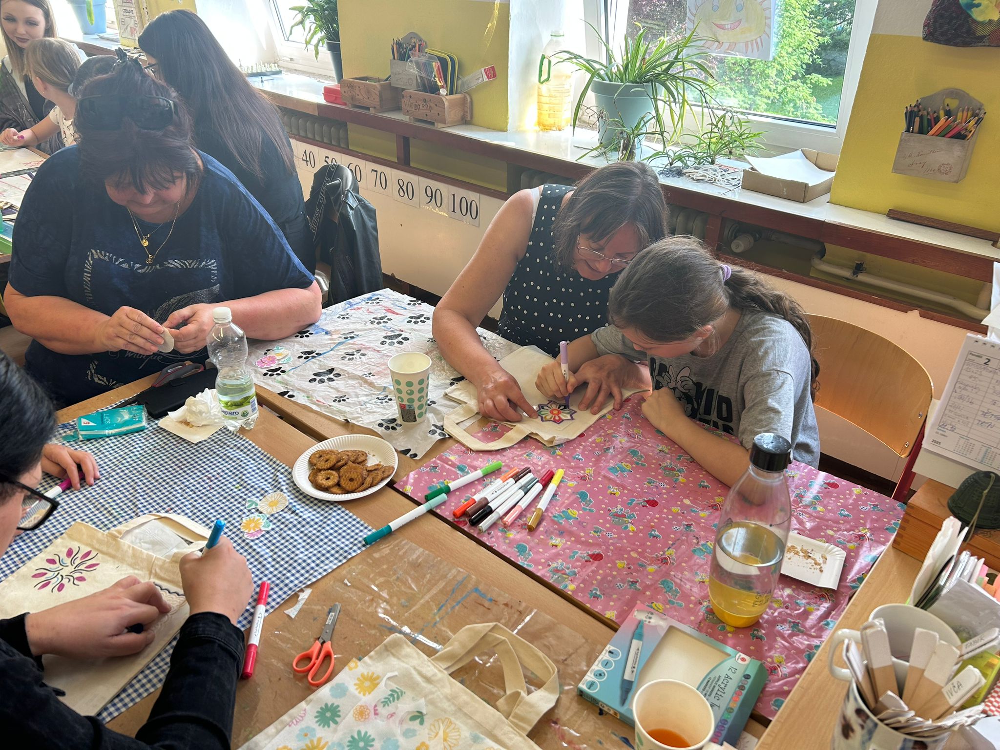 Celou akcí se nesla velmi dobrá nálada, i připravené občerstvení přišlo k chuti. Někdo na taštičky kreslil dle své fantazie, někdo použil šablony na mandaly a dokonce se zkoušely i zažehlovat ubrousky v potravinové fólii.